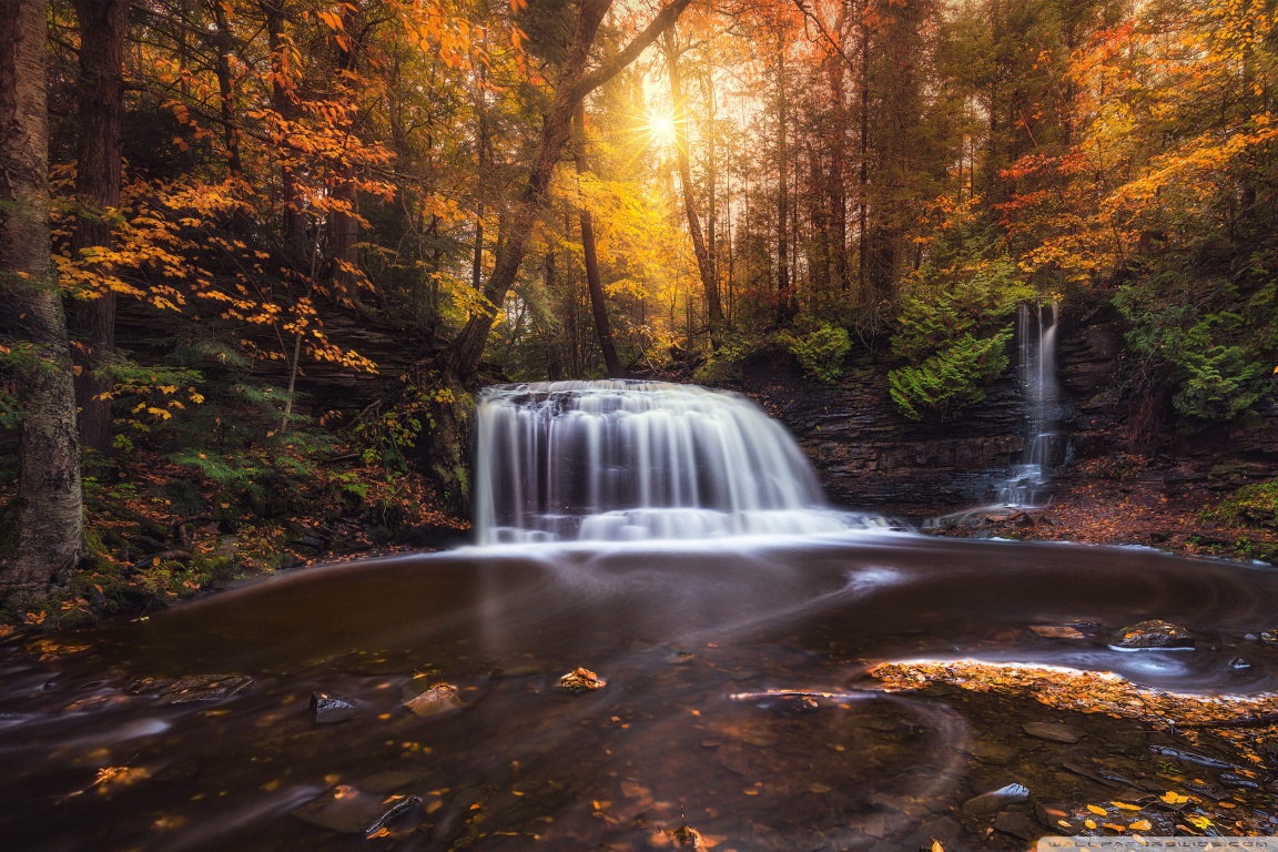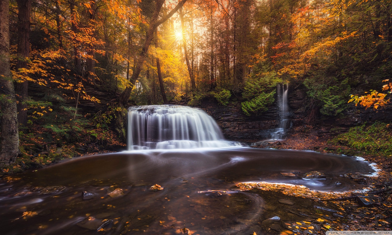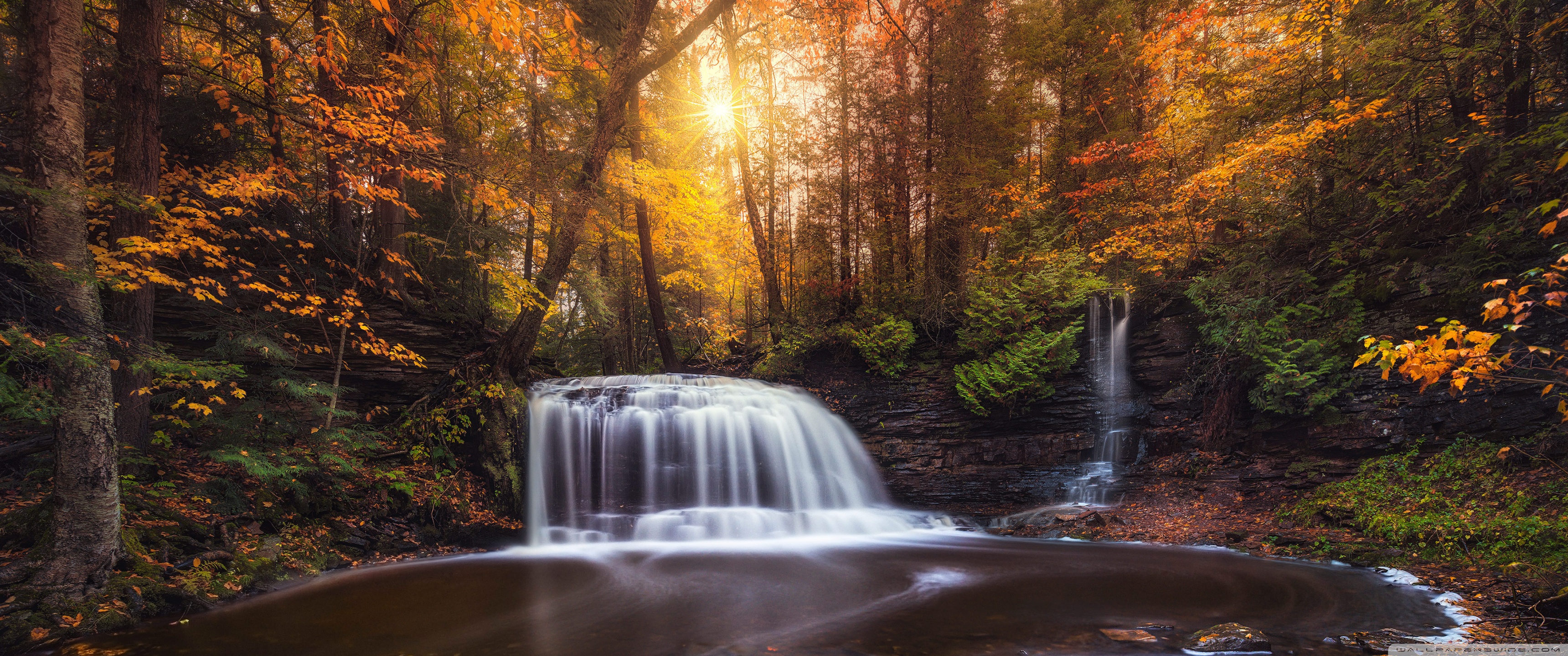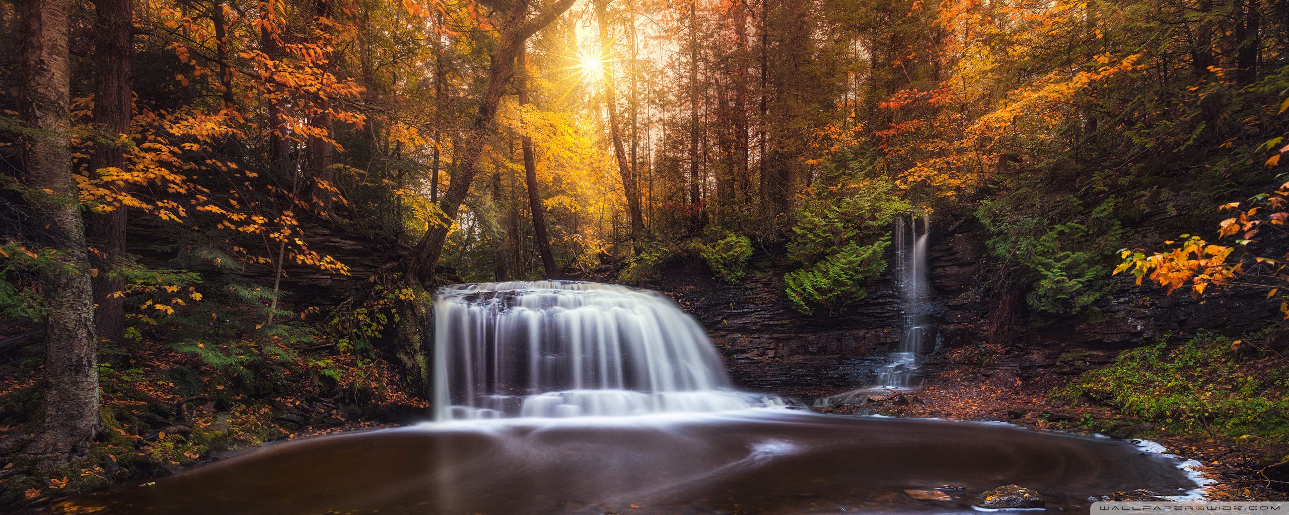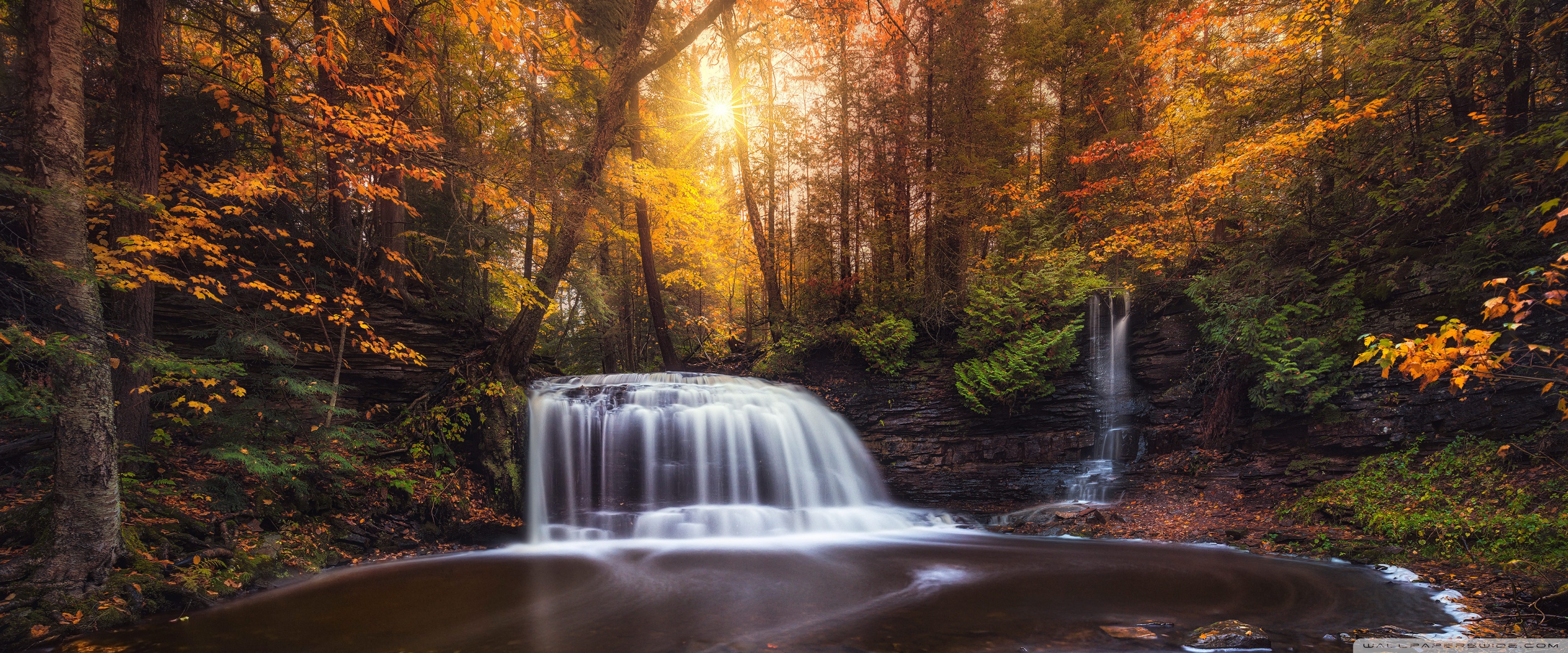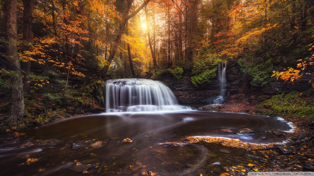 Download Forest Waterfall on a Sunny Autumn Day 4K UHD Wallpaper