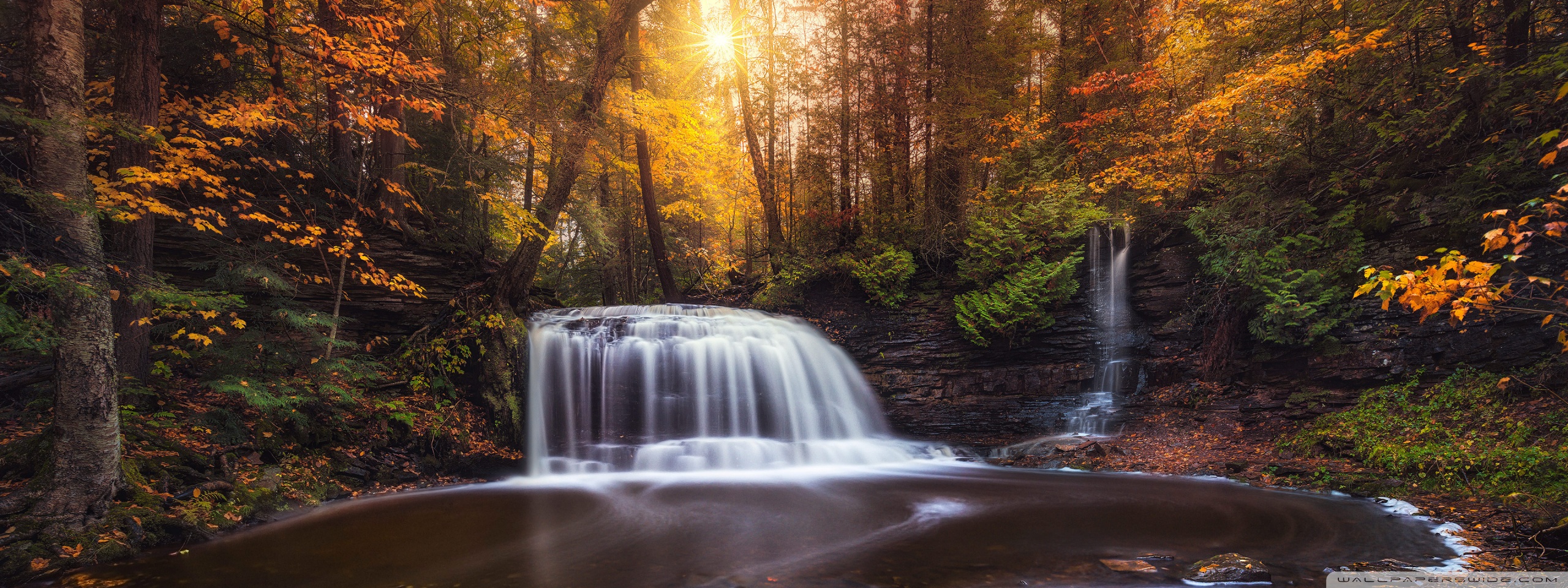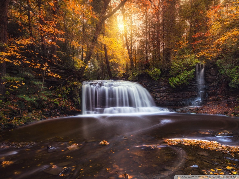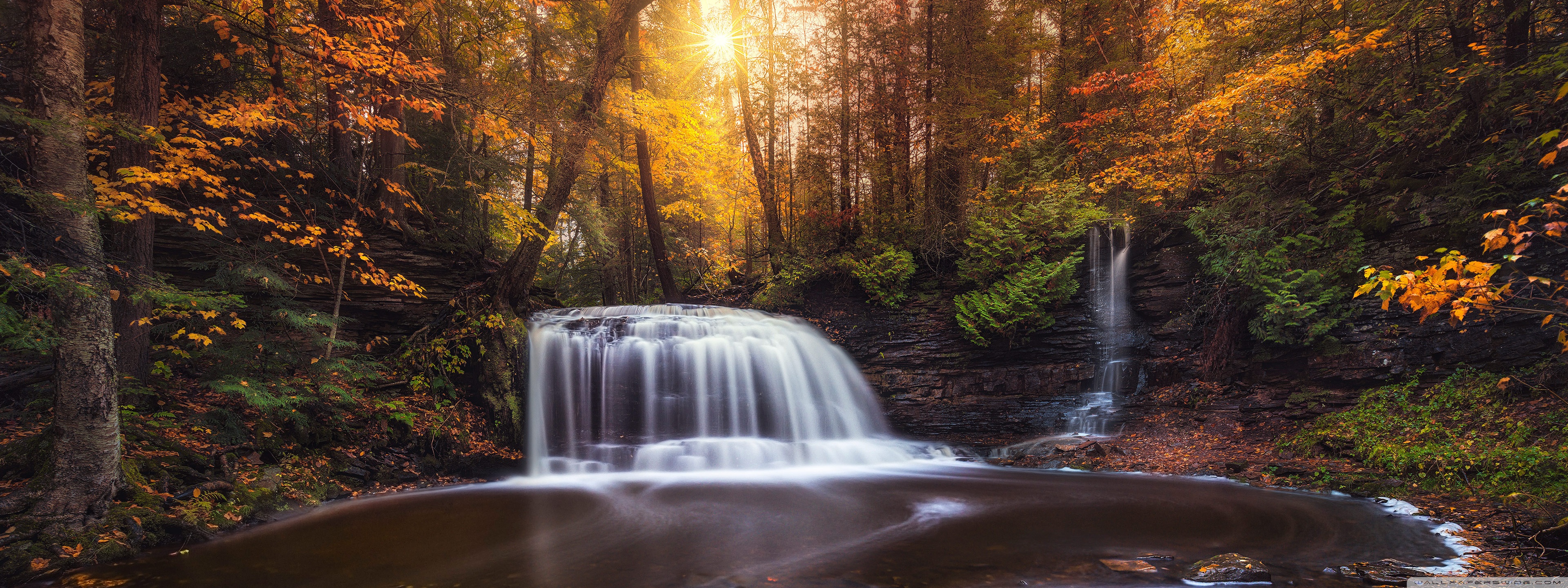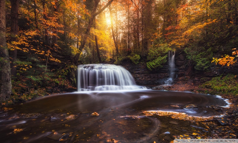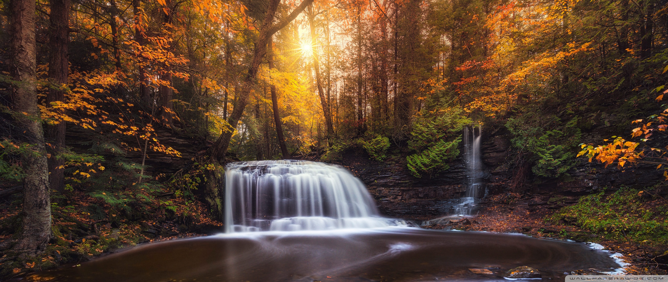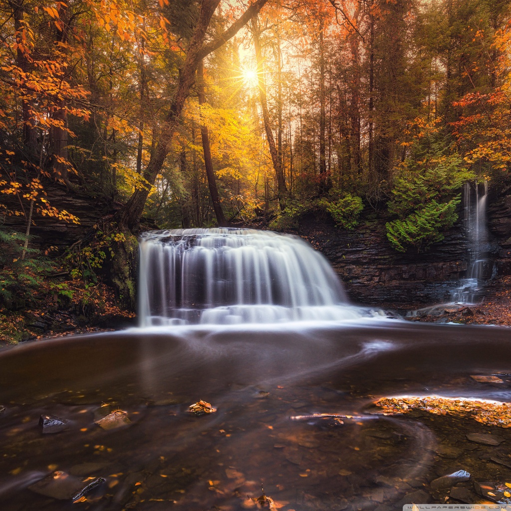Download Forest Waterfall on a Sunny Autumn Day 4K UHD Wallpaper
