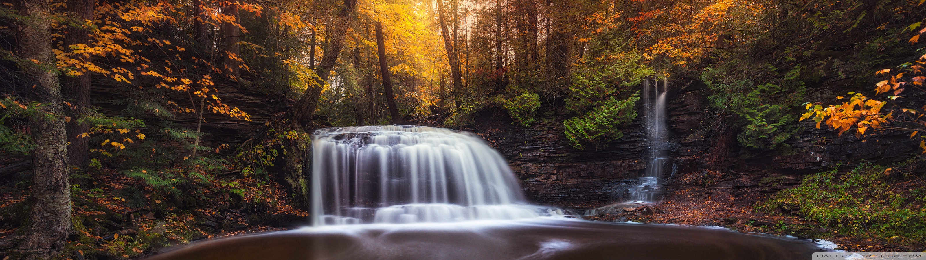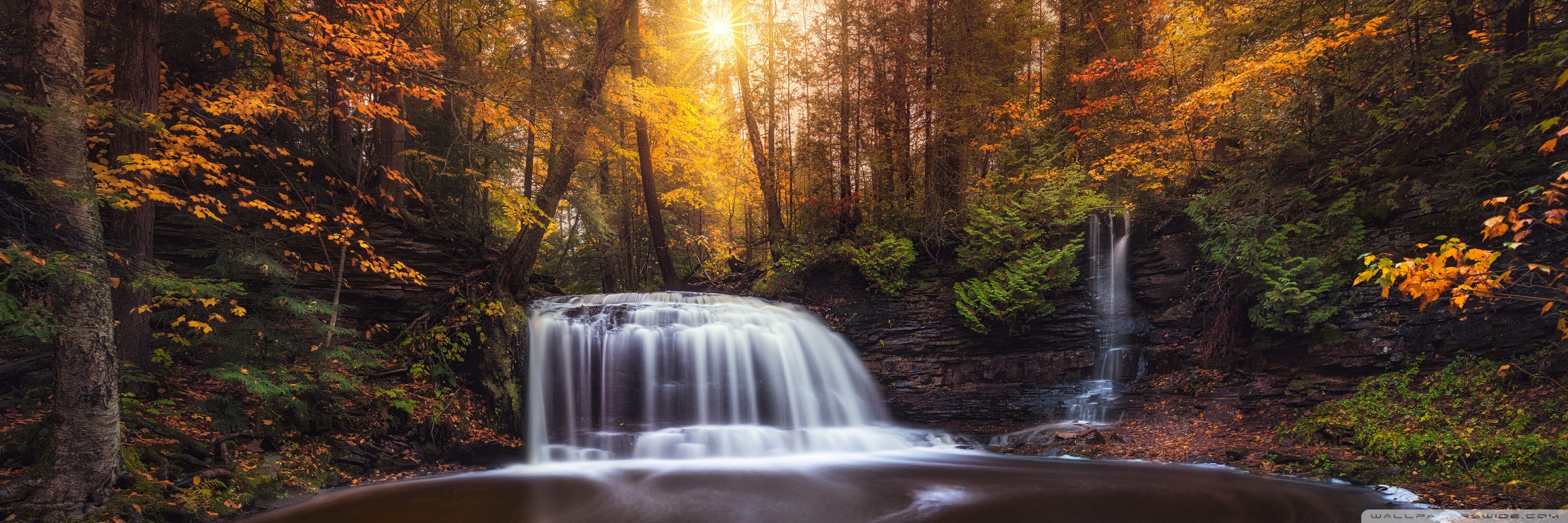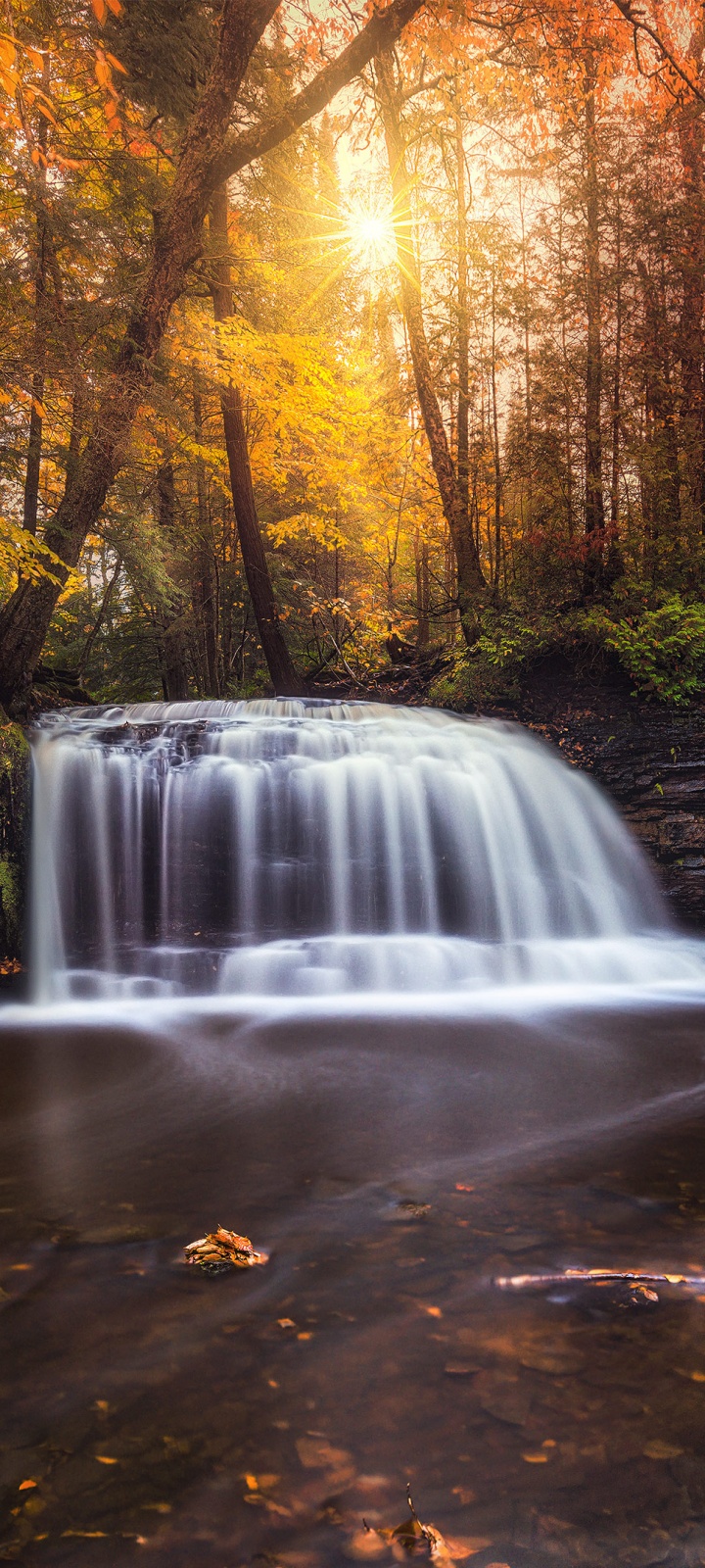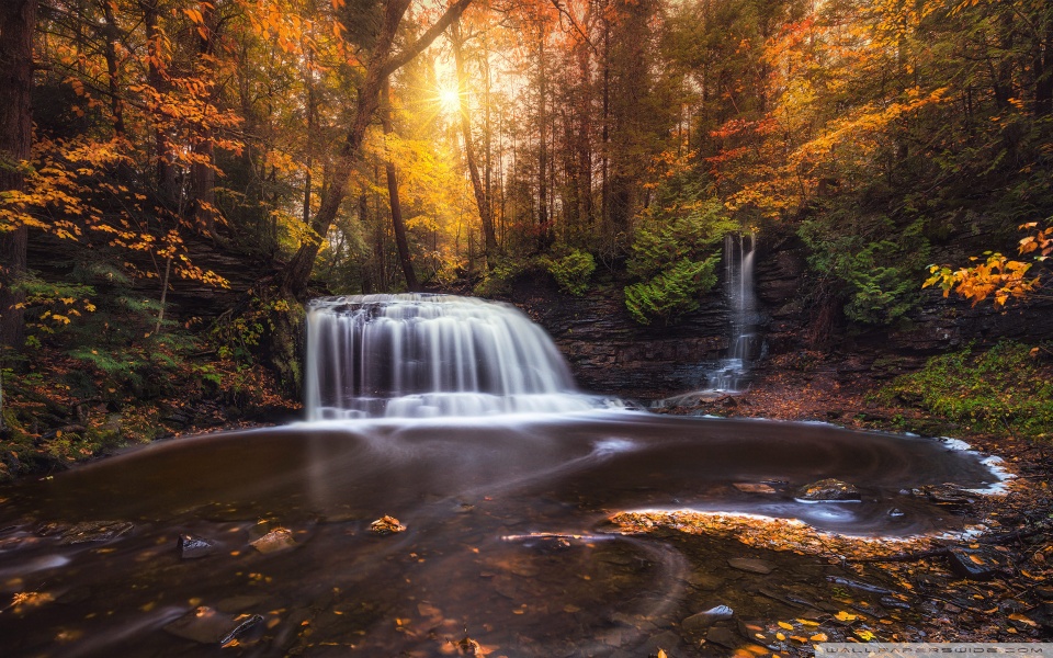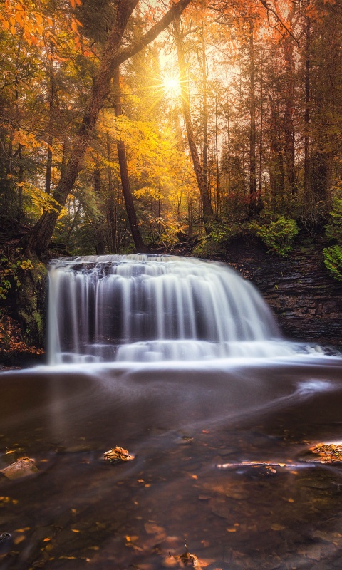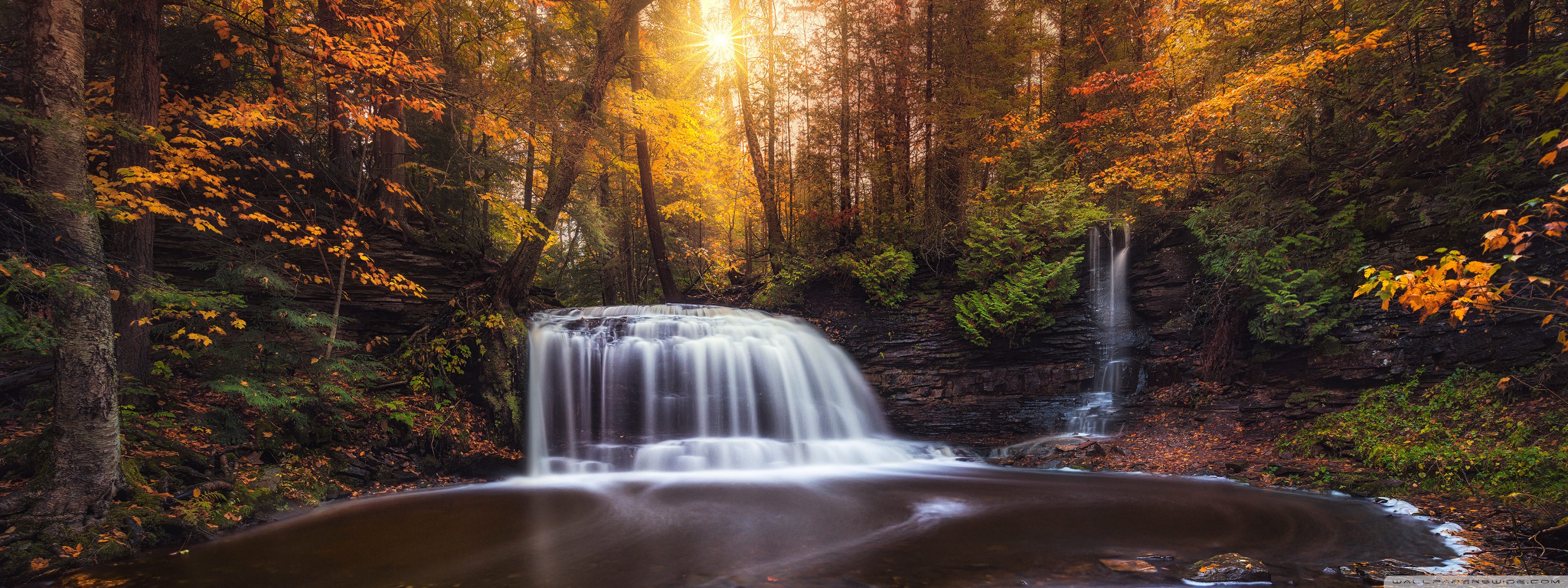Download Forest Waterfall on a Sunny Autumn Day 4K UHD Wallpaper