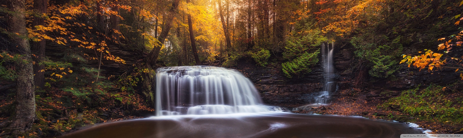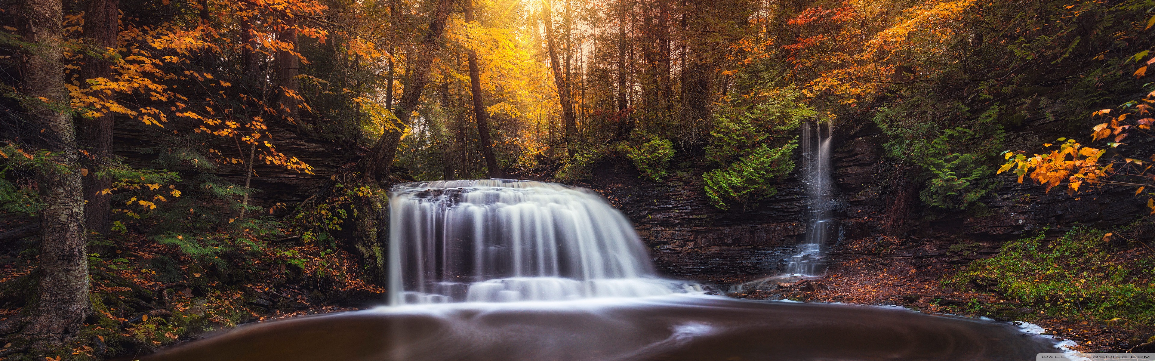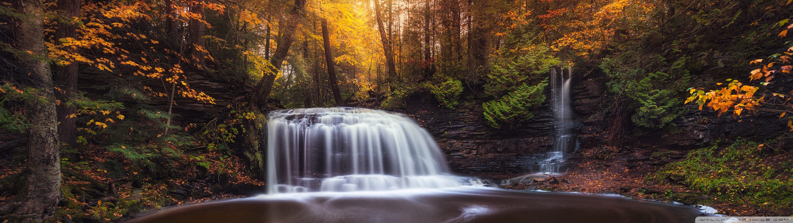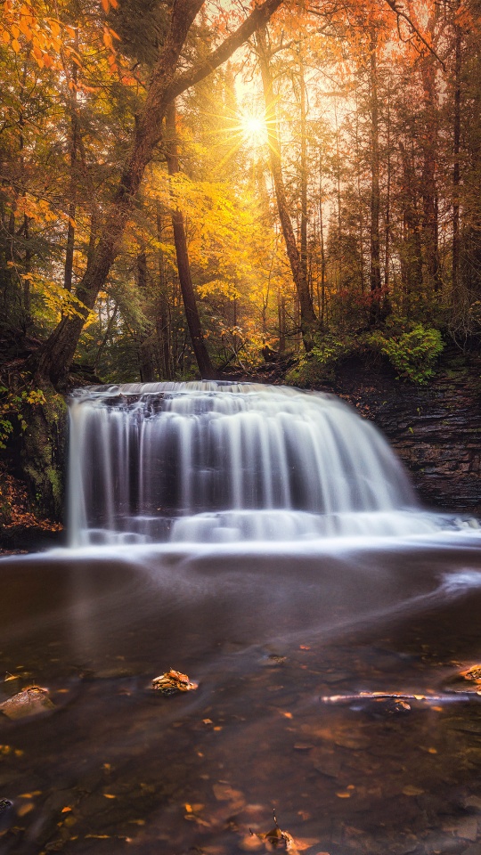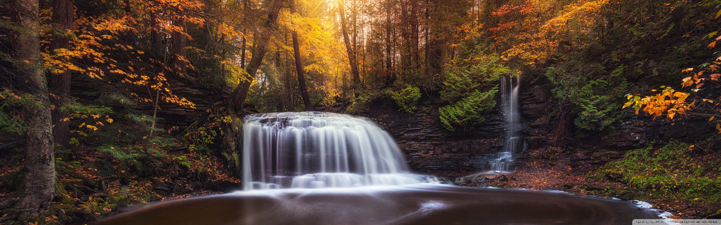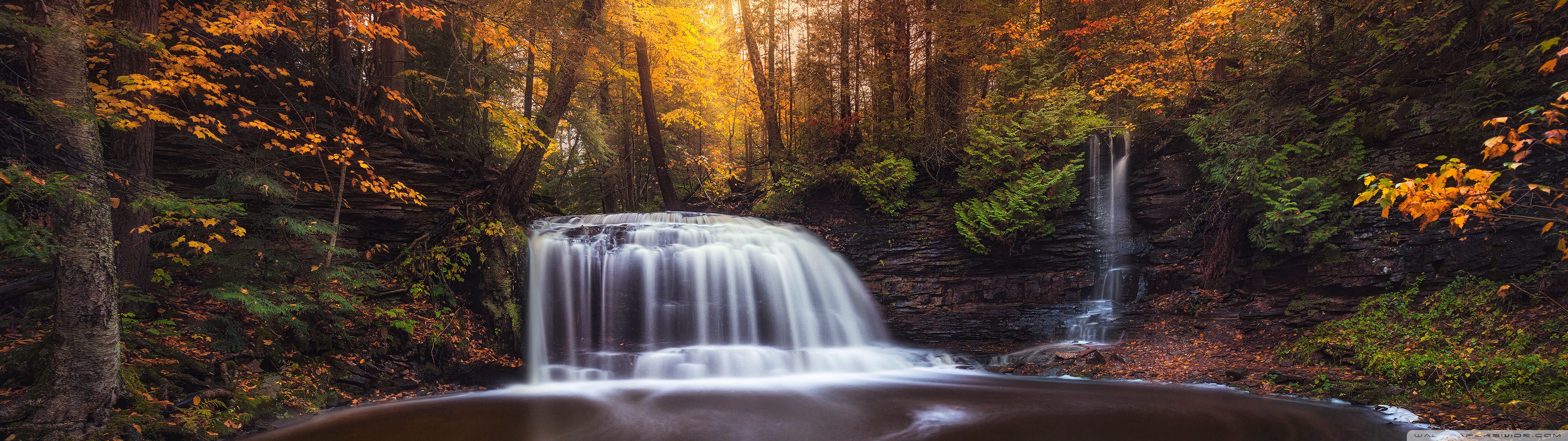 Download Forest Waterfall on a Sunny Autumn Day 4K UHD Wallpaper