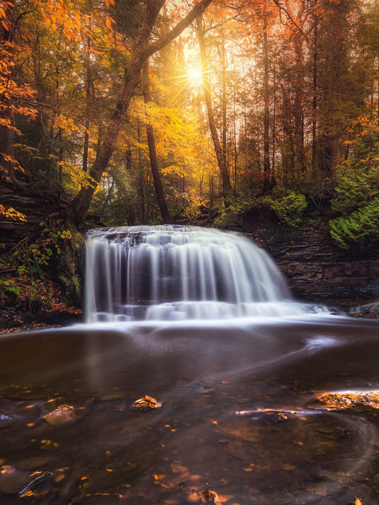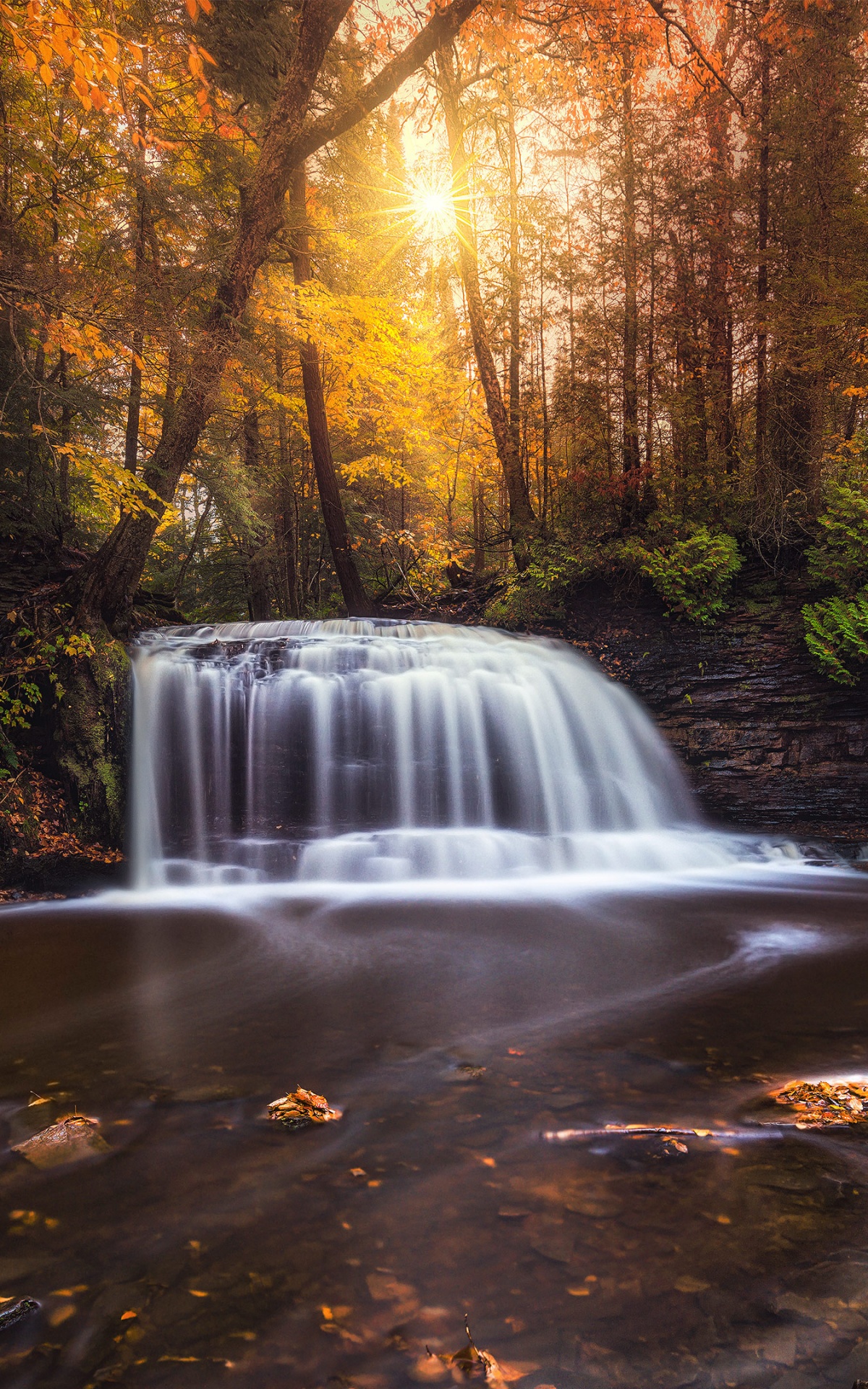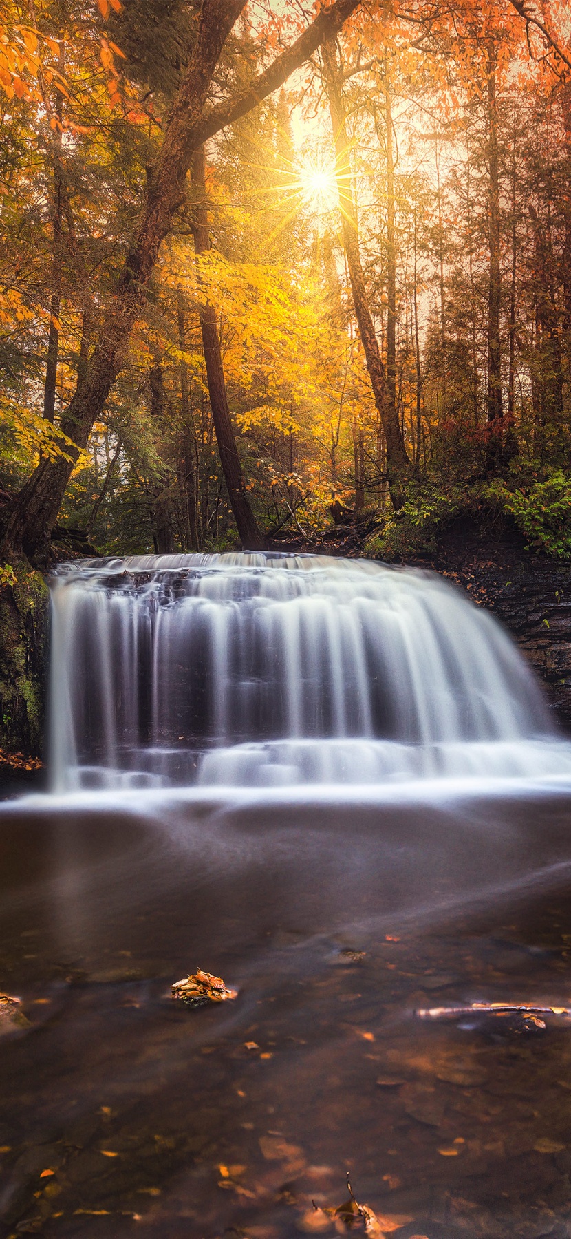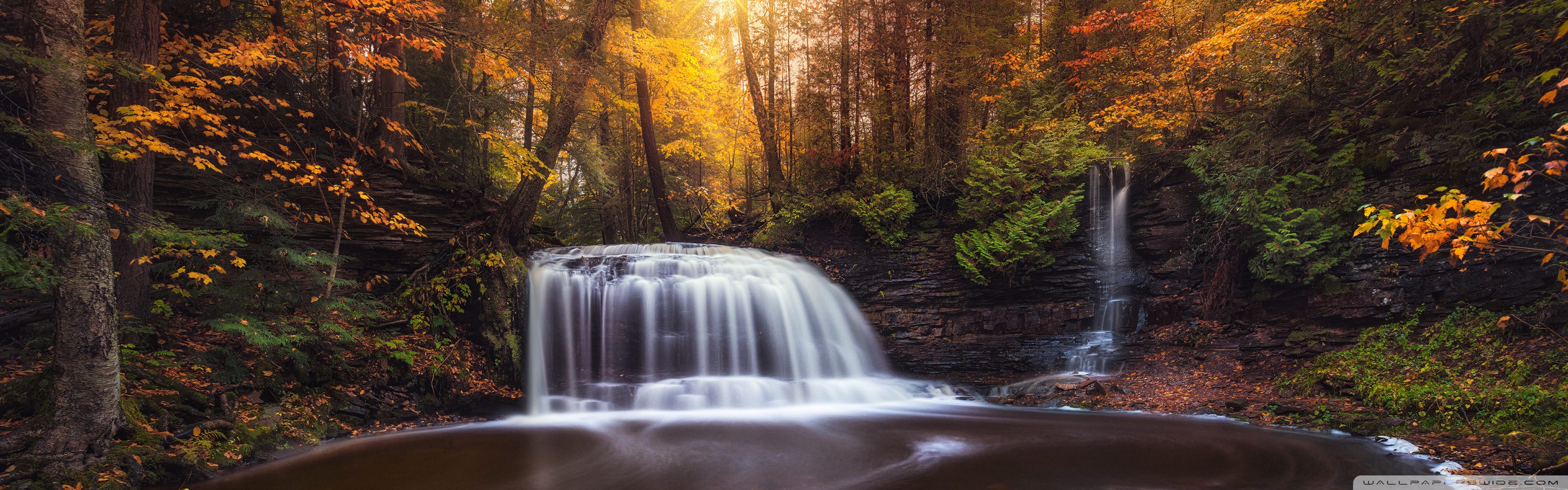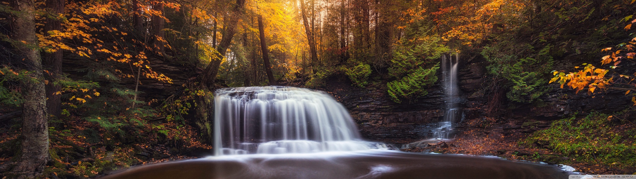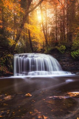 Download Forest Waterfall on a Sunny Autumn Day 4K UHD Wallpaper