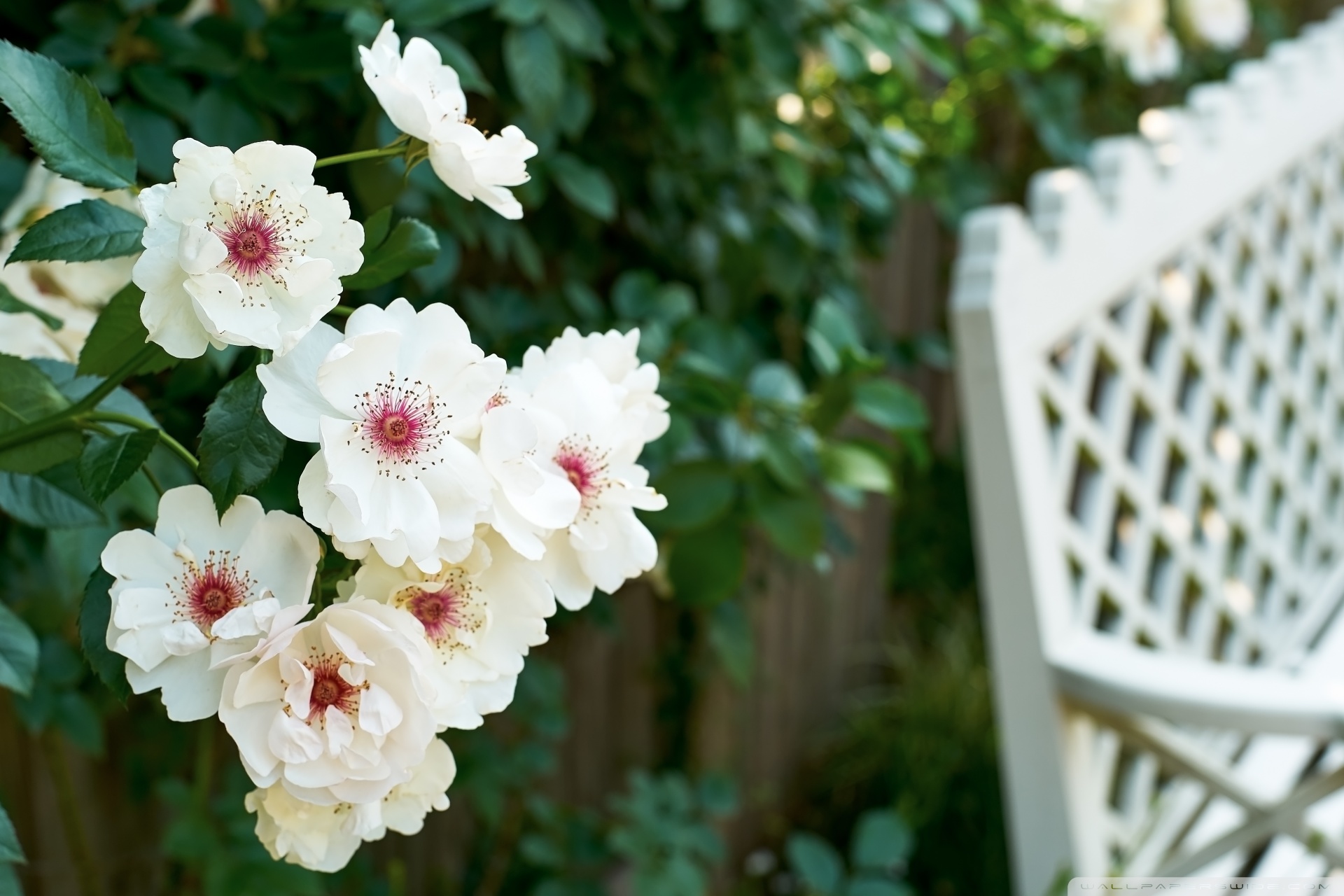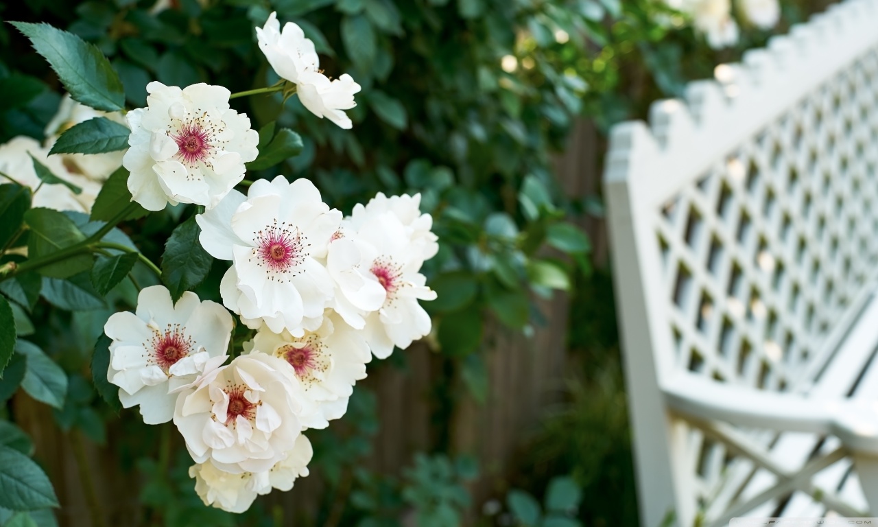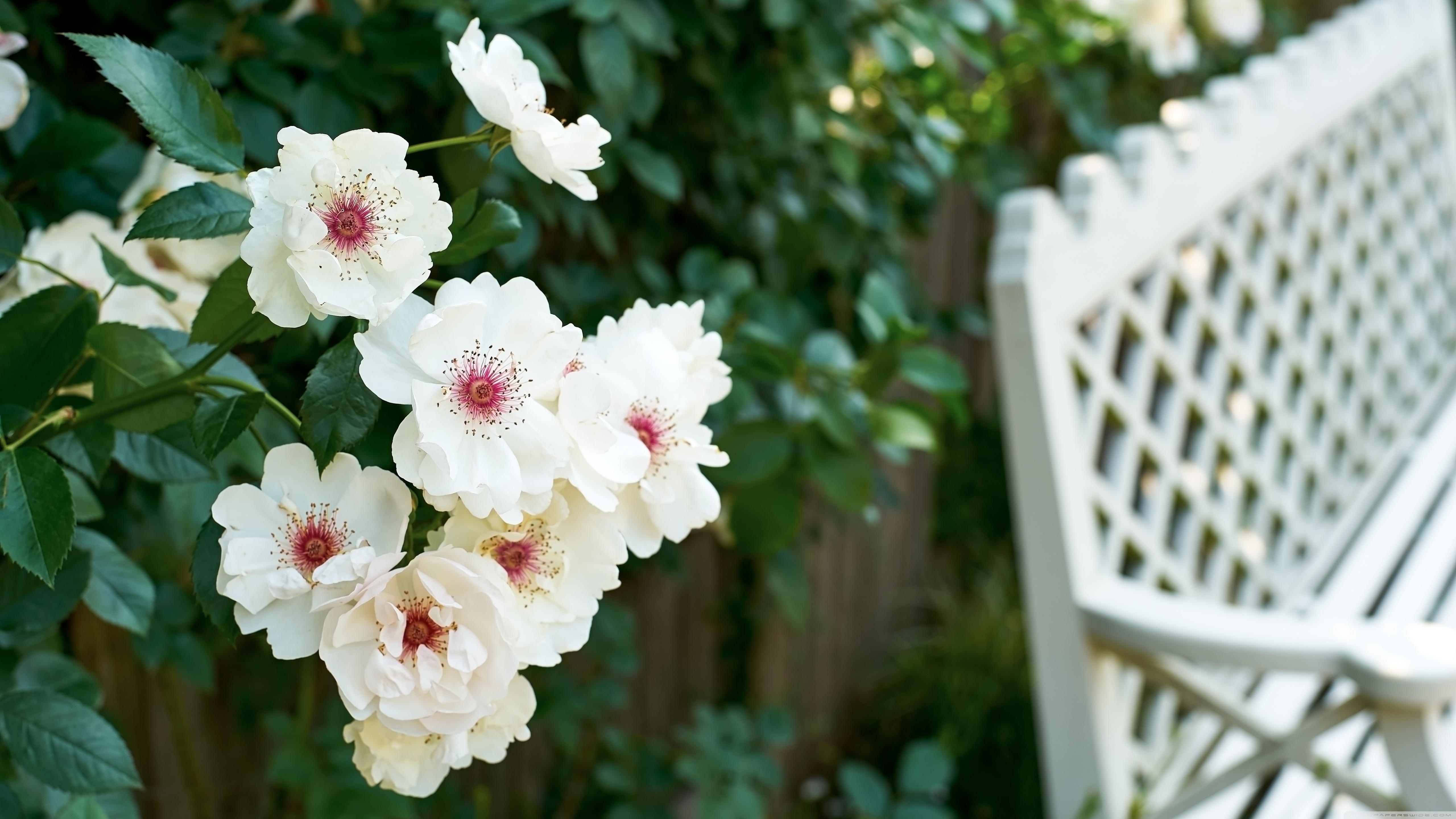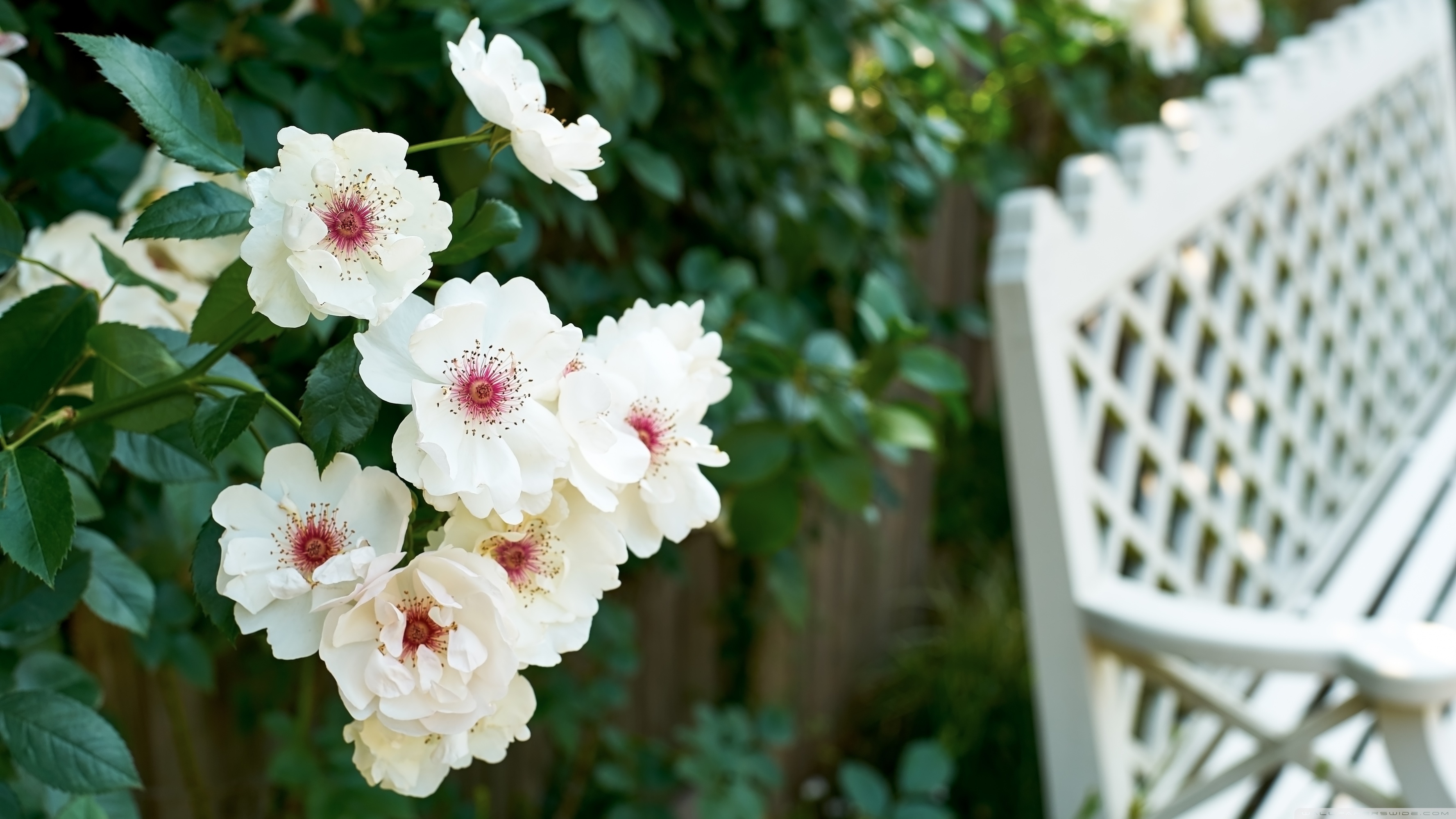 Download Garden Scene with Rose Cluster and White Bench 4K UHD Wallpaper