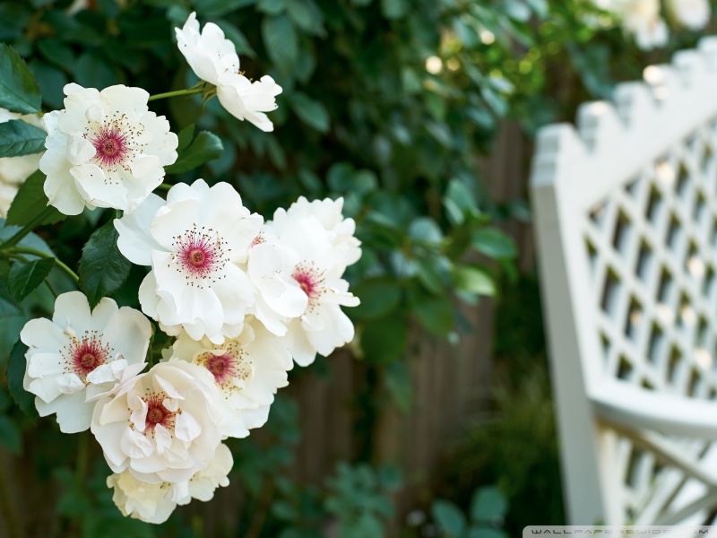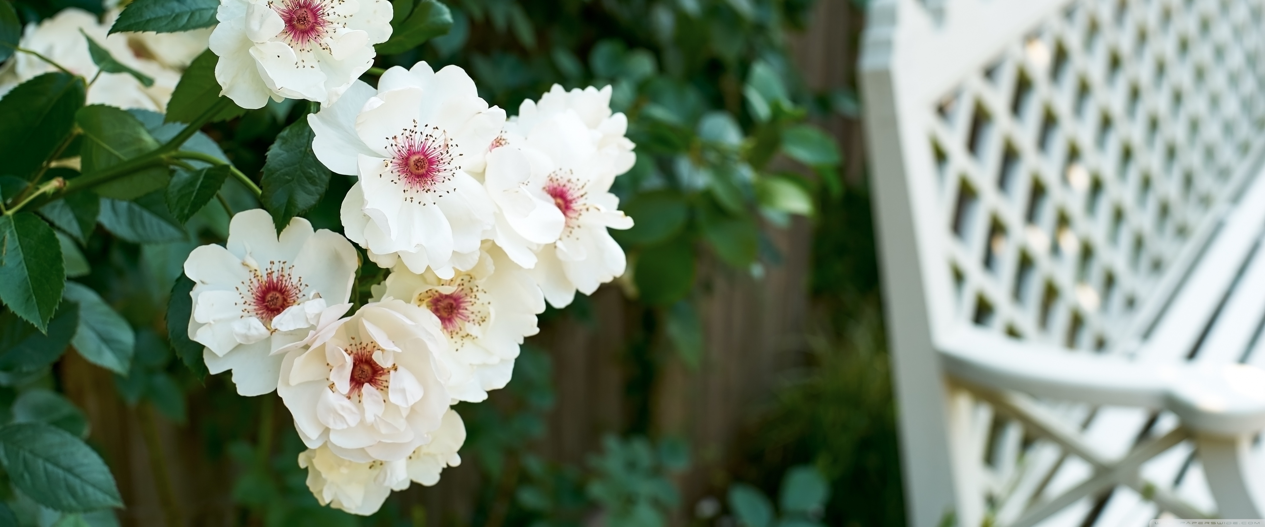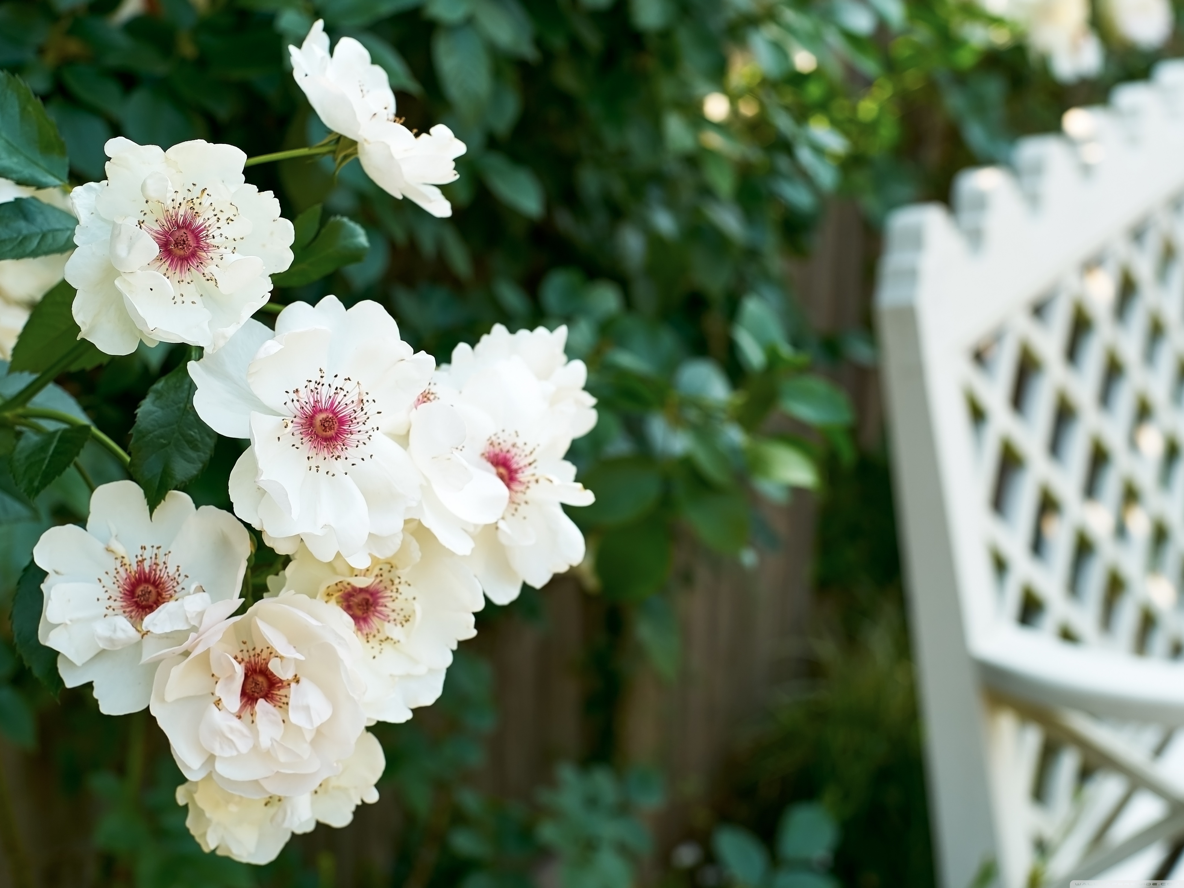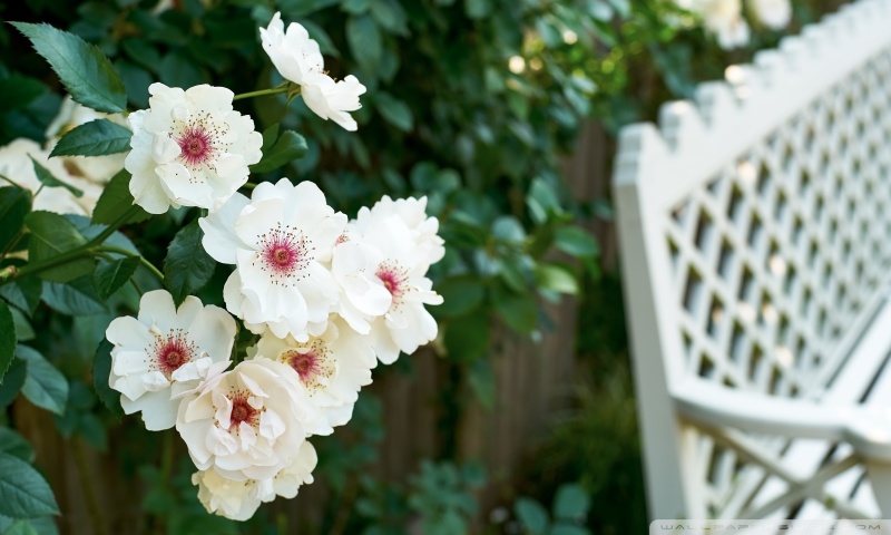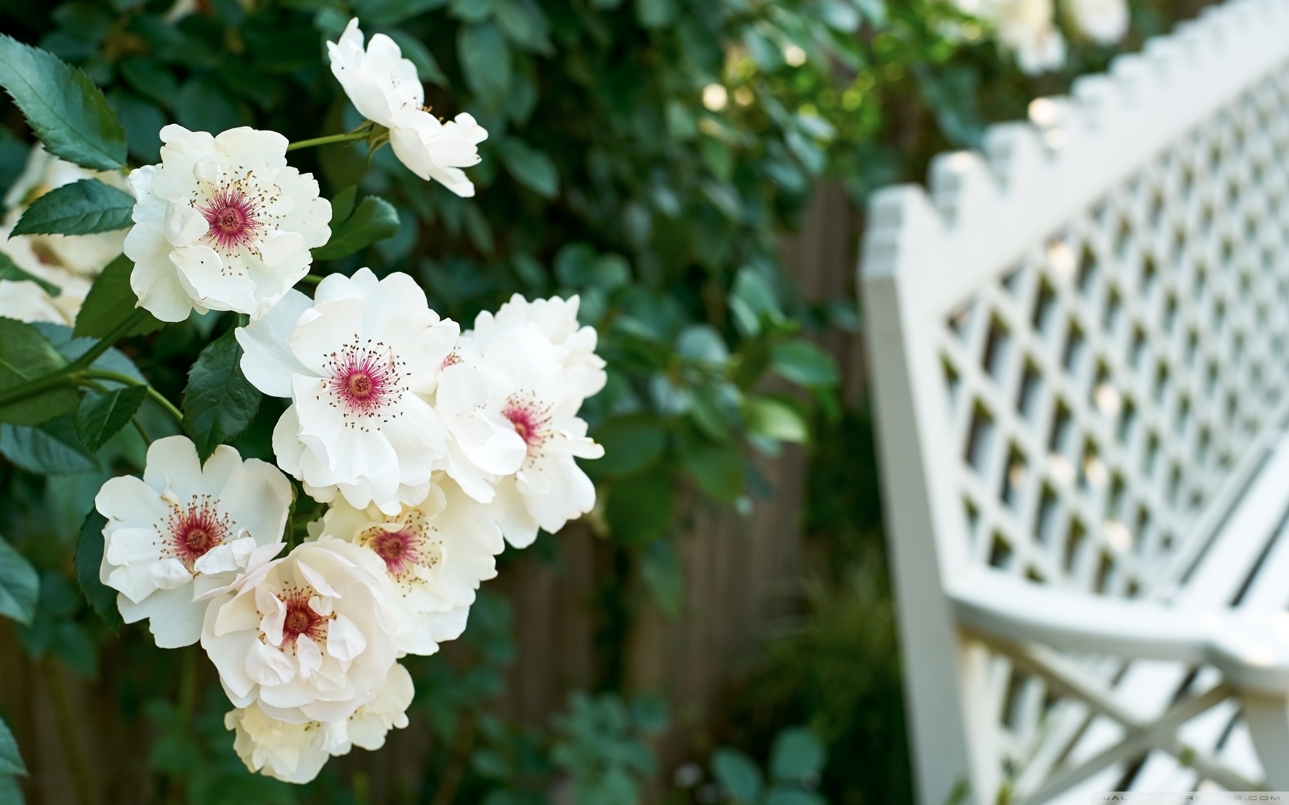 Download Garden Scene with Rose Cluster and White Bench 4K UHD Wallpaper