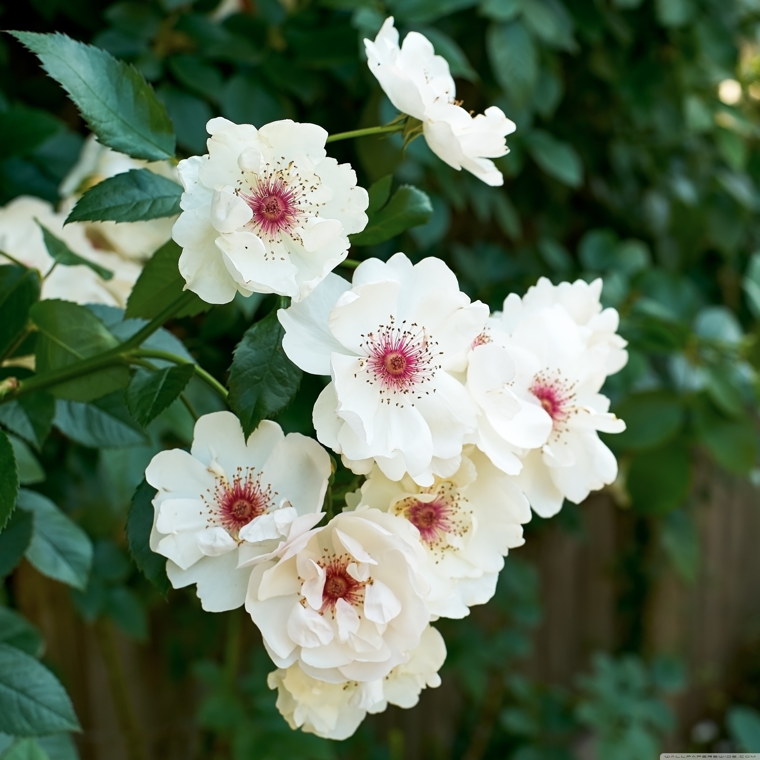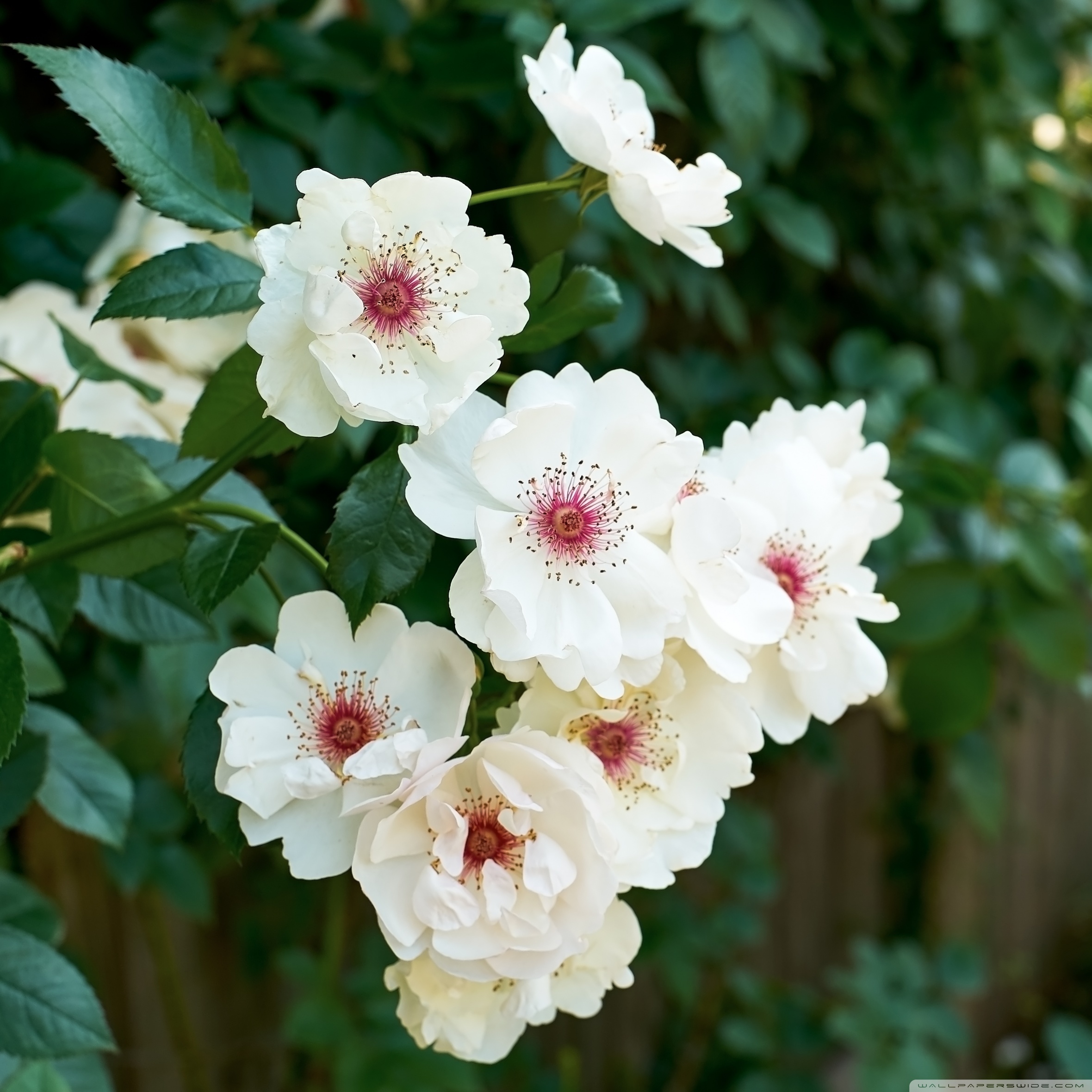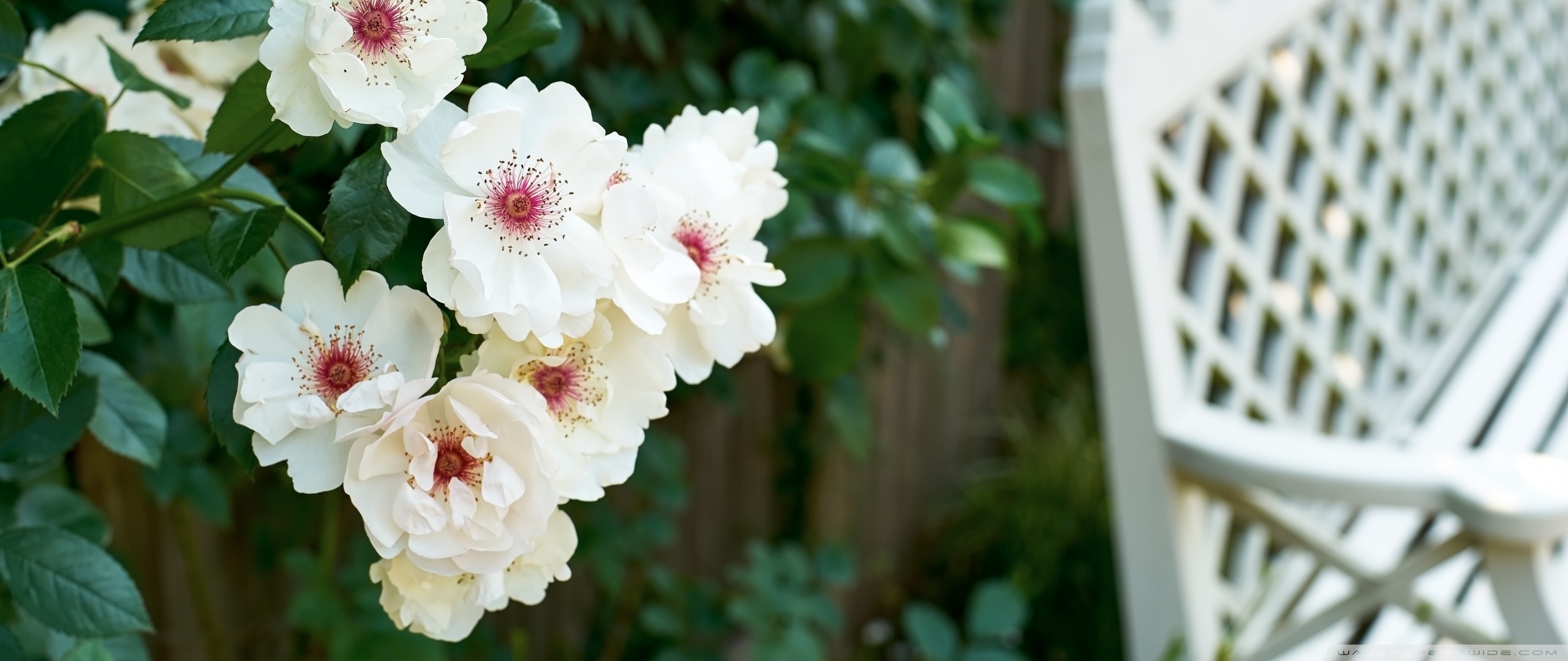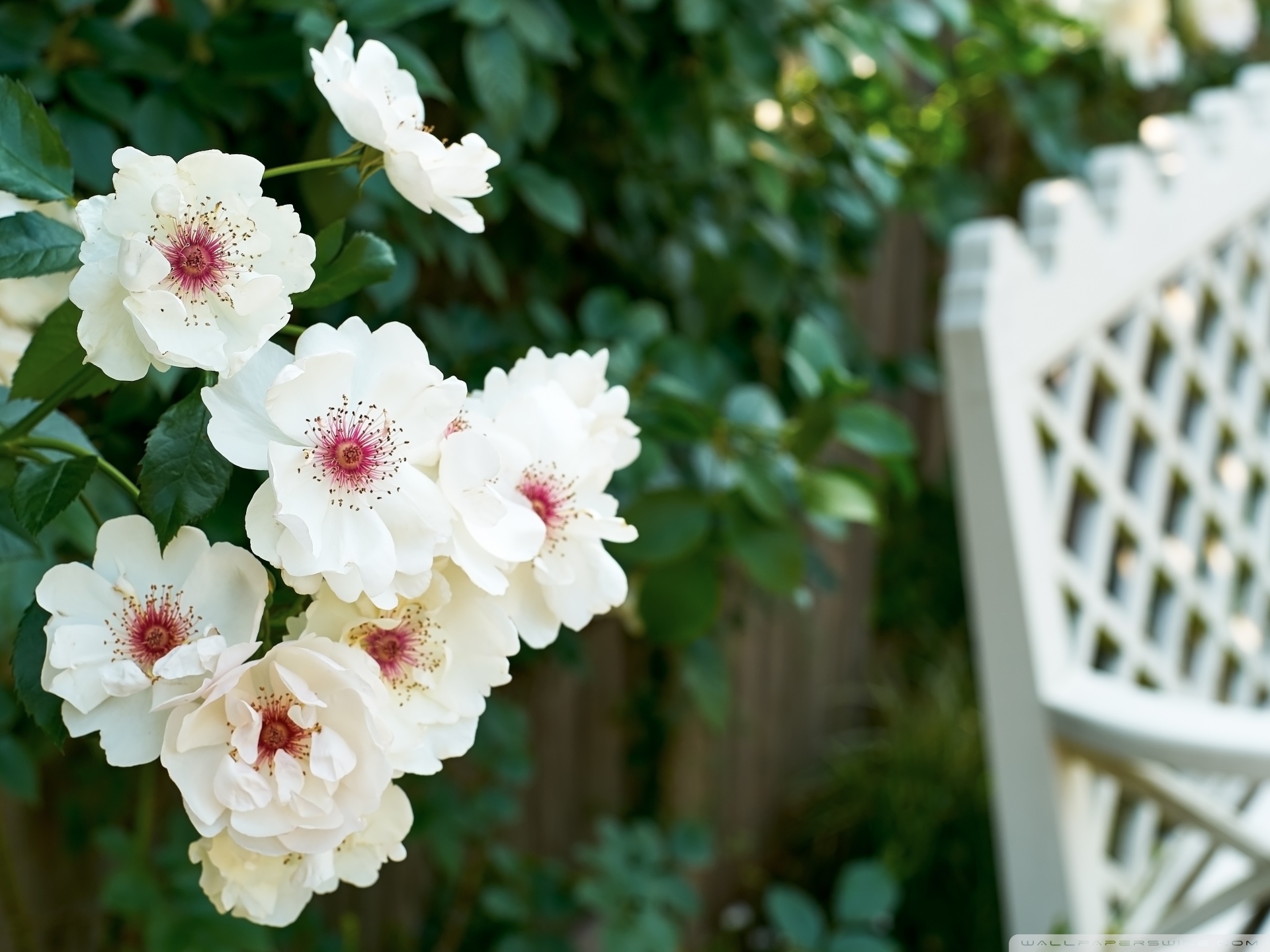 Download Garden Scene with Rose Cluster and White Bench 4K UHD Wallpaper
