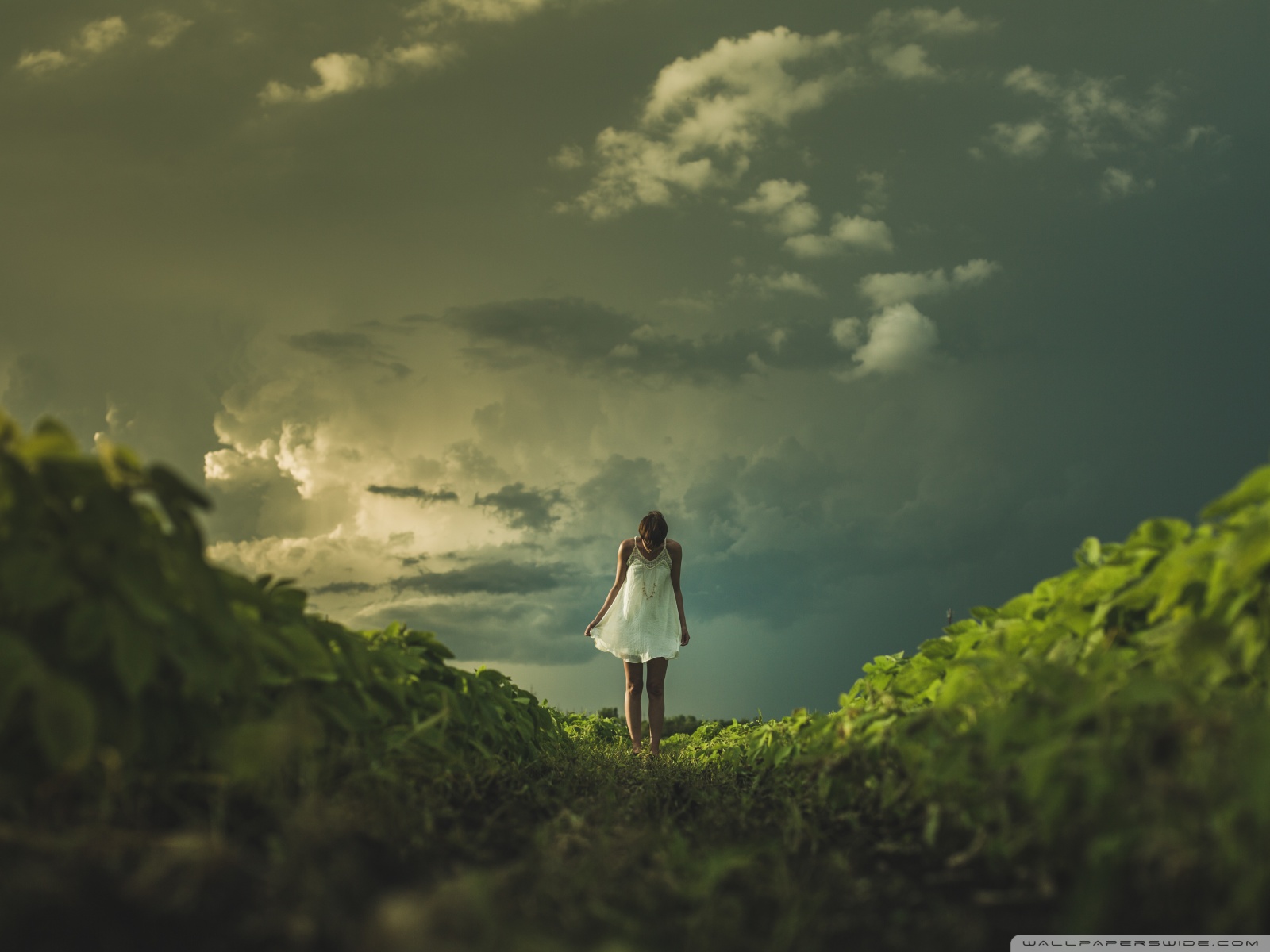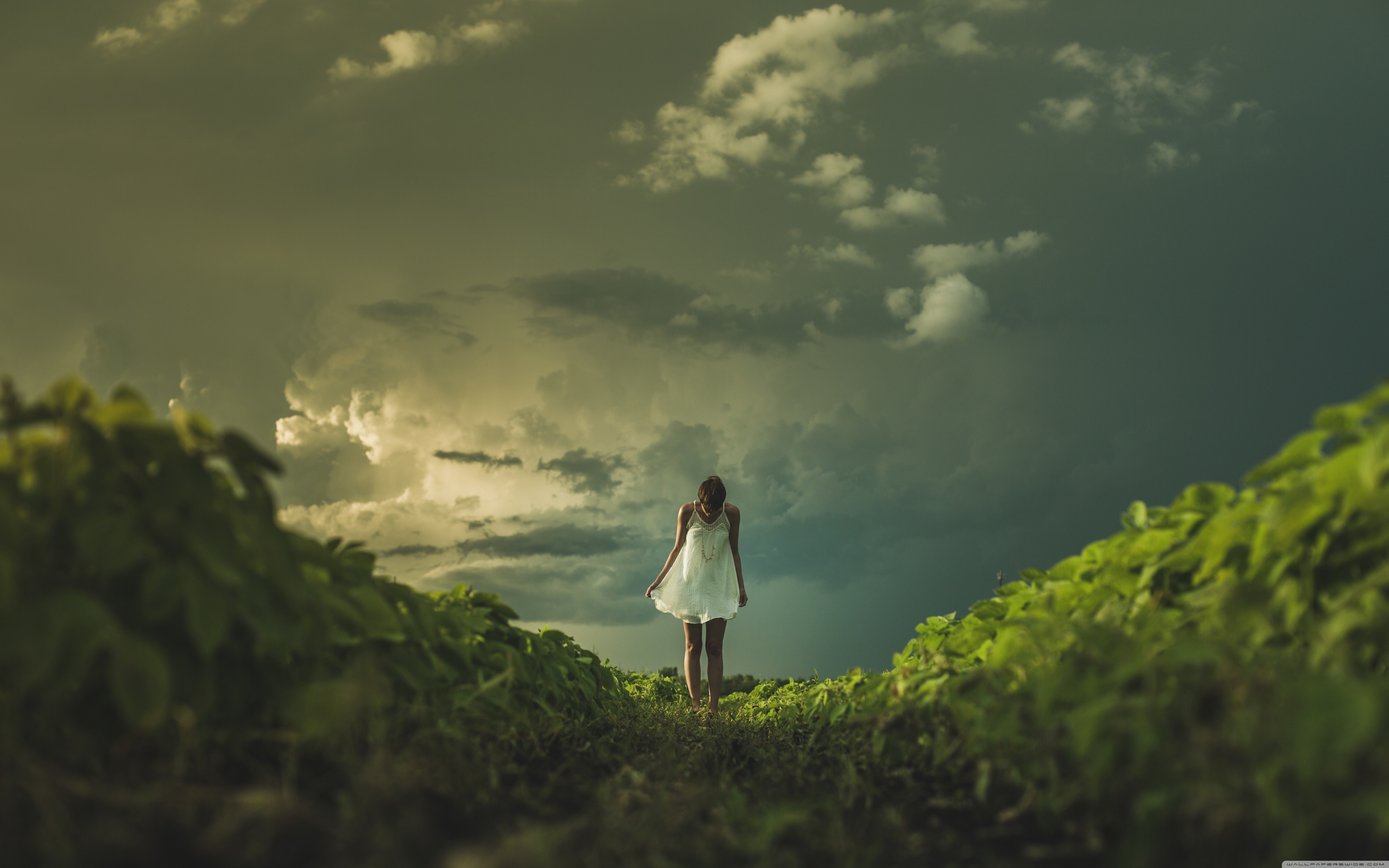 Download Girl, Field, Storm Clouds 4K UHD Wallpaper