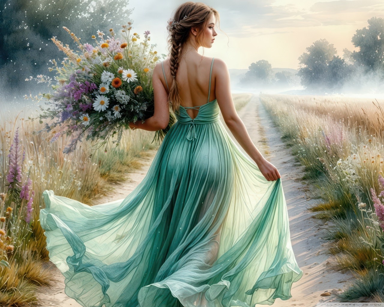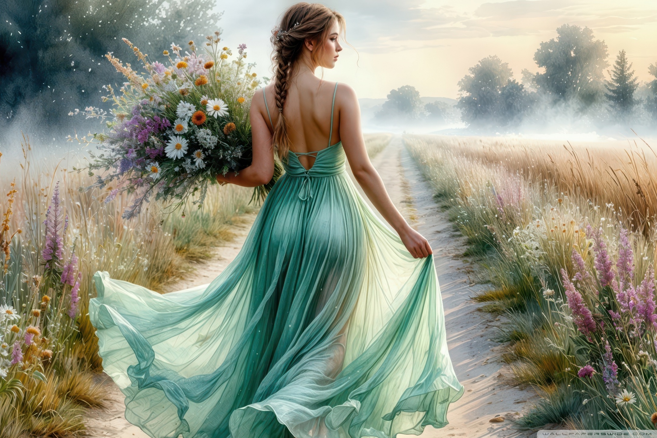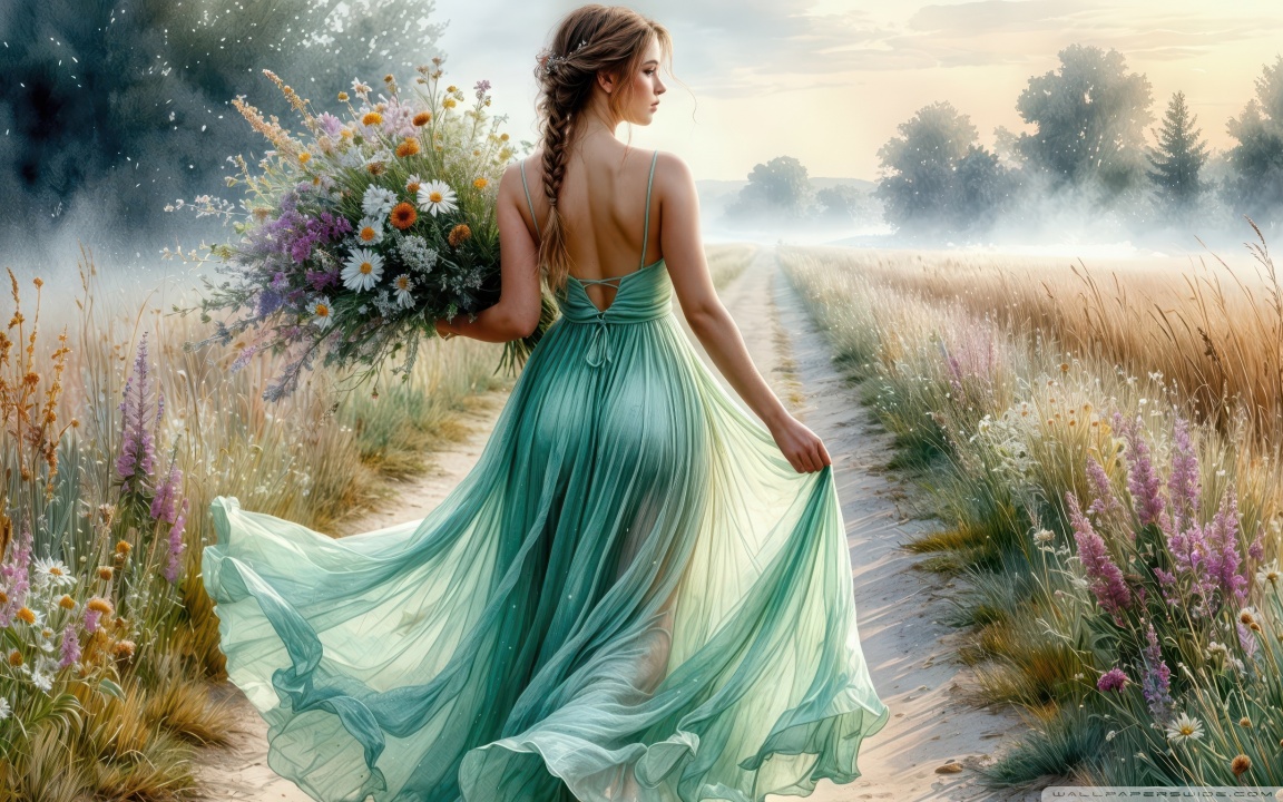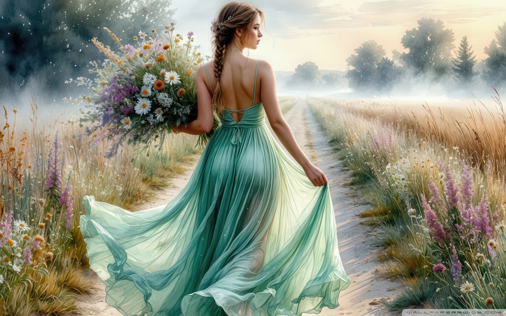 Download Girl in a Flowy Dress on a Country Road 4K UHD Wallpaper