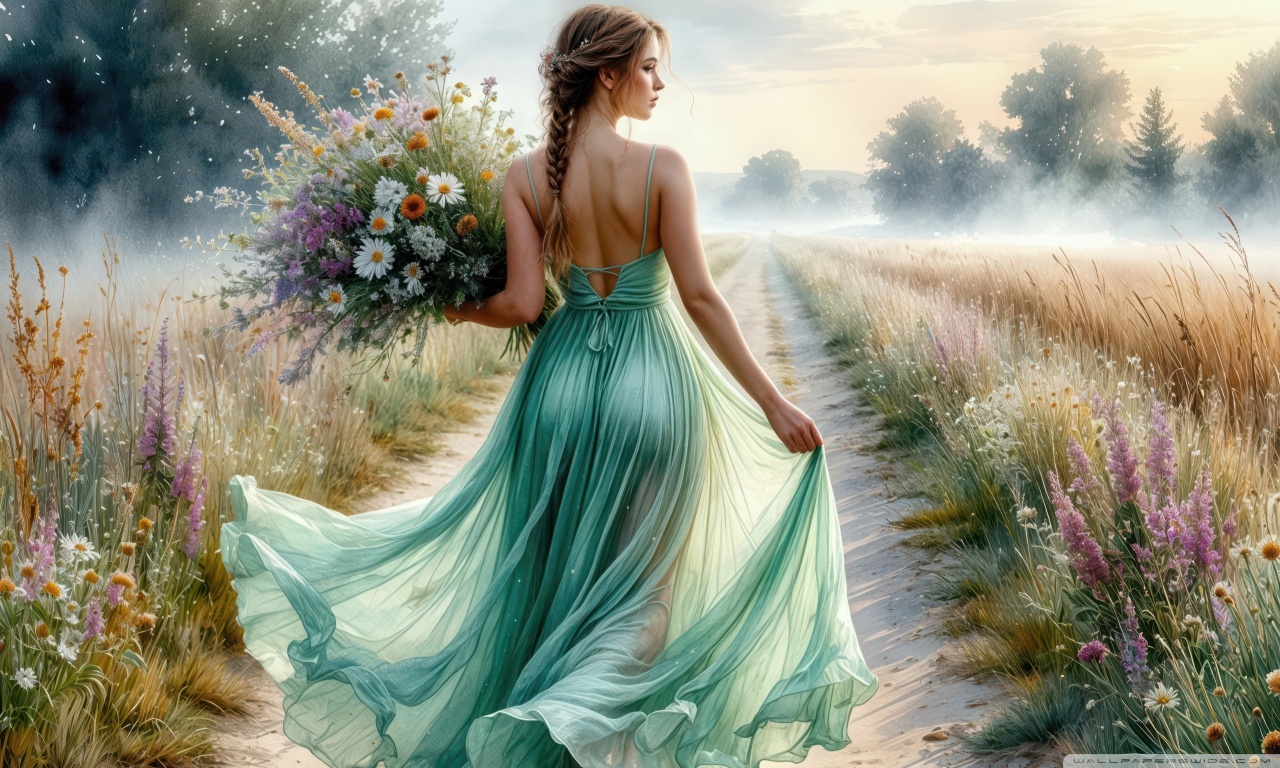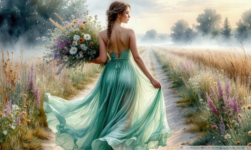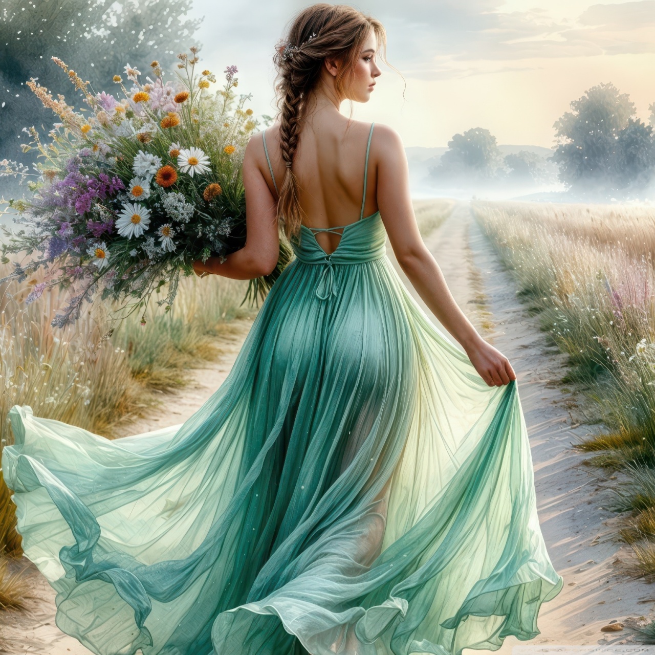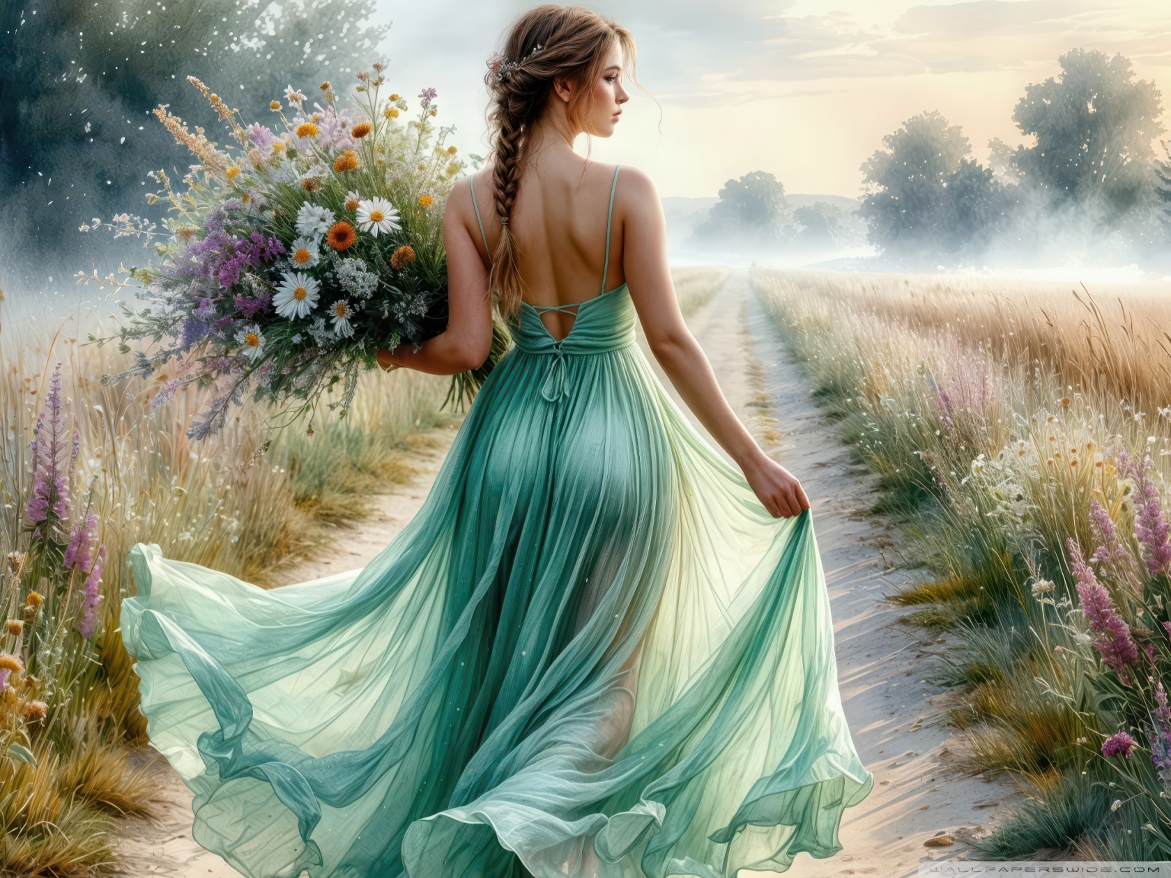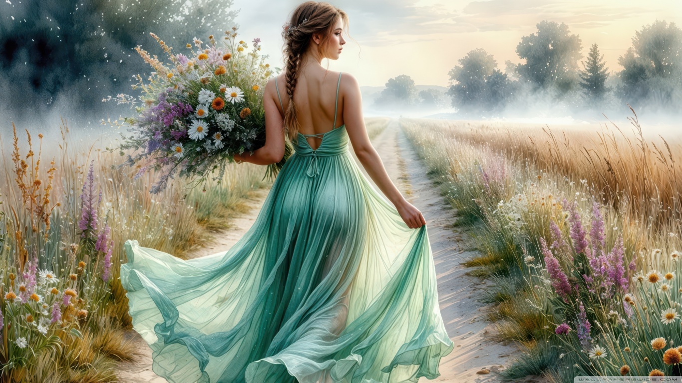 Download Girl in a Flowy Dress on a Country Road 4K UHD Wallpaper