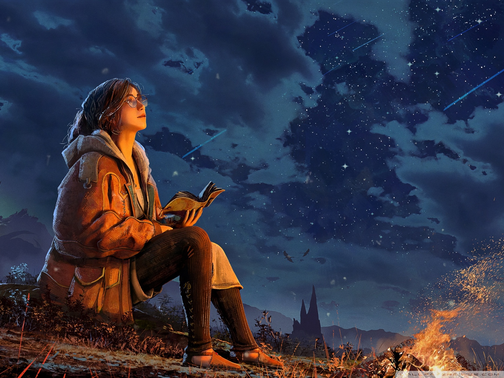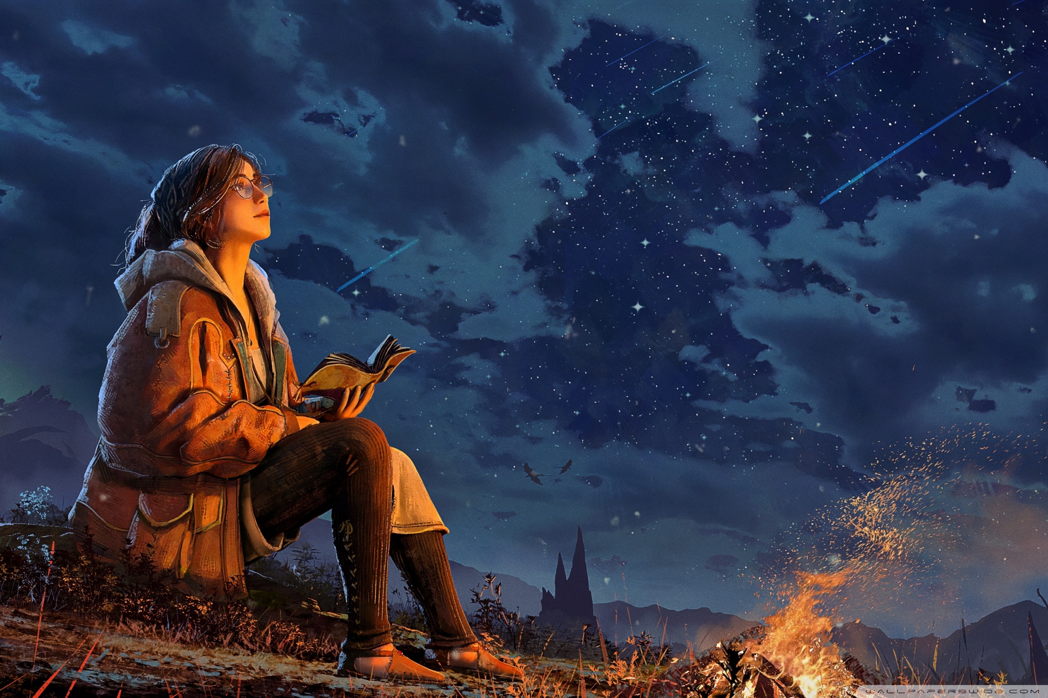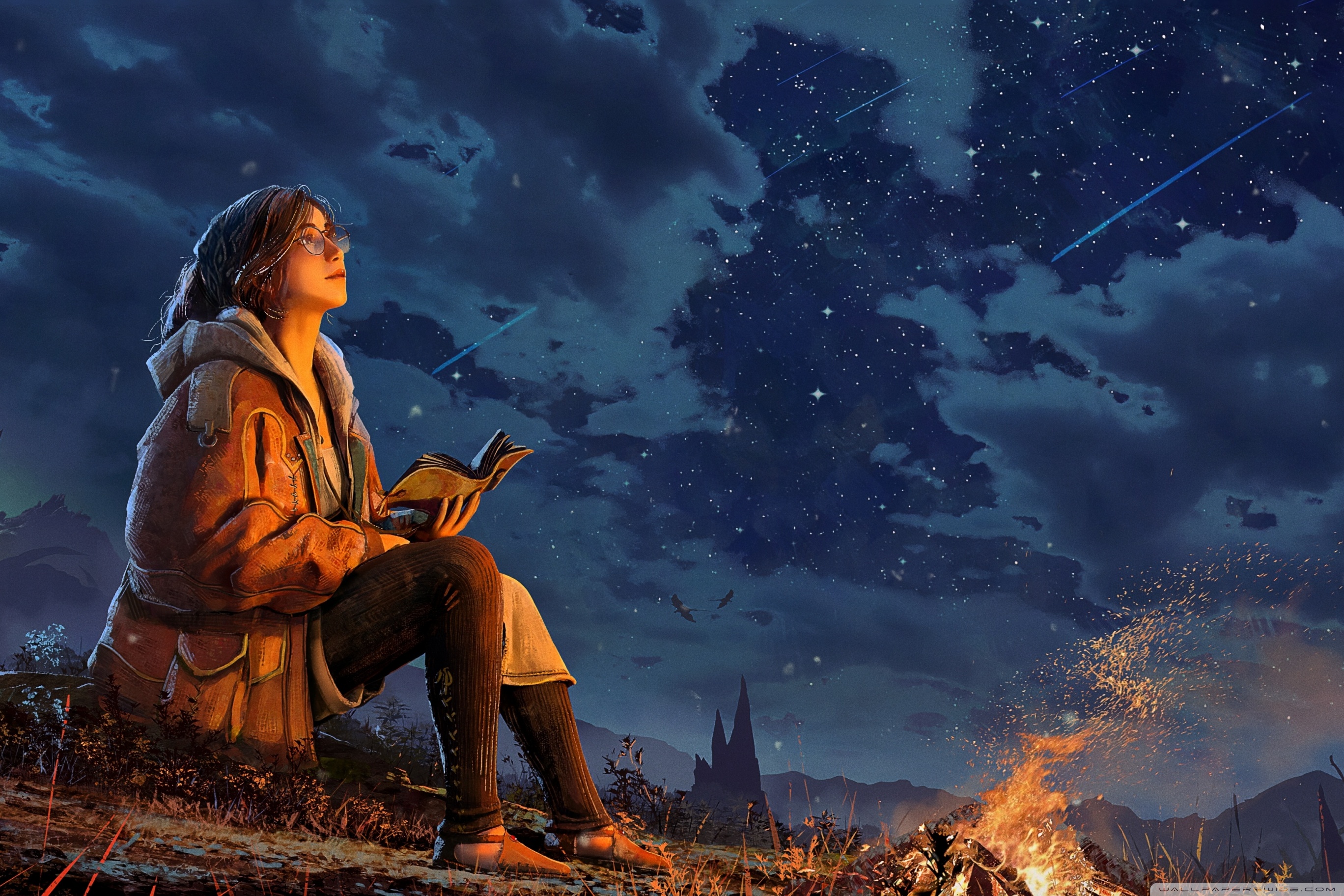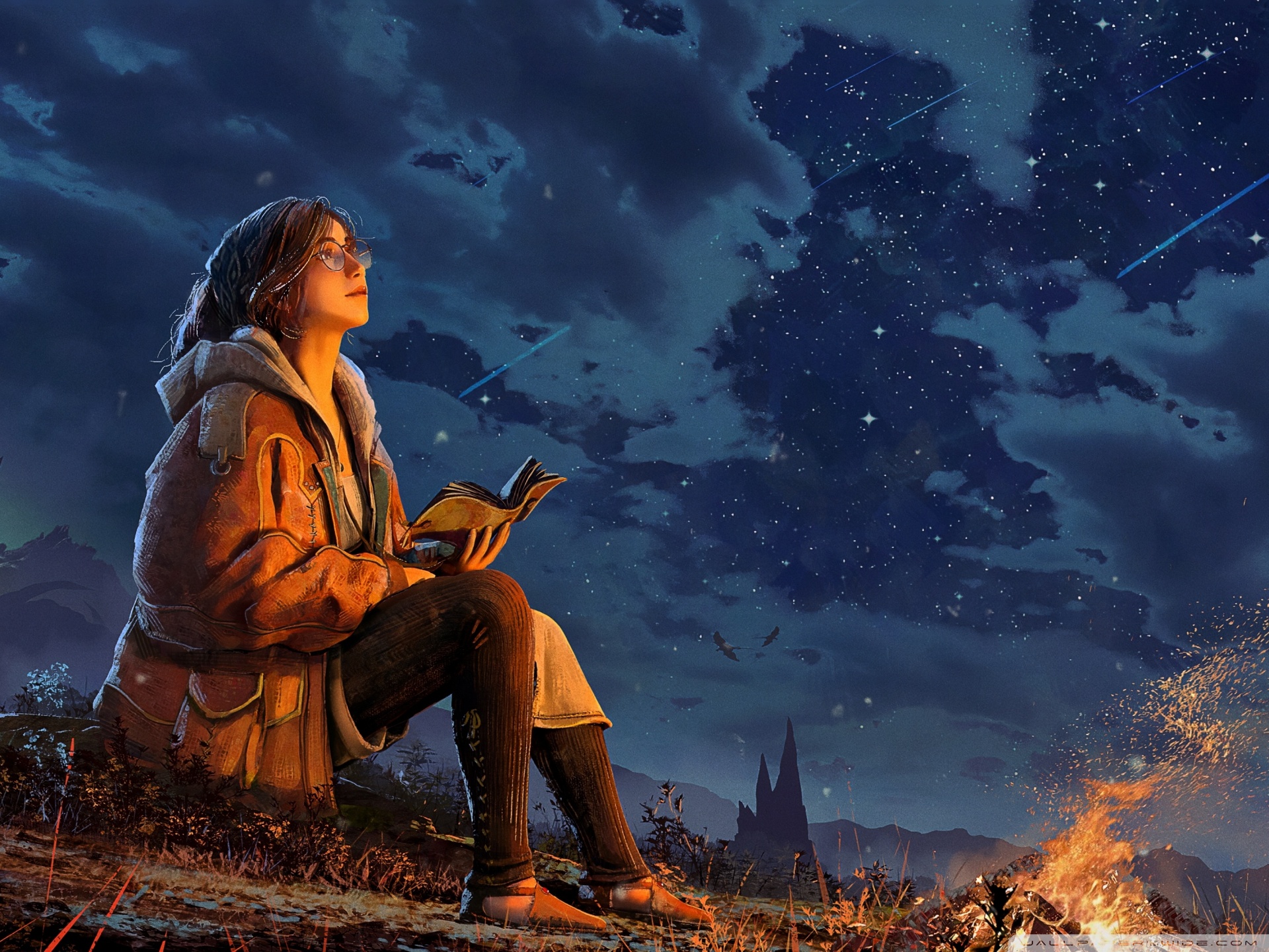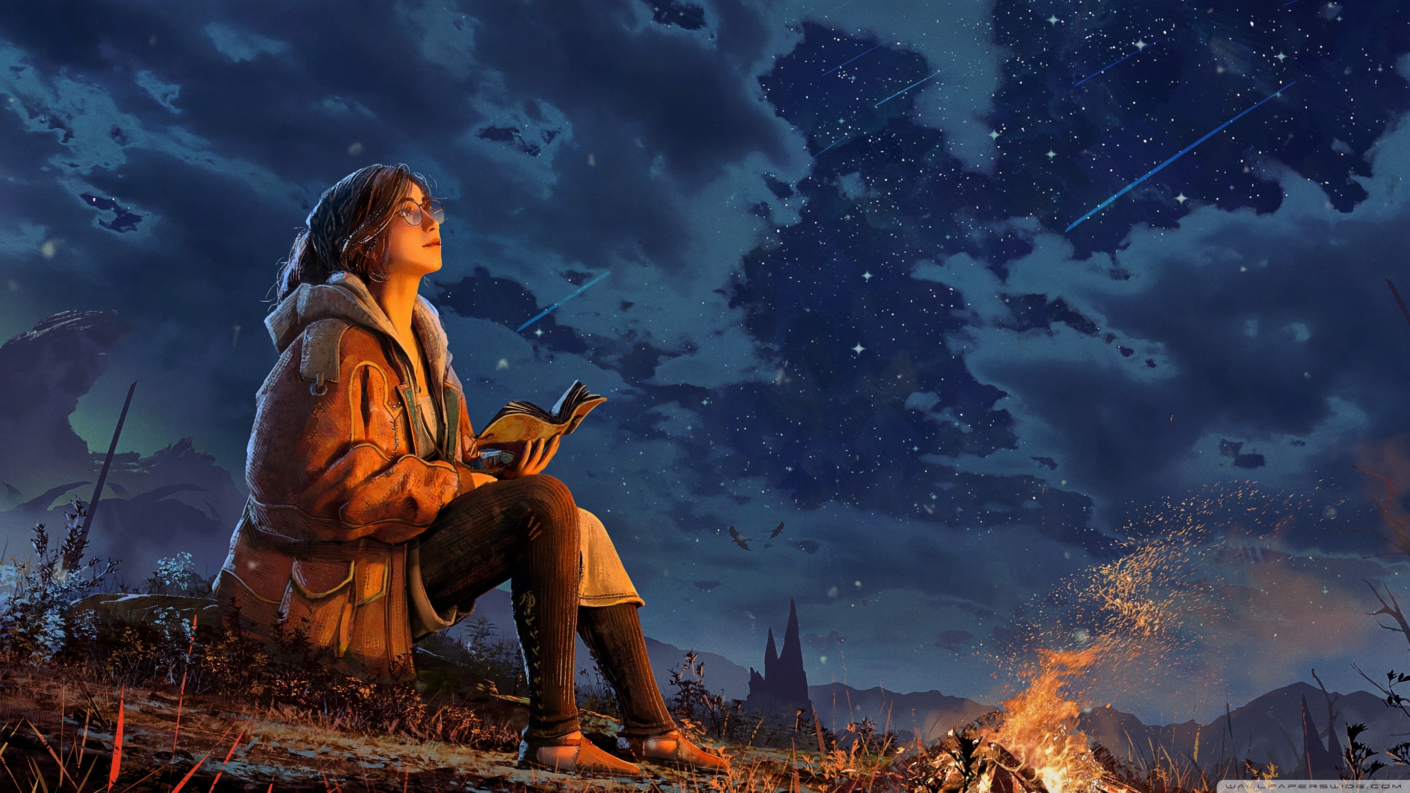 Download Girl Stargazing by a Campfire at Night 4K UHD Wallpaper
