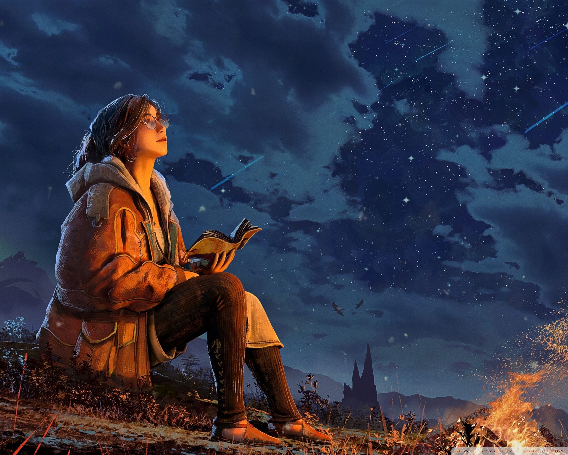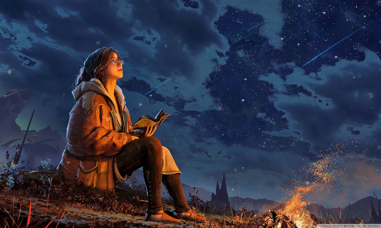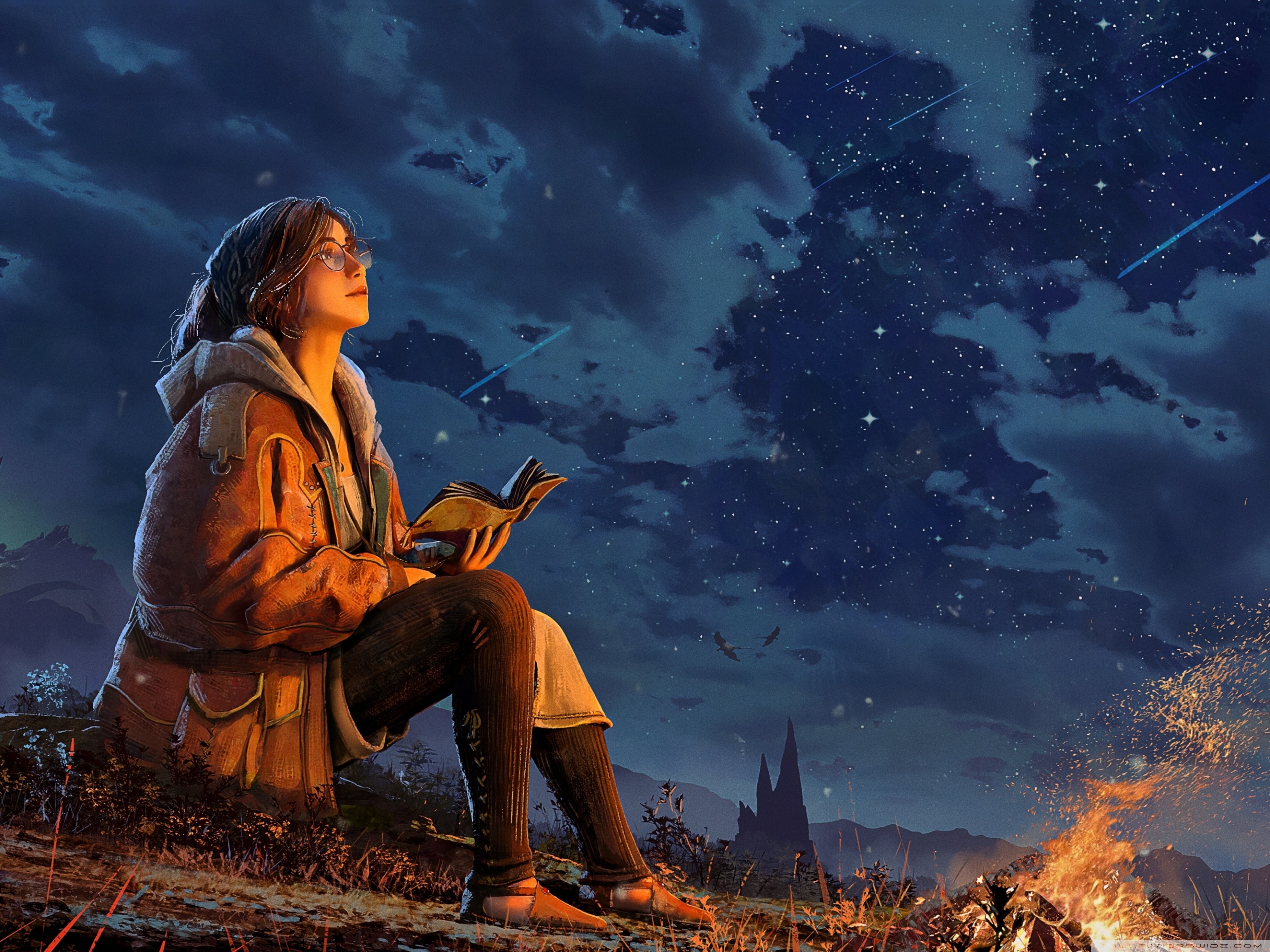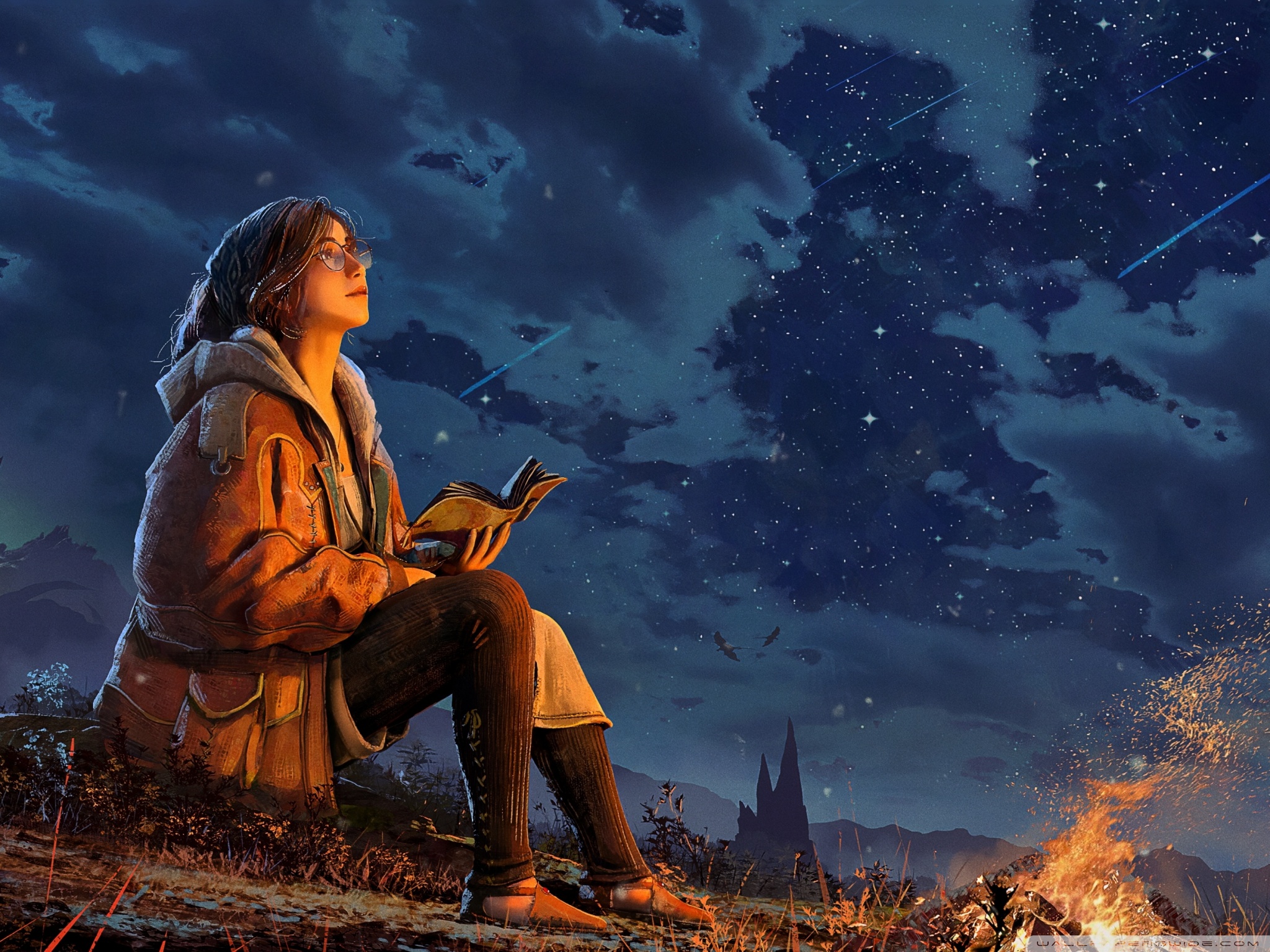 Download Girl Stargazing by a Campfire at Night 4K UHD Wallpaper