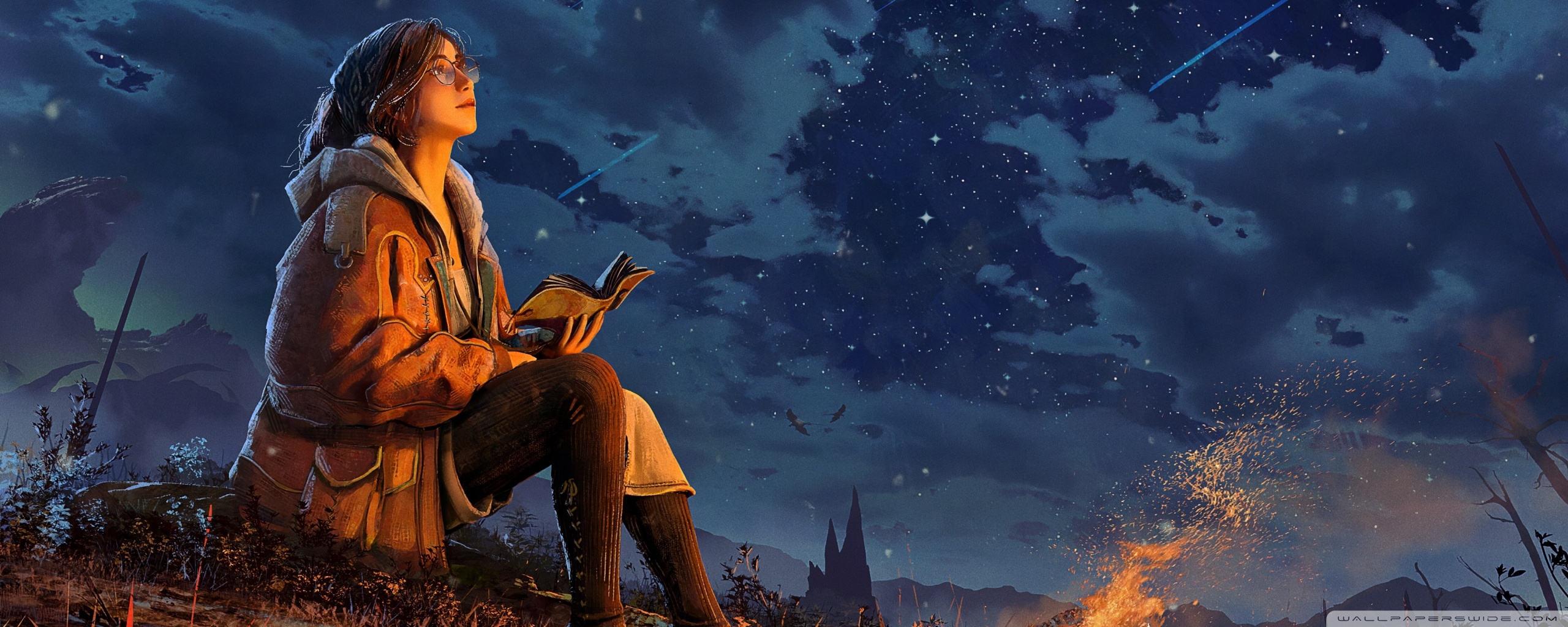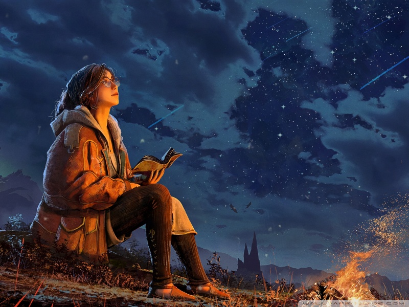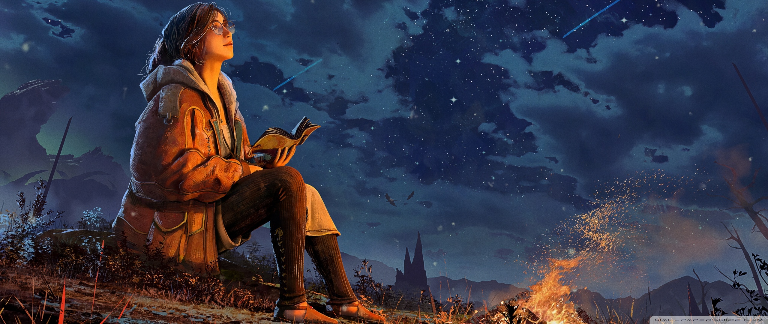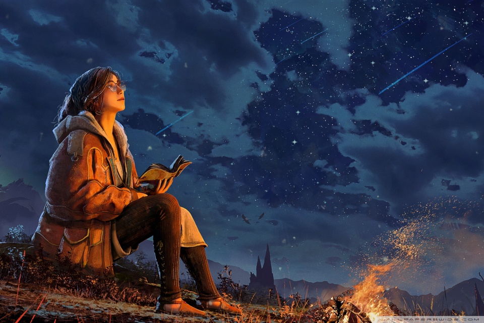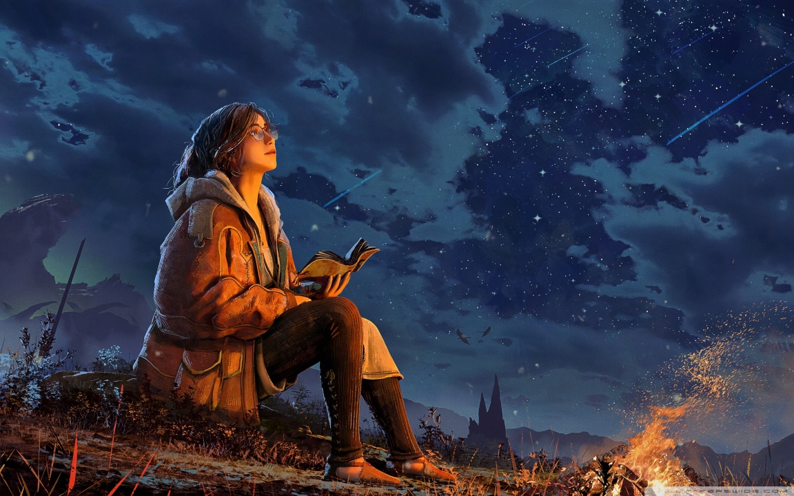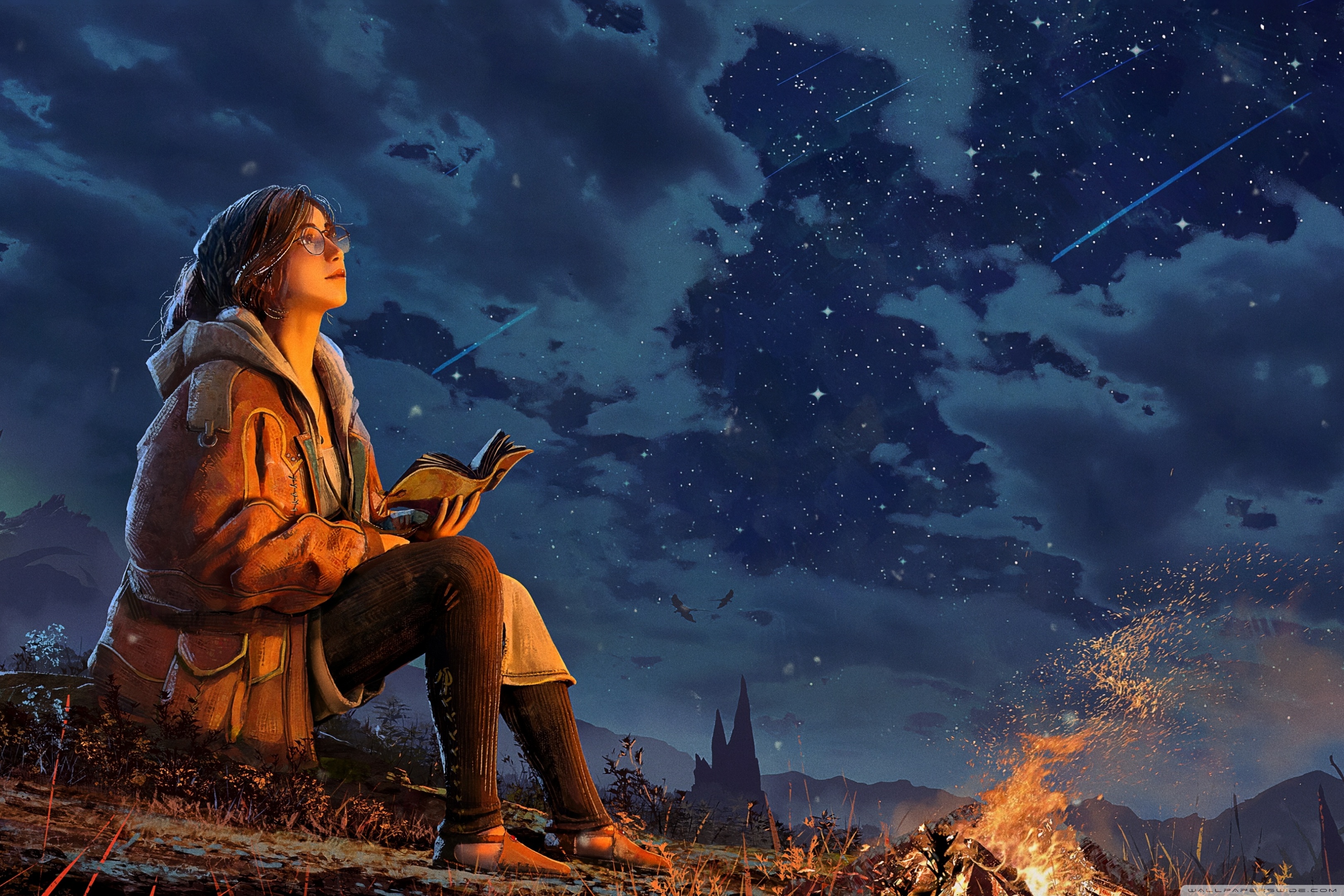 Download Girl Stargazing by a Campfire at Night 4K UHD Wallpaper