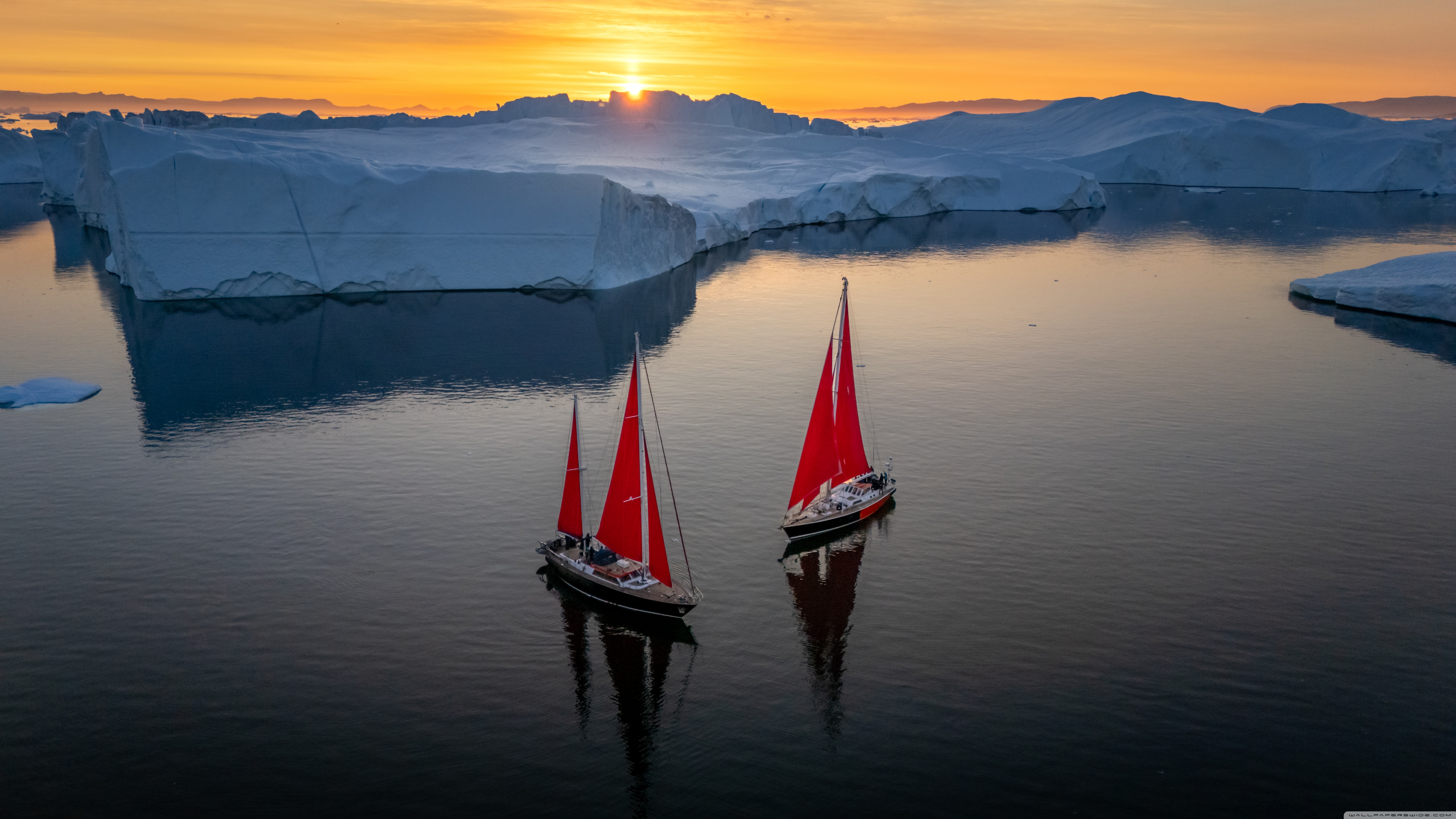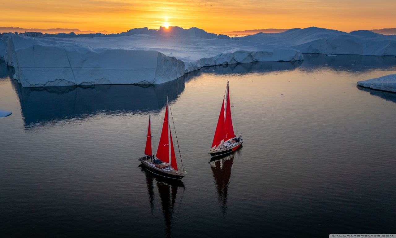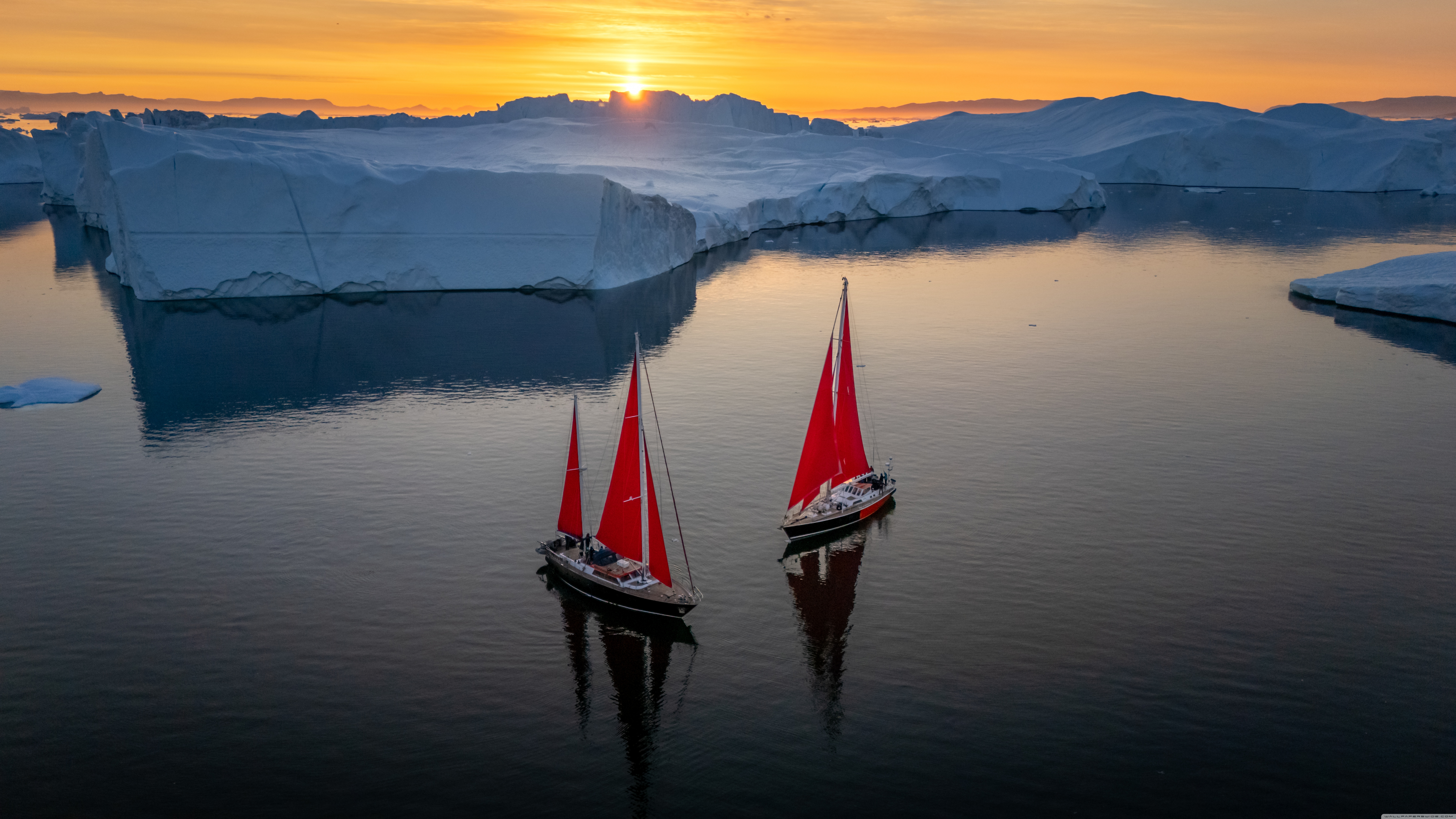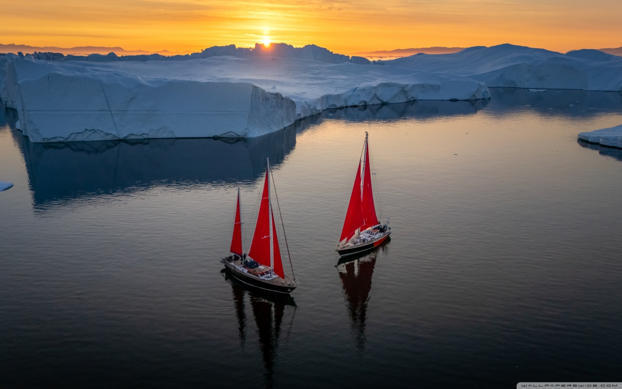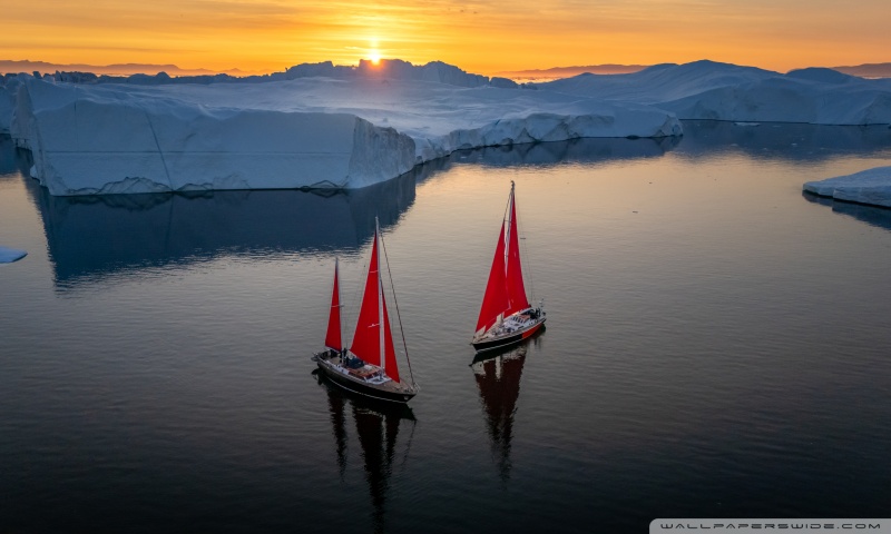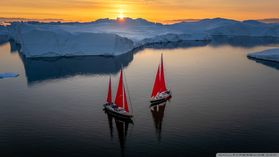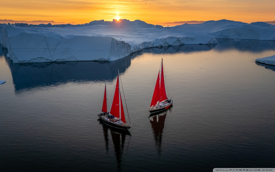 Download Greenland Sailing Boats at Sunset across Ice... 4K UHD Wallpaper
