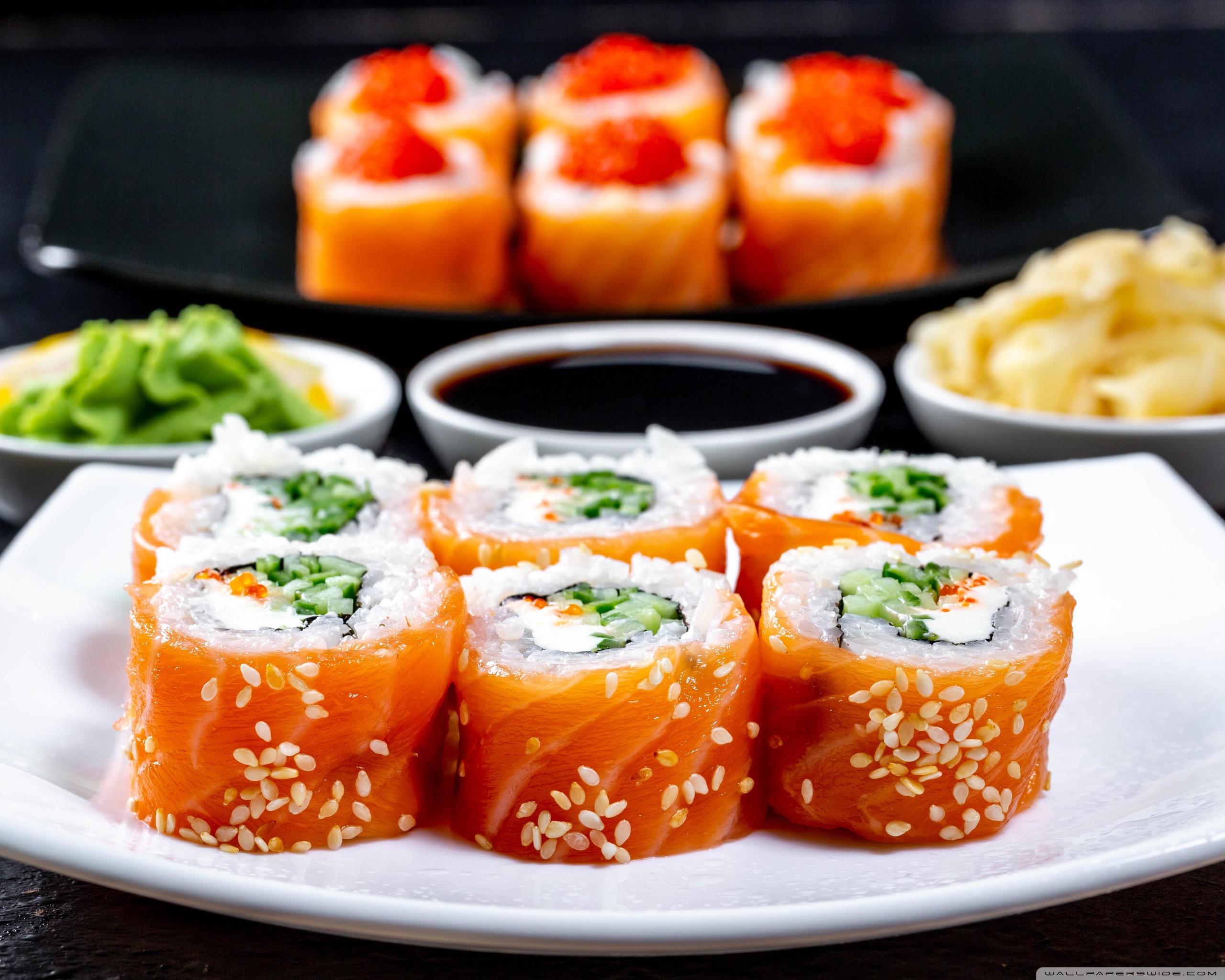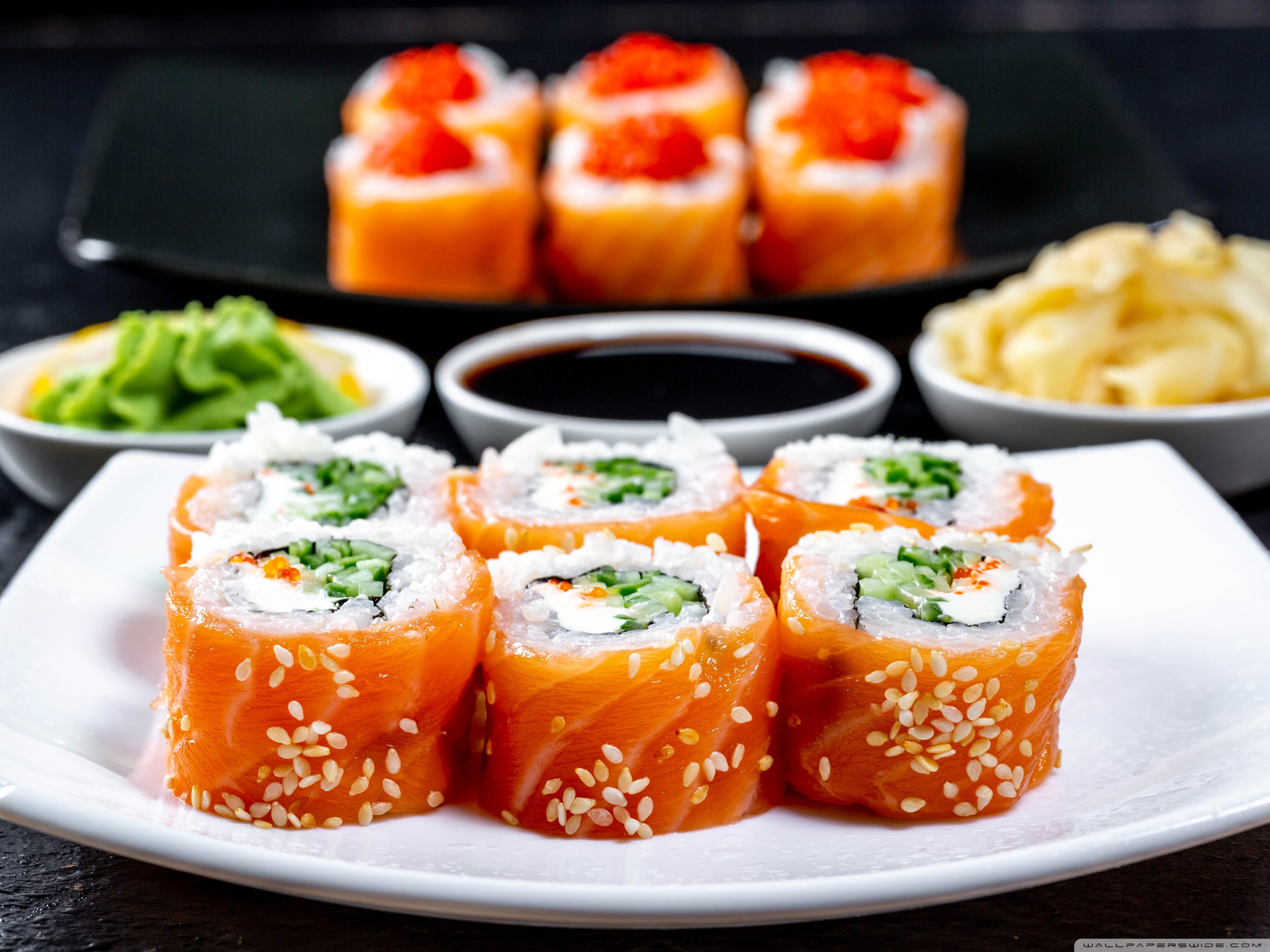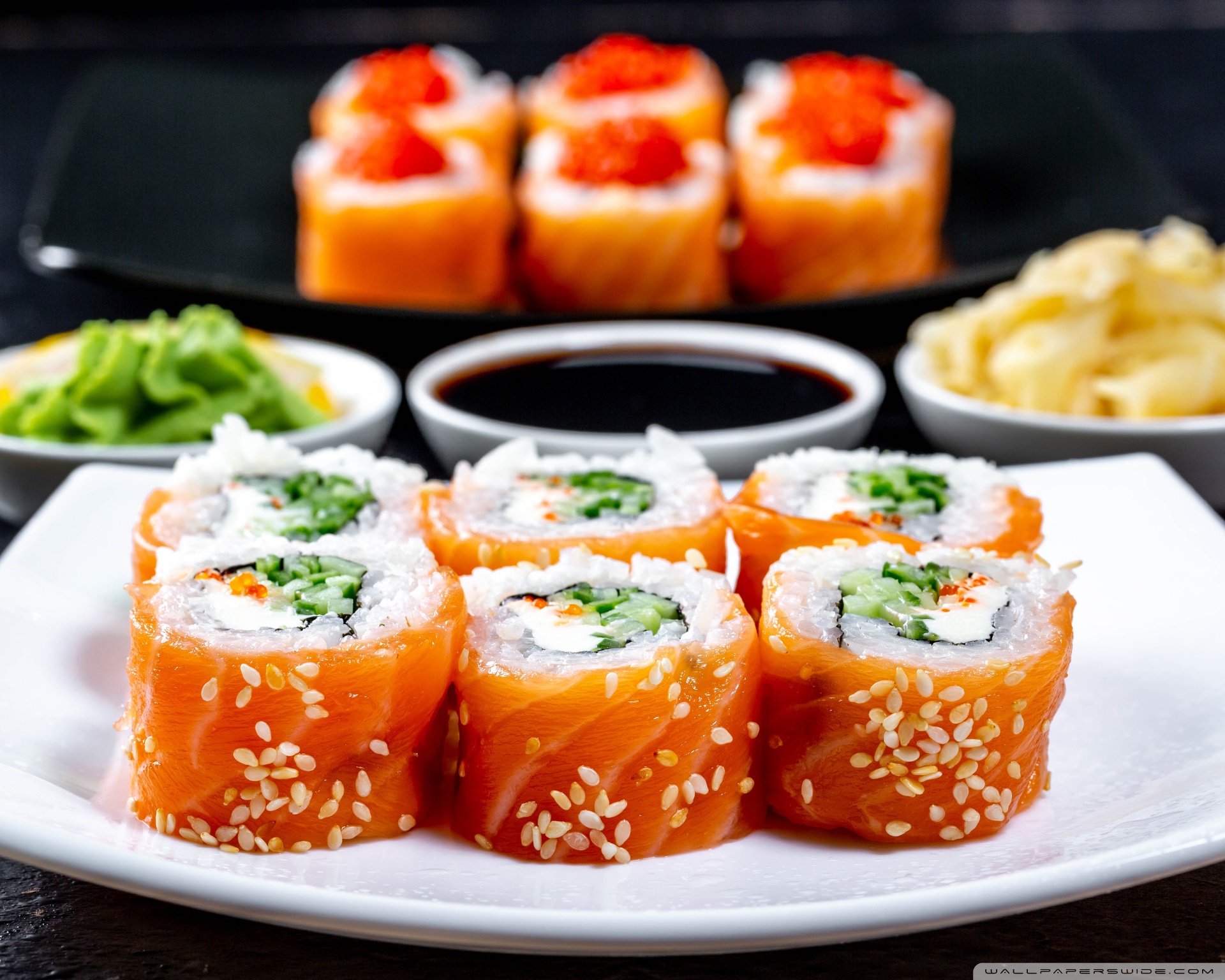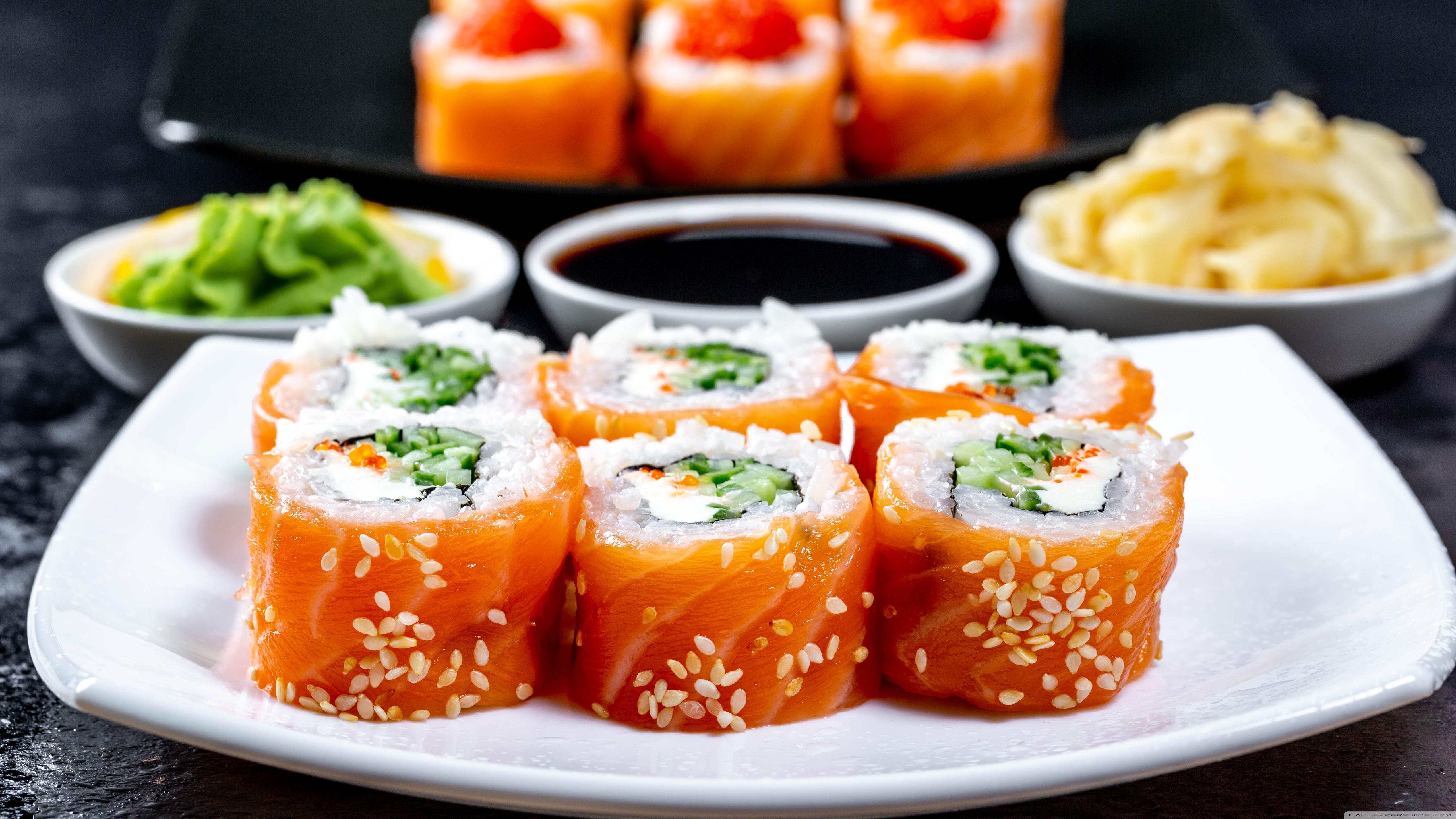 Download Japanese Sushi with Wasabi, Ginger and Soy Sauce 4K UHD Wallpaper