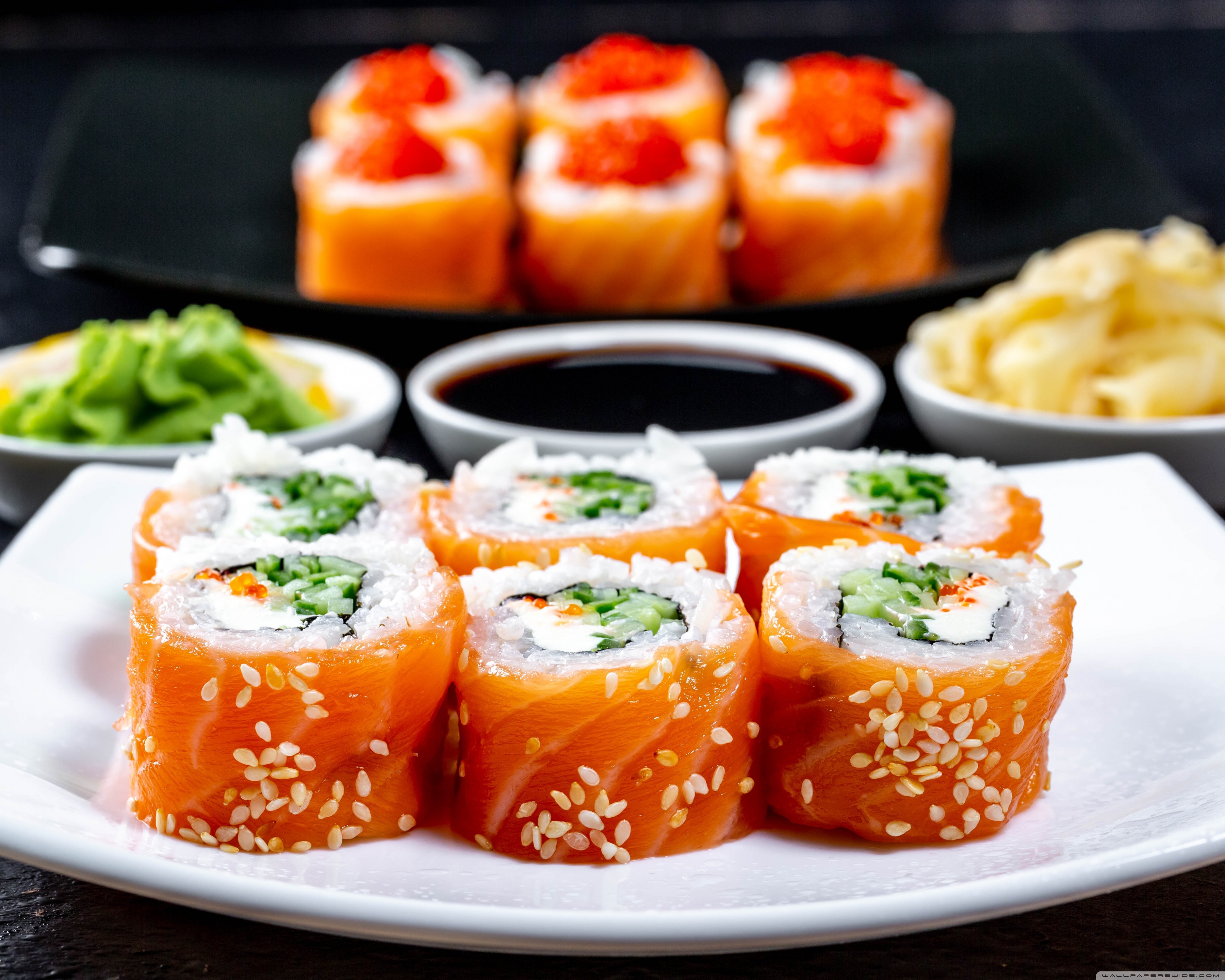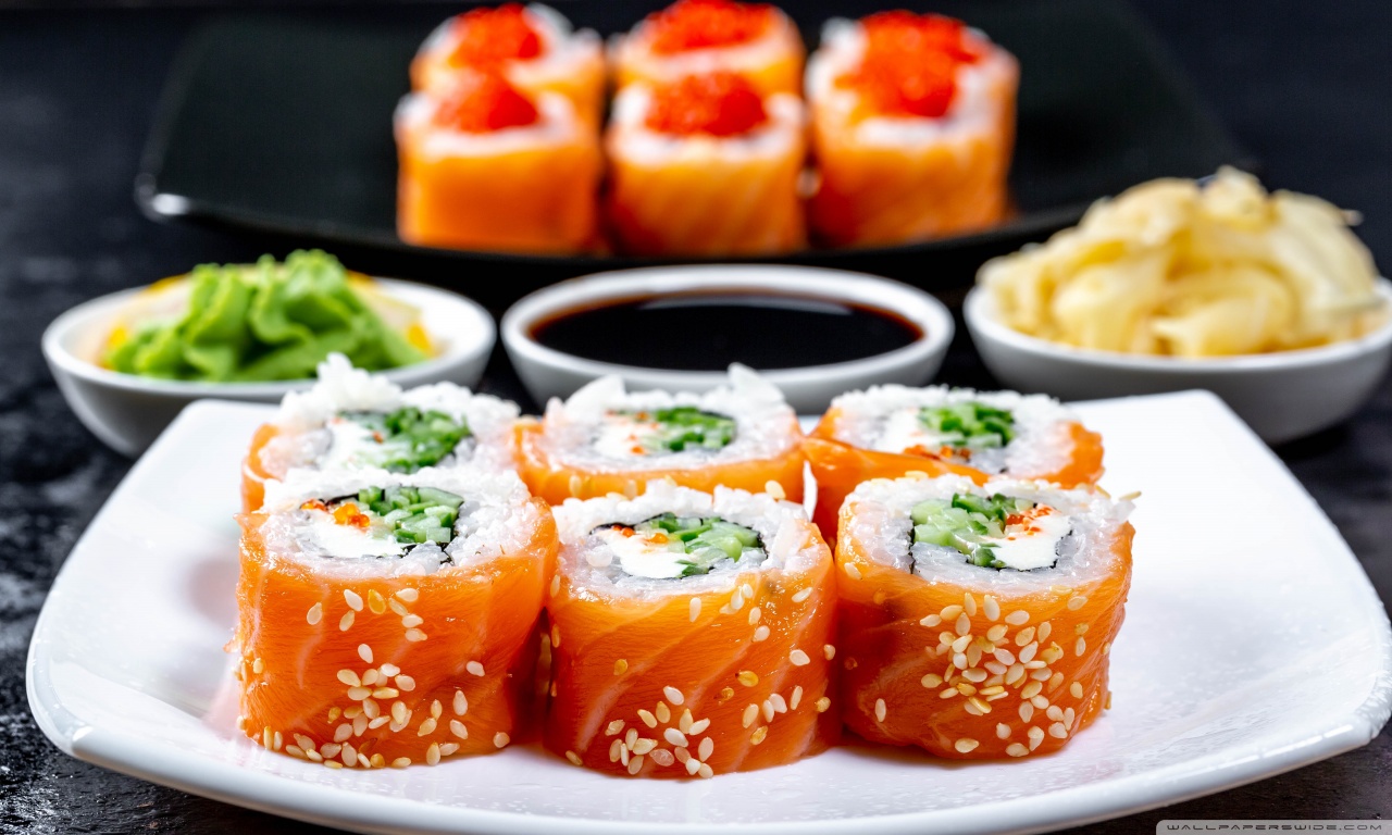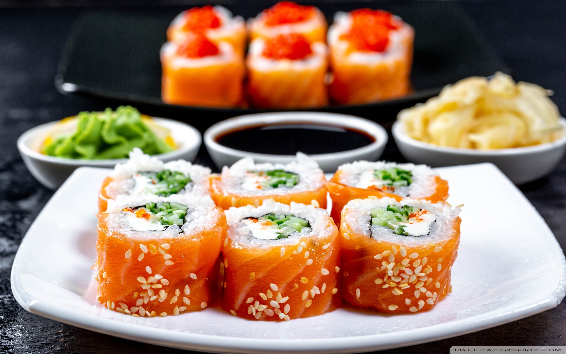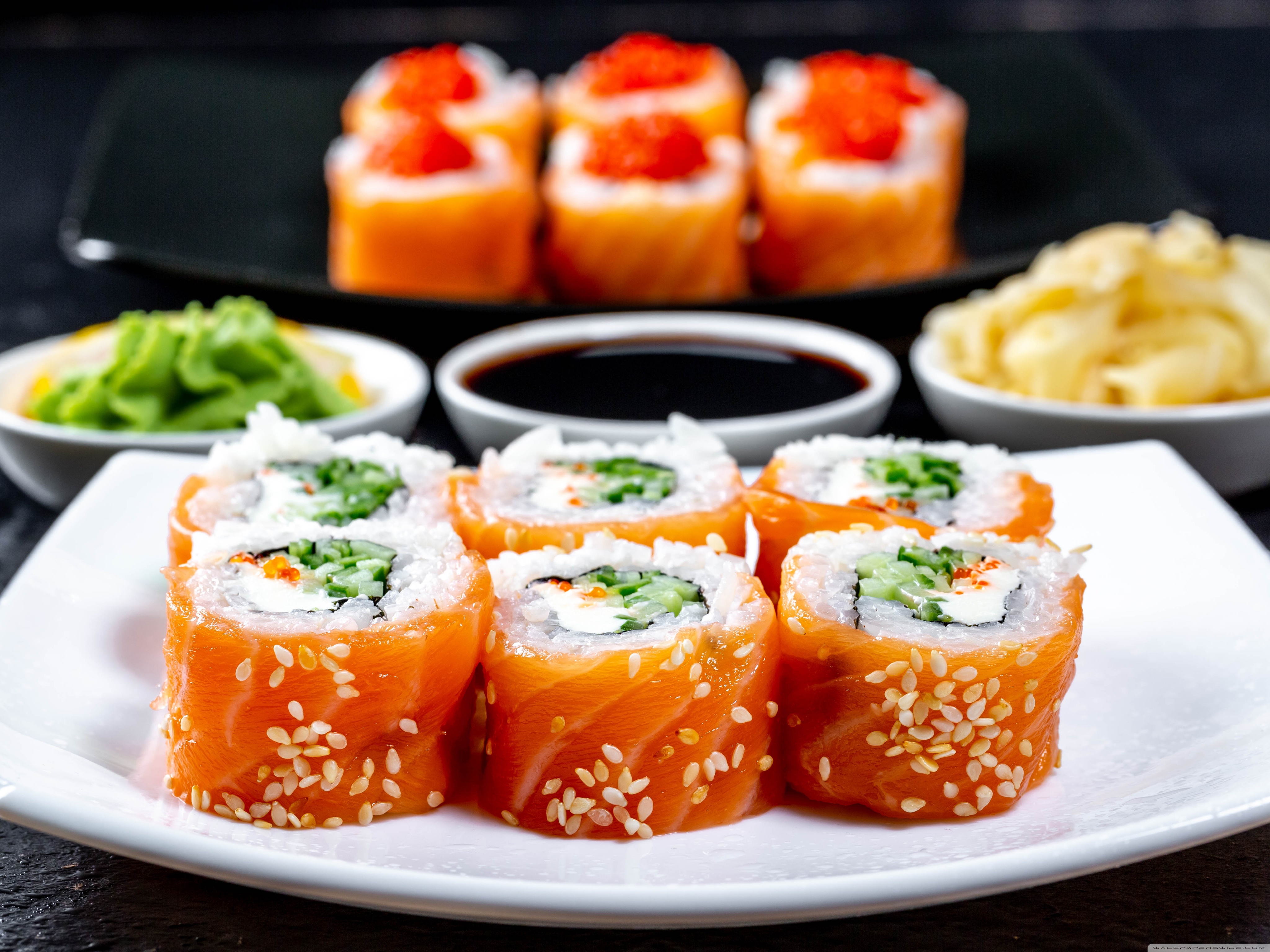 Download Japanese Sushi with Wasabi, Ginger and Soy Sauce 4K UHD Wallpaper