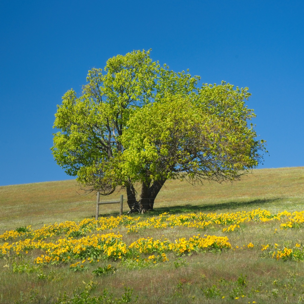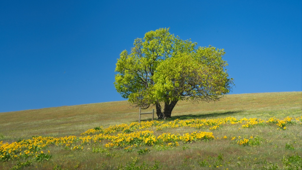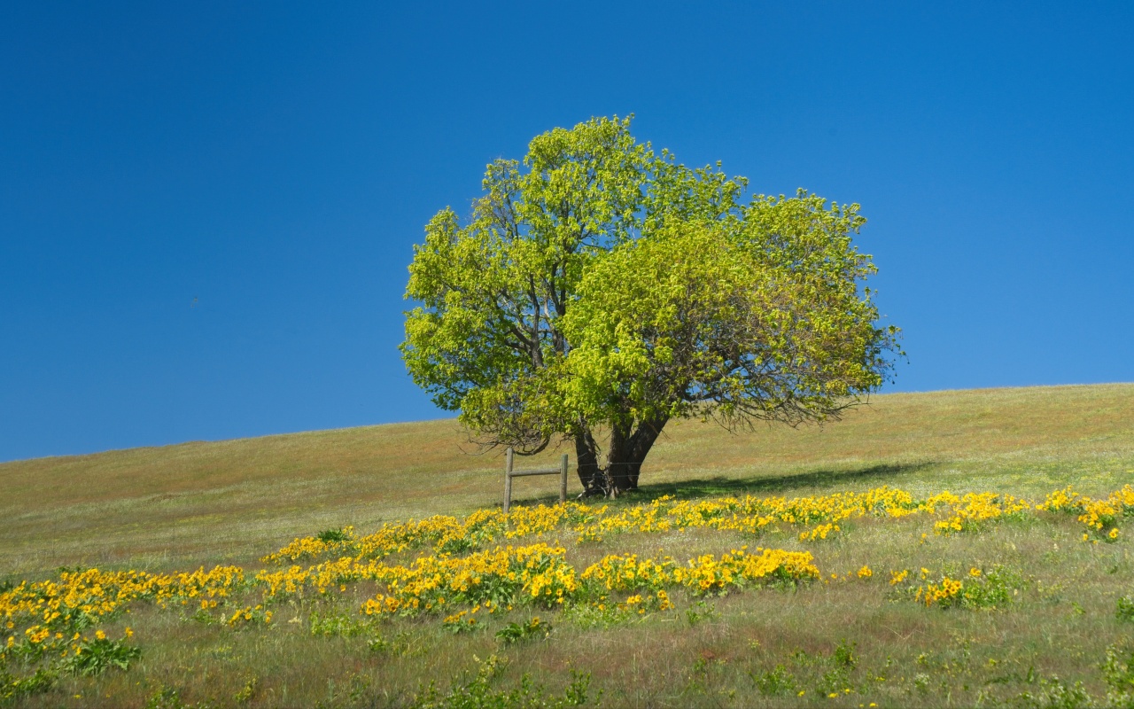 Download Lone Tree on Hill with Balsamroot Flowers 4K UHD Wallpaper