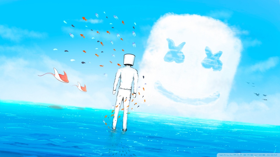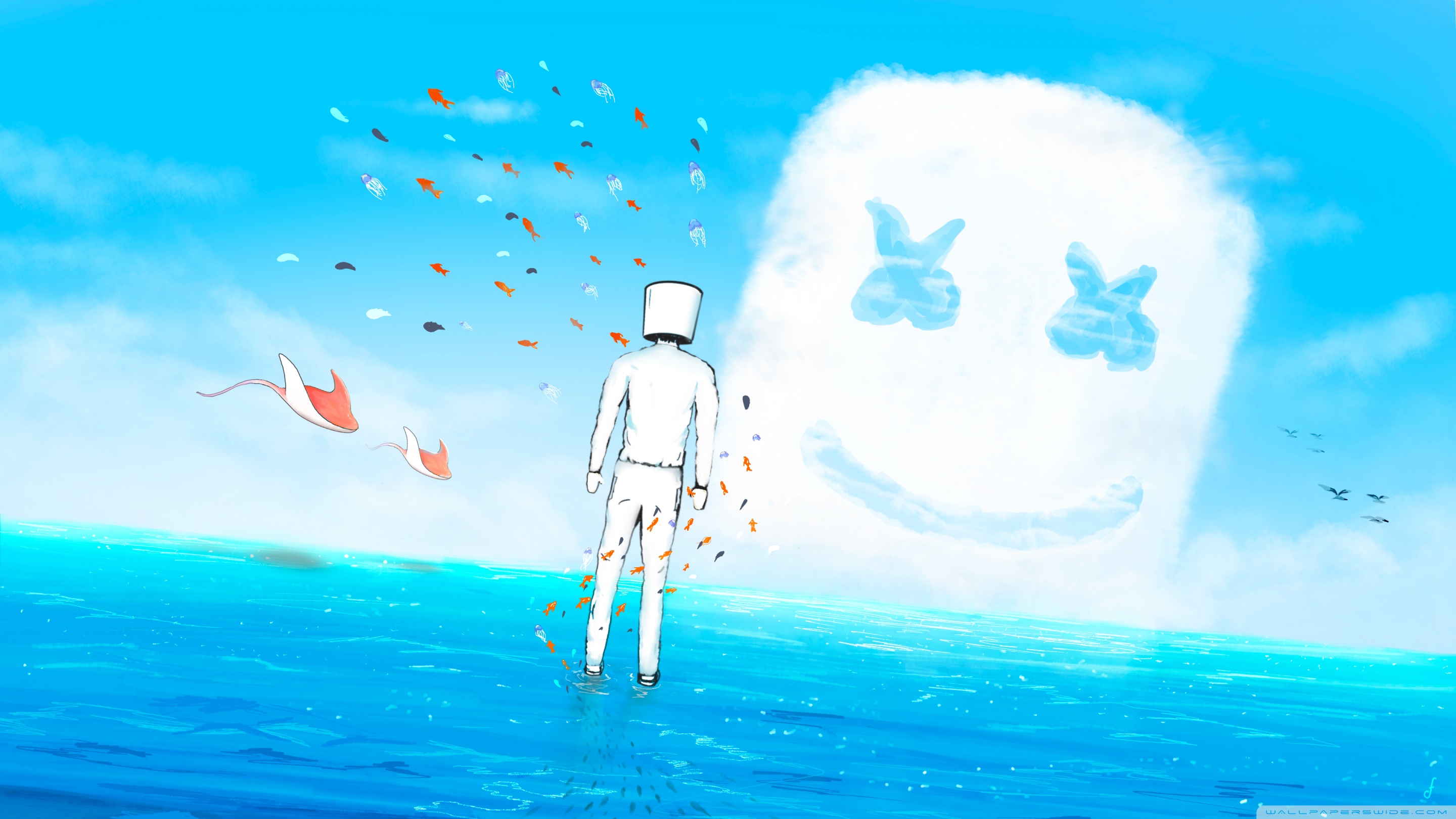 Download Marshmello Standing In Ocean With Fish Flying 4K UHD Wallpaper
