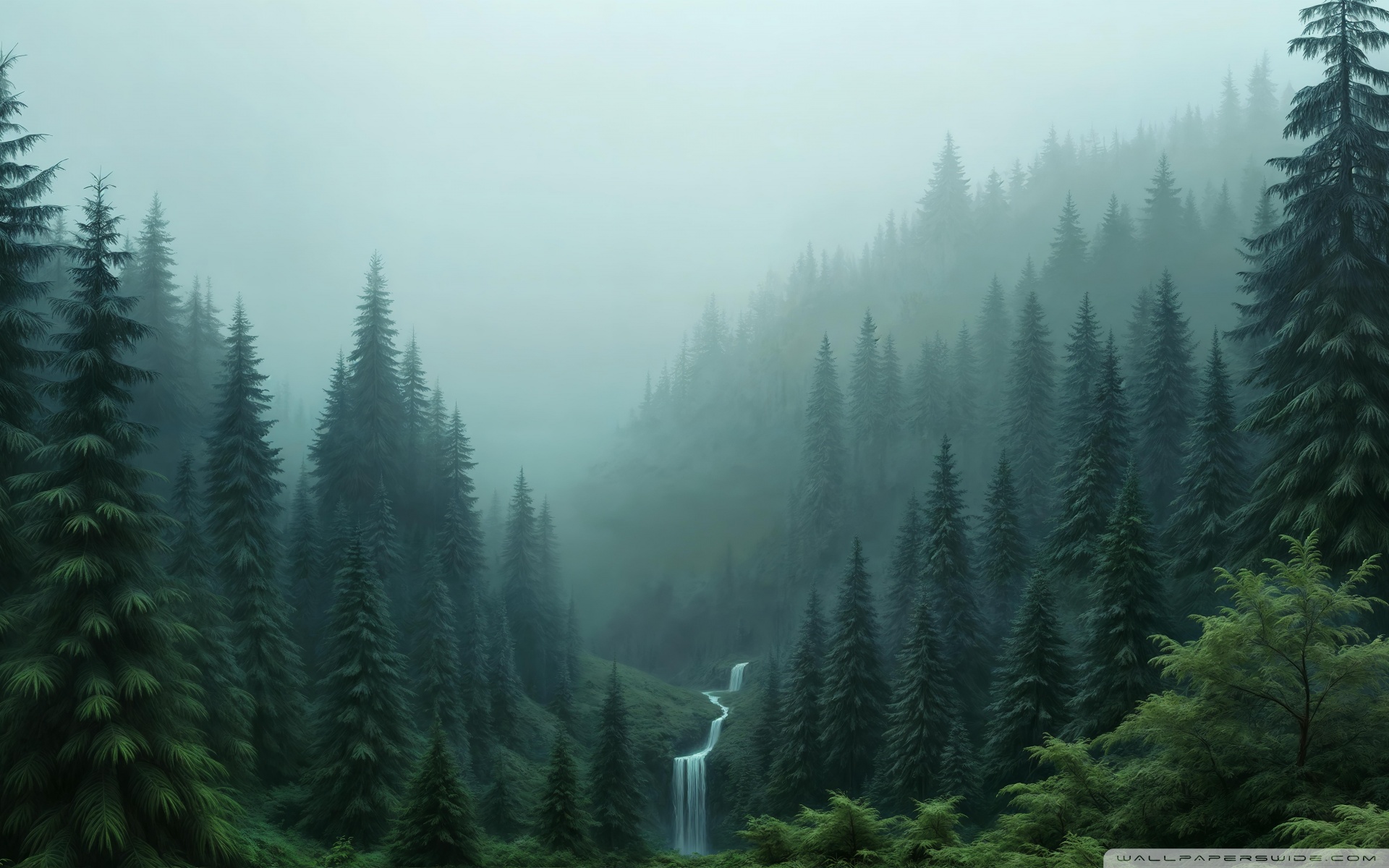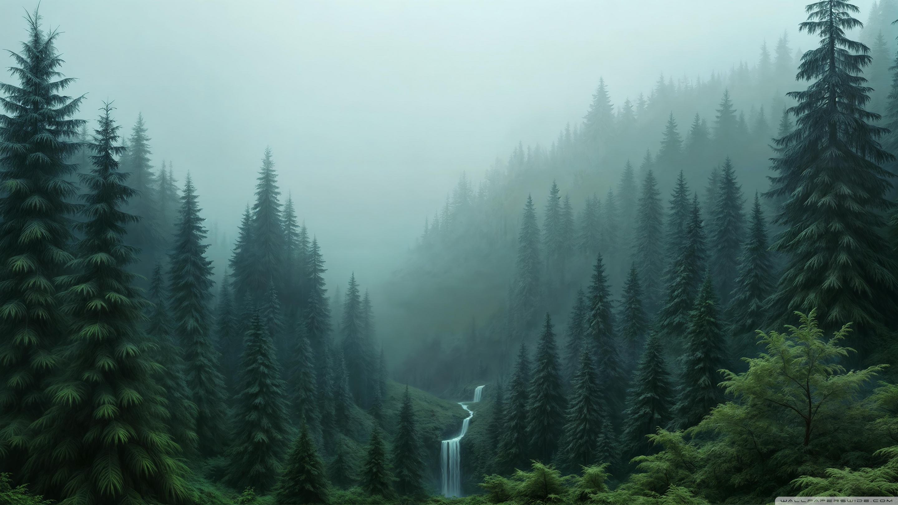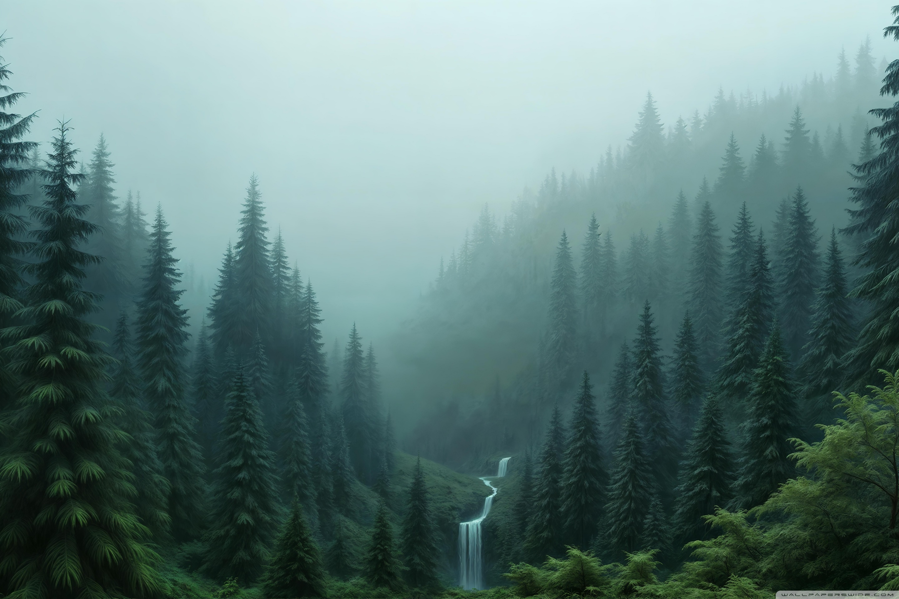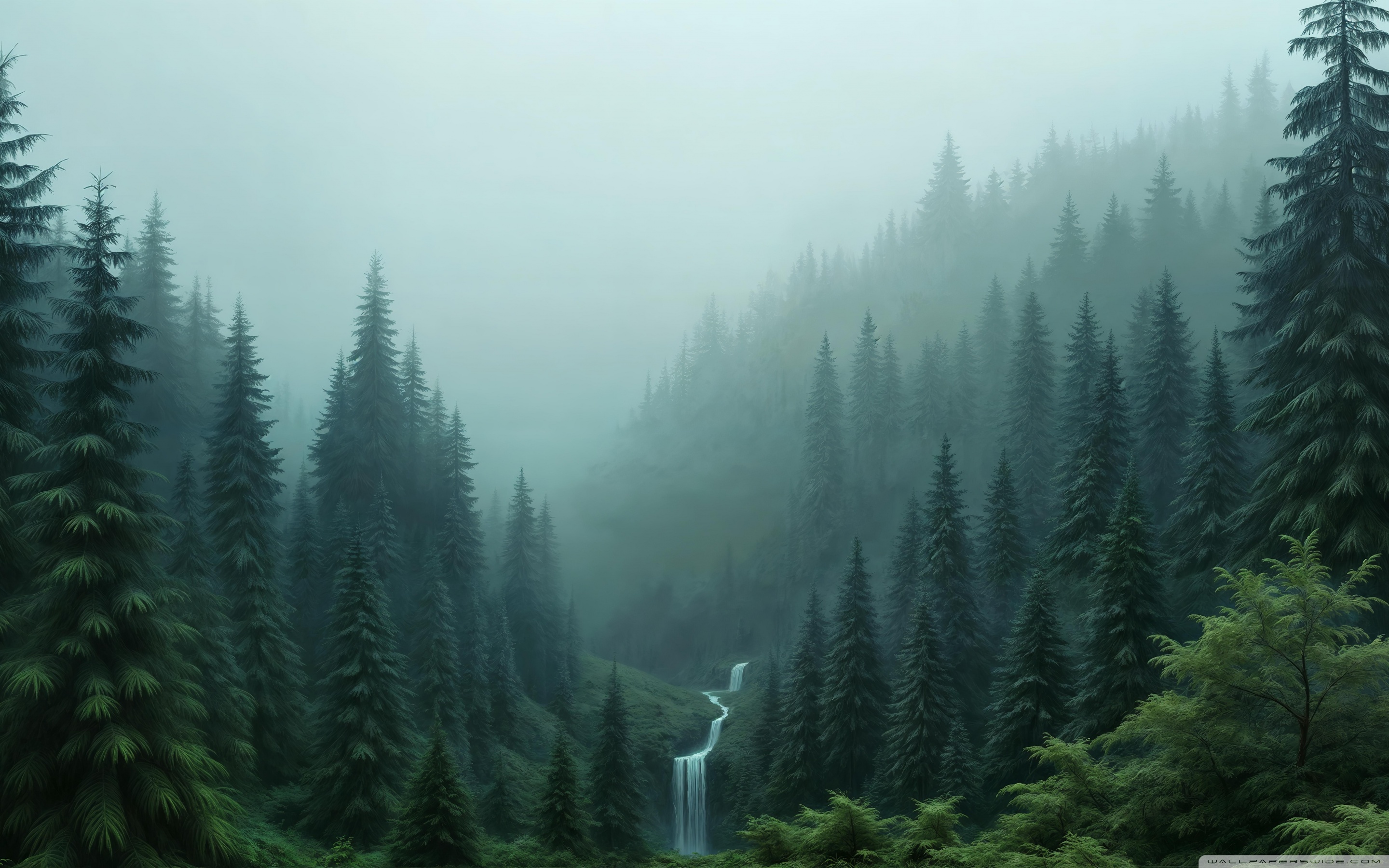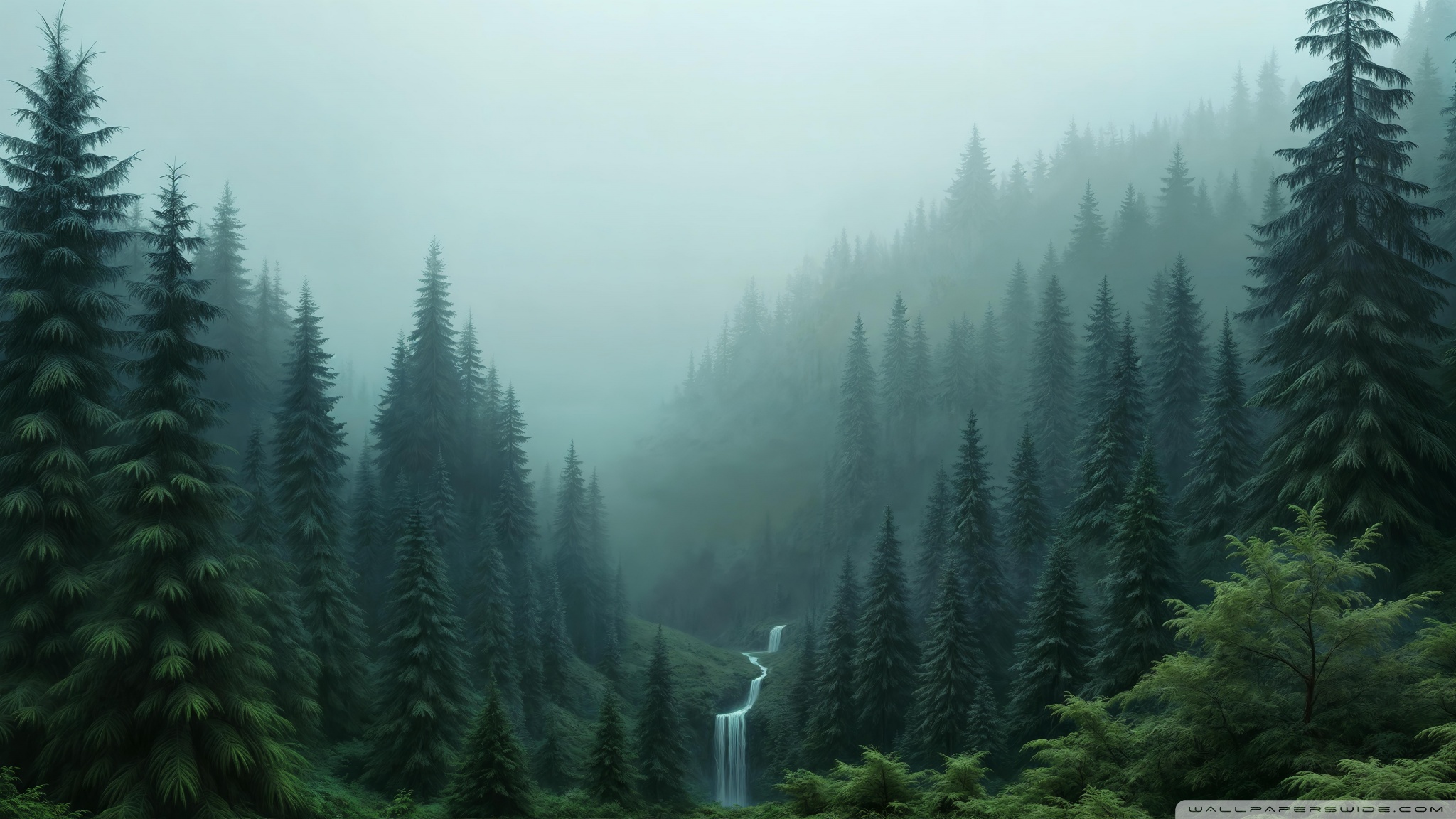 Download Montane Evergreen Forest, Fog, Waterfall 4K UHD Wallpaper