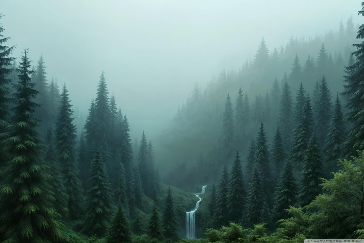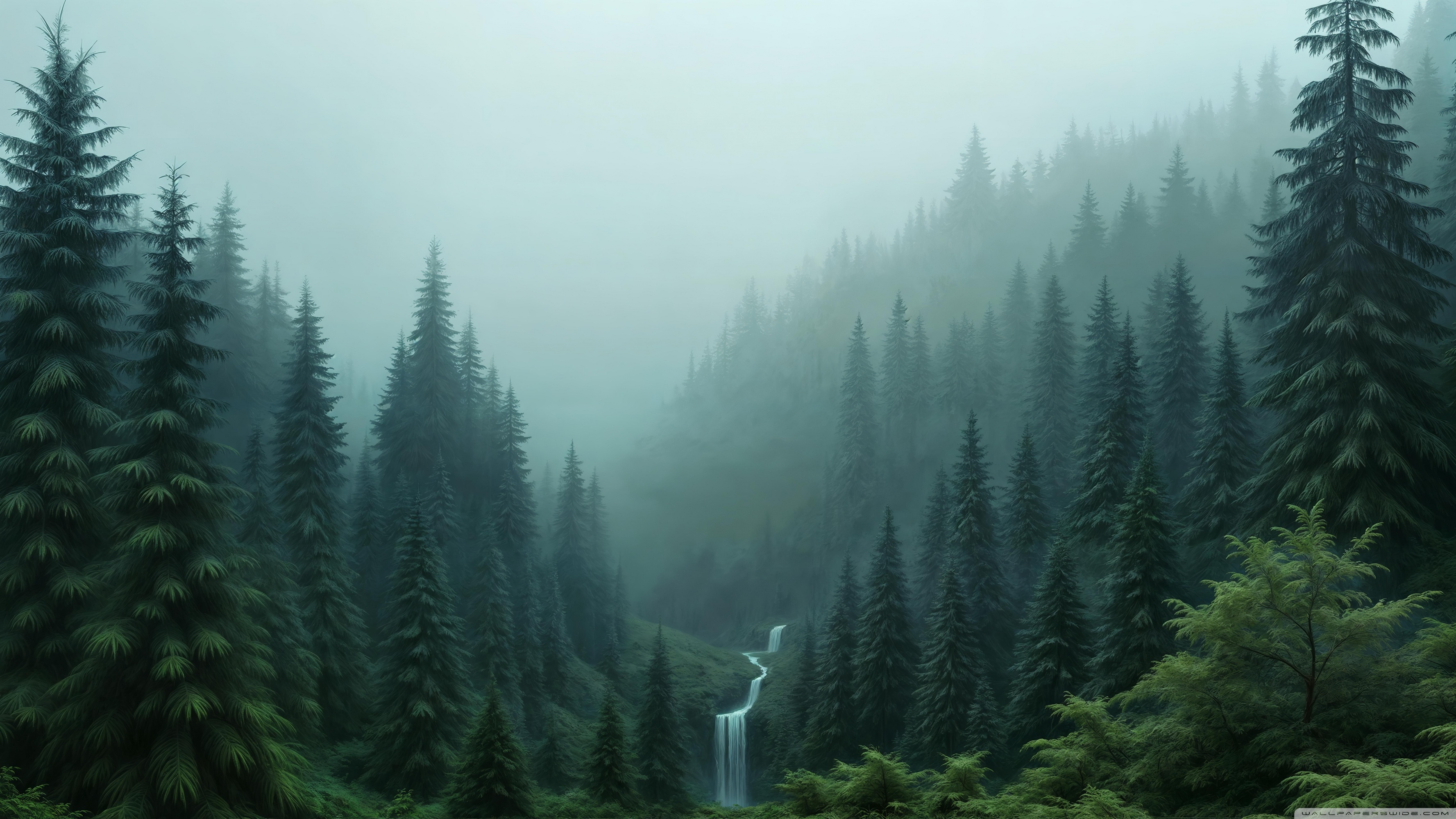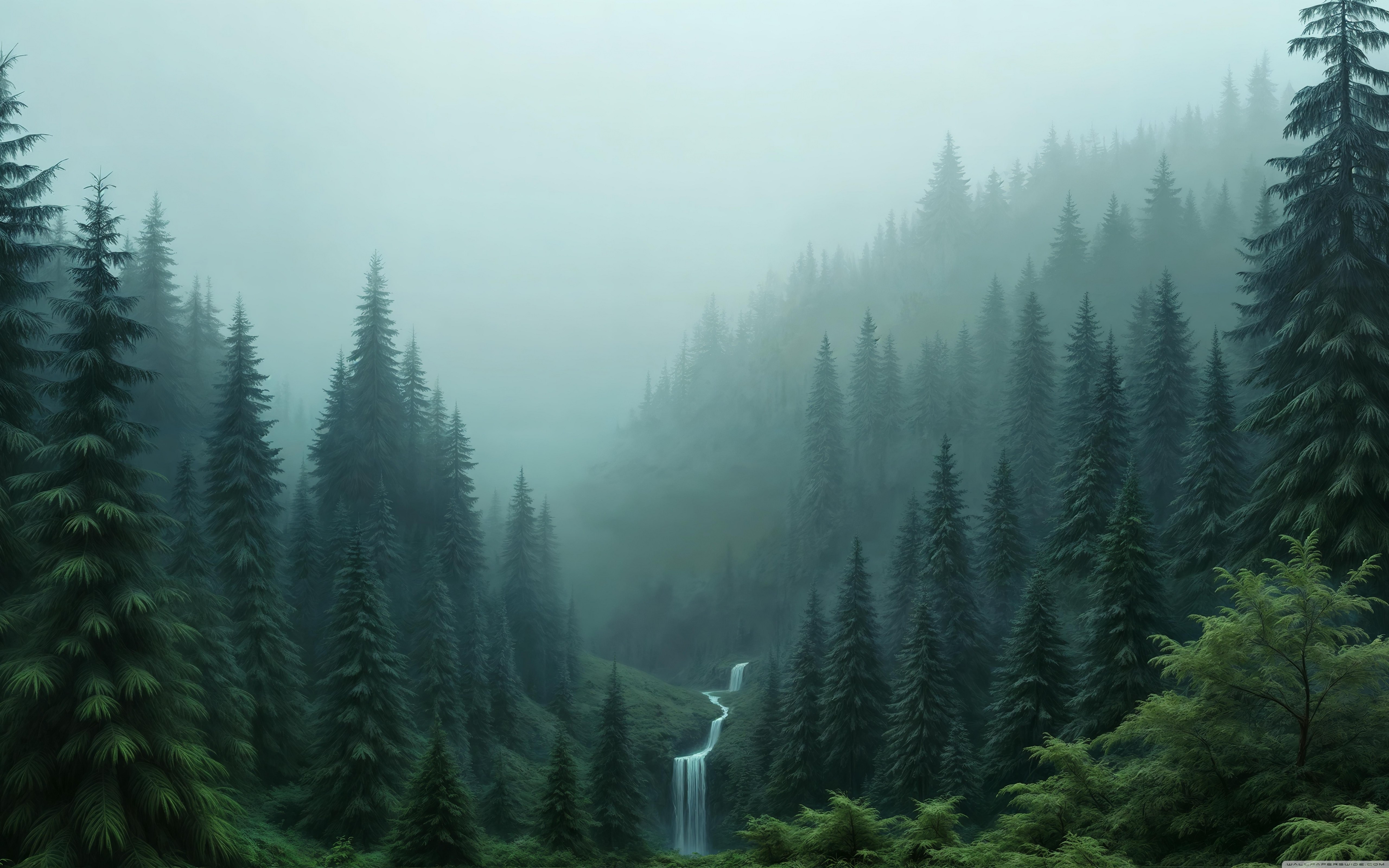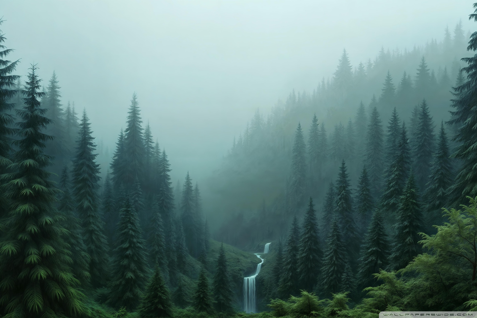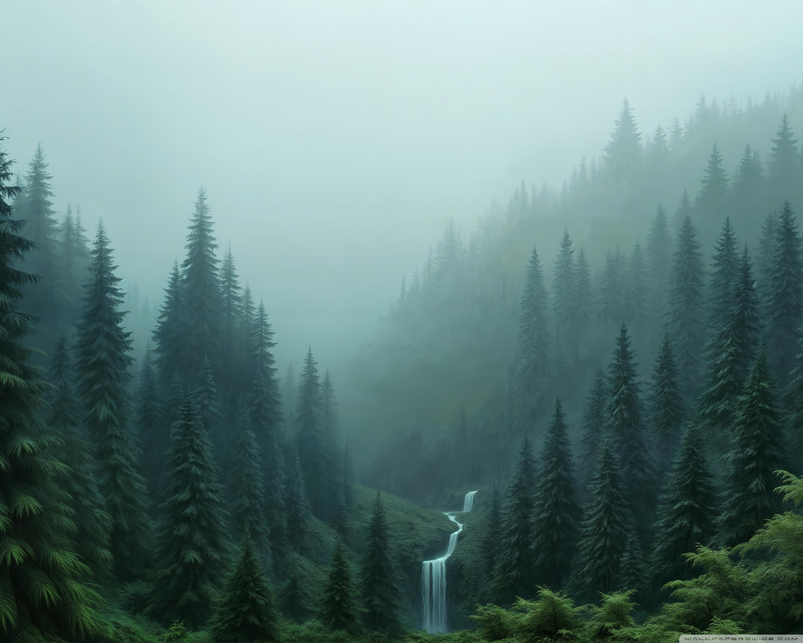 Download Montane Evergreen Forest, Fog, Waterfall 4K UHD Wallpaper