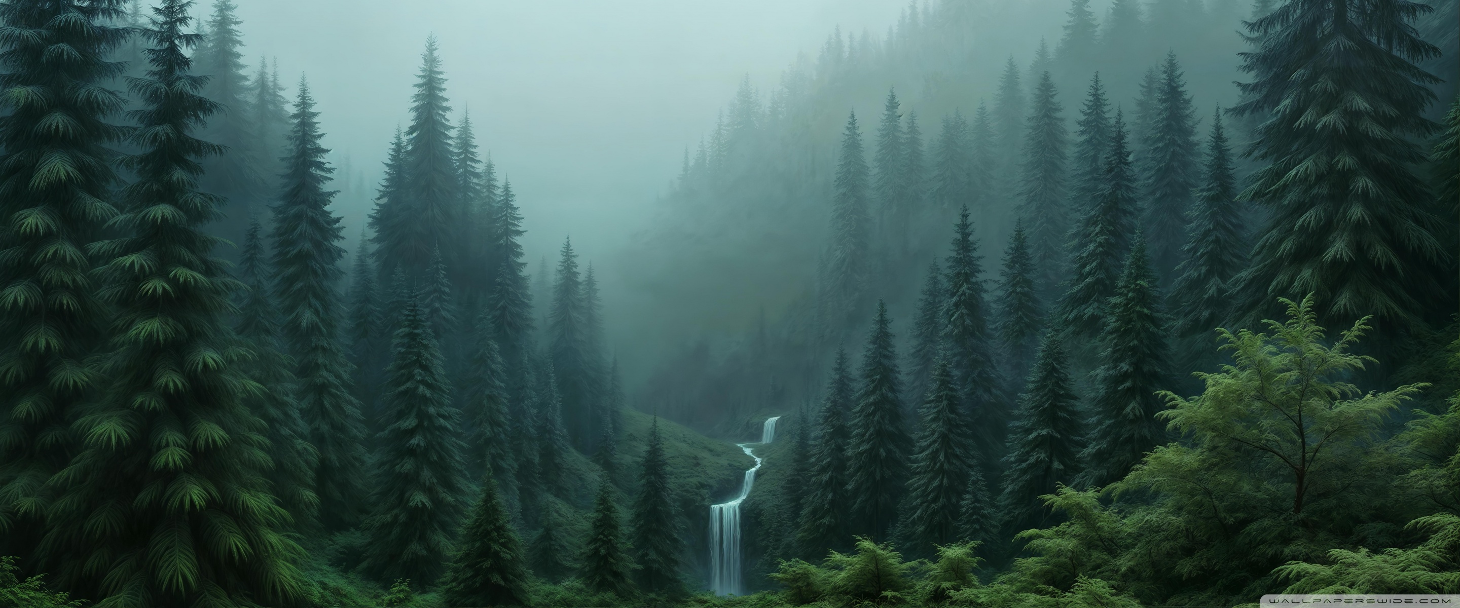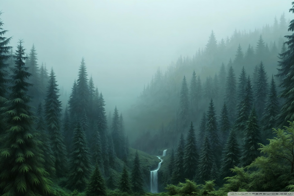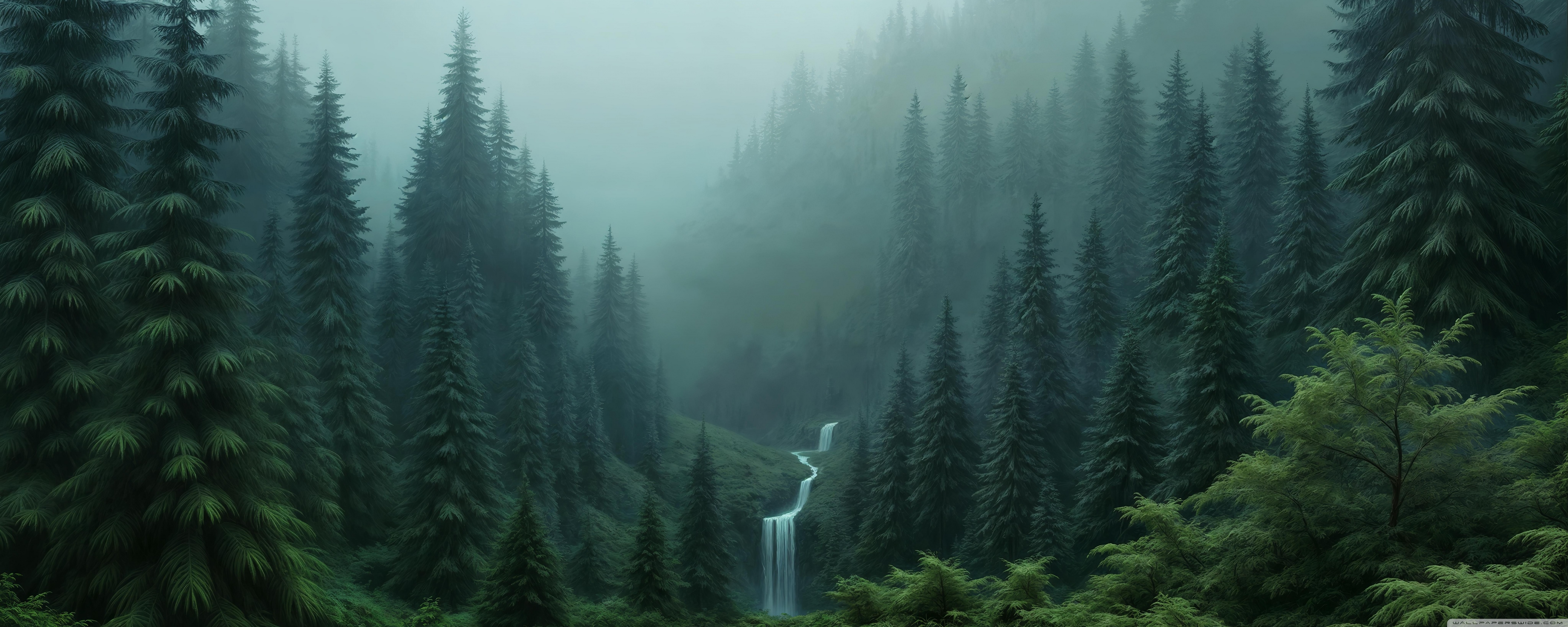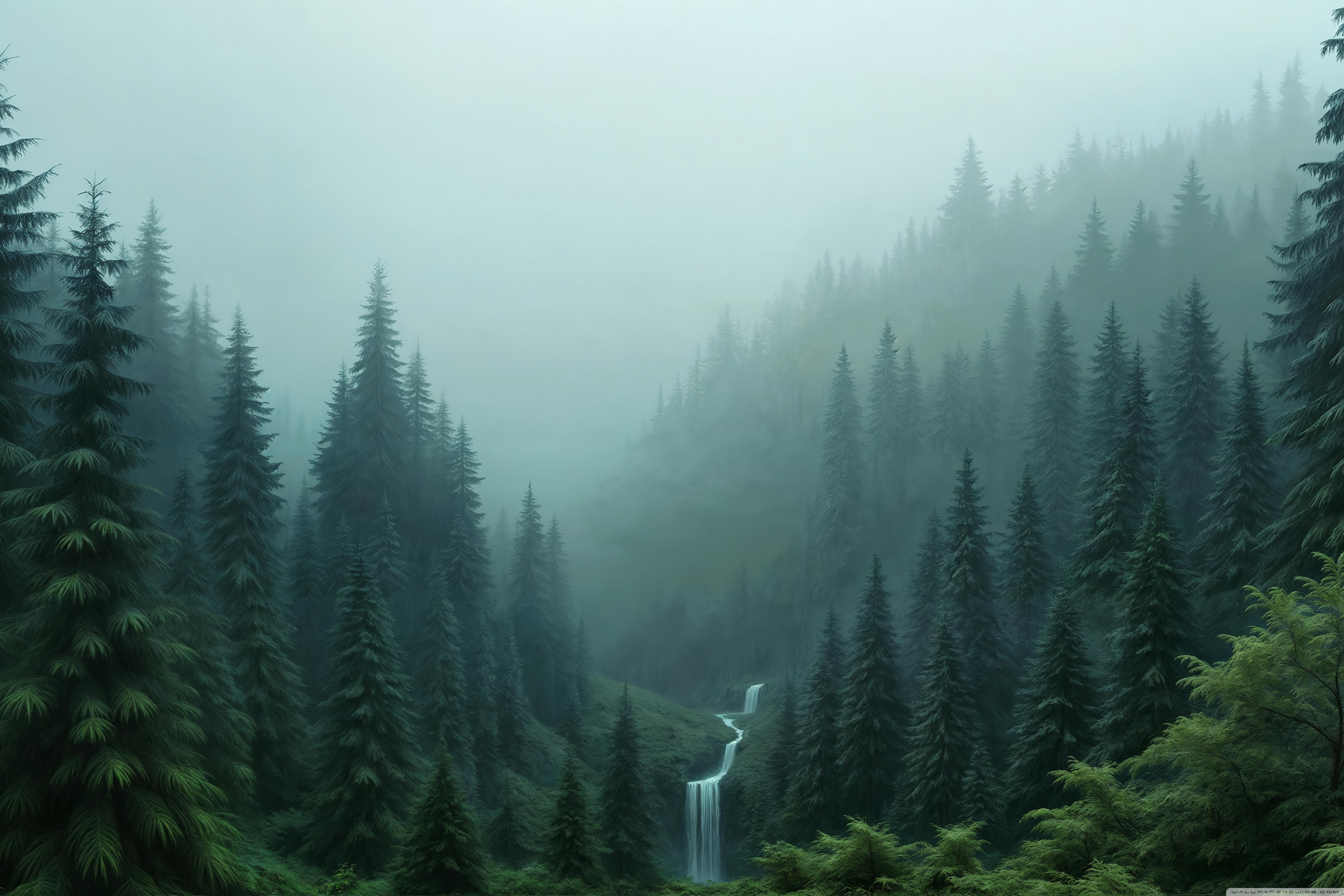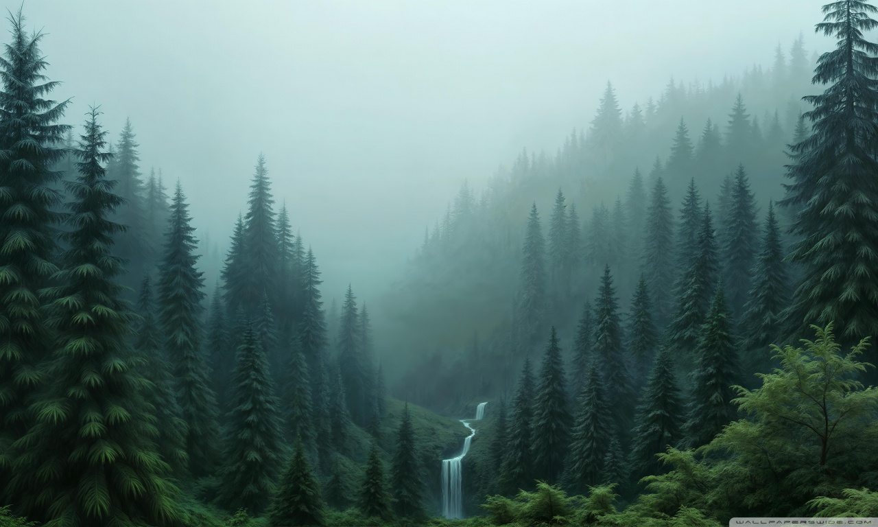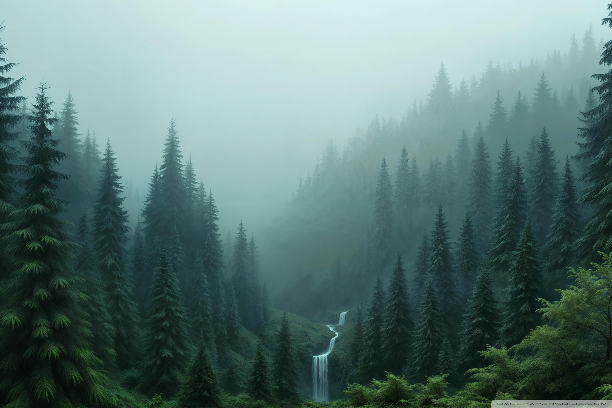 Download Montane Evergreen Forest, Fog, Waterfall 4K UHD Wallpaper