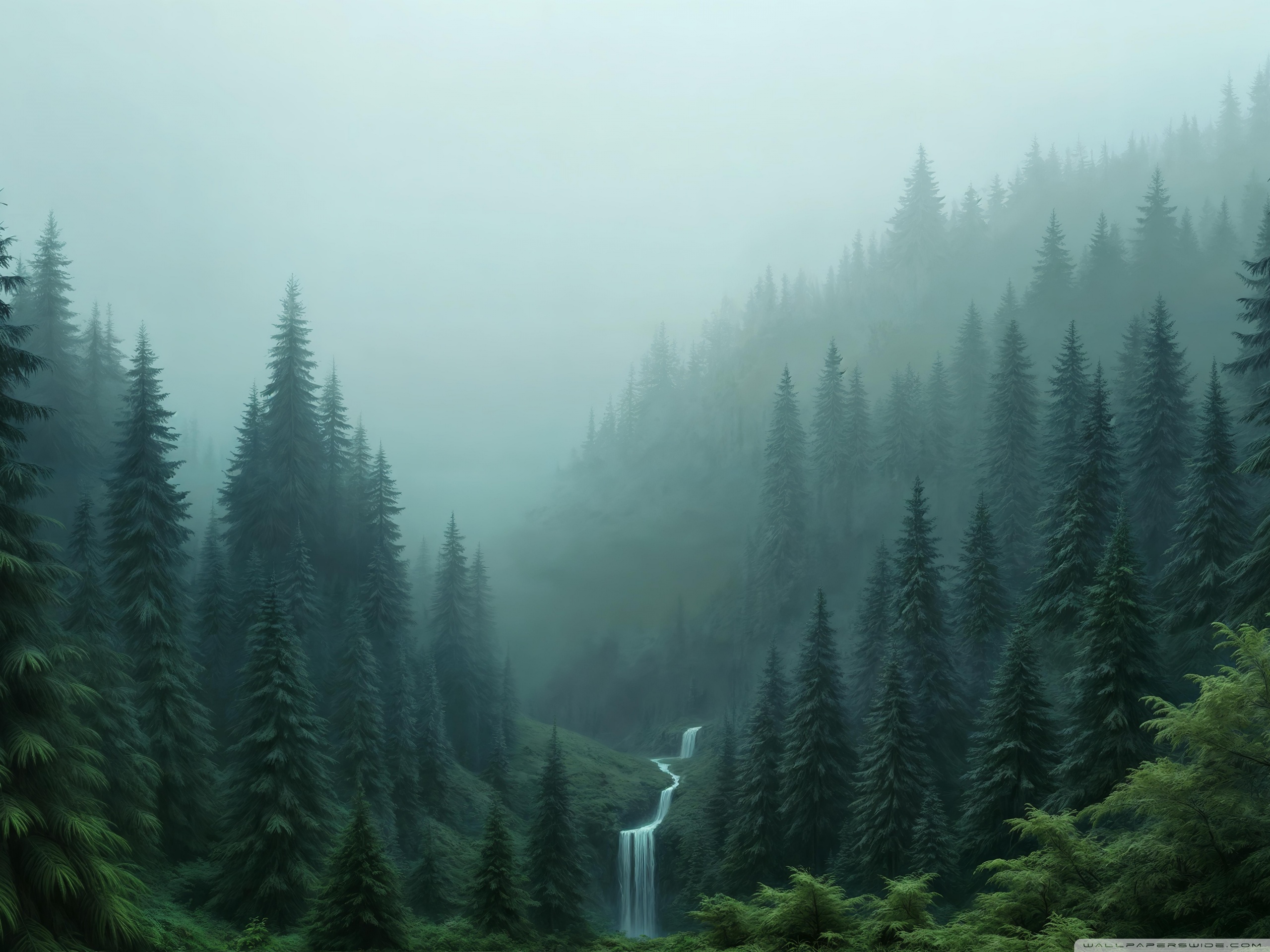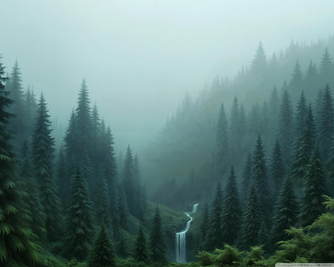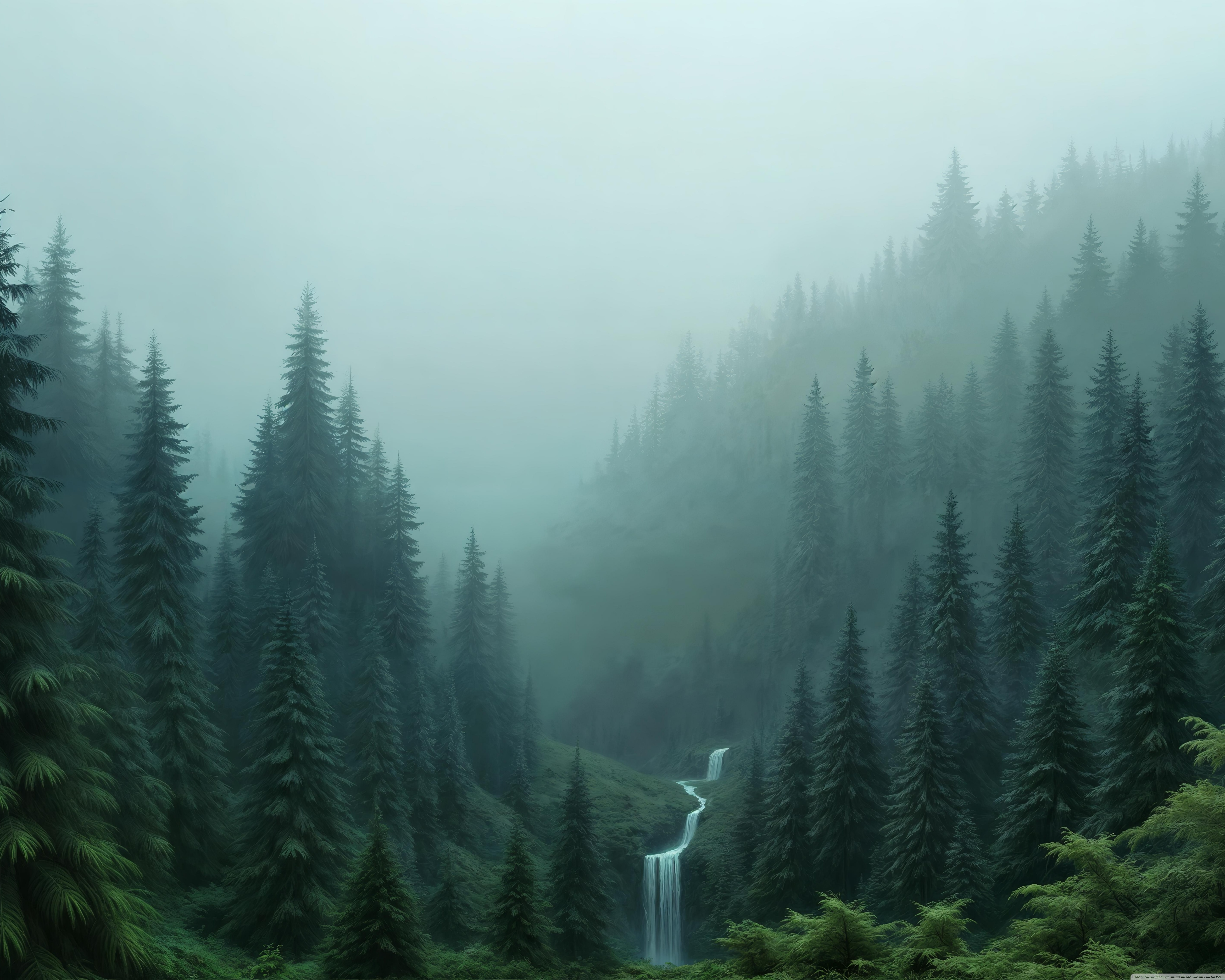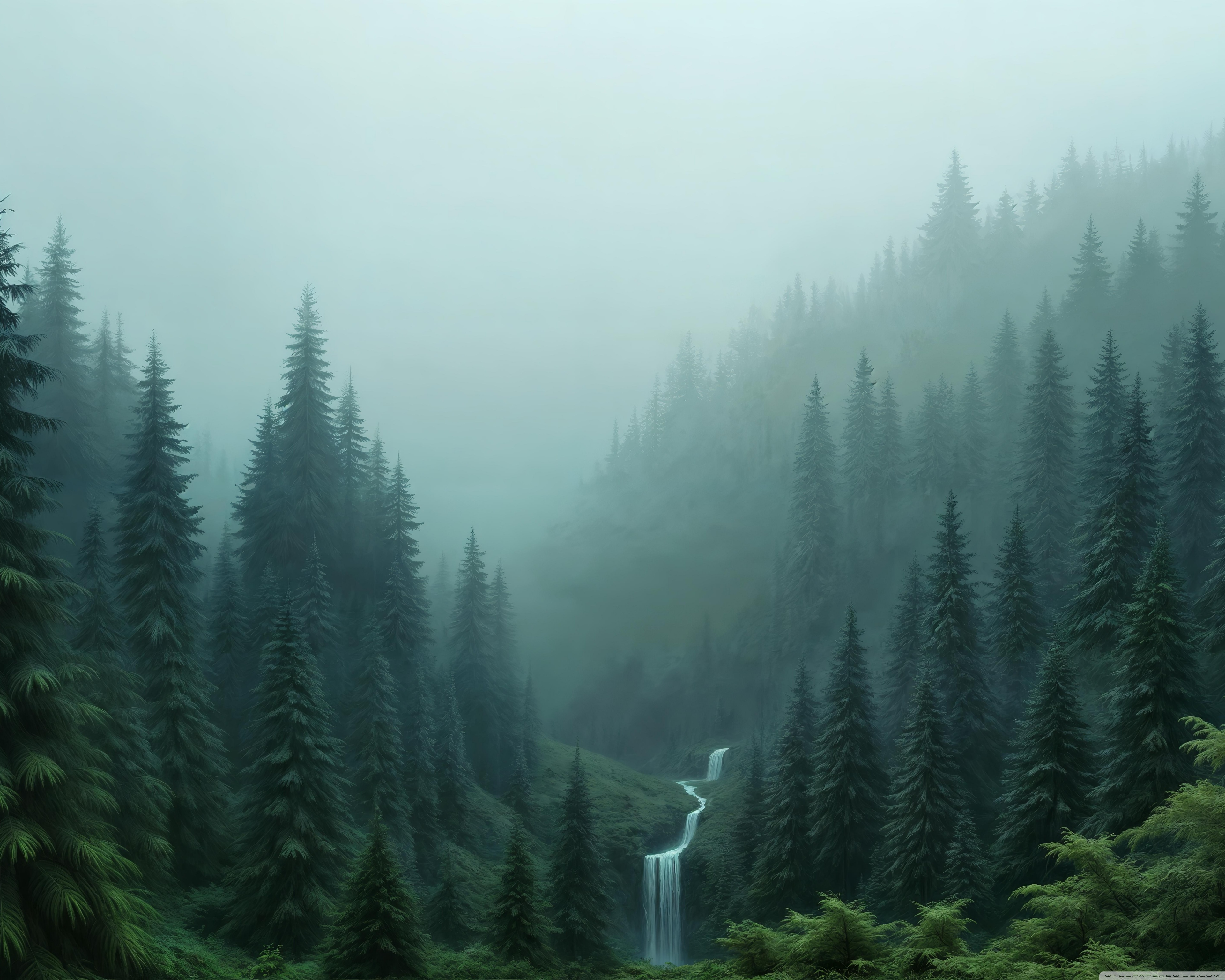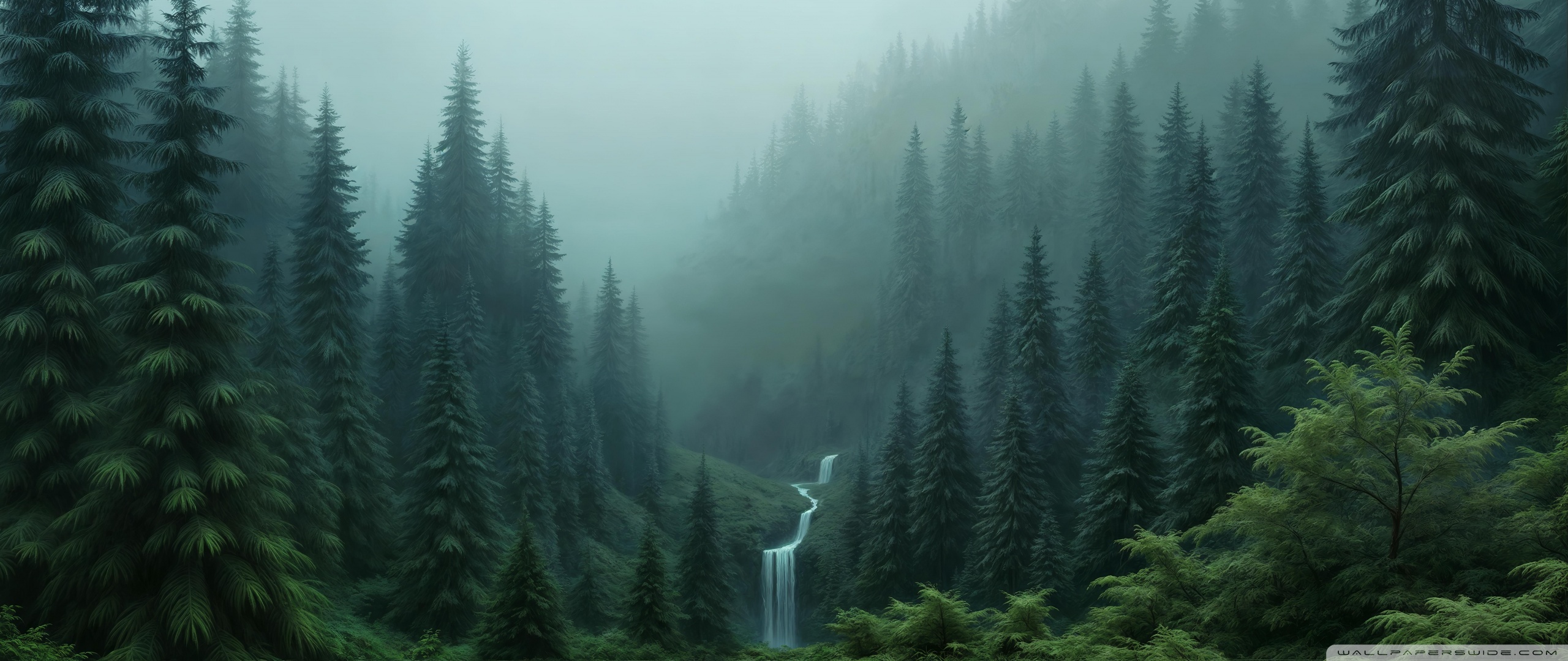 Download Montane Evergreen Forest, Fog, Waterfall 4K UHD Wallpaper