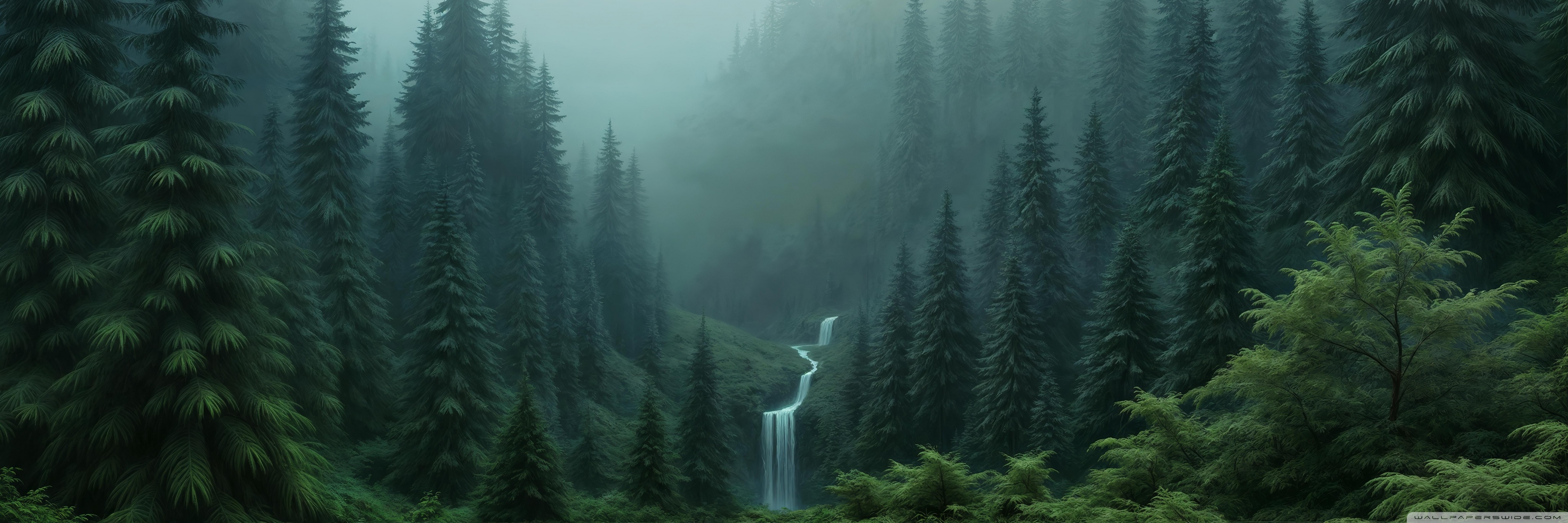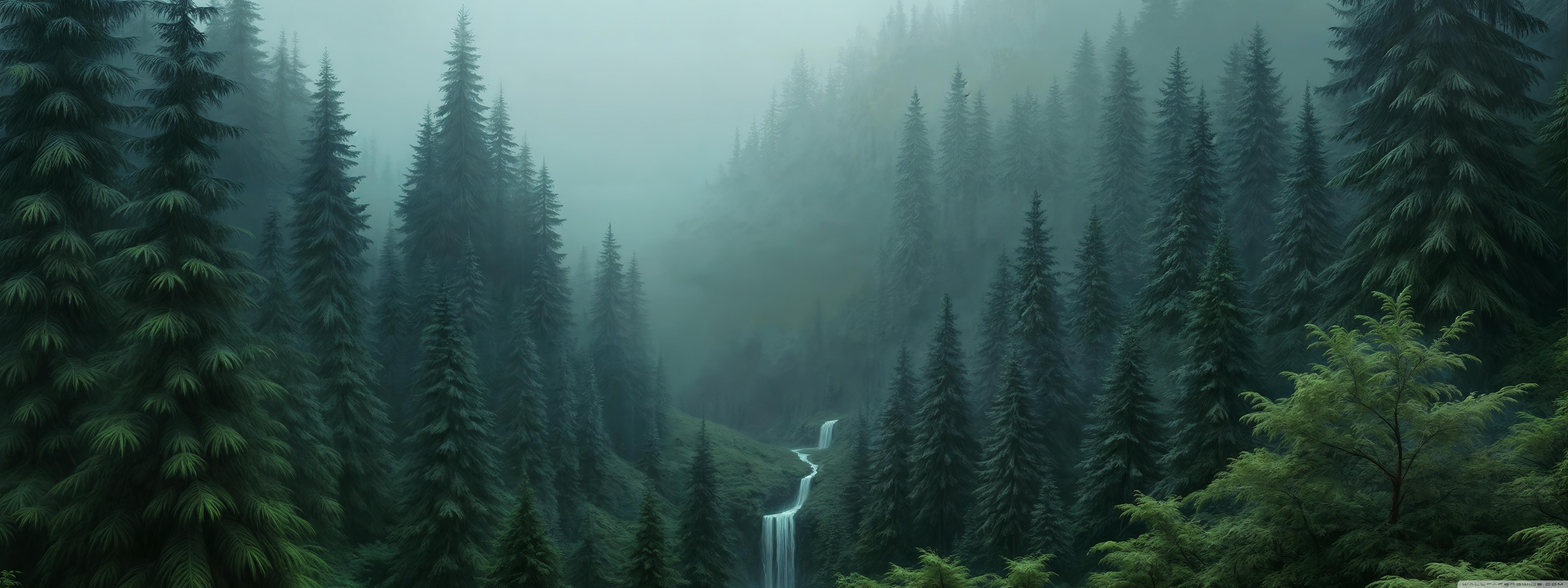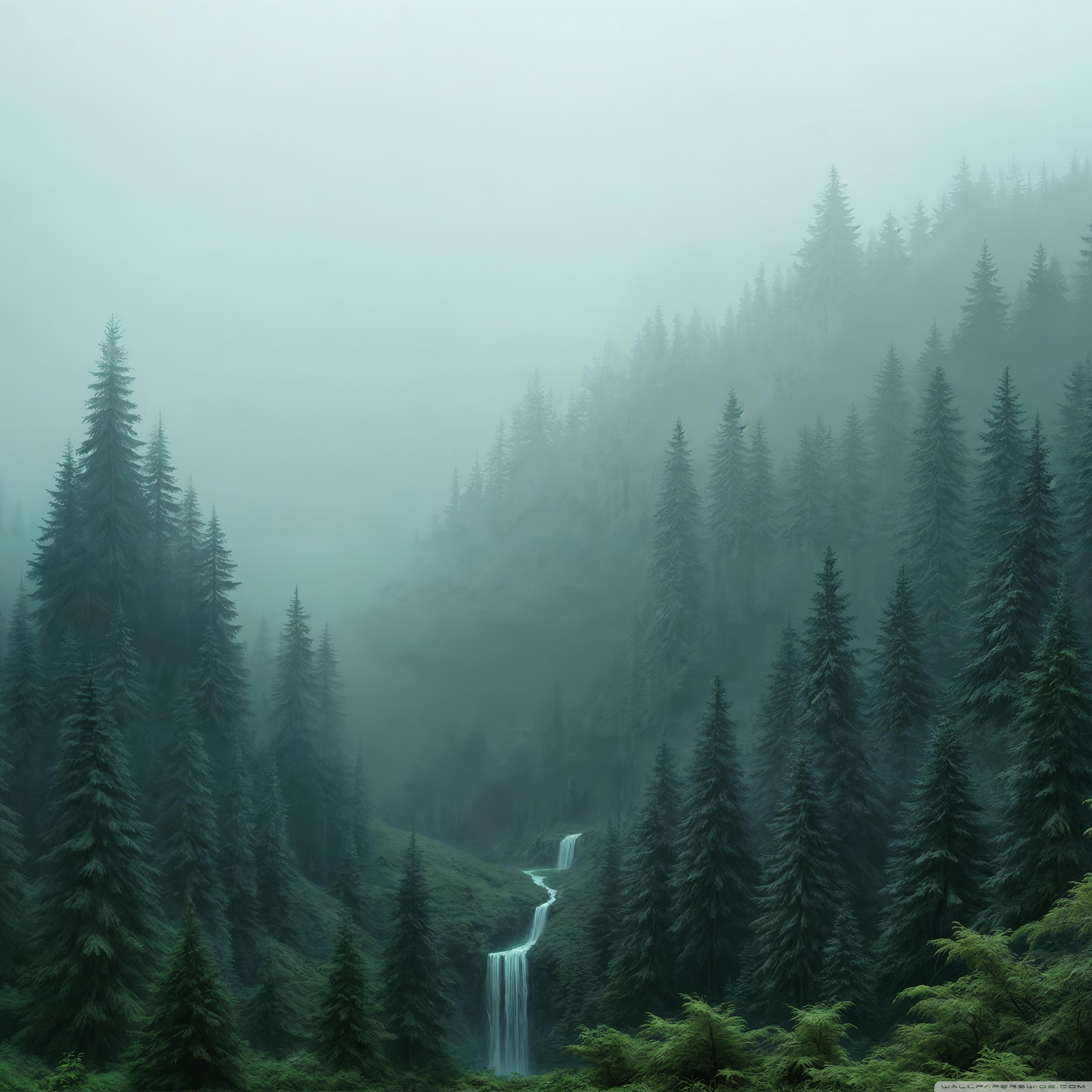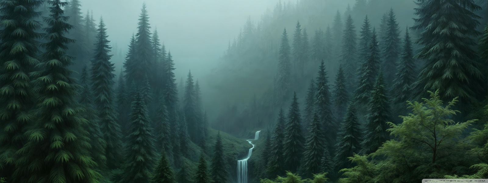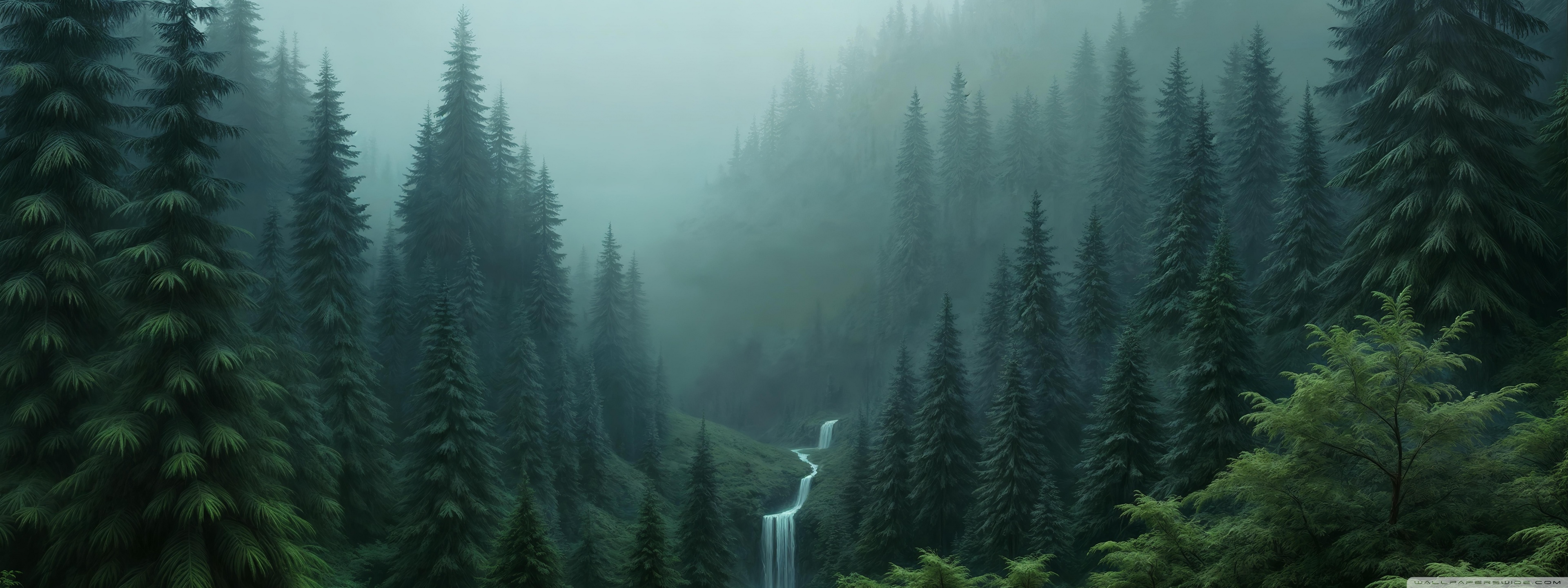 Download Montane Evergreen Forest, Fog, Waterfall 4K UHD Wallpaper