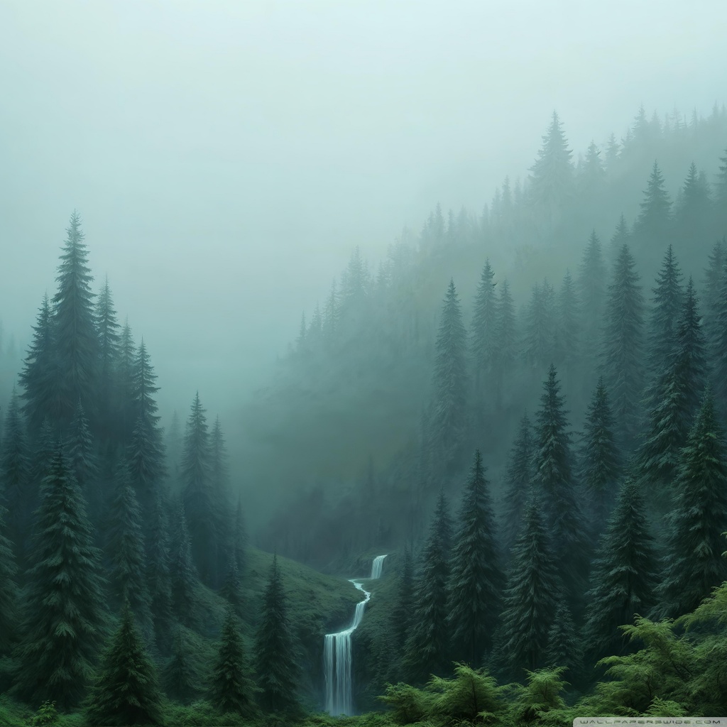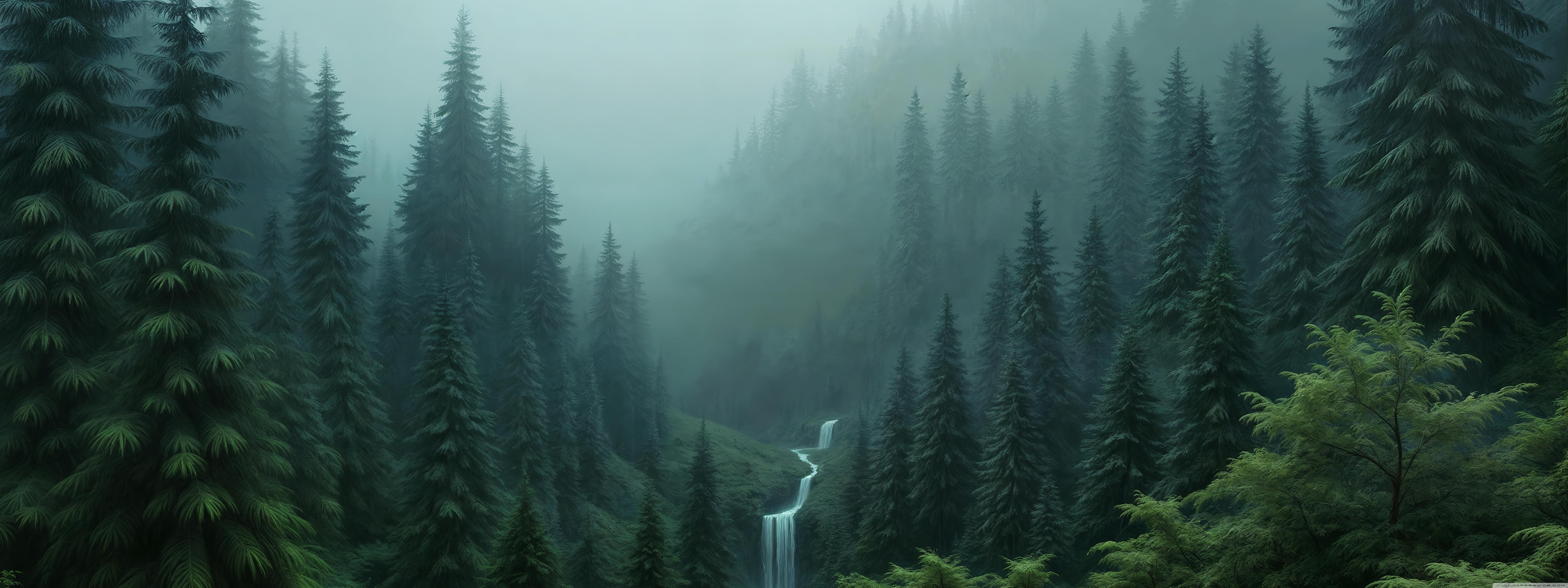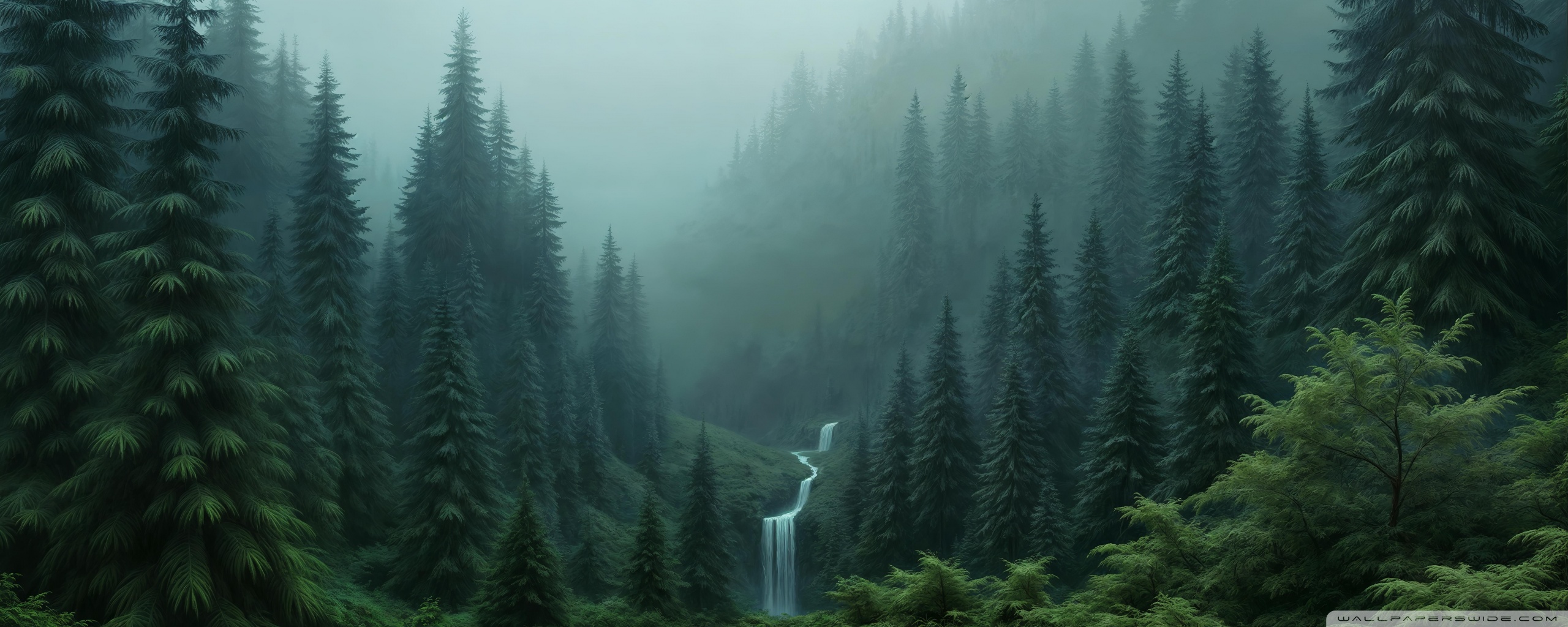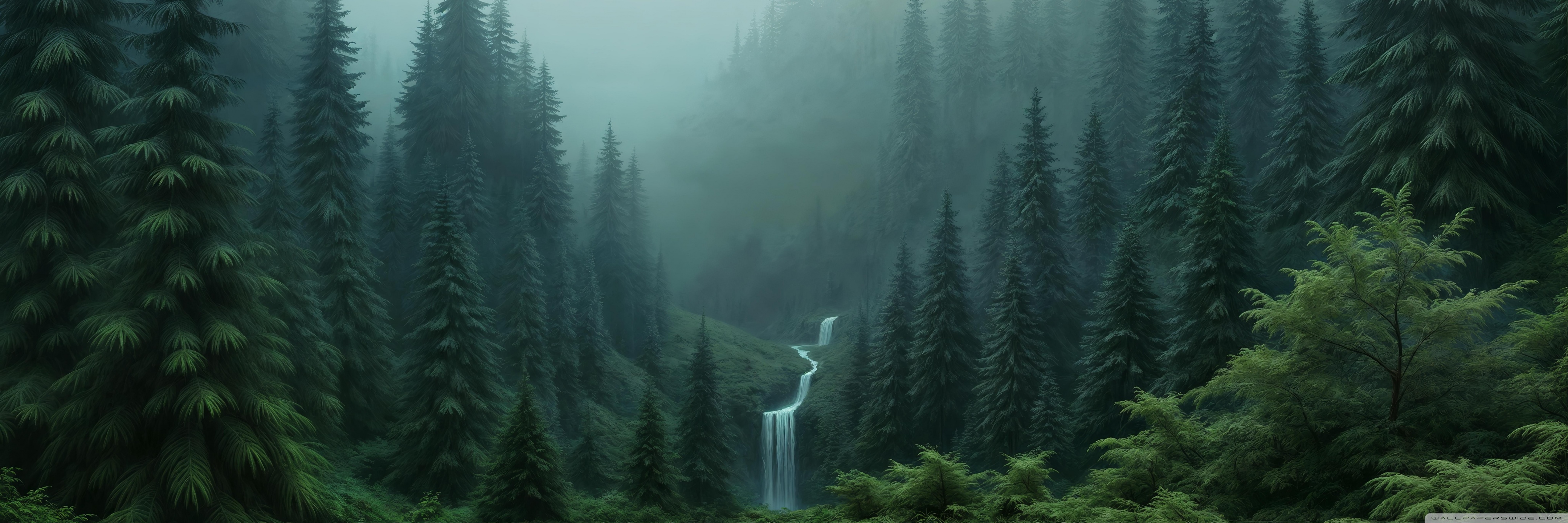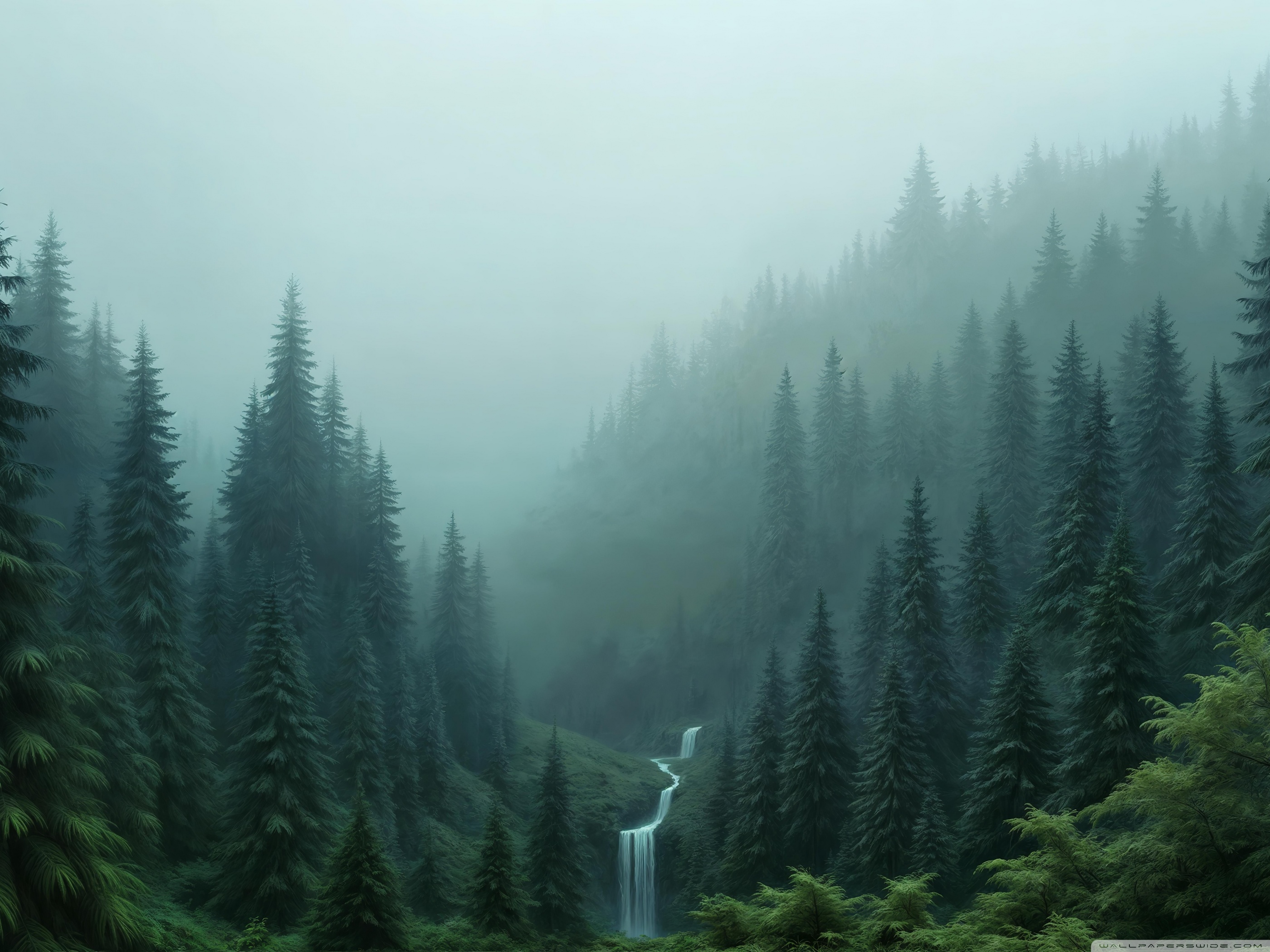 Download Montane Evergreen Forest, Fog, Waterfall 4K UHD Wallpaper