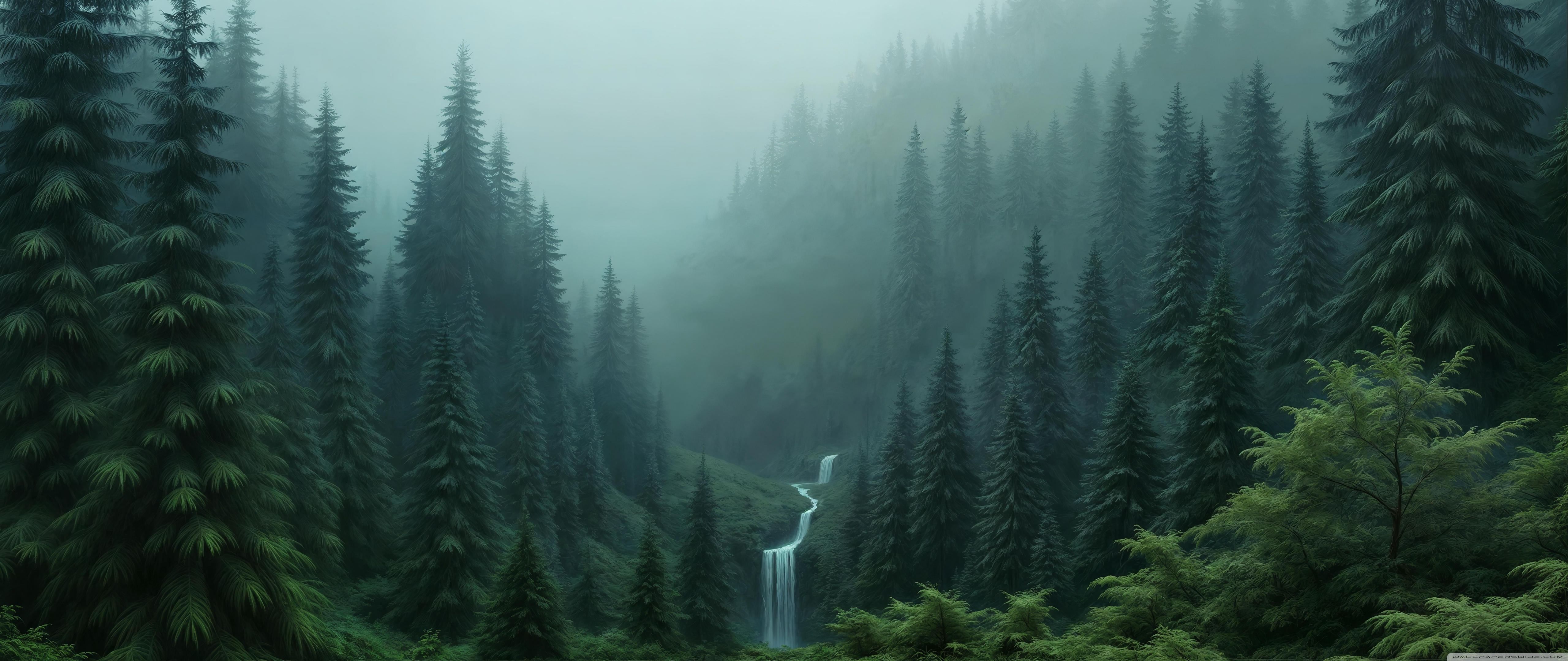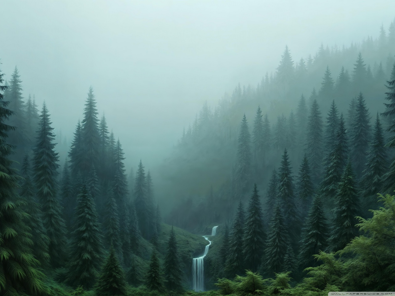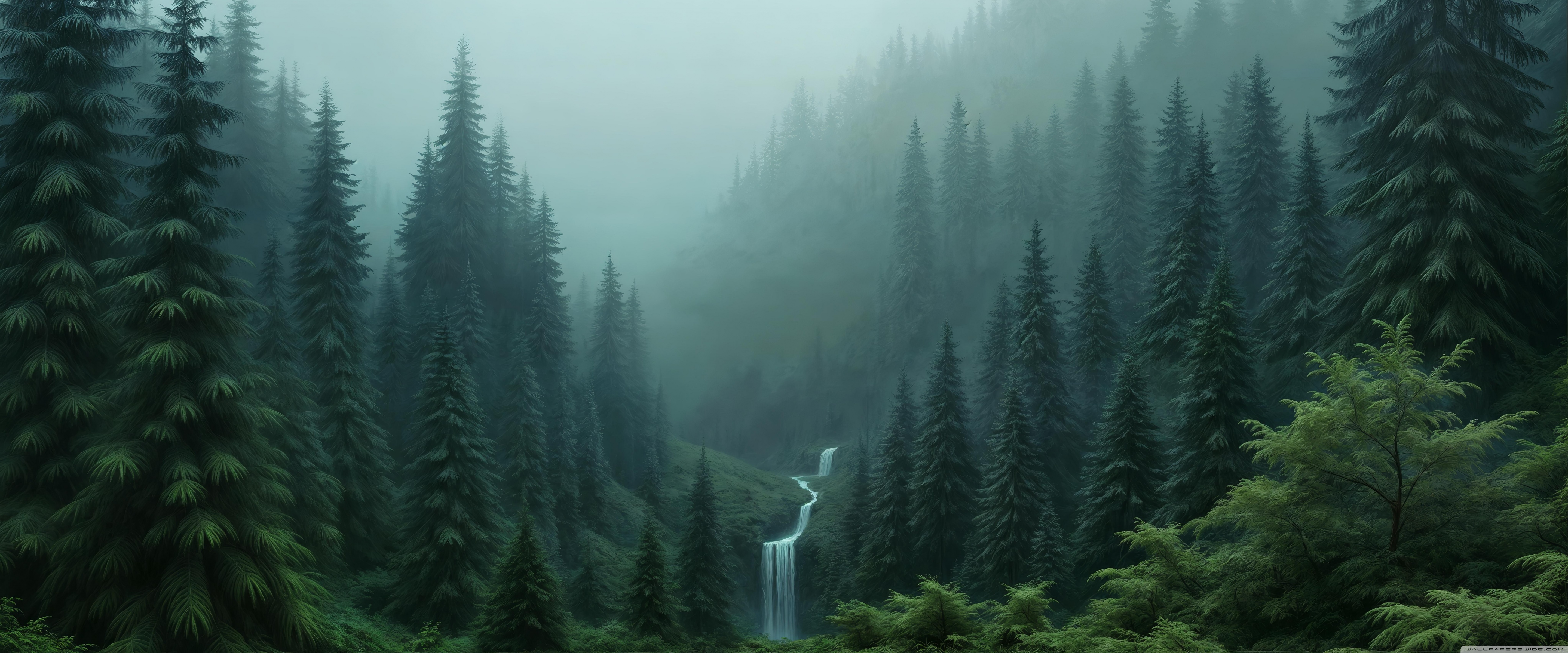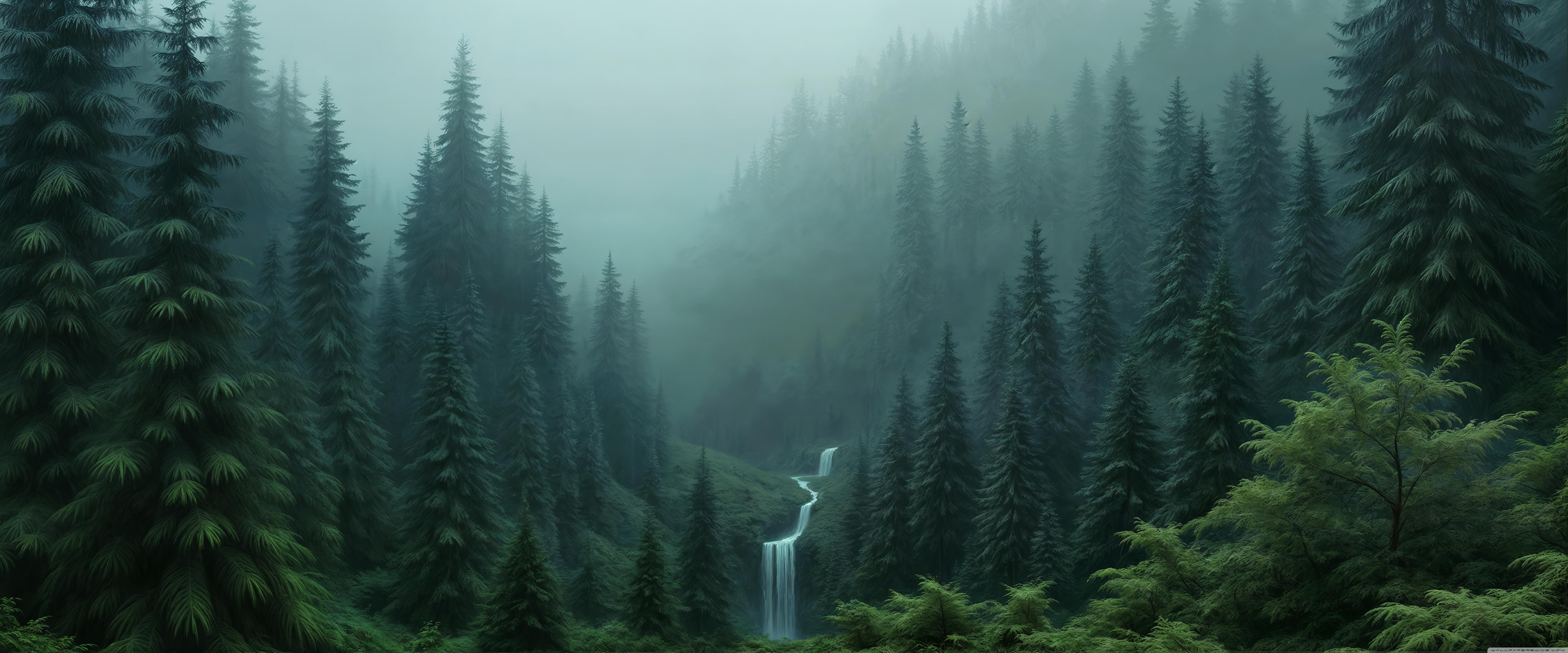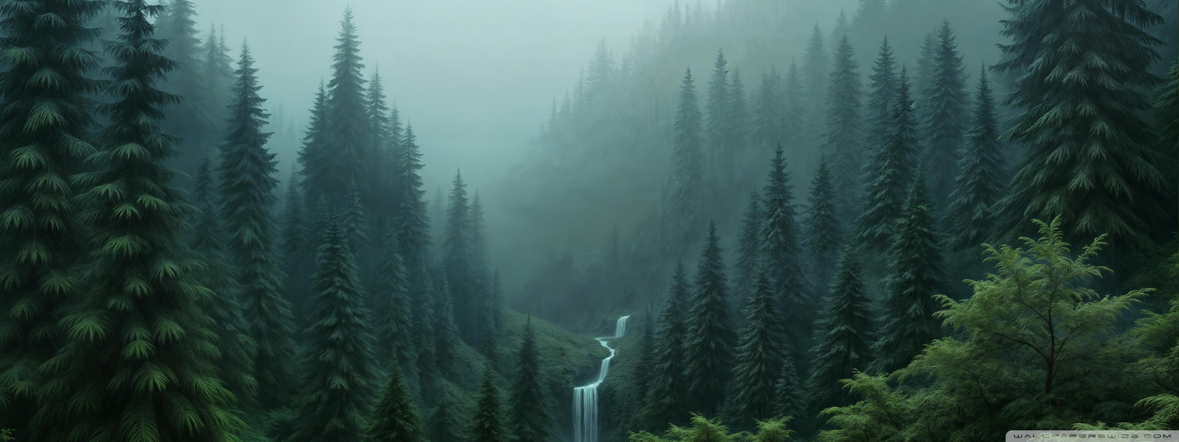 Download Montane Evergreen Forest, Fog, Waterfall 4K UHD Wallpaper