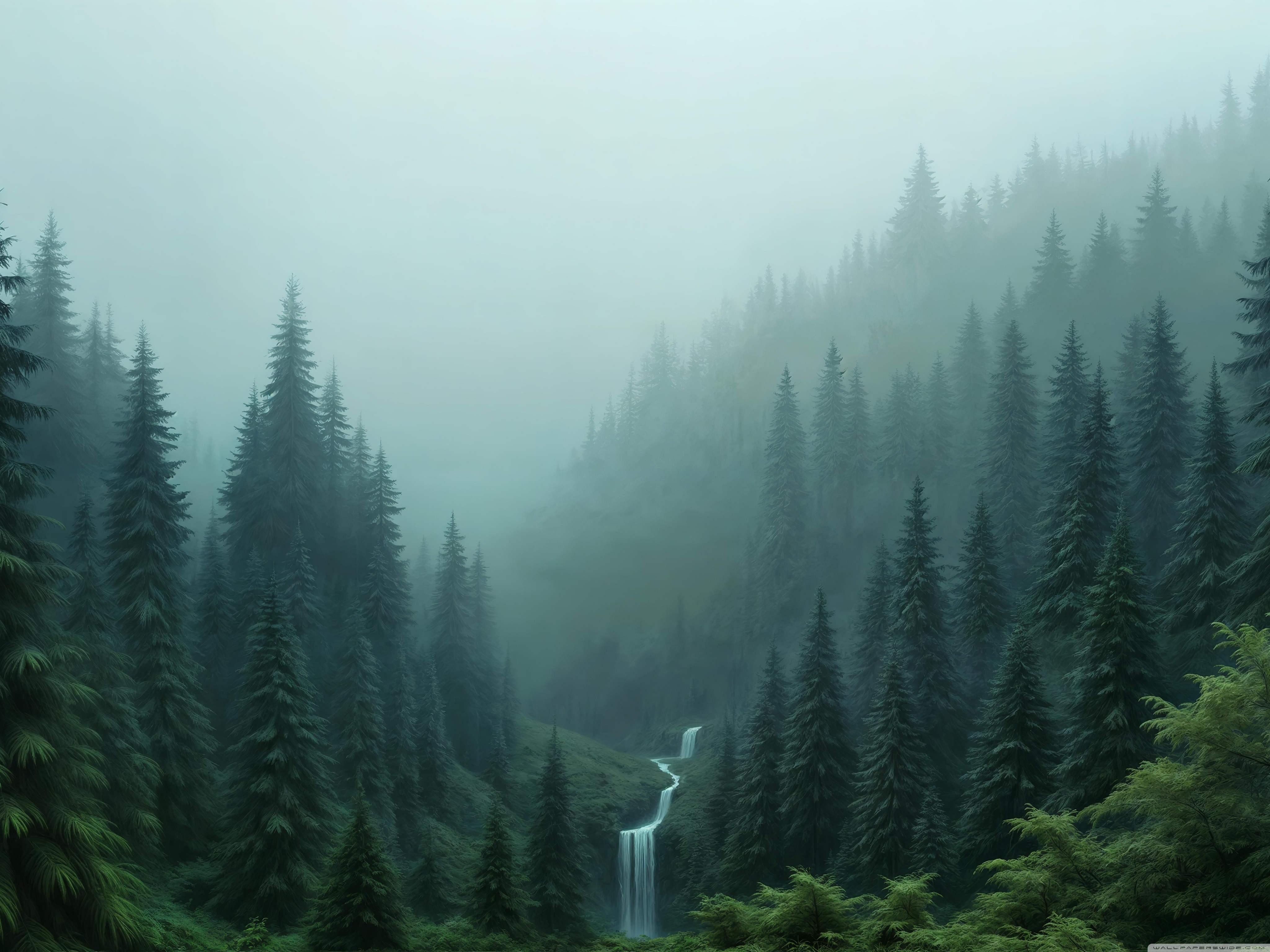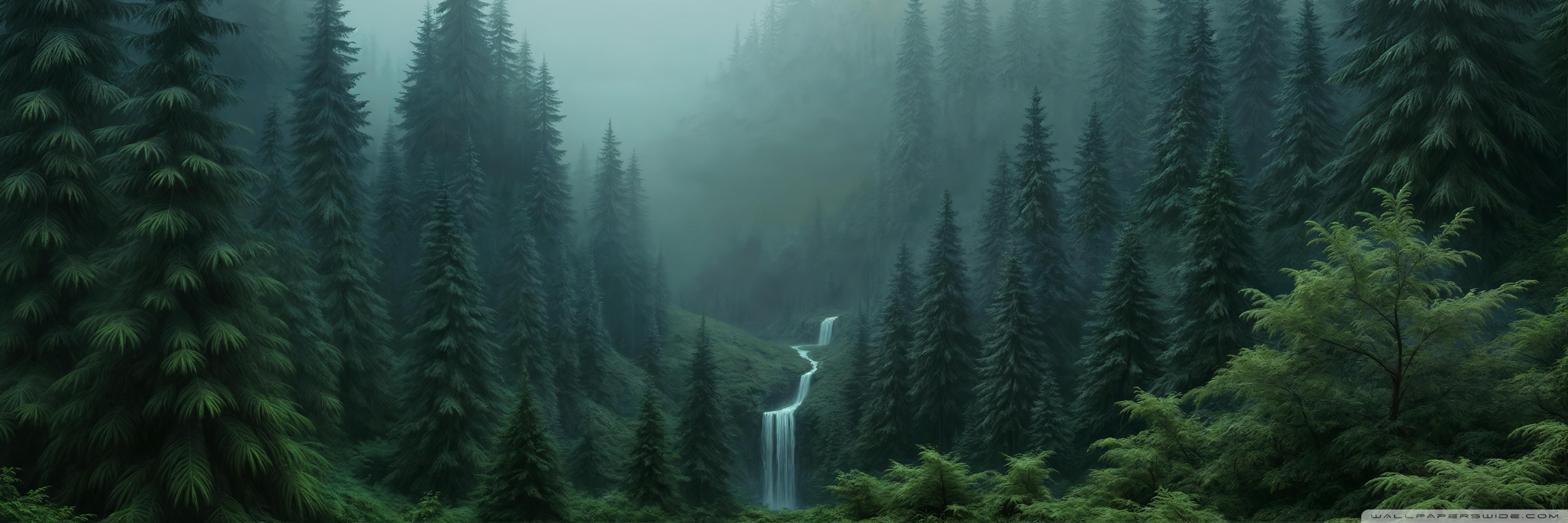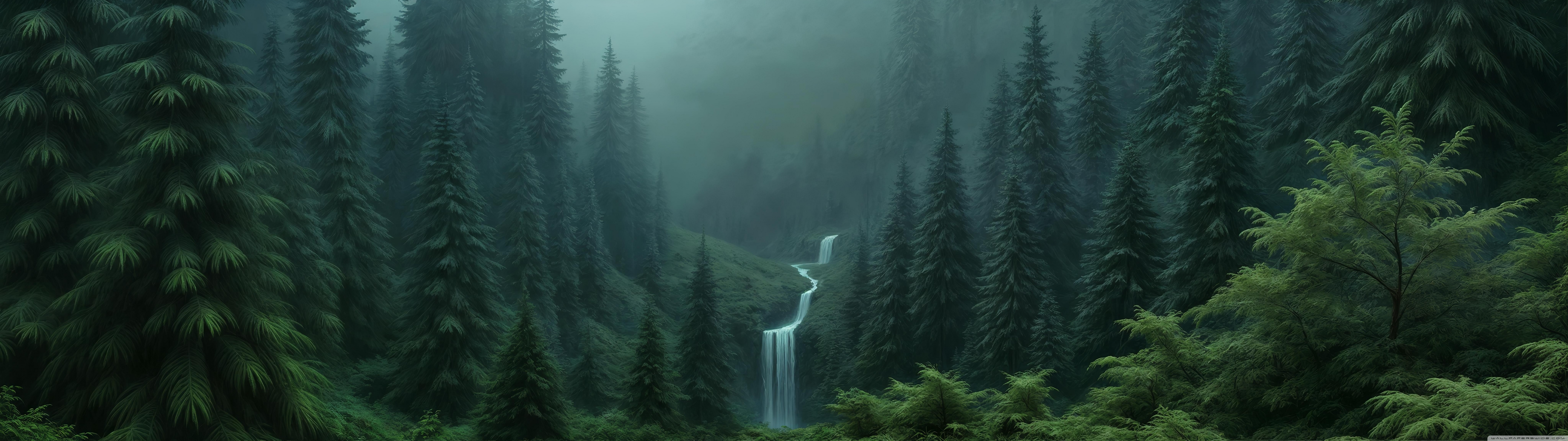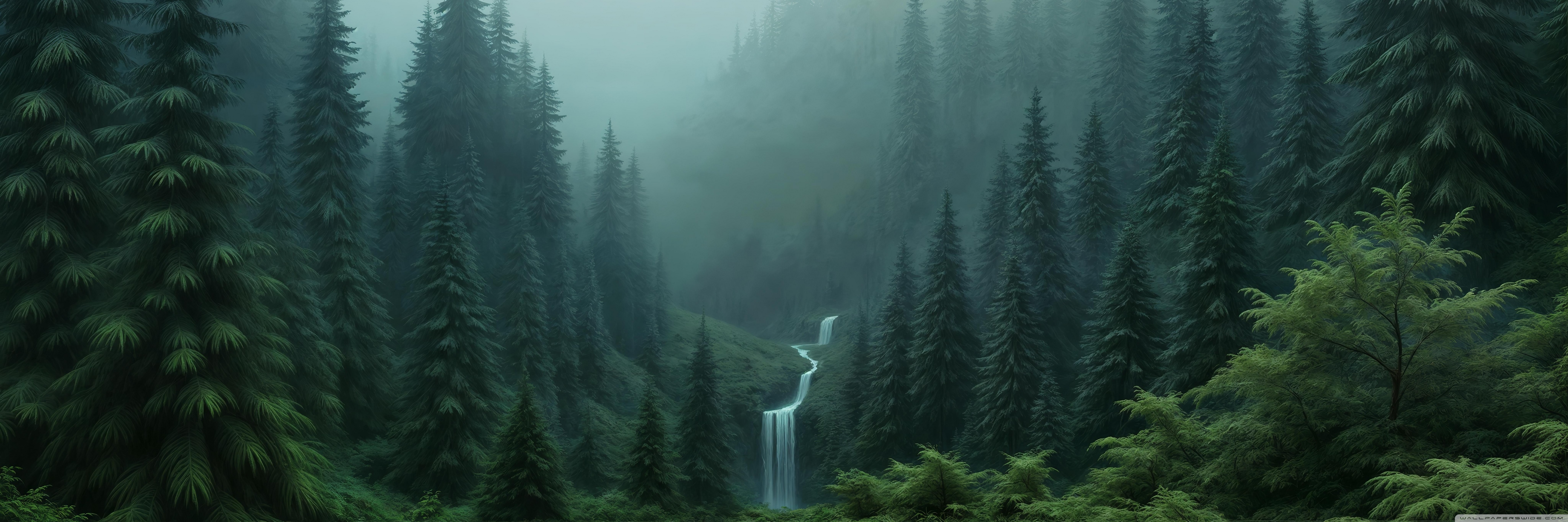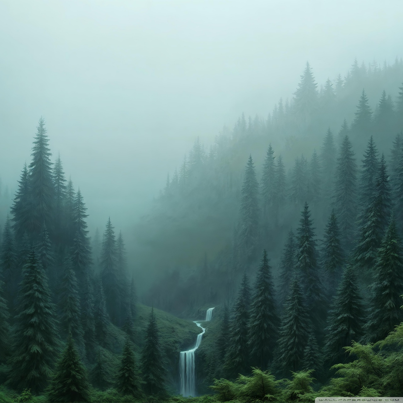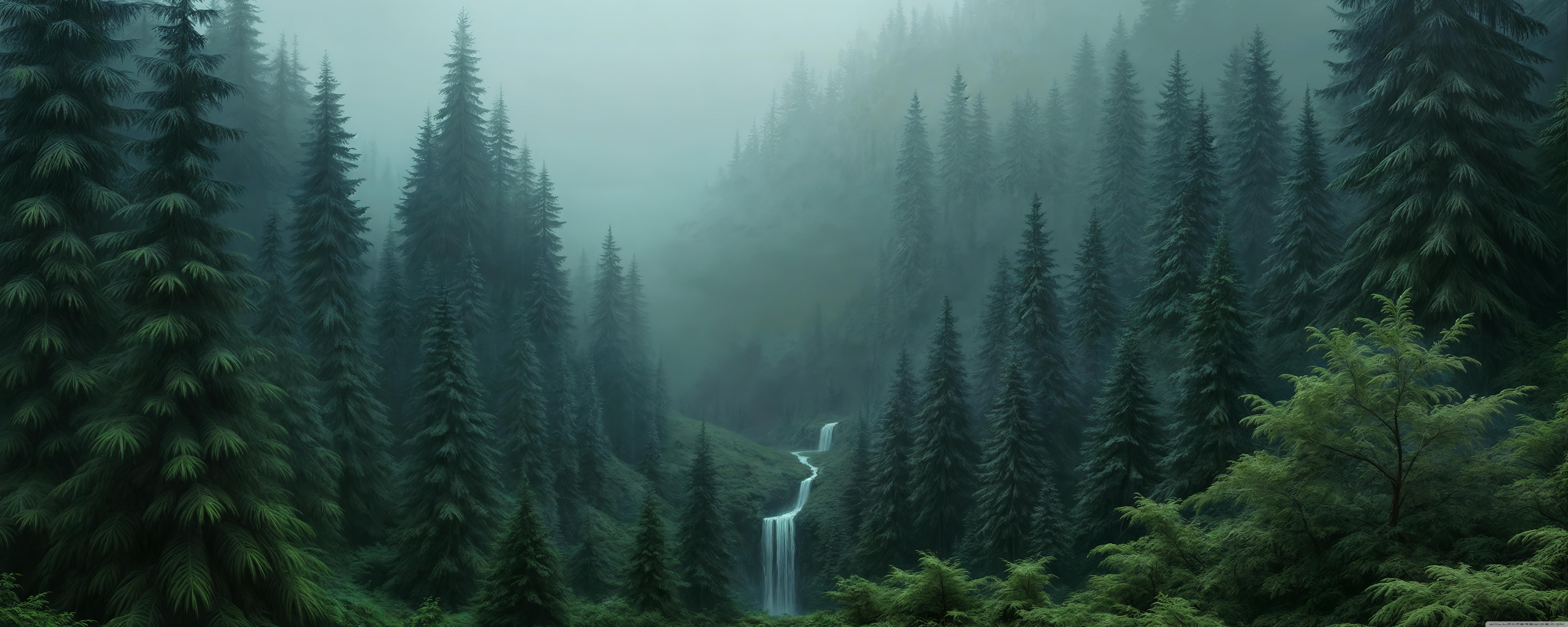 Download Montane Evergreen Forest, Fog, Waterfall 4K UHD Wallpaper