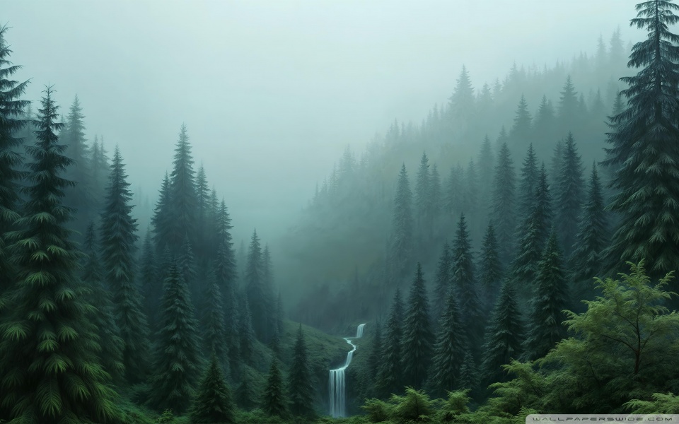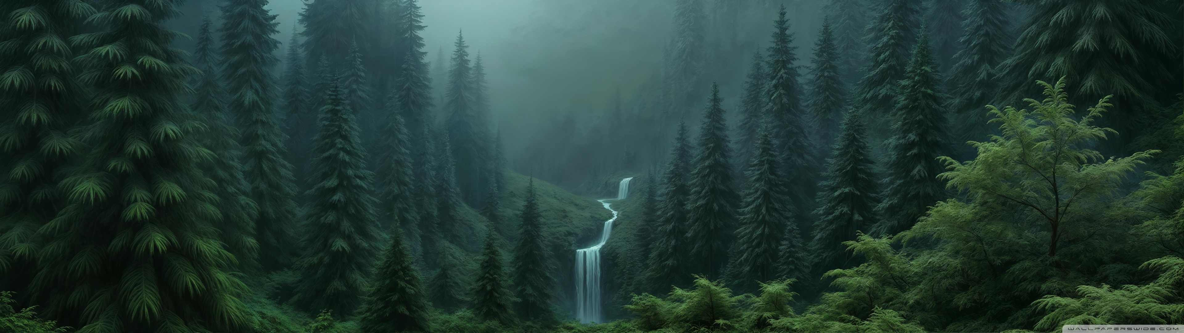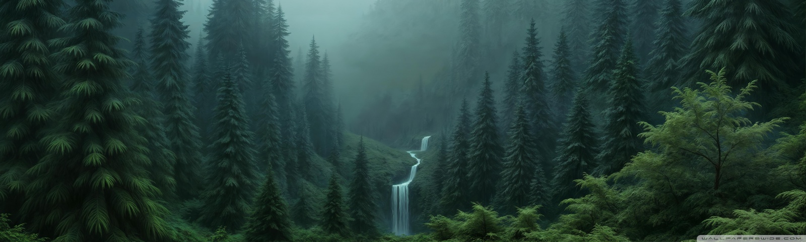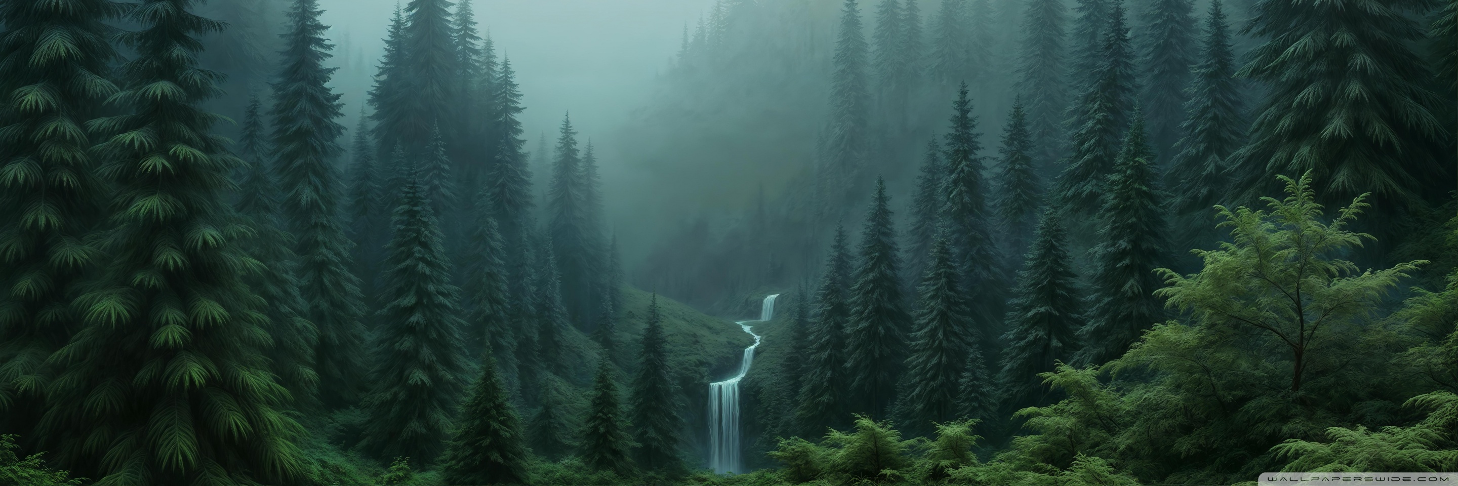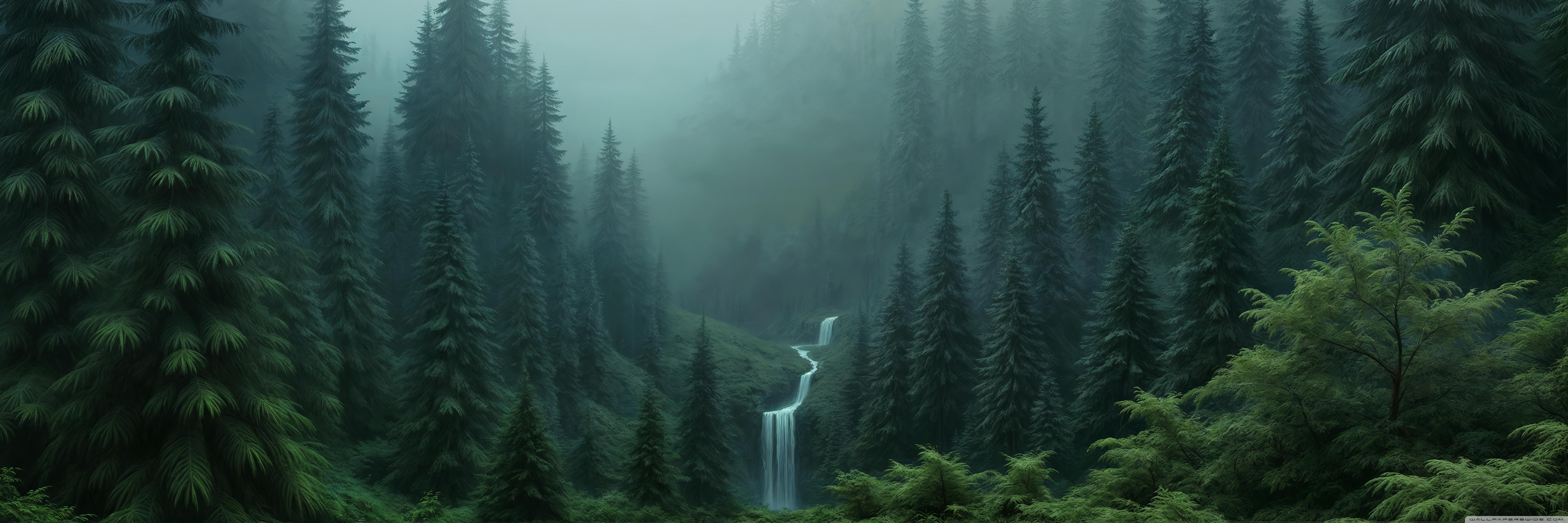 Download Montane Evergreen Forest, Fog, Waterfall 4K UHD Wallpaper