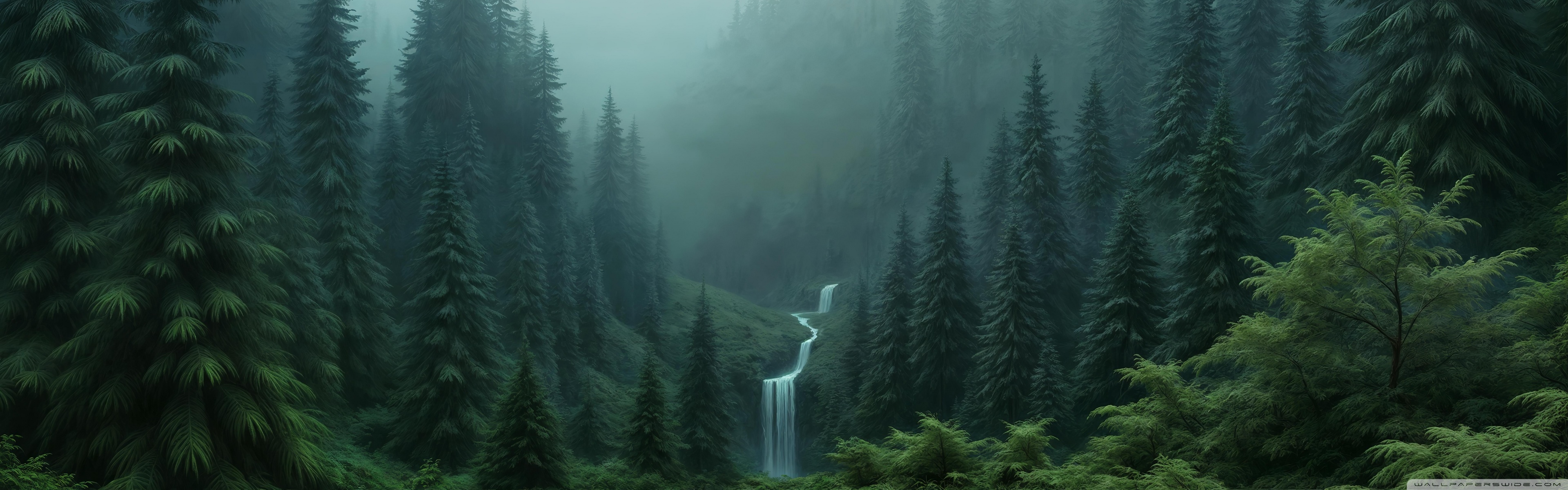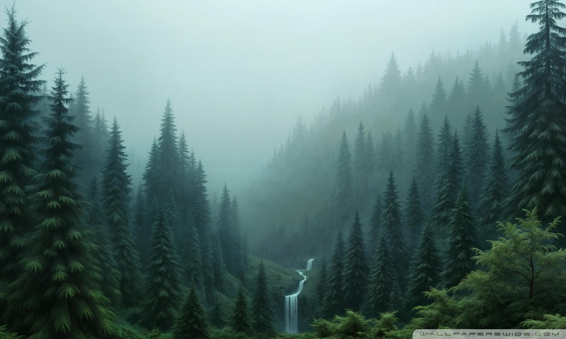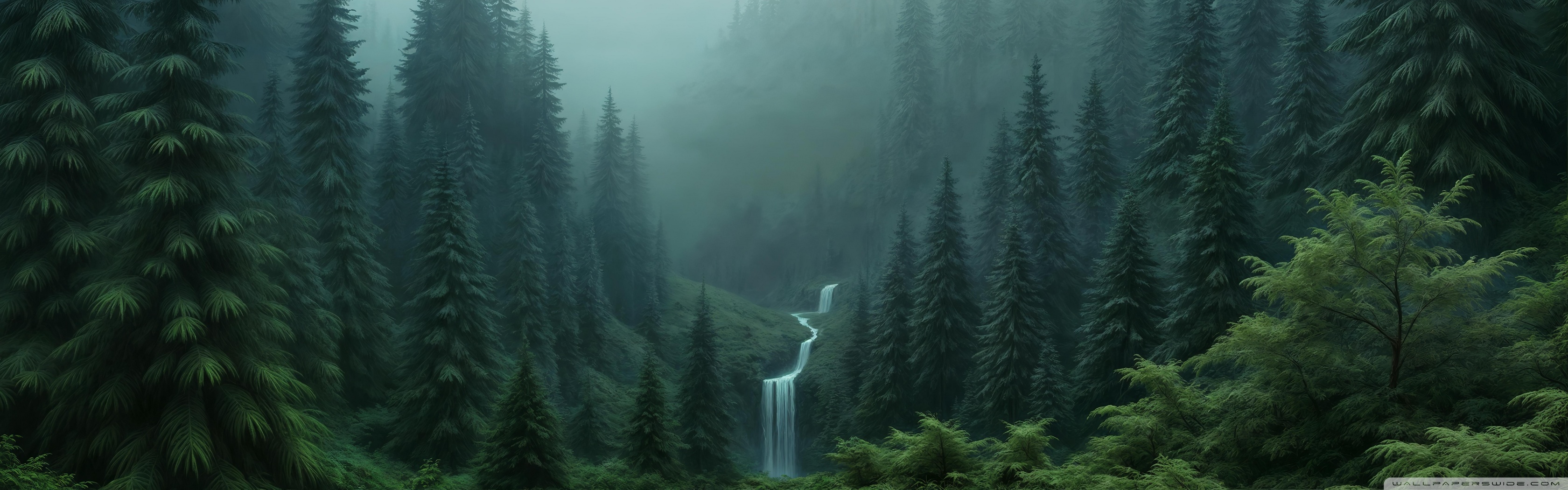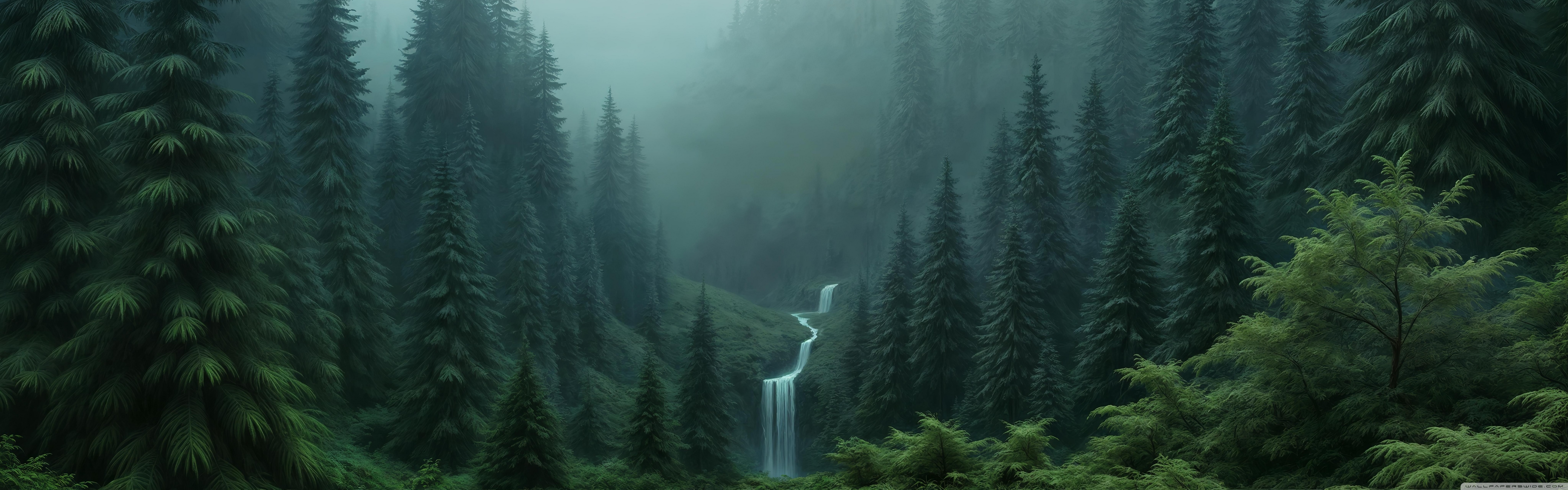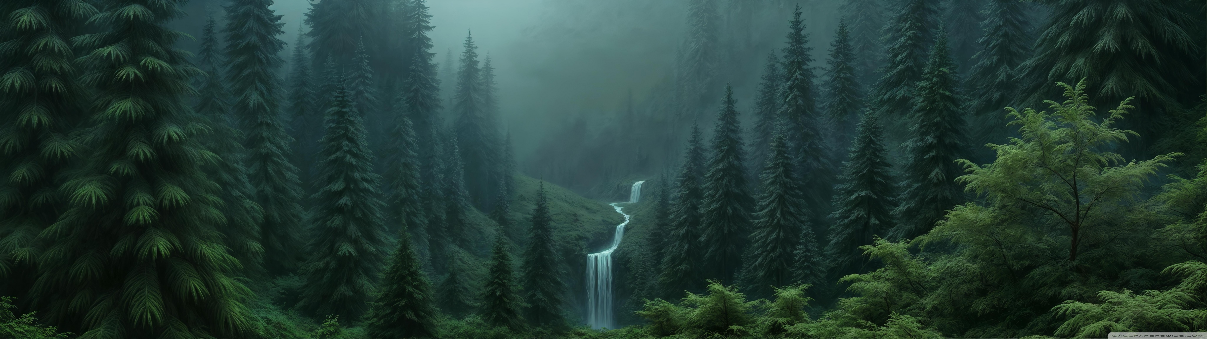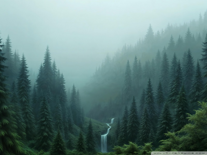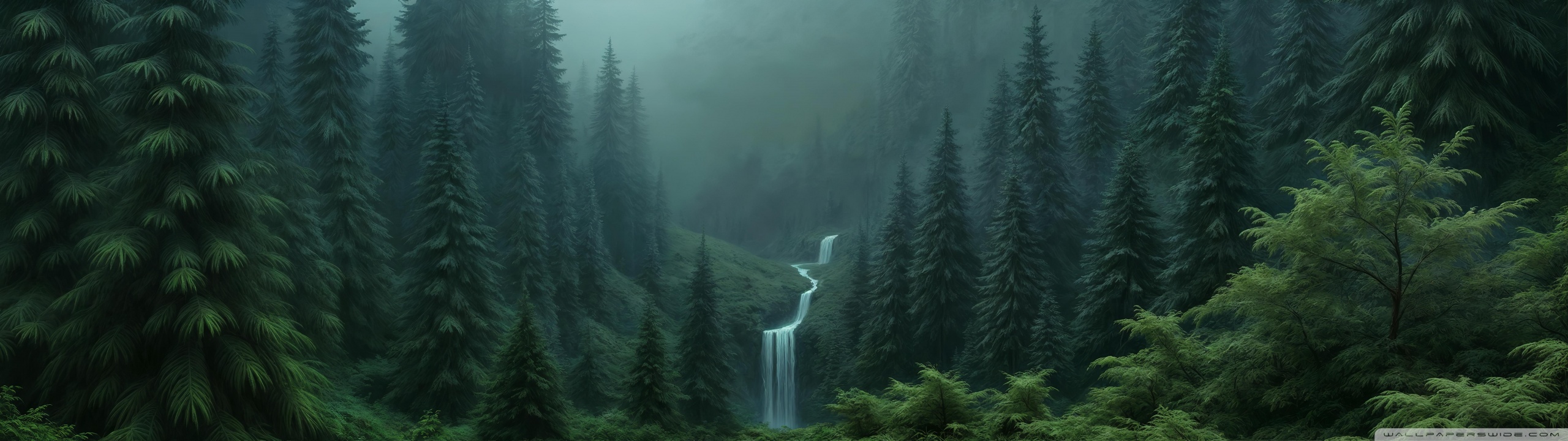 Download Montane Evergreen Forest, Fog, Waterfall 4K UHD Wallpaper