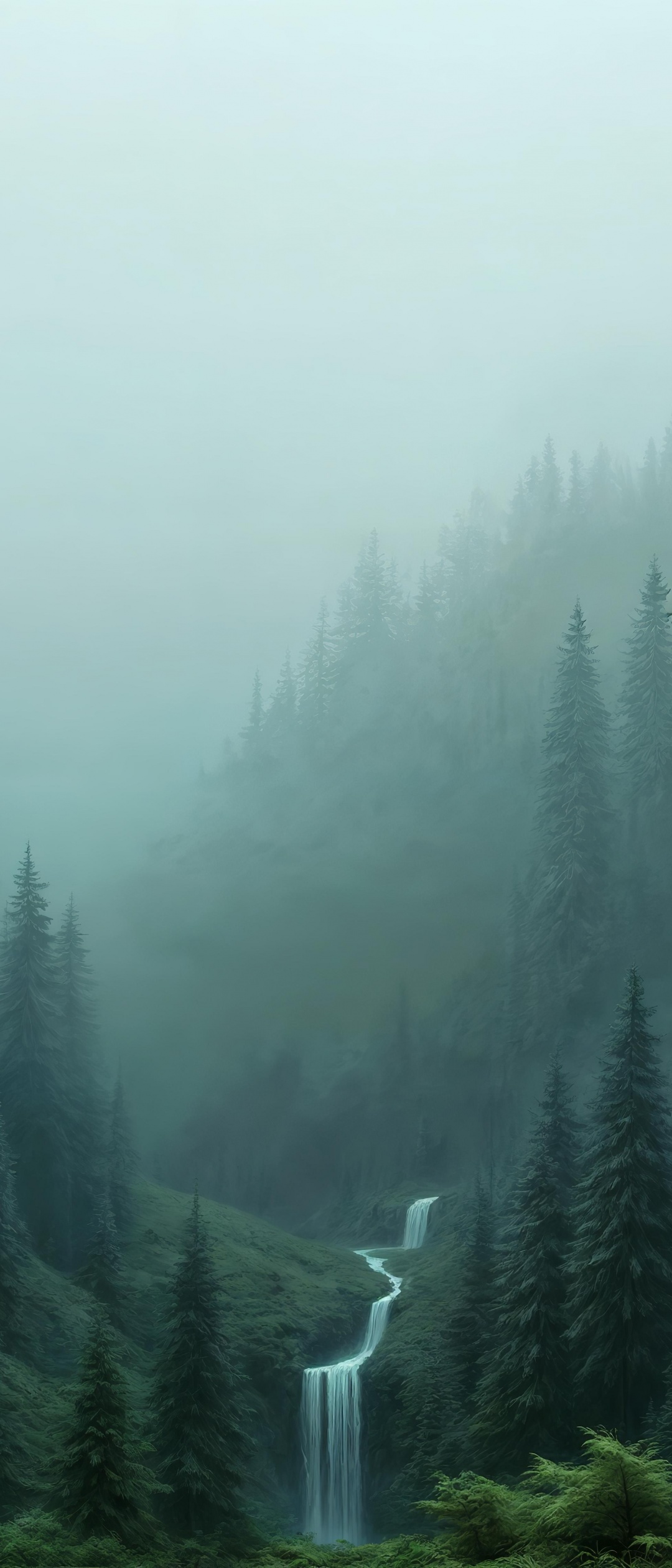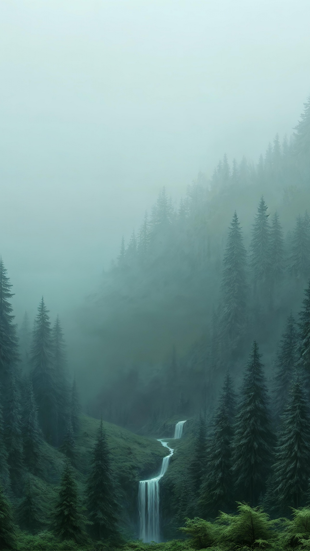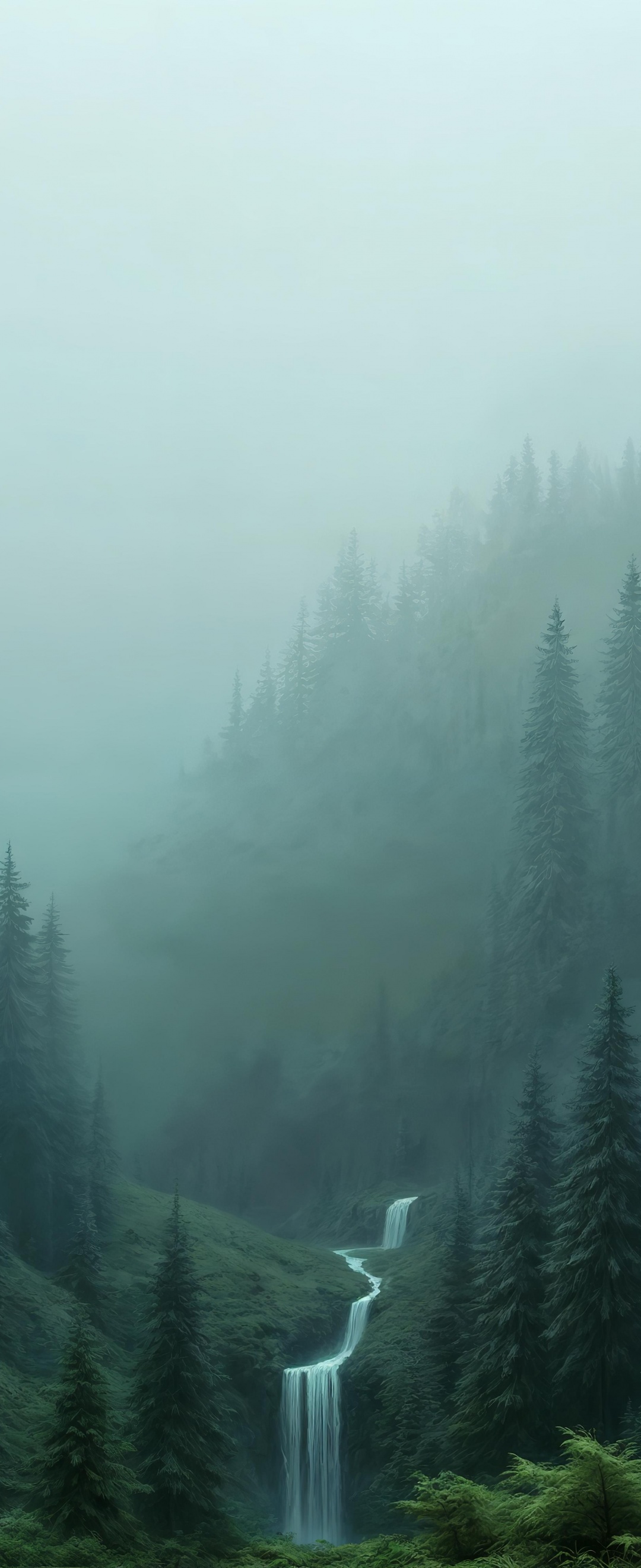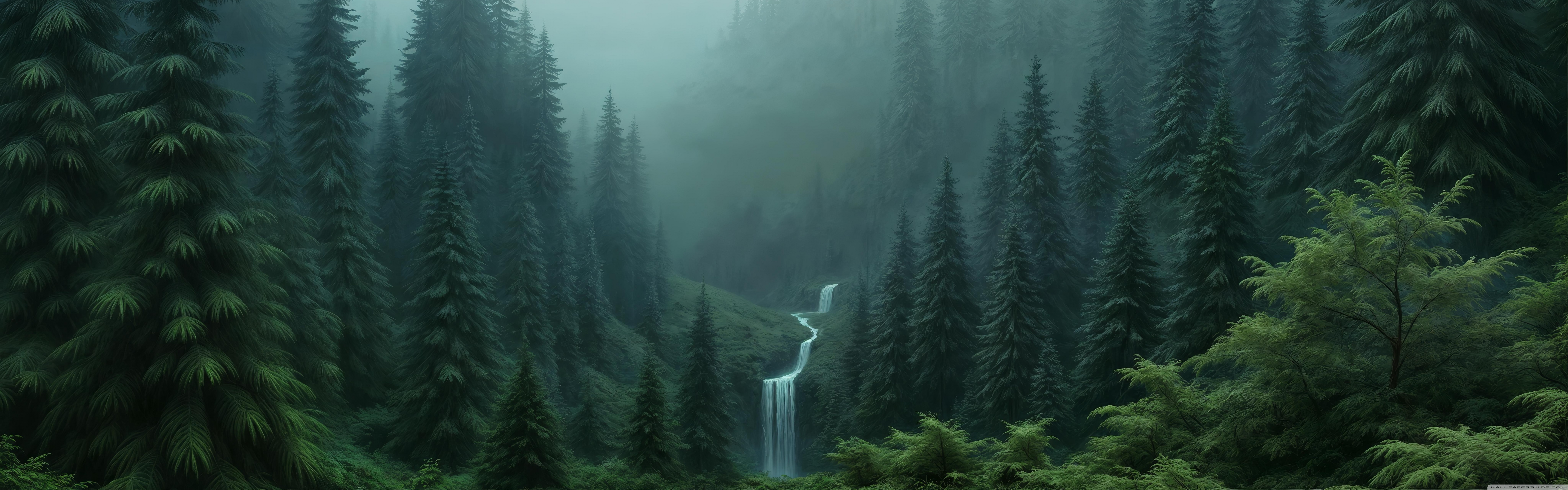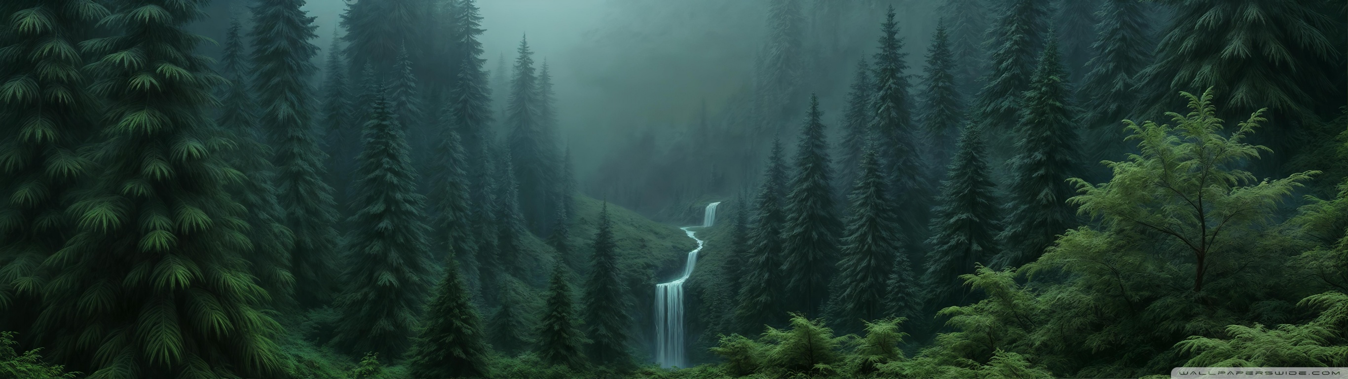 Download Montane Evergreen Forest, Fog, Waterfall 4K UHD Wallpaper