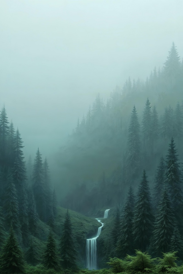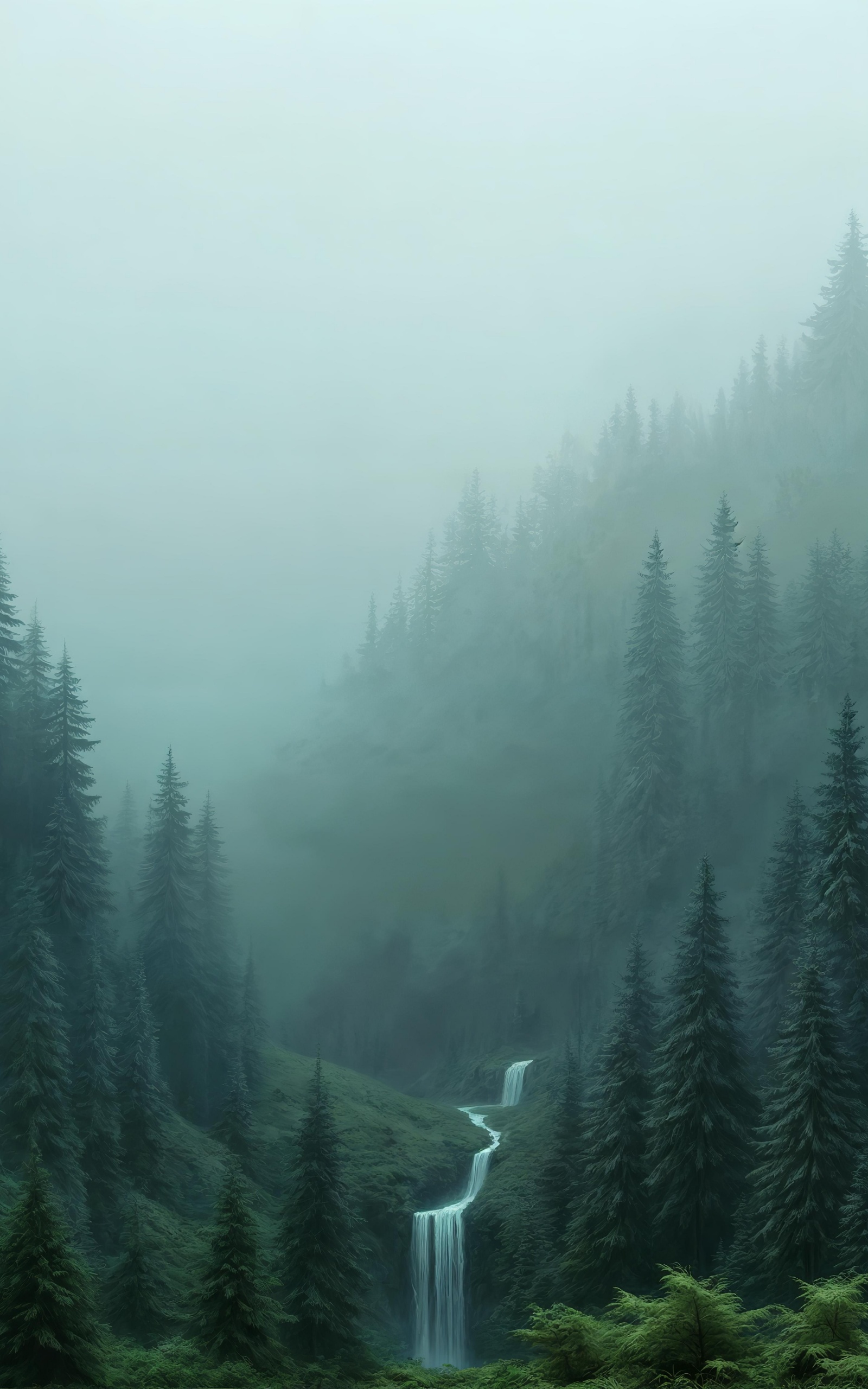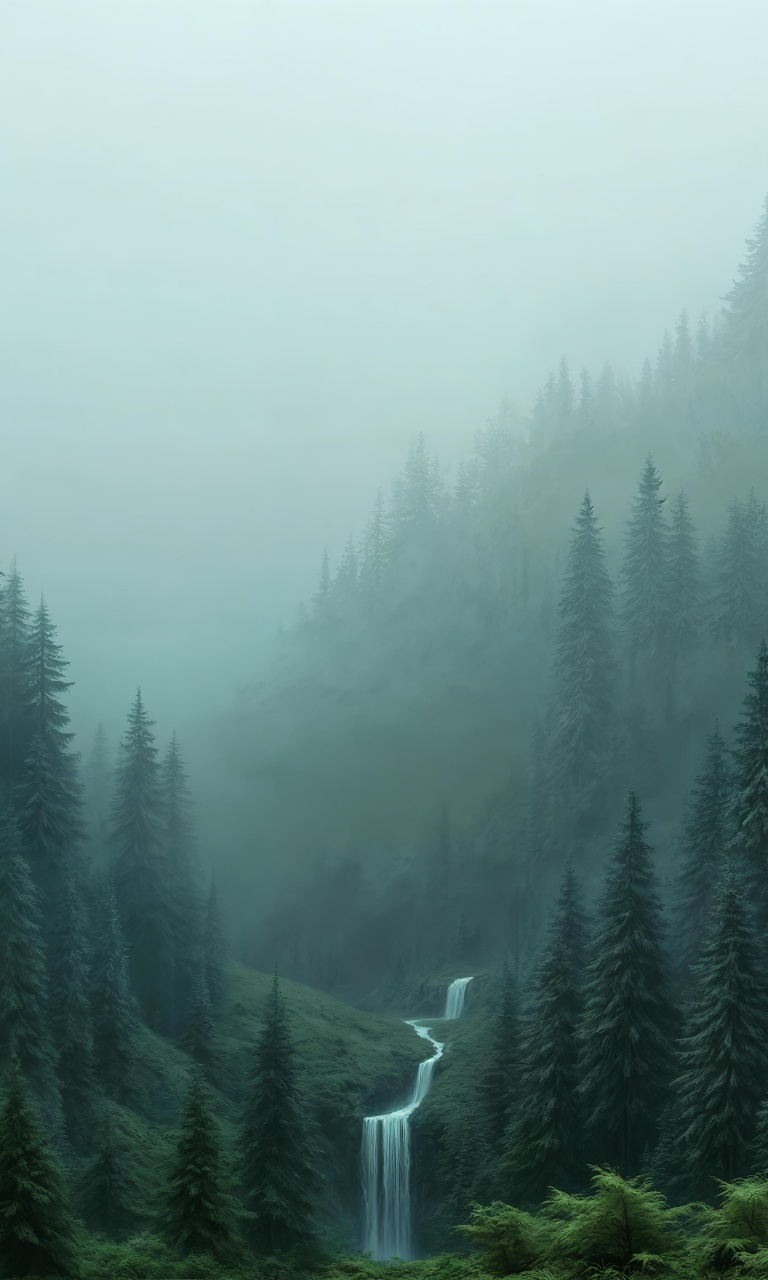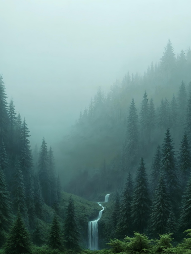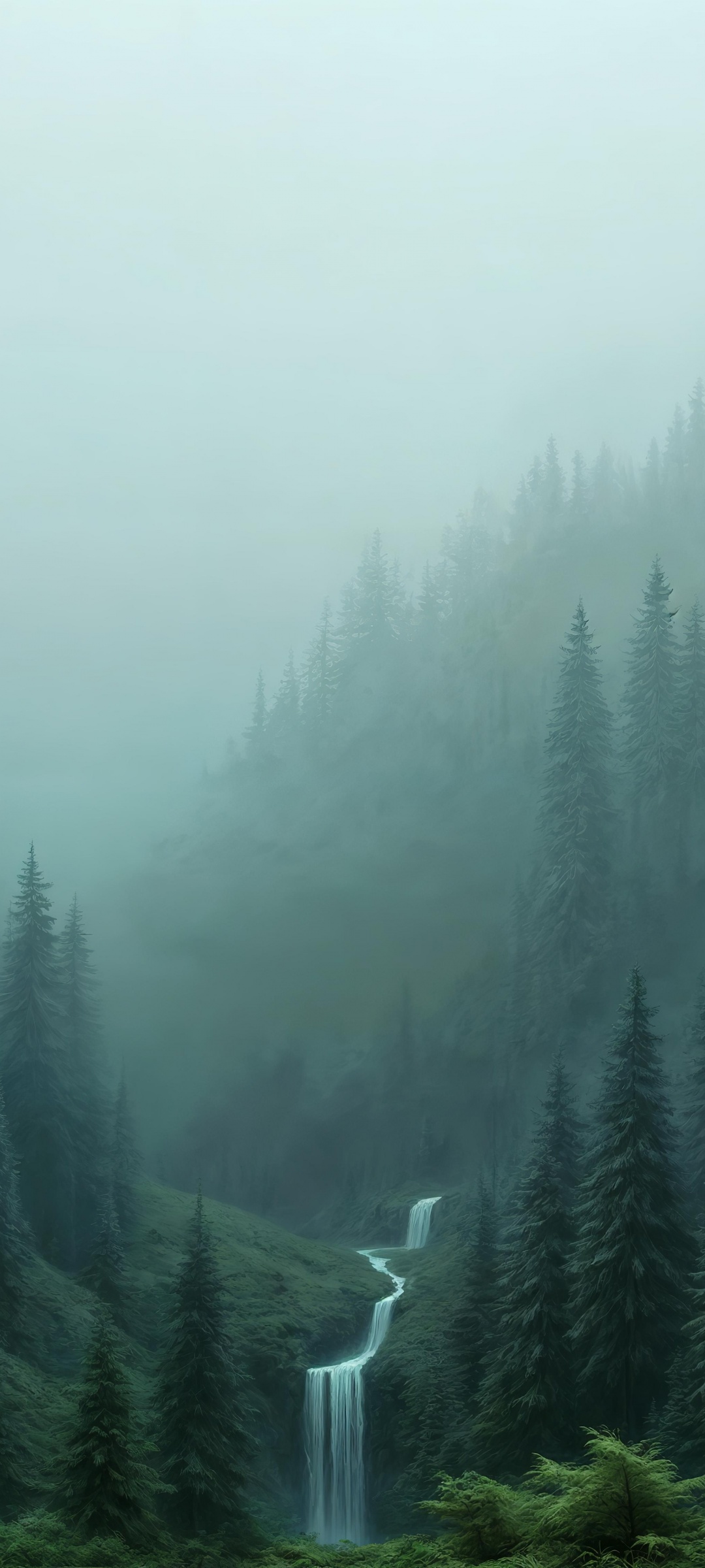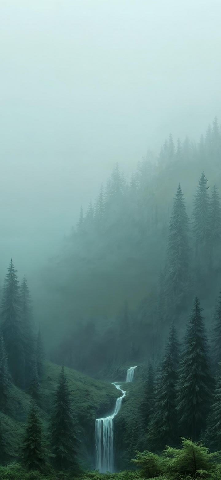 Download Montane Evergreen Forest, Fog, Waterfall 4K UHD Wallpaper