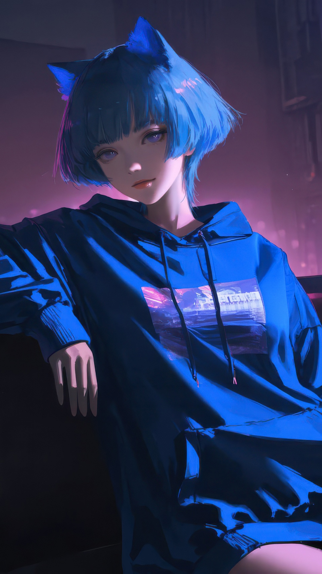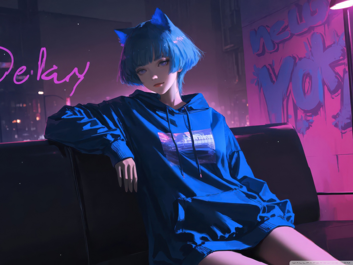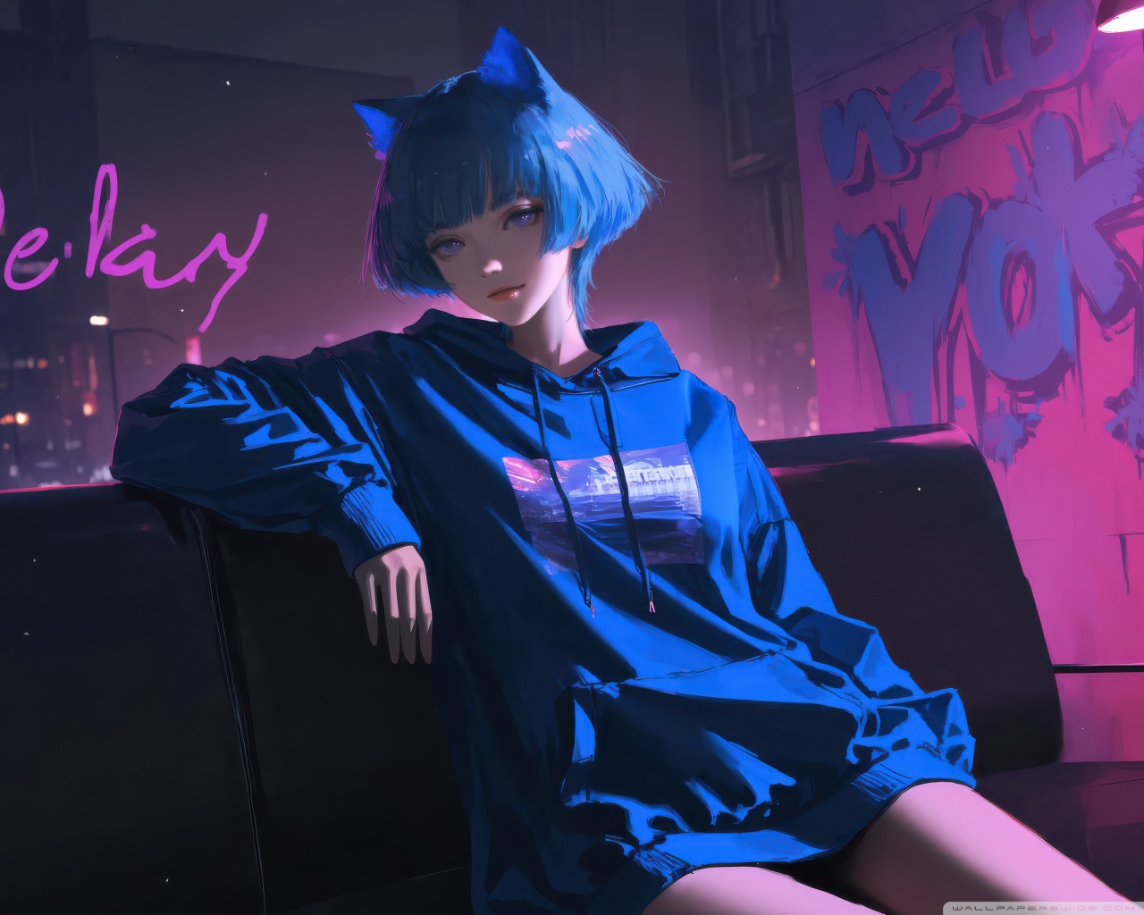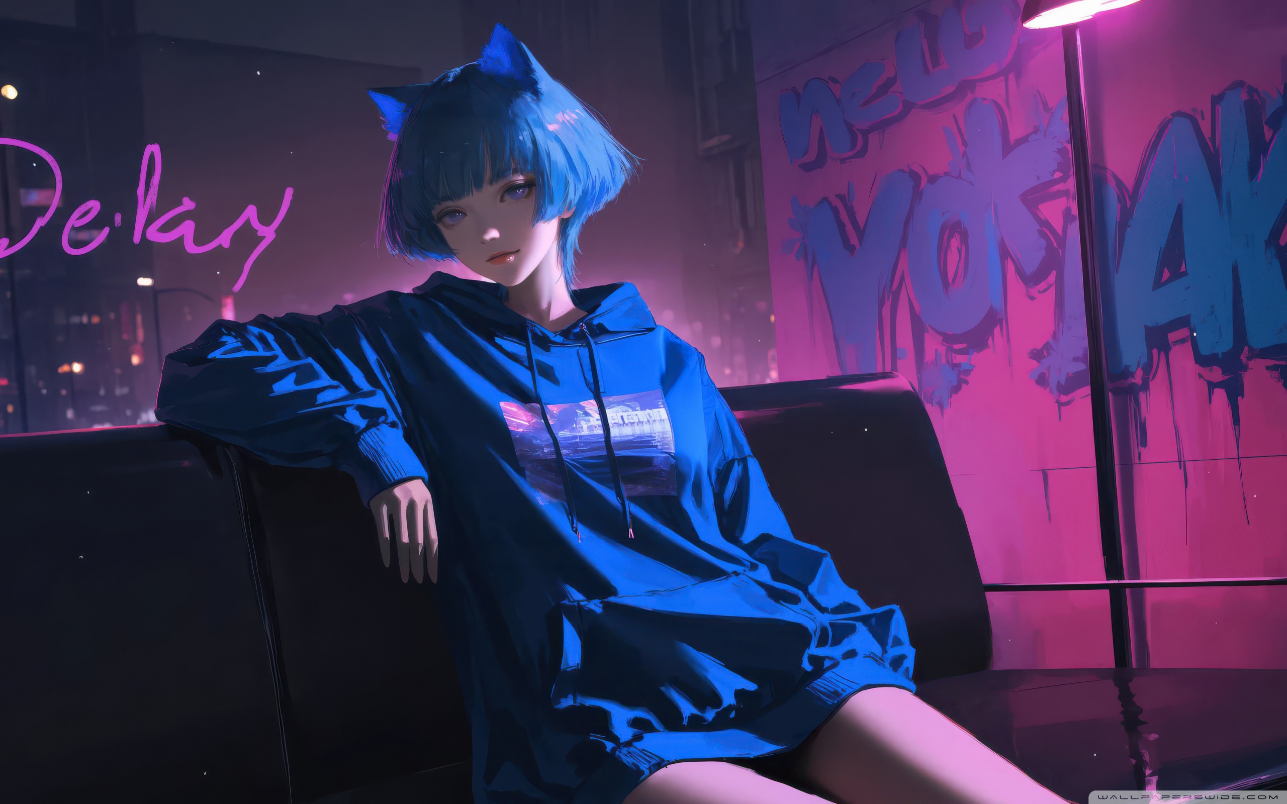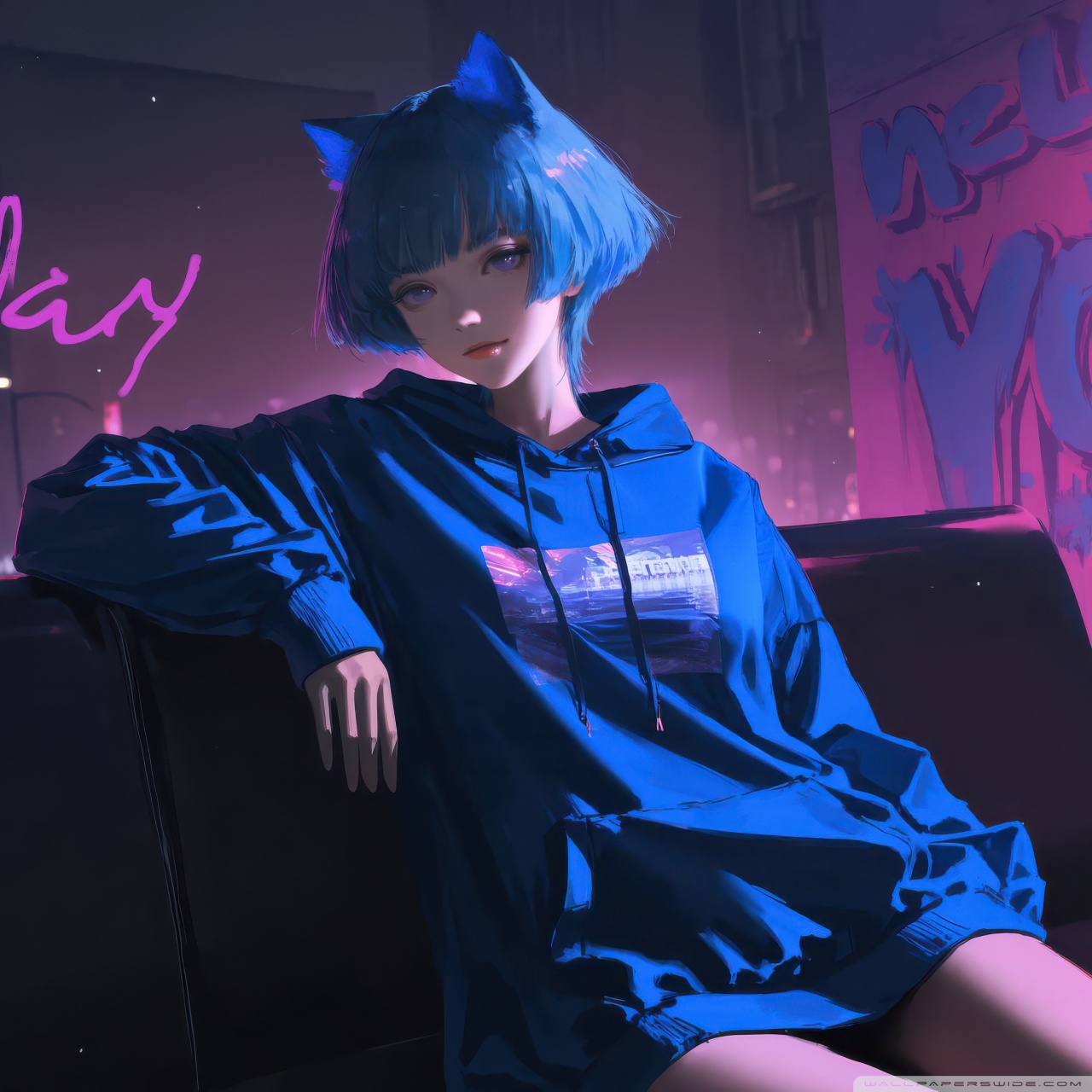 Download Neko Anime Girl with Blue Hair Resting on the... 4K UHD Wallpaper