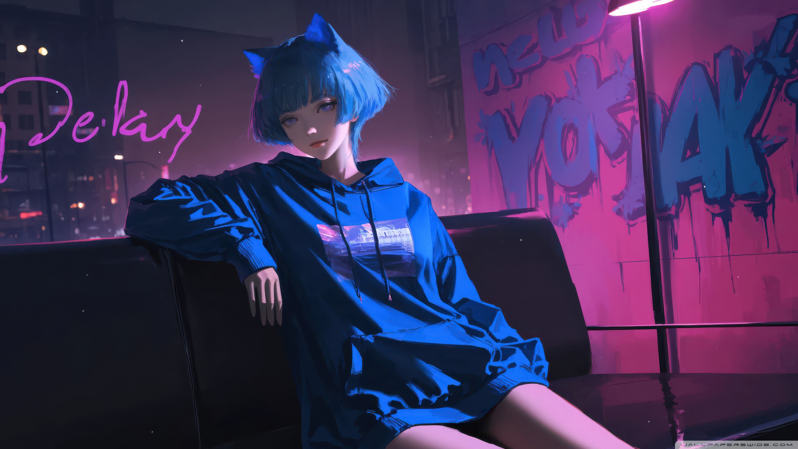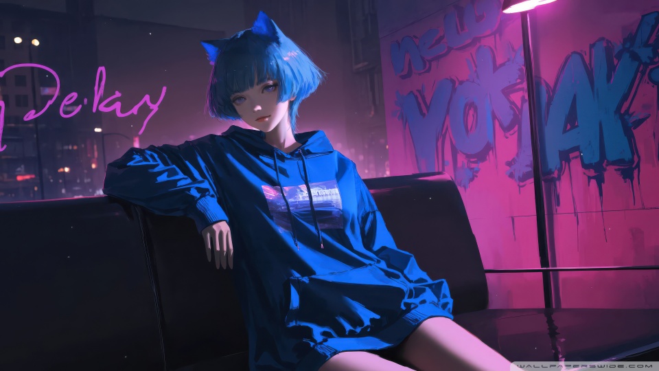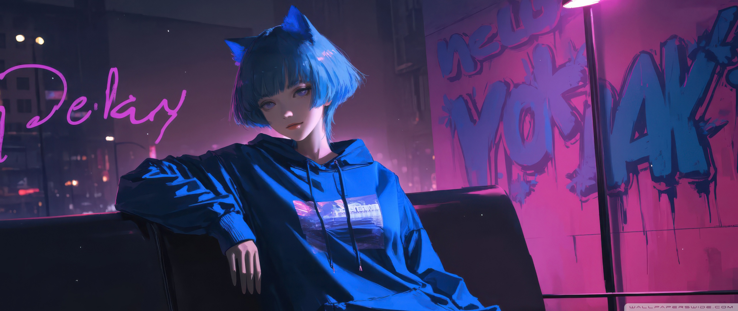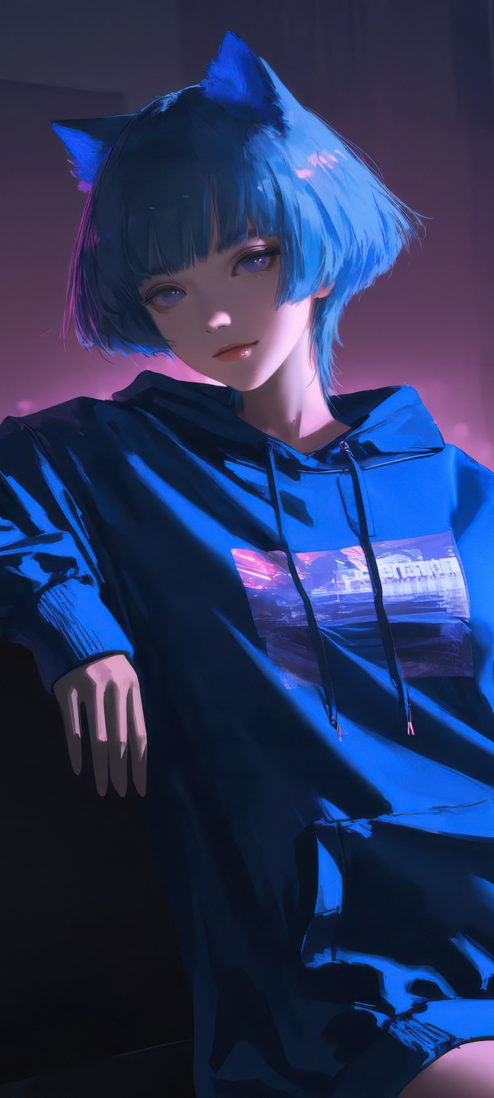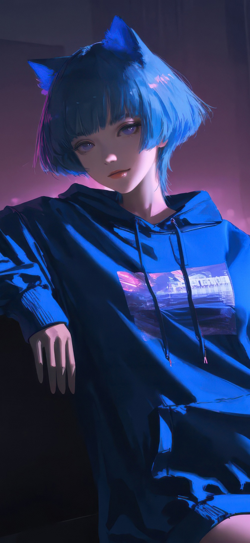 Download Neko Anime Girl with Blue Hair Resting on the... 4K UHD Wallpaper