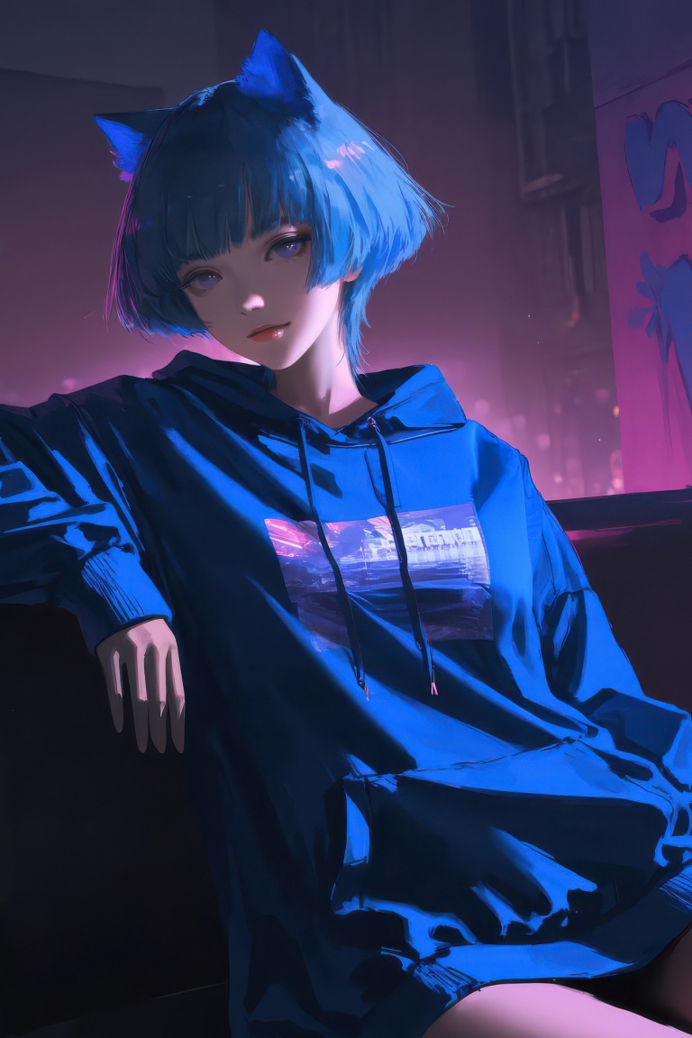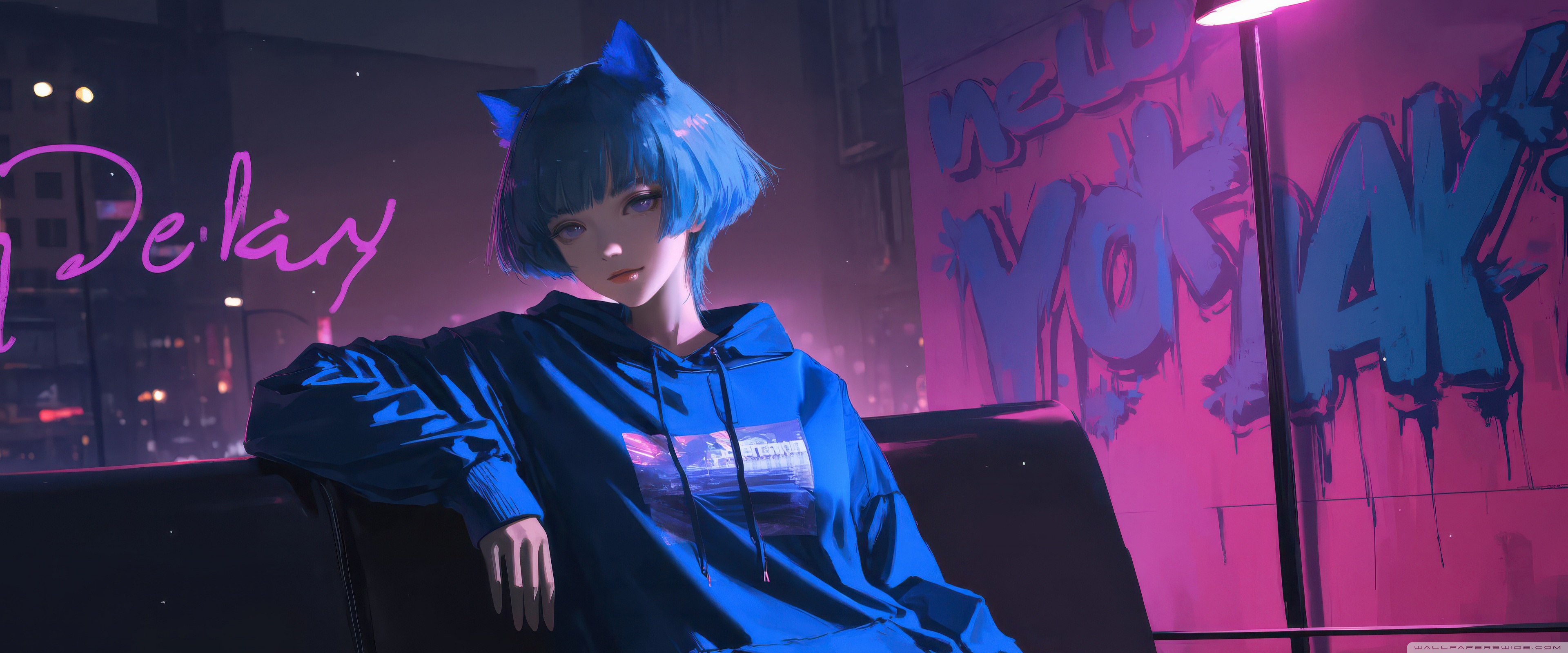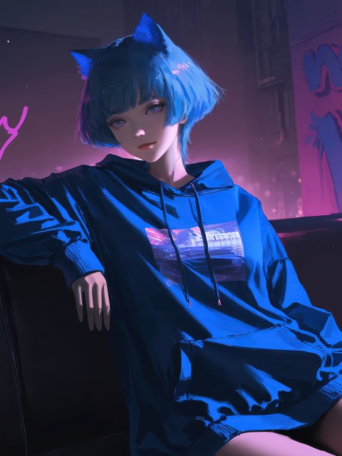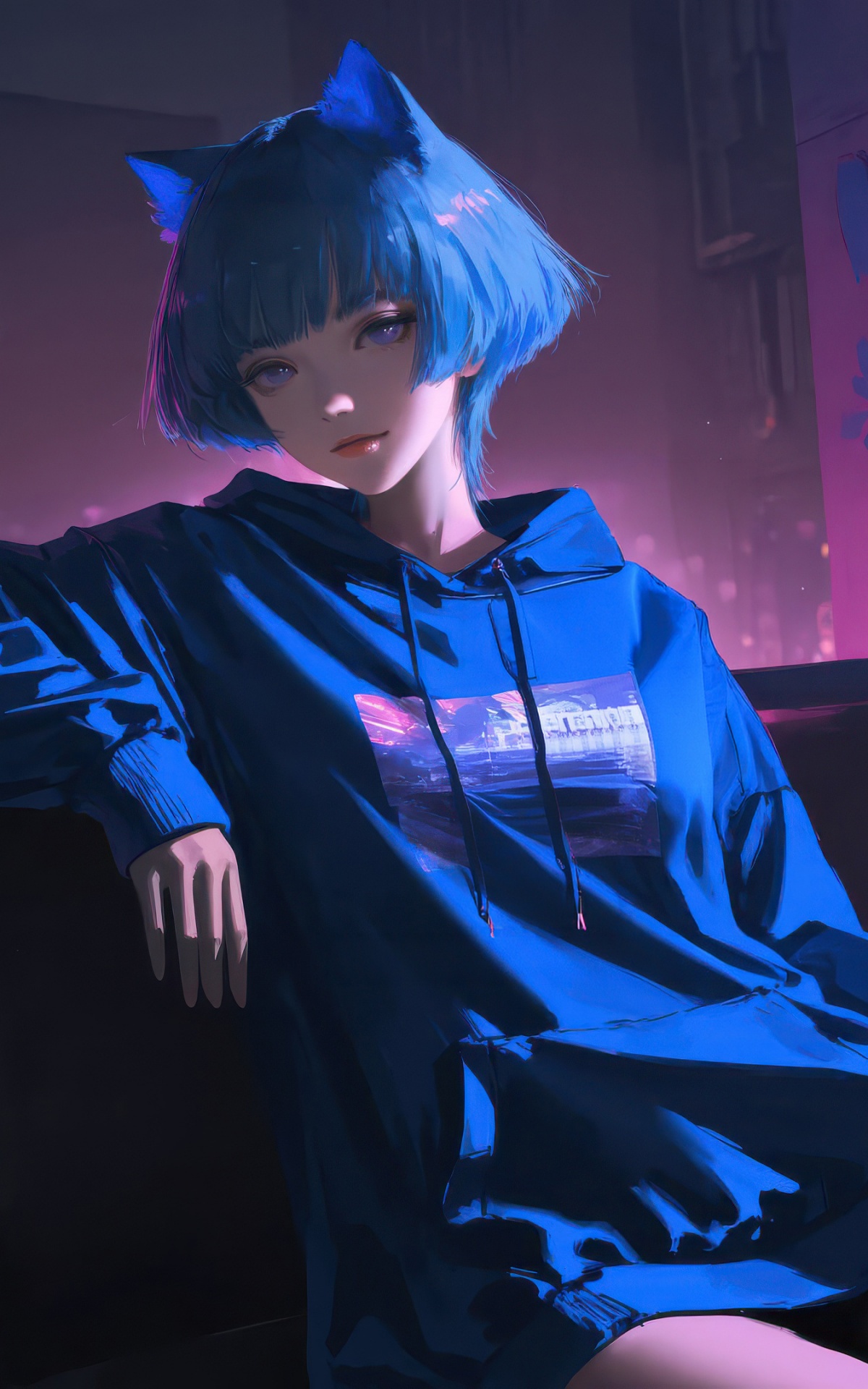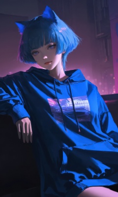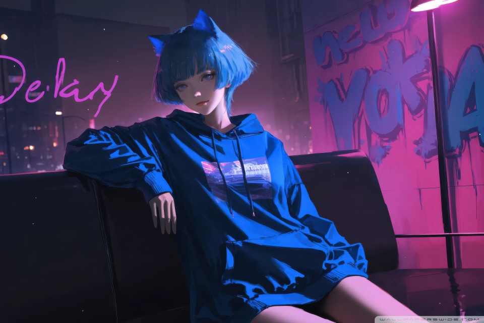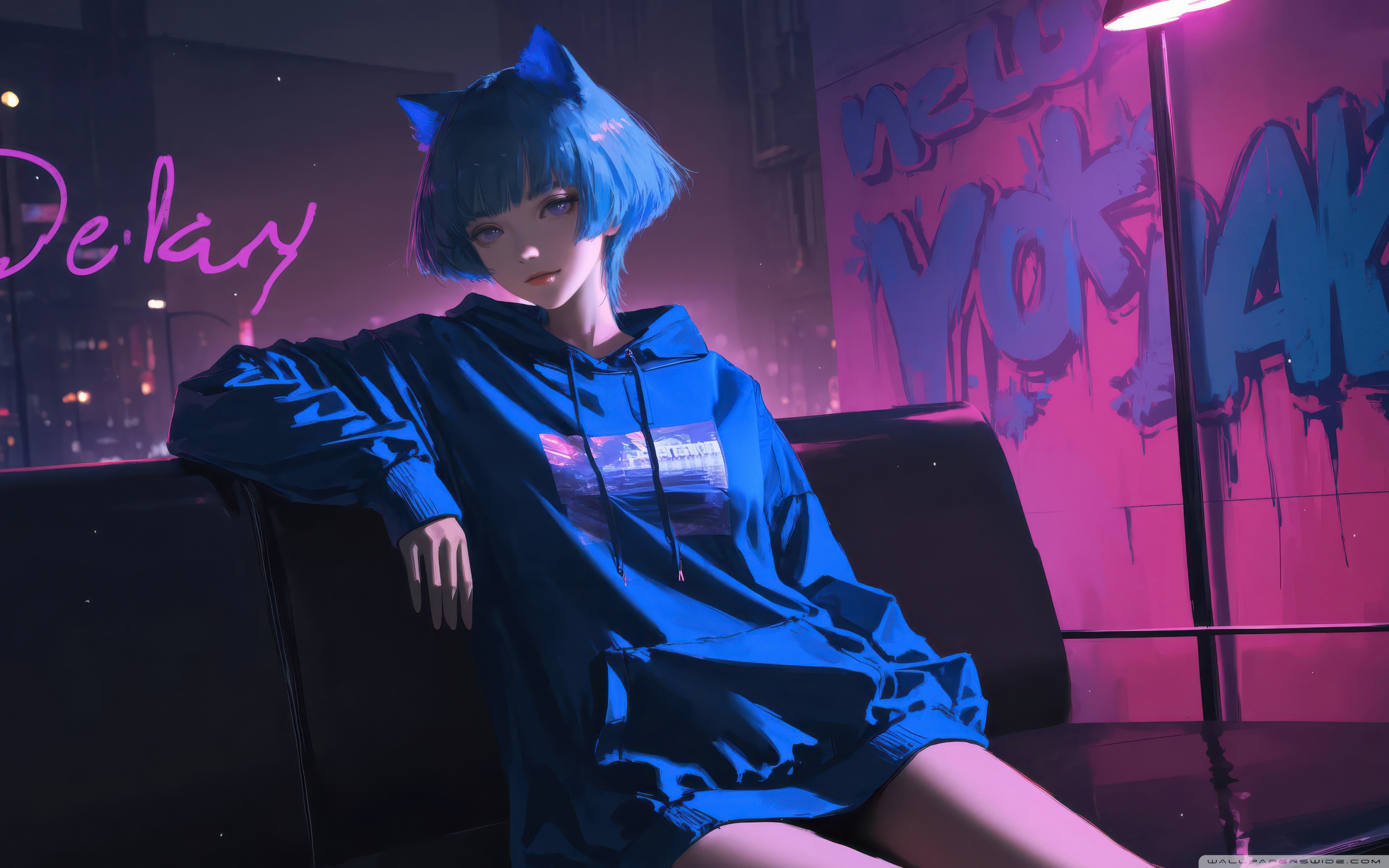 Download Neko Anime Girl with Blue Hair Resting on the... 4K UHD Wallpaper