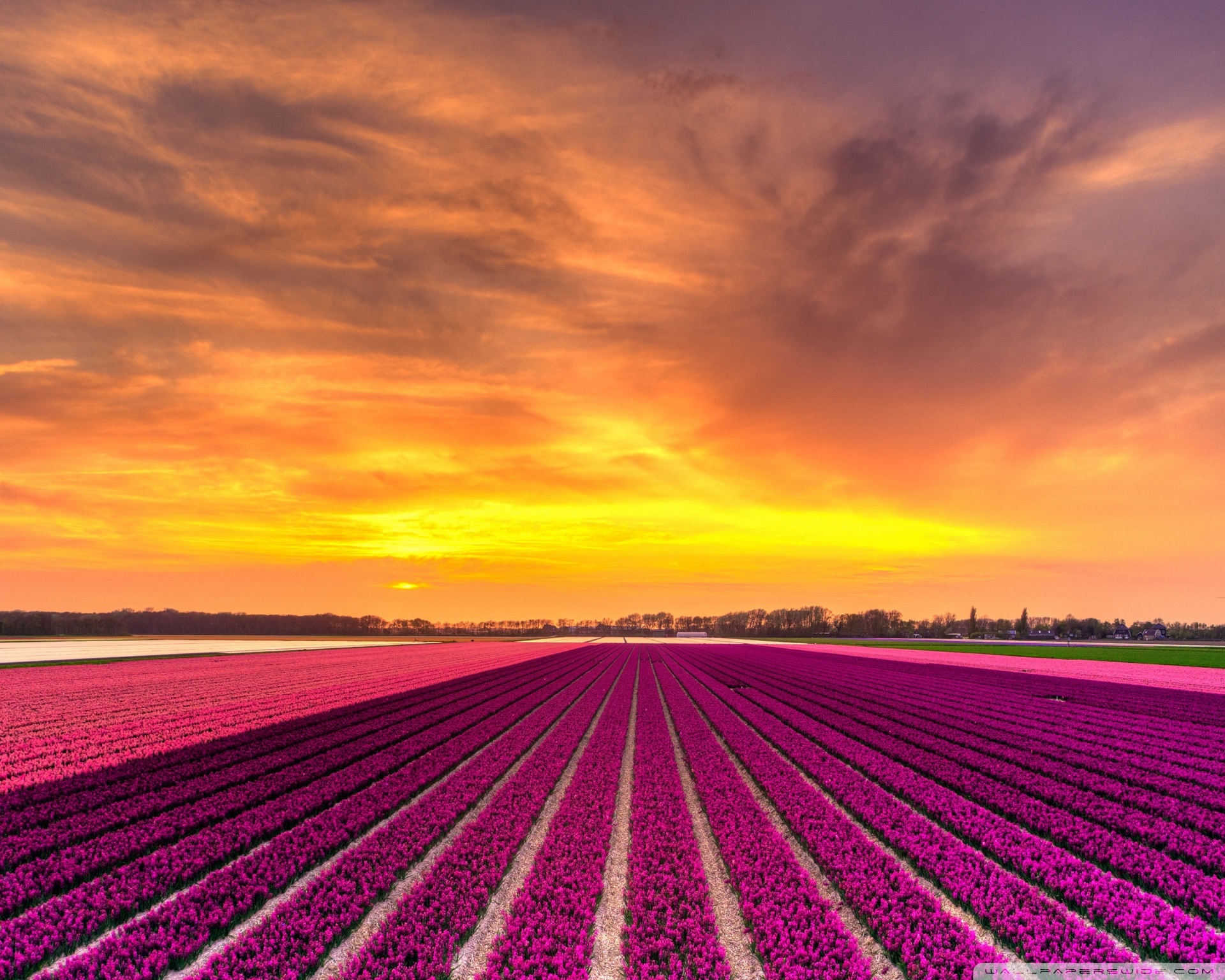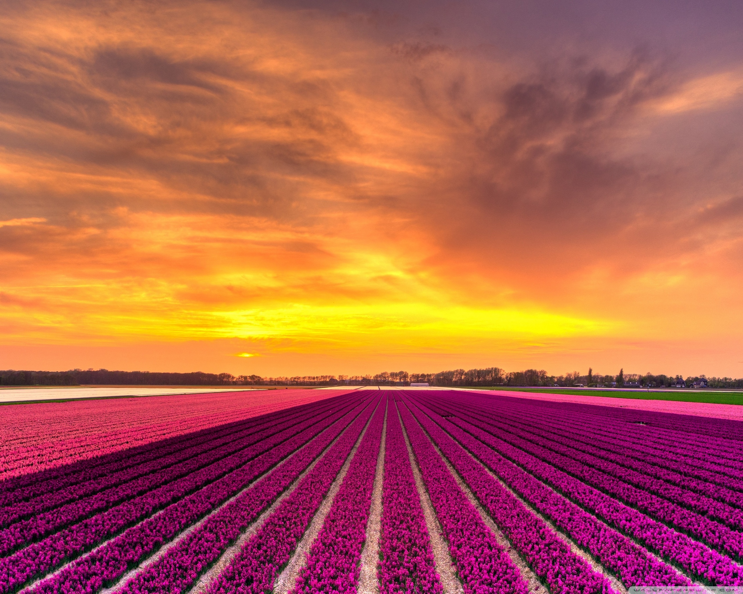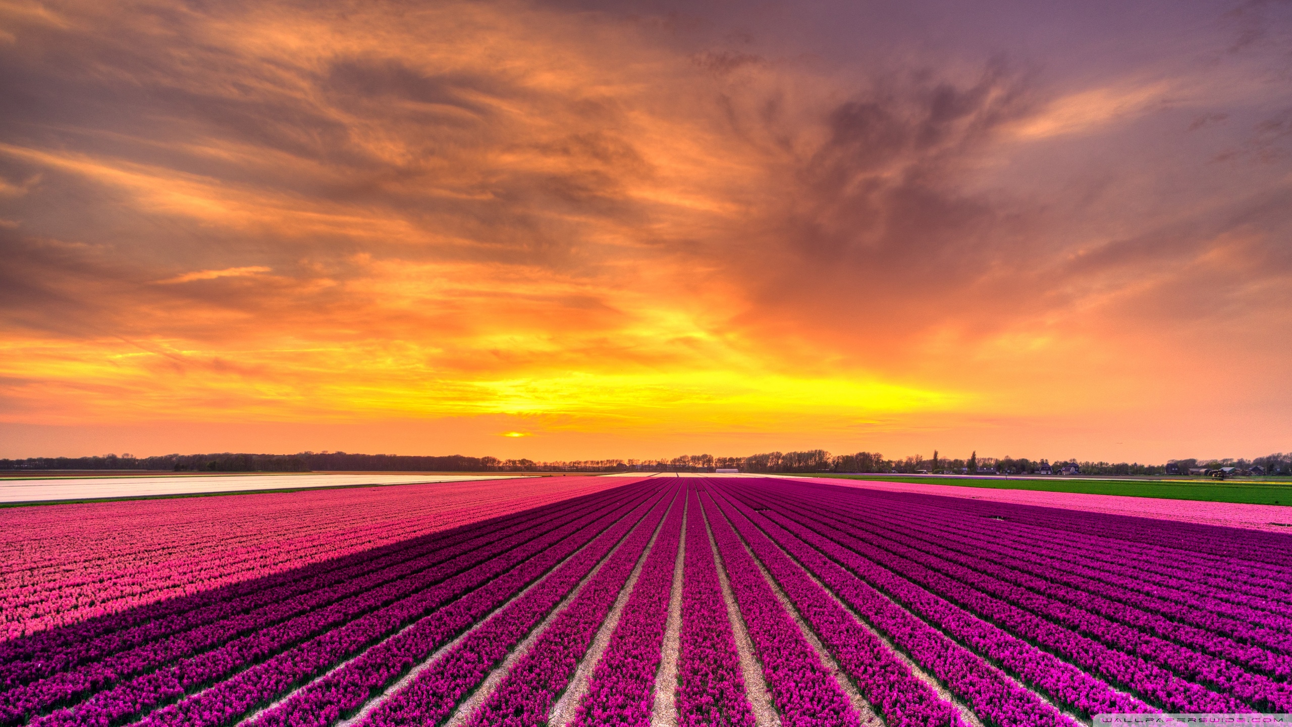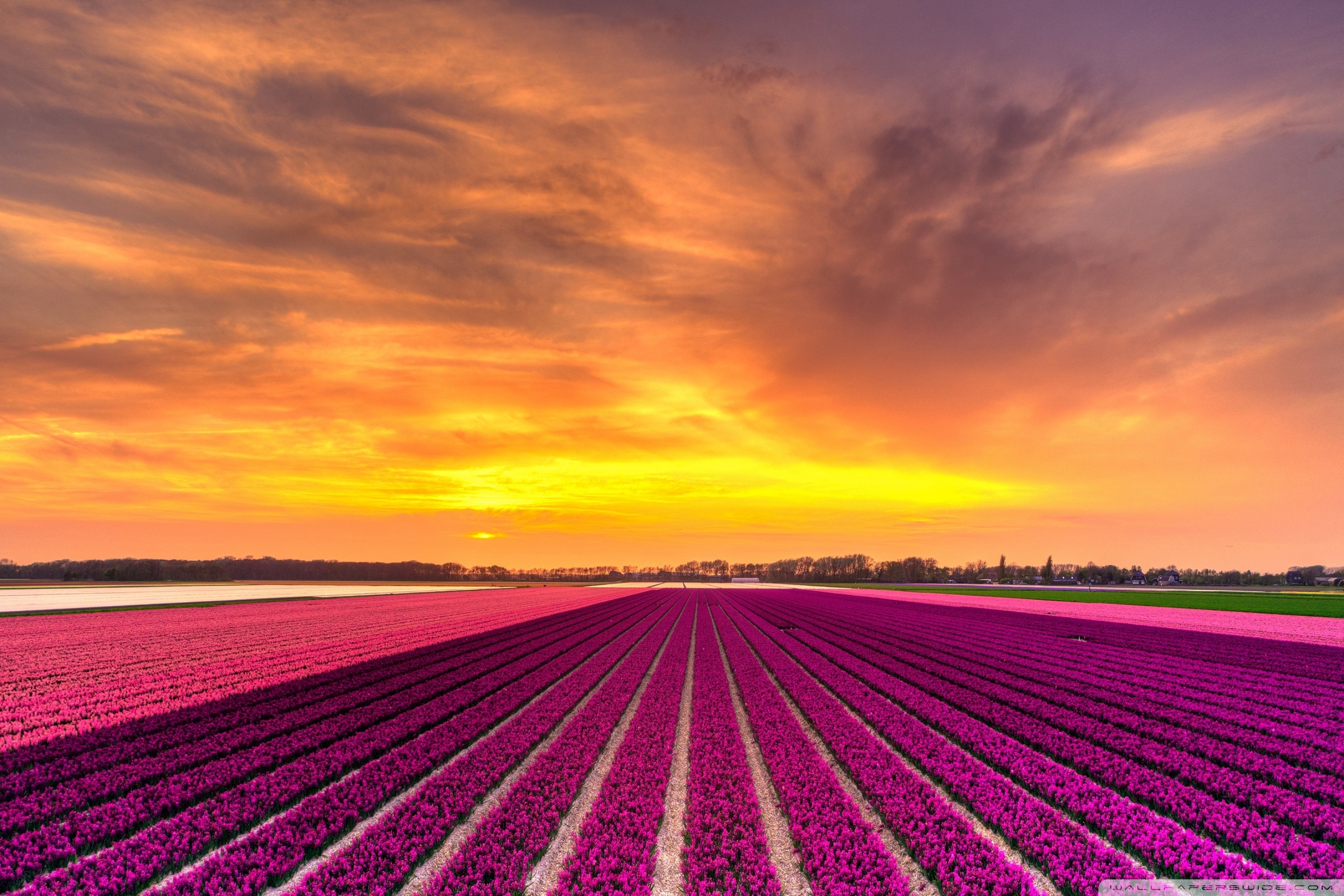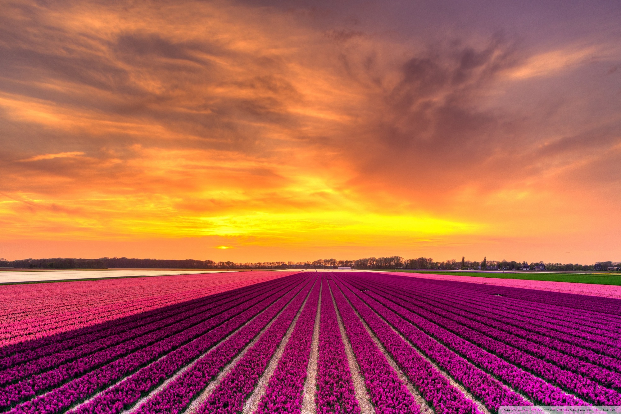 Download Orange Sky Over Flower Field 4K UHD Wallpaper