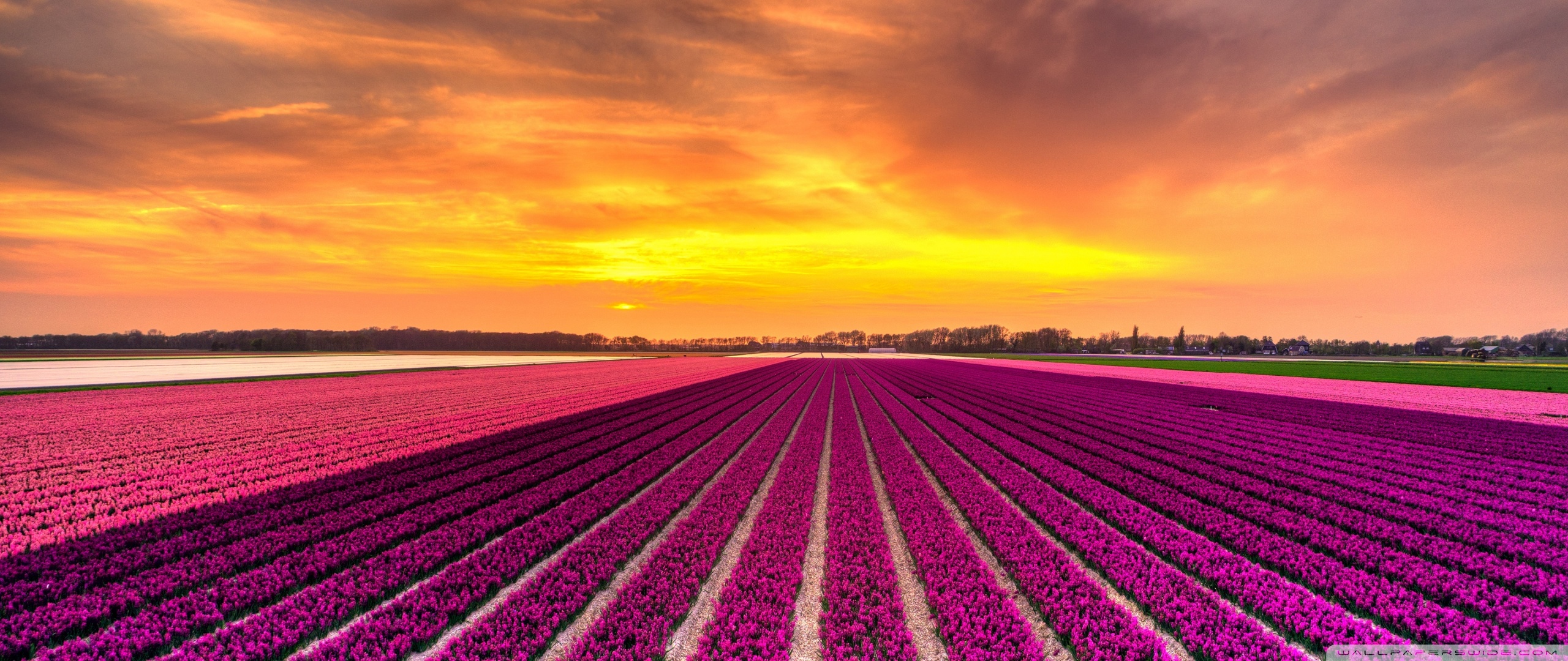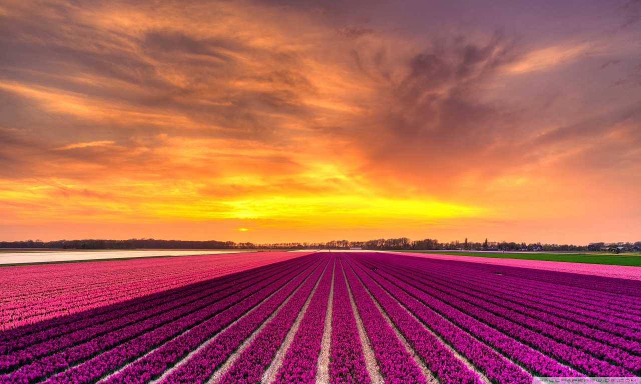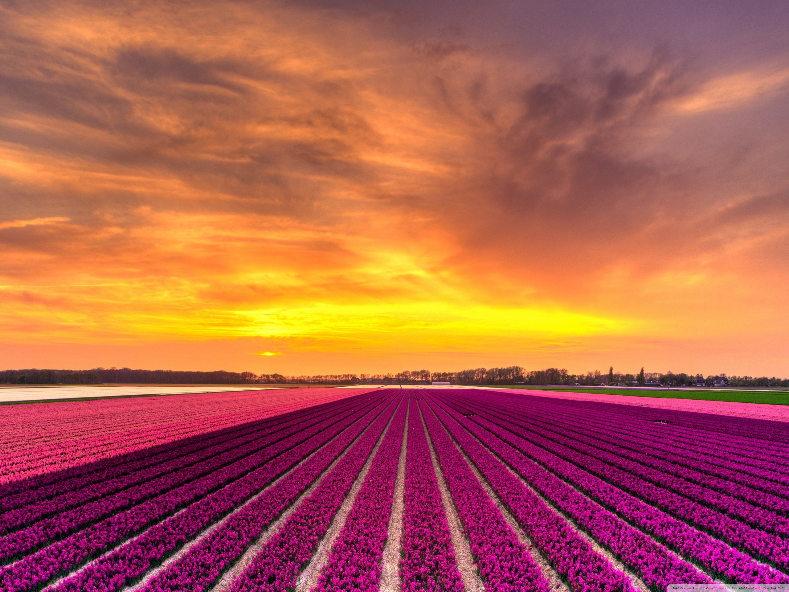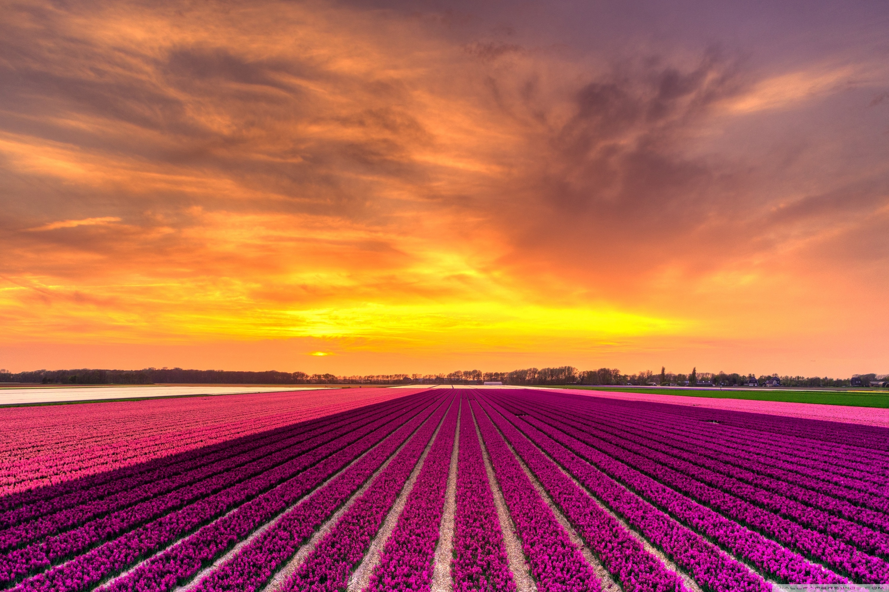 Download Orange Sky Over Flower Field 4K UHD Wallpaper