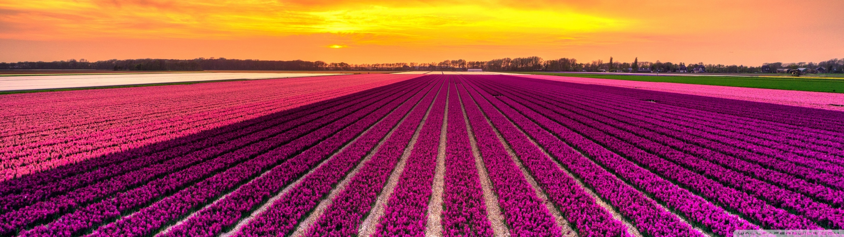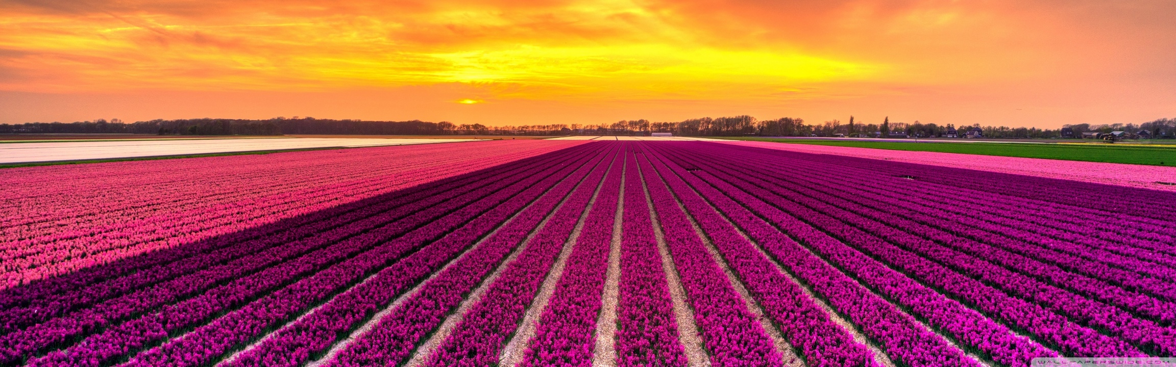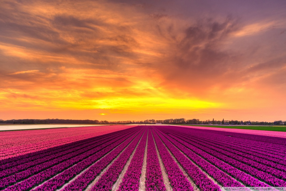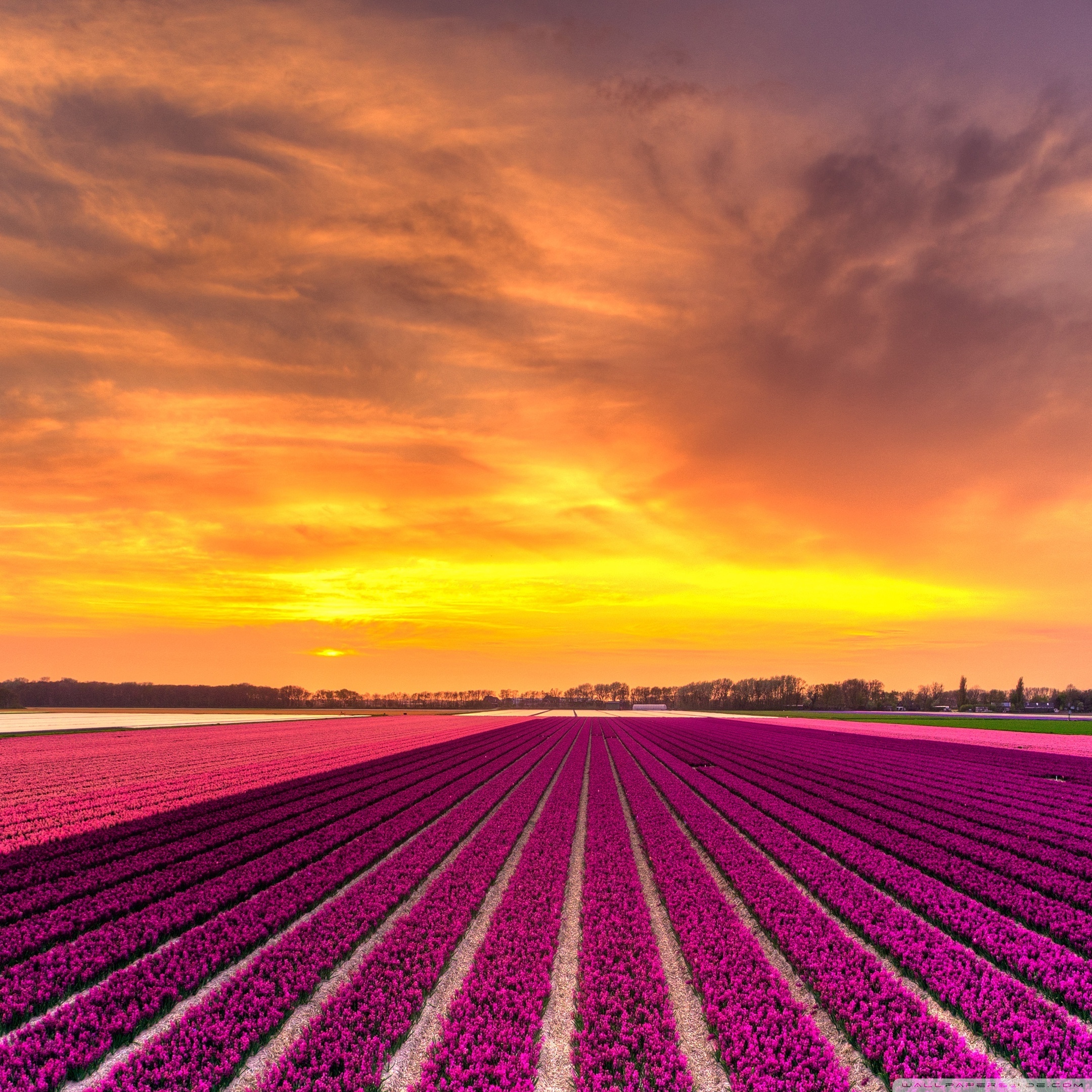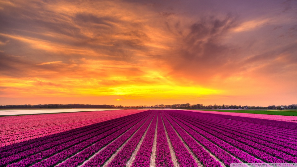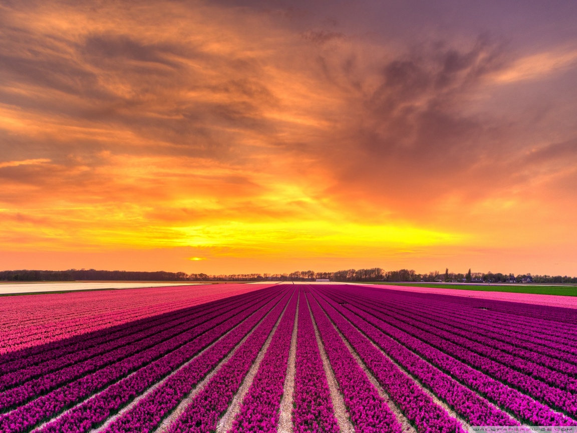 Download Orange Sky Over Flower Field 4K UHD Wallpaper