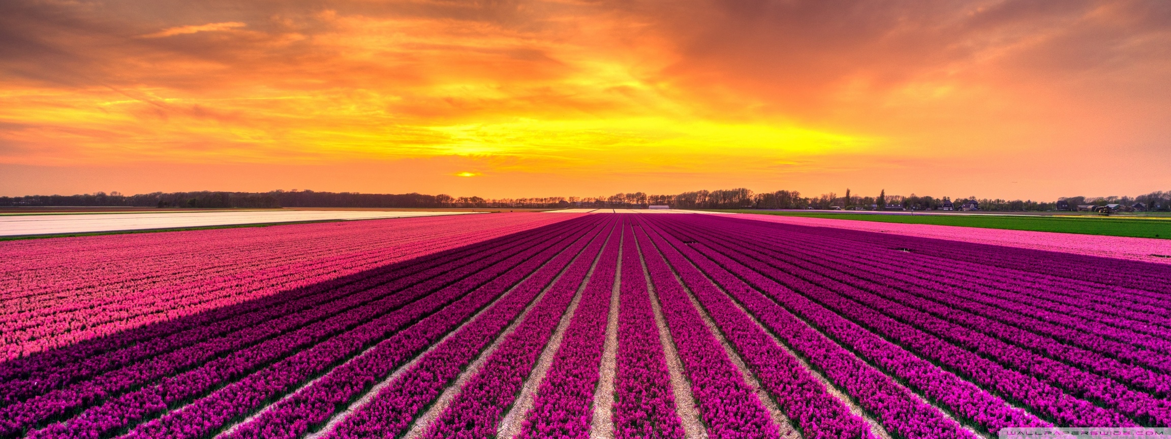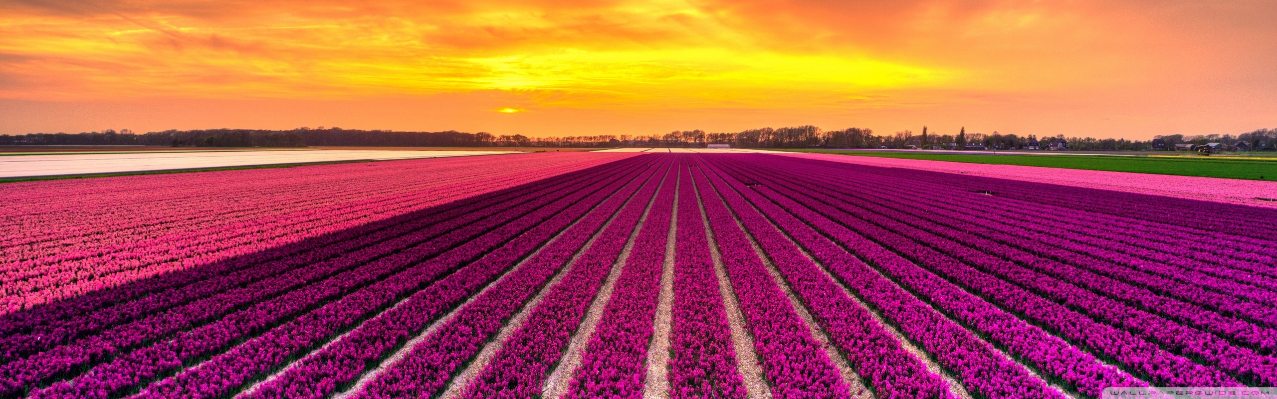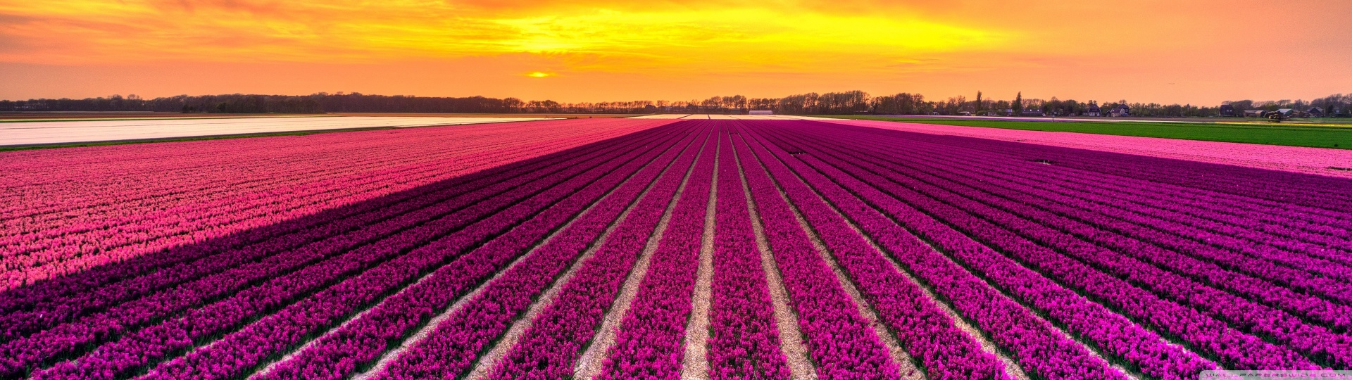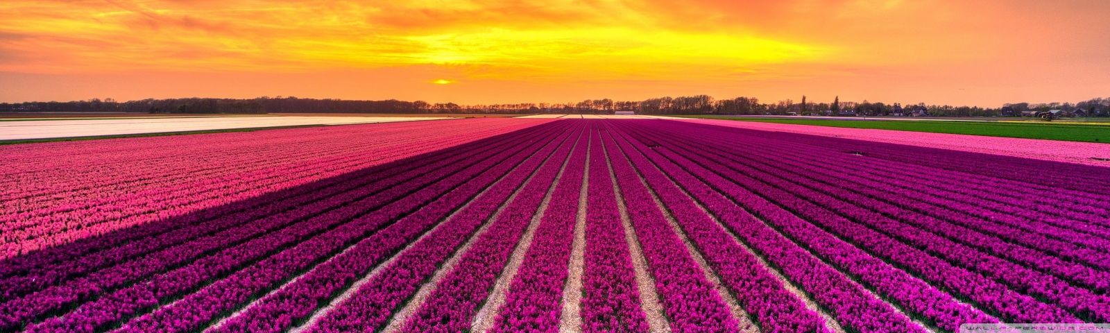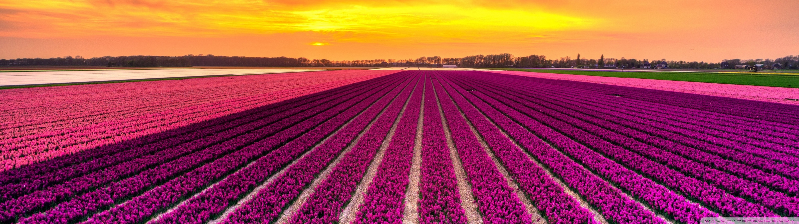 Download Orange Sky Over Flower Field 4K UHD Wallpaper