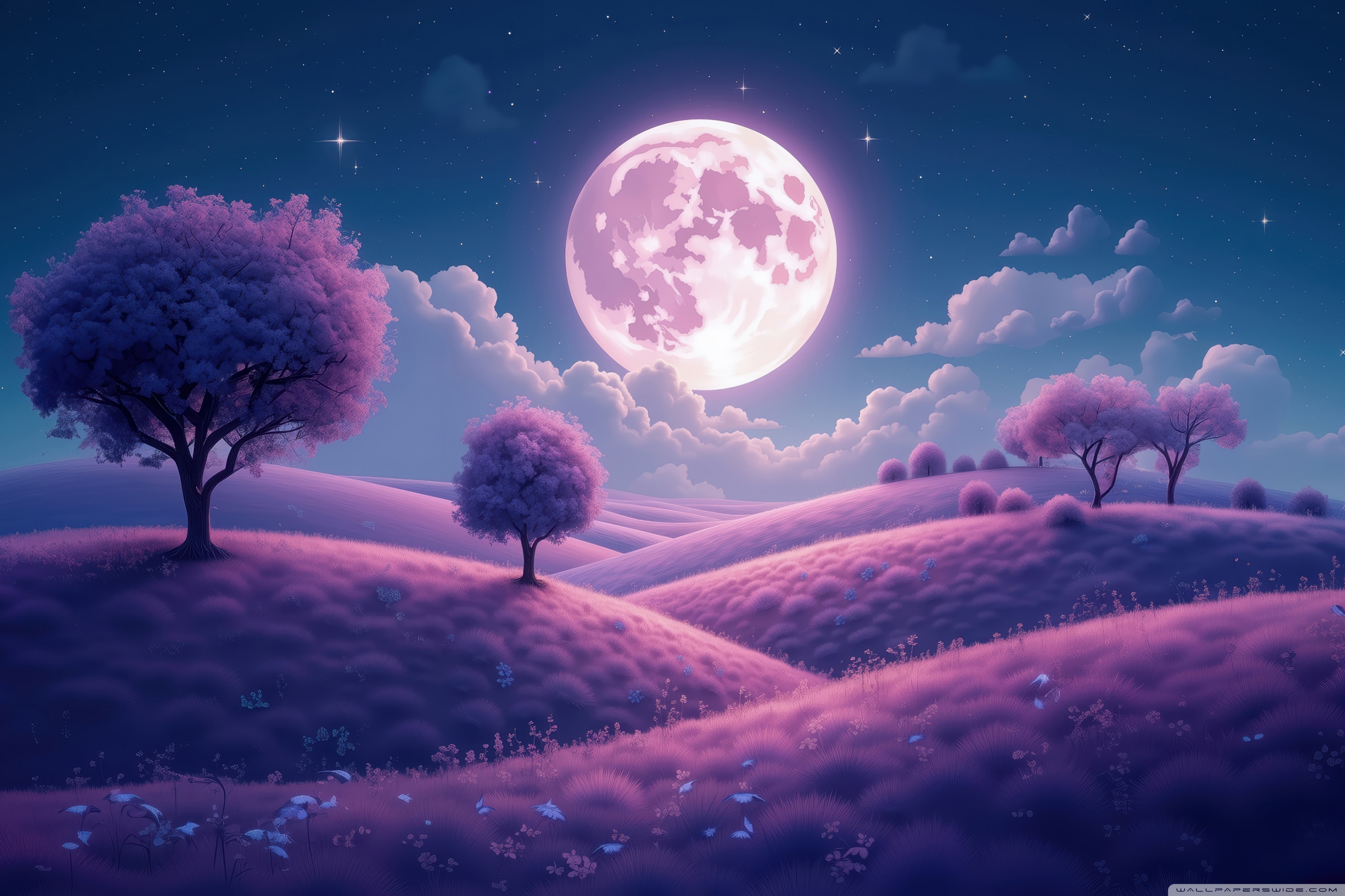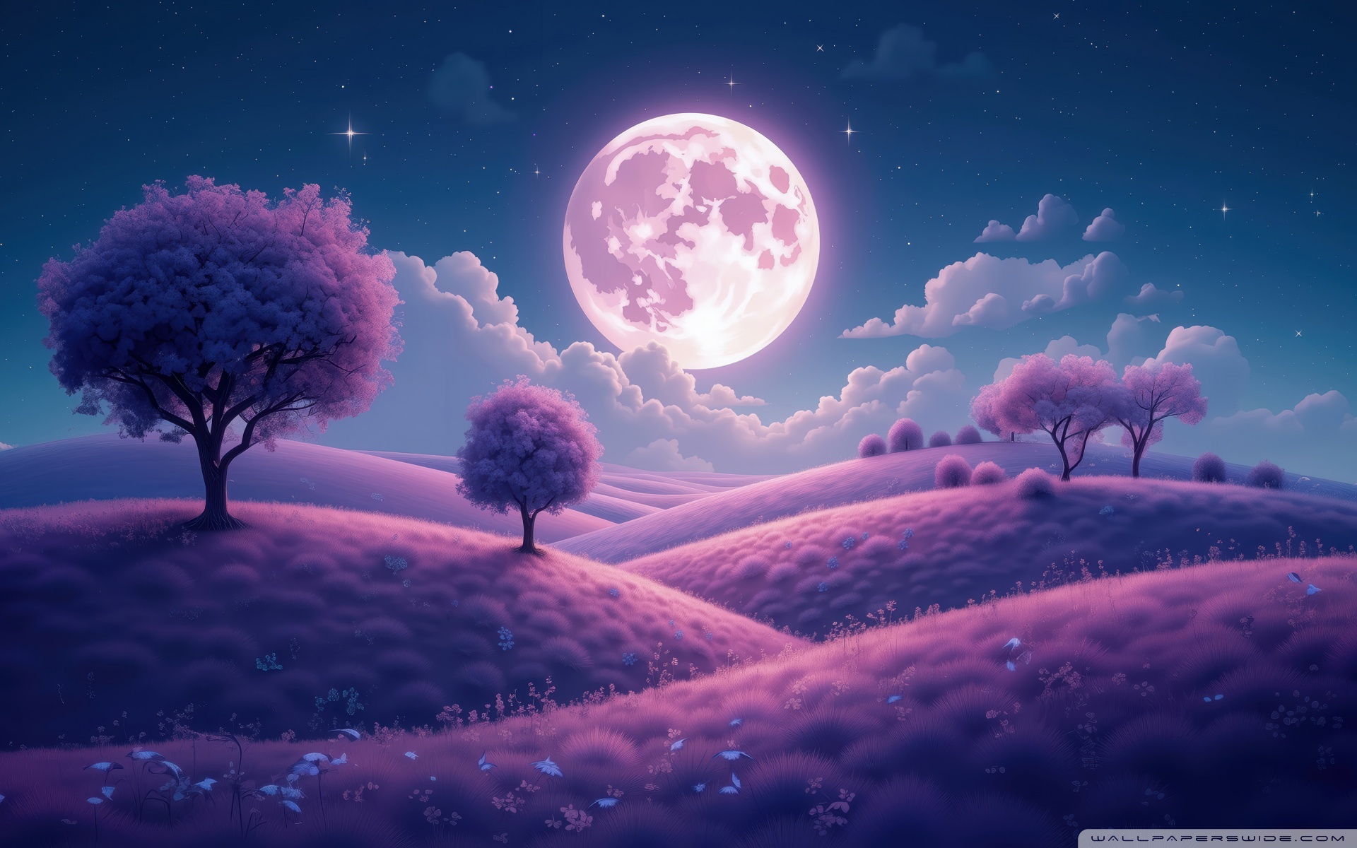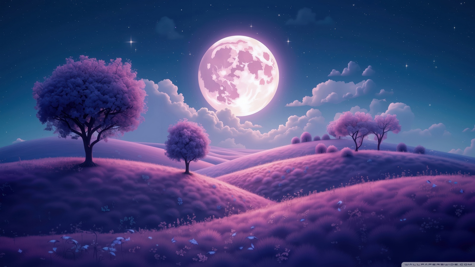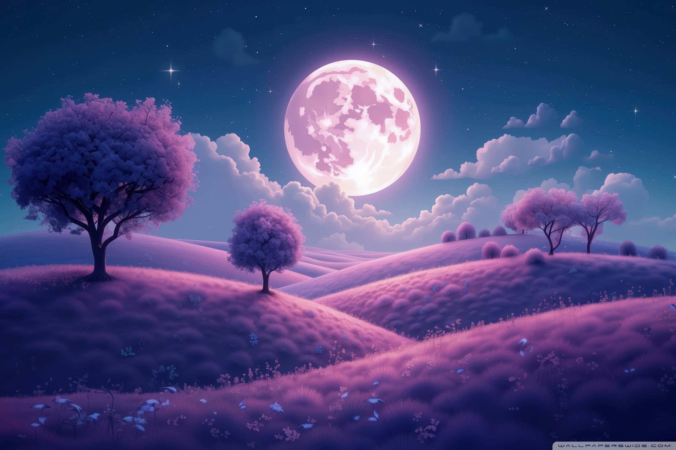 Download Purple Hills, Full Moon, Night, Landscape 4K UHD Wallpaper