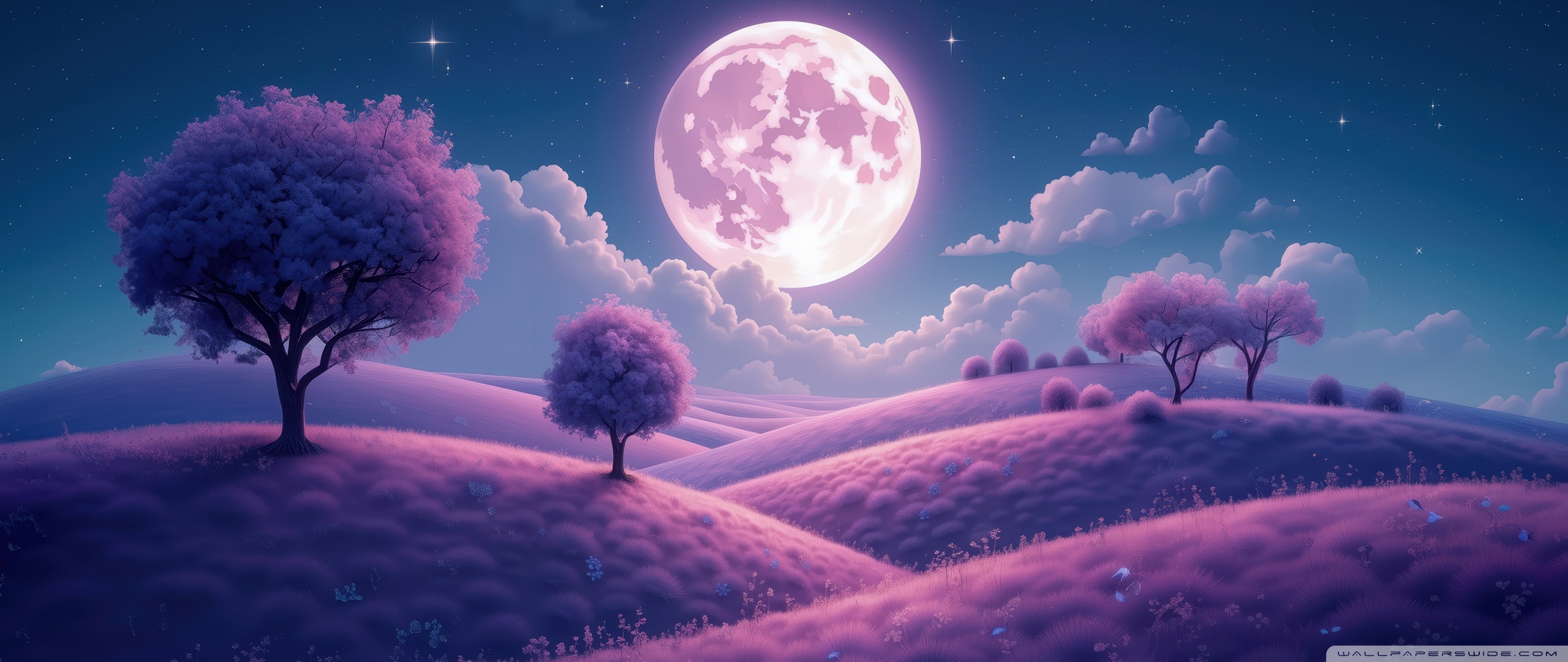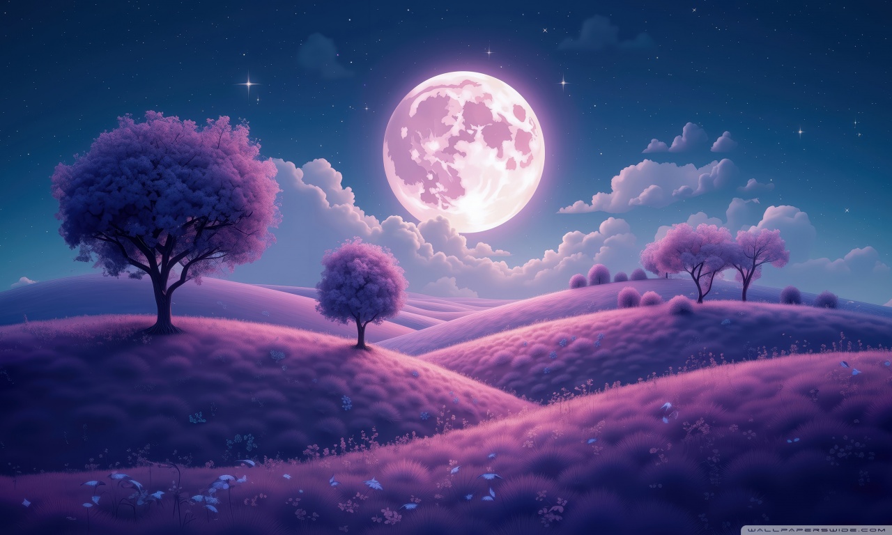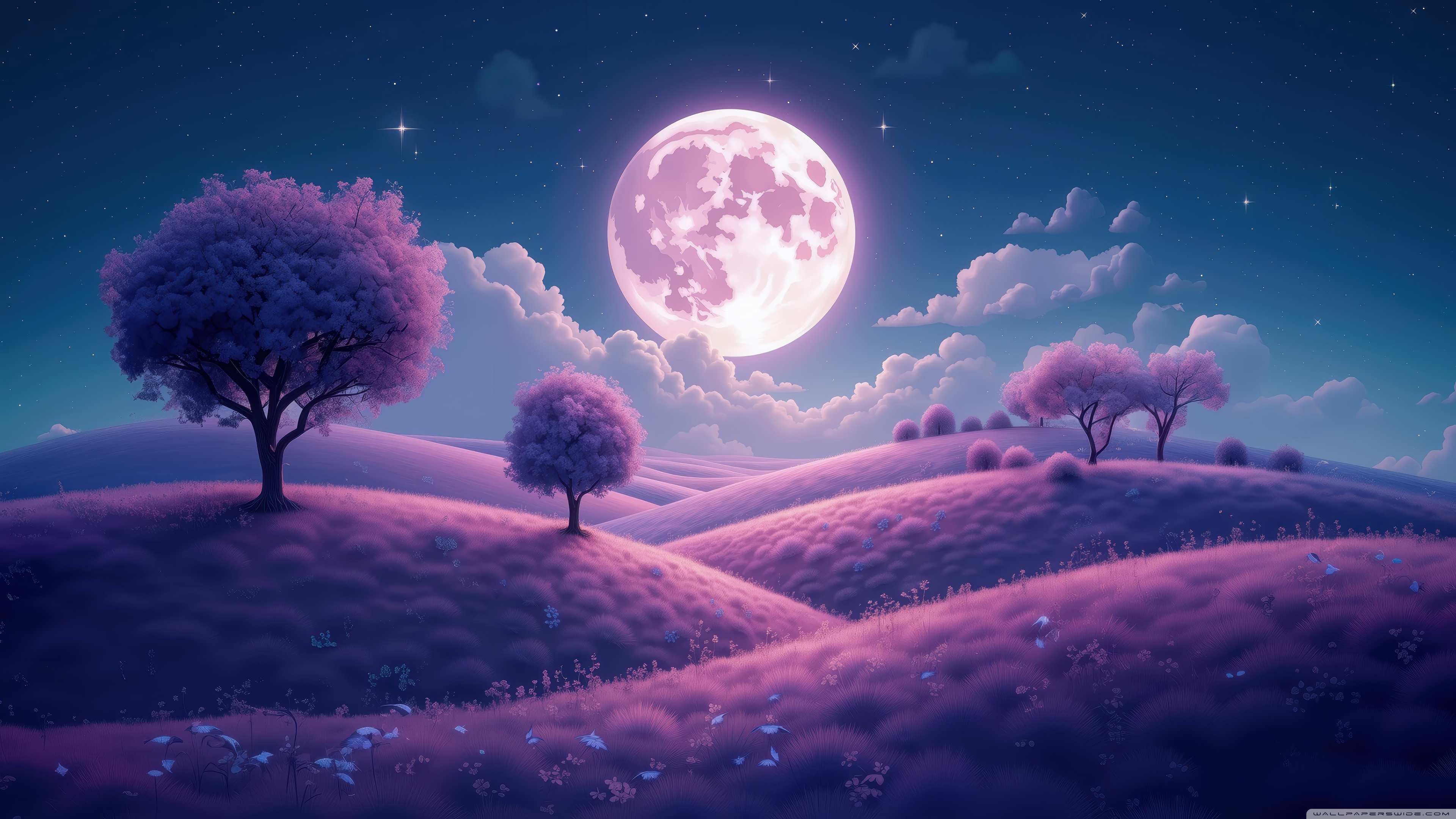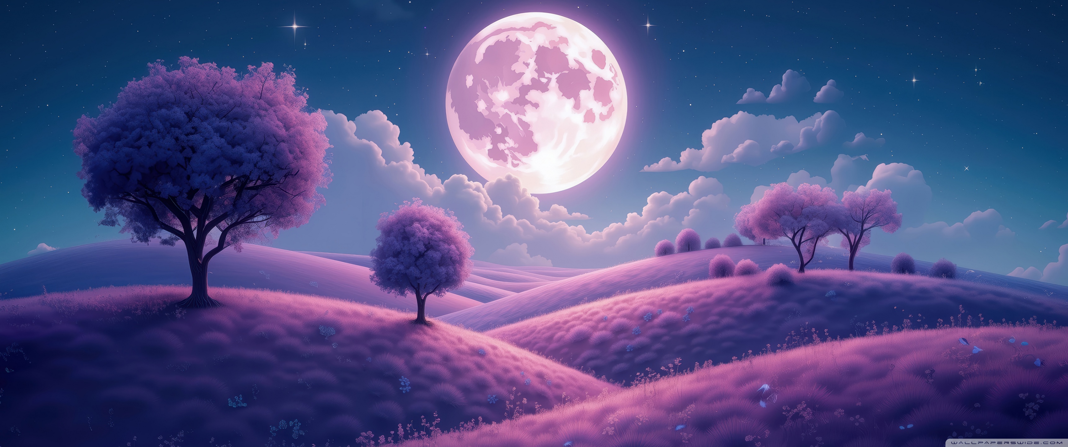 Download Purple Hills, Full Moon, Night, Landscape 4K UHD Wallpaper