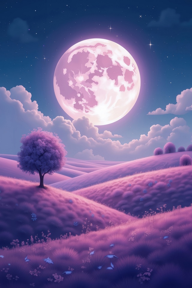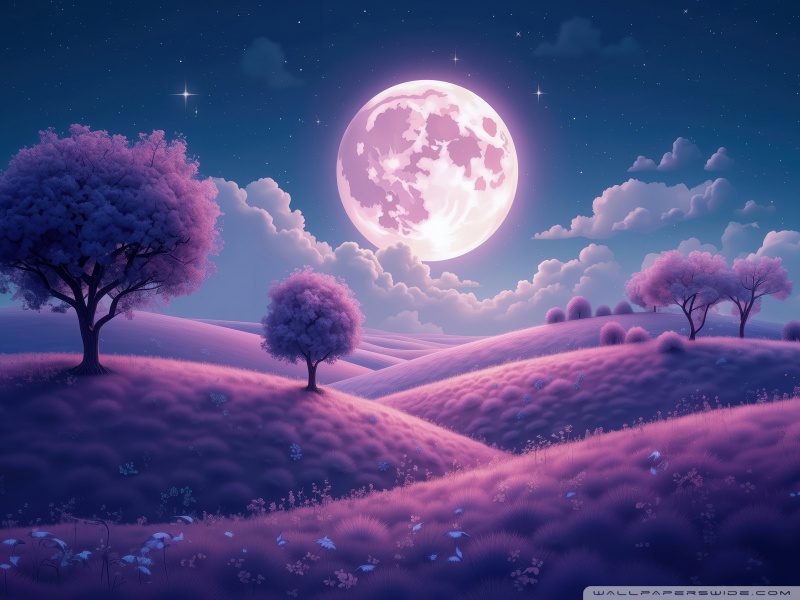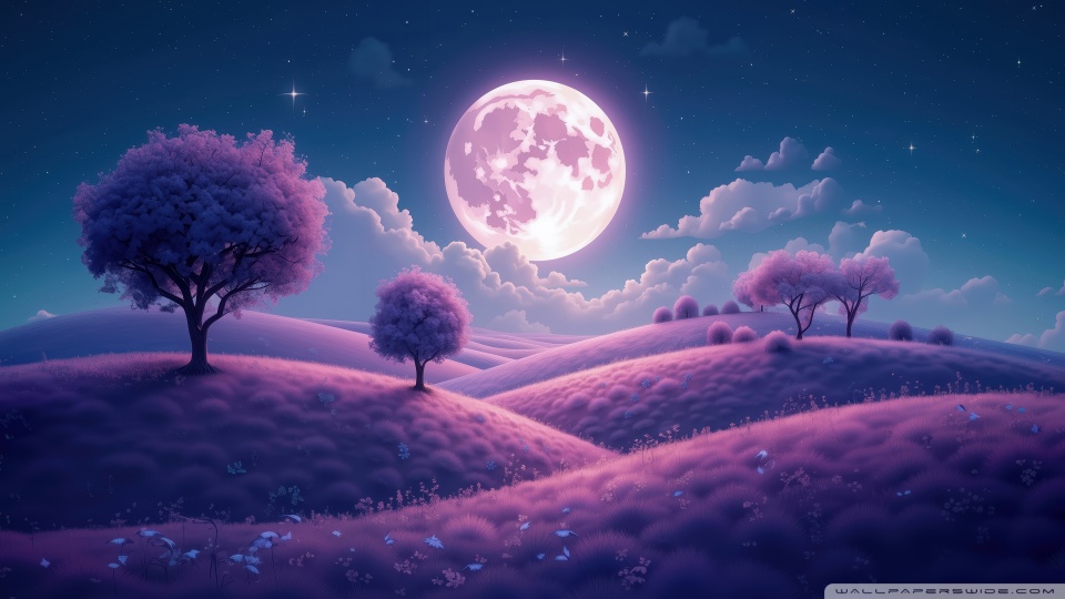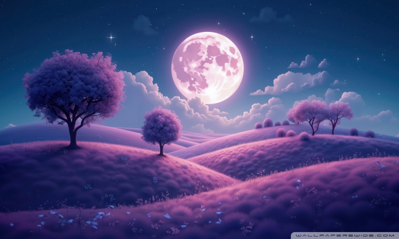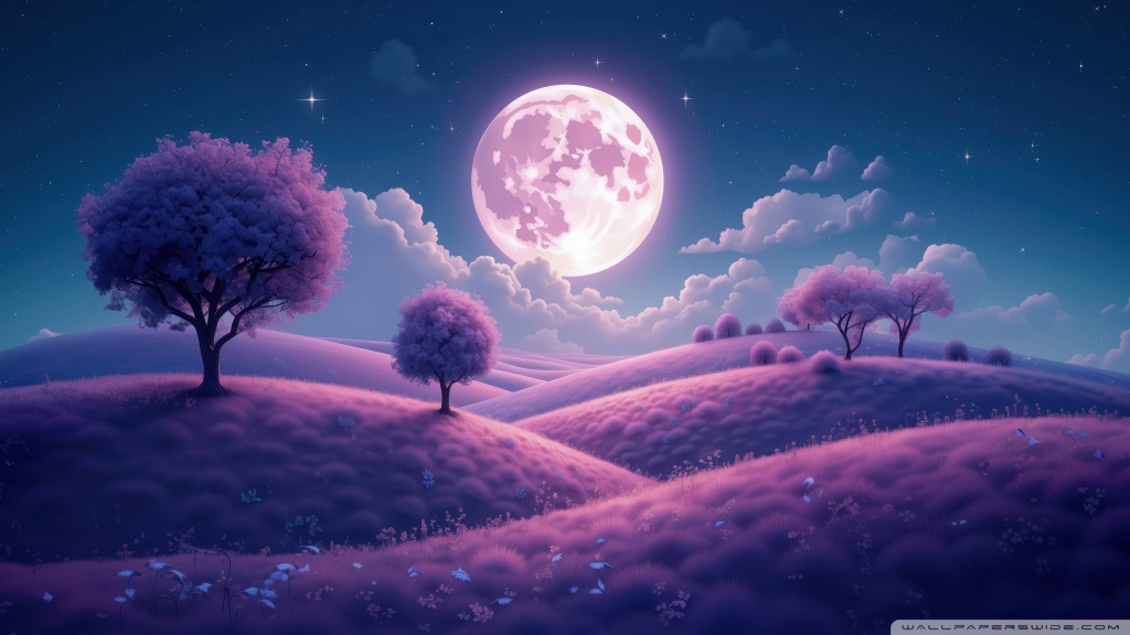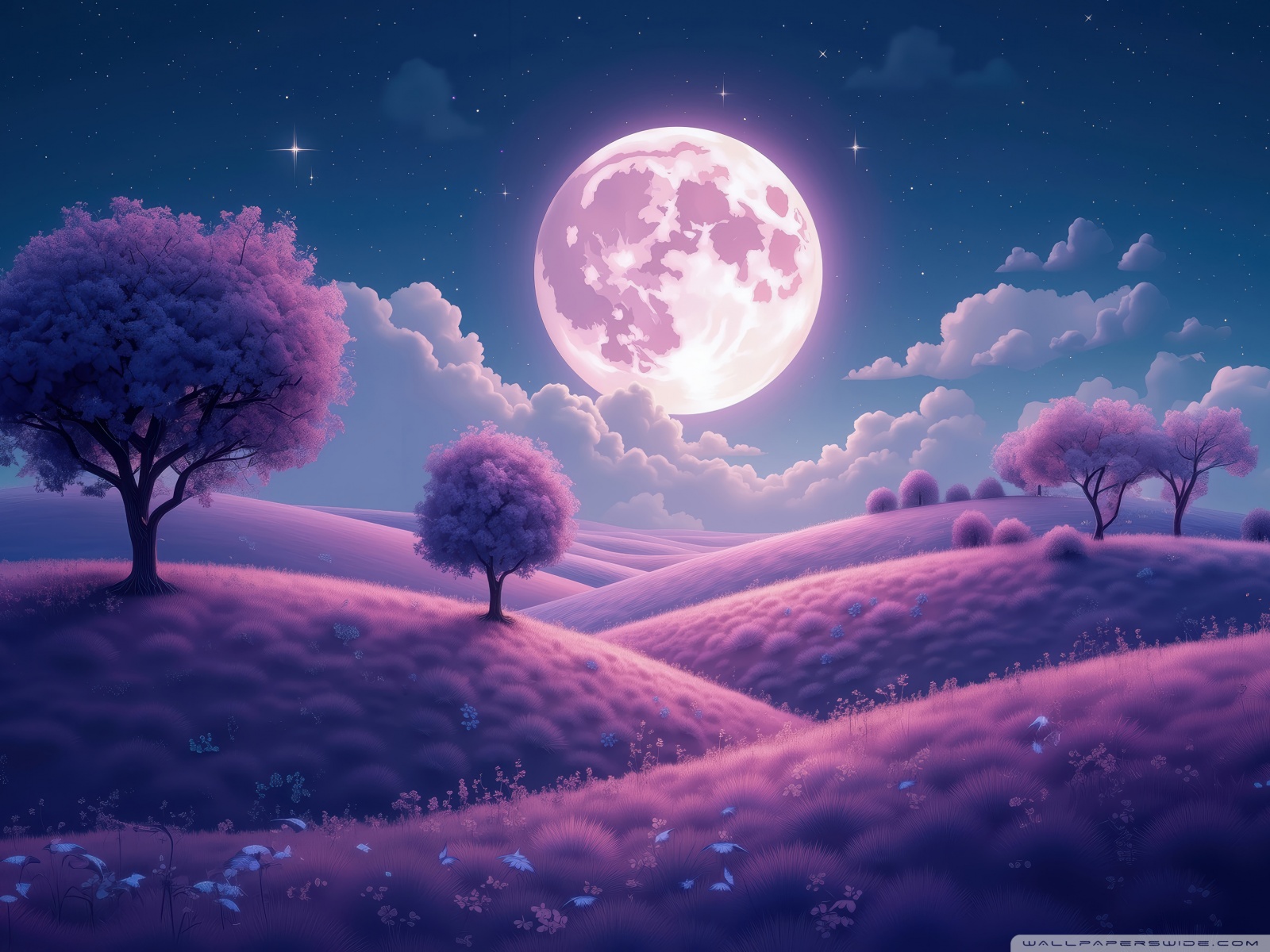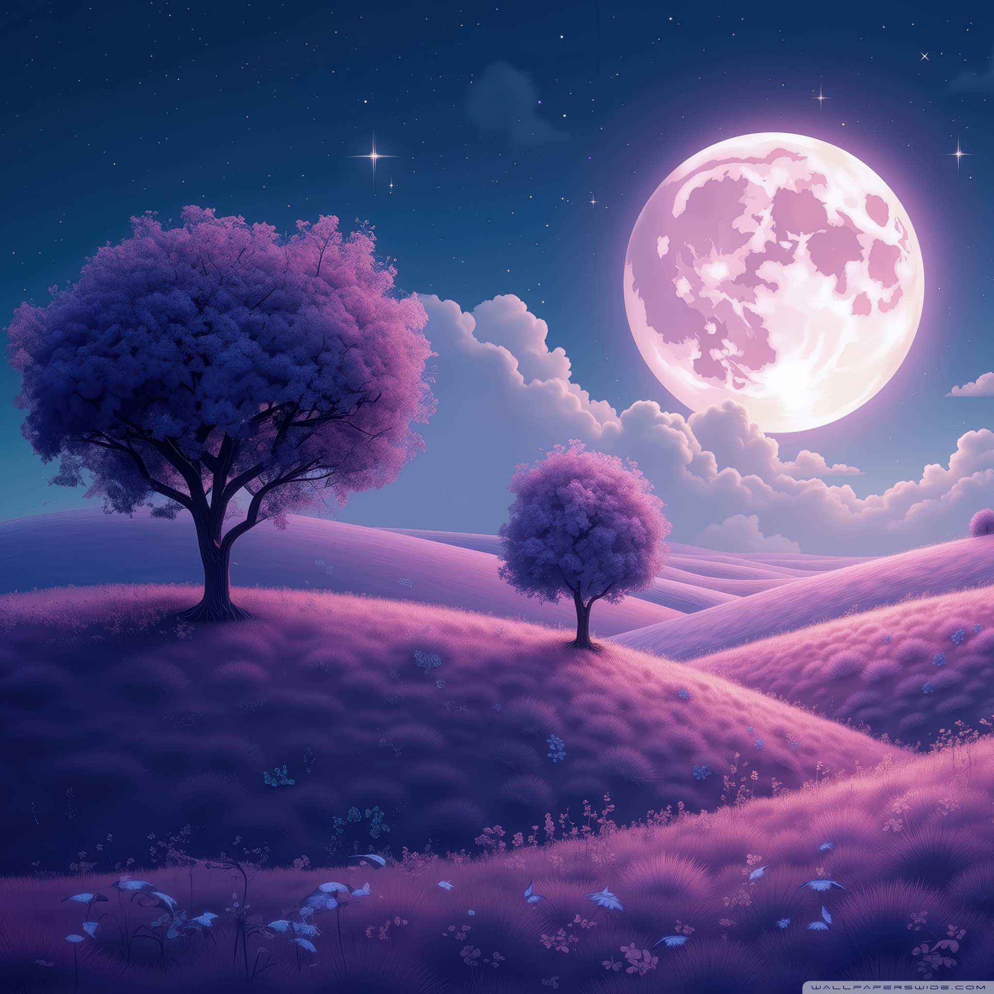 Download Purple Hills, Full Moon, Night, Landscape 4K UHD Wallpaper