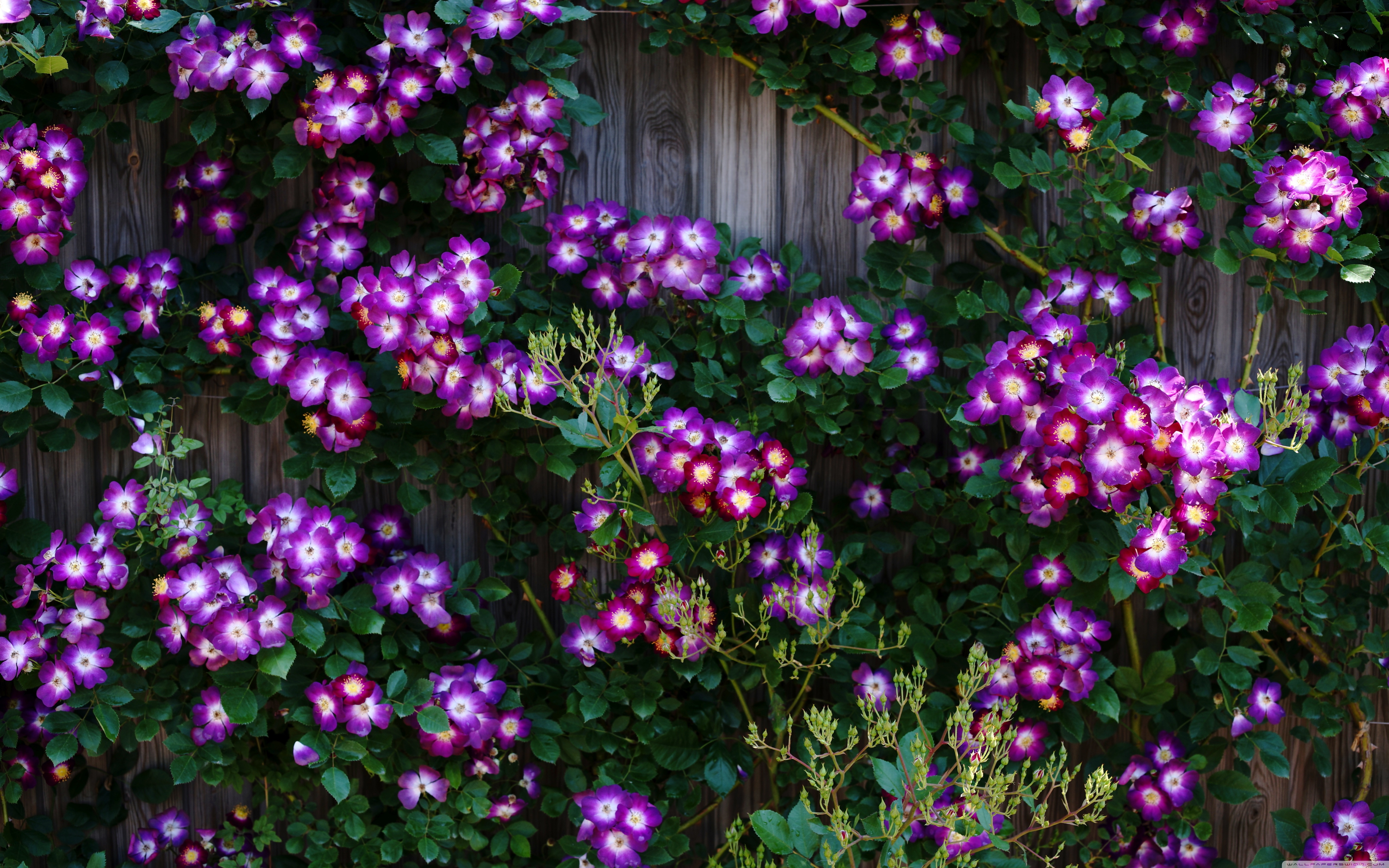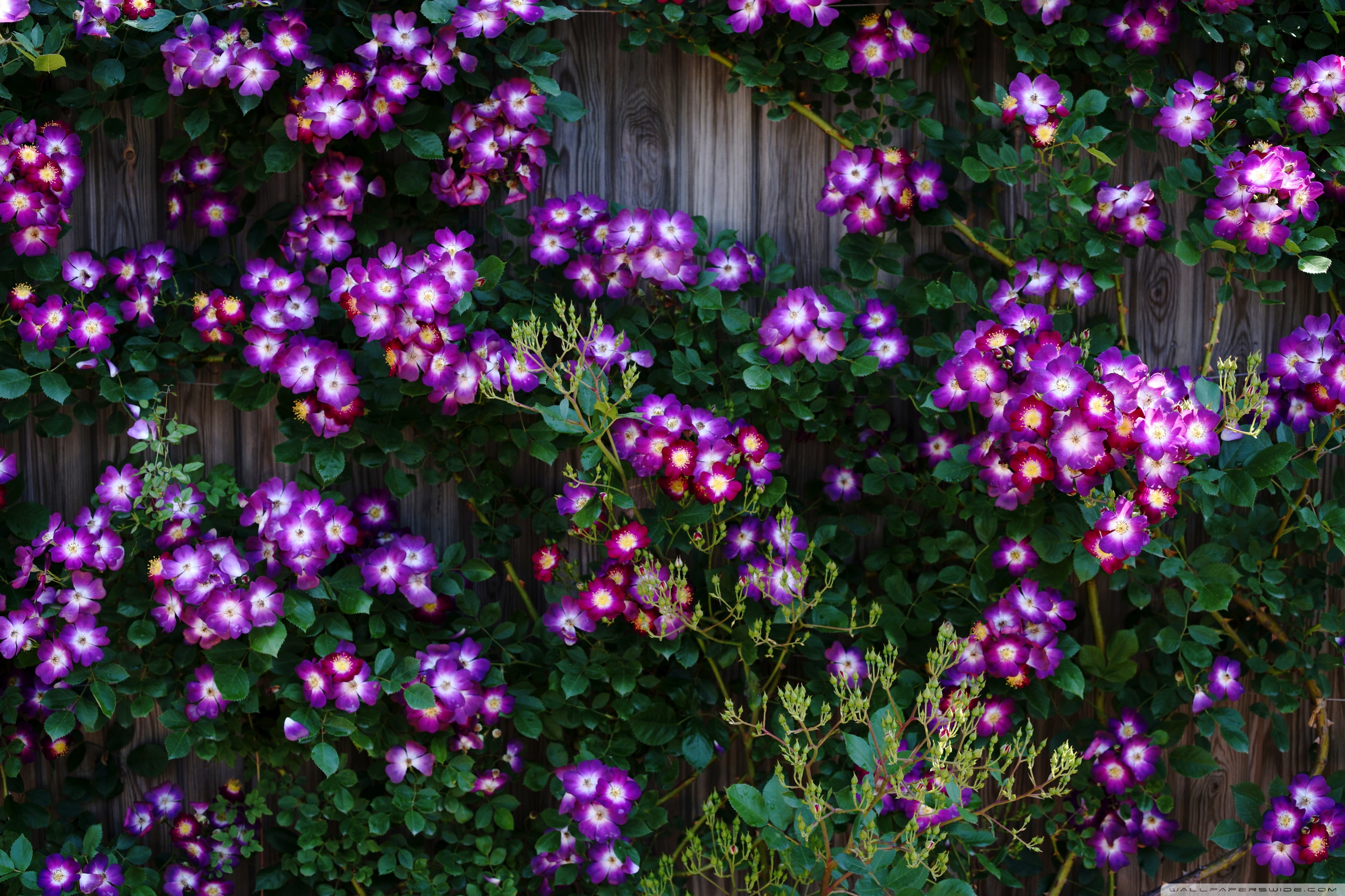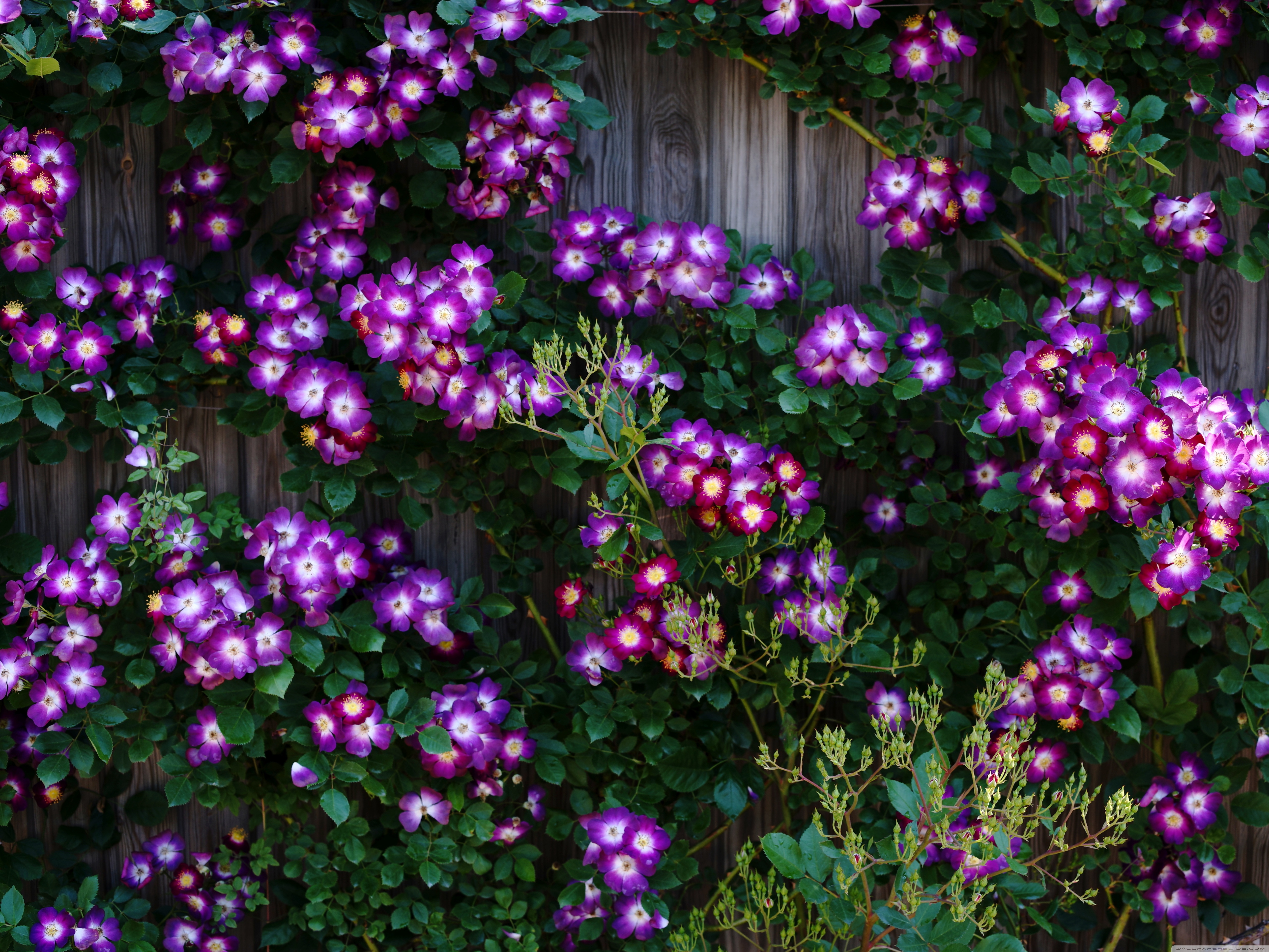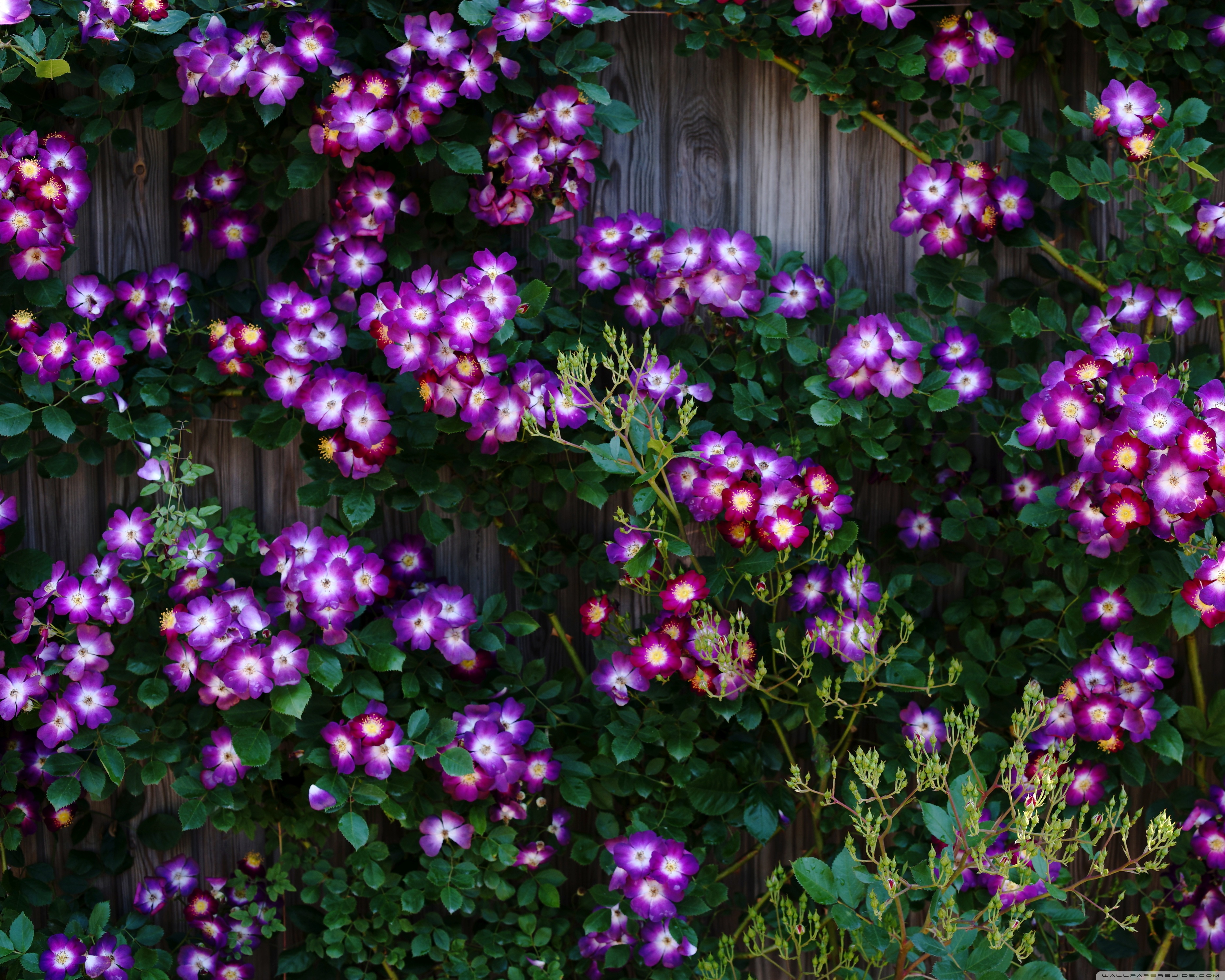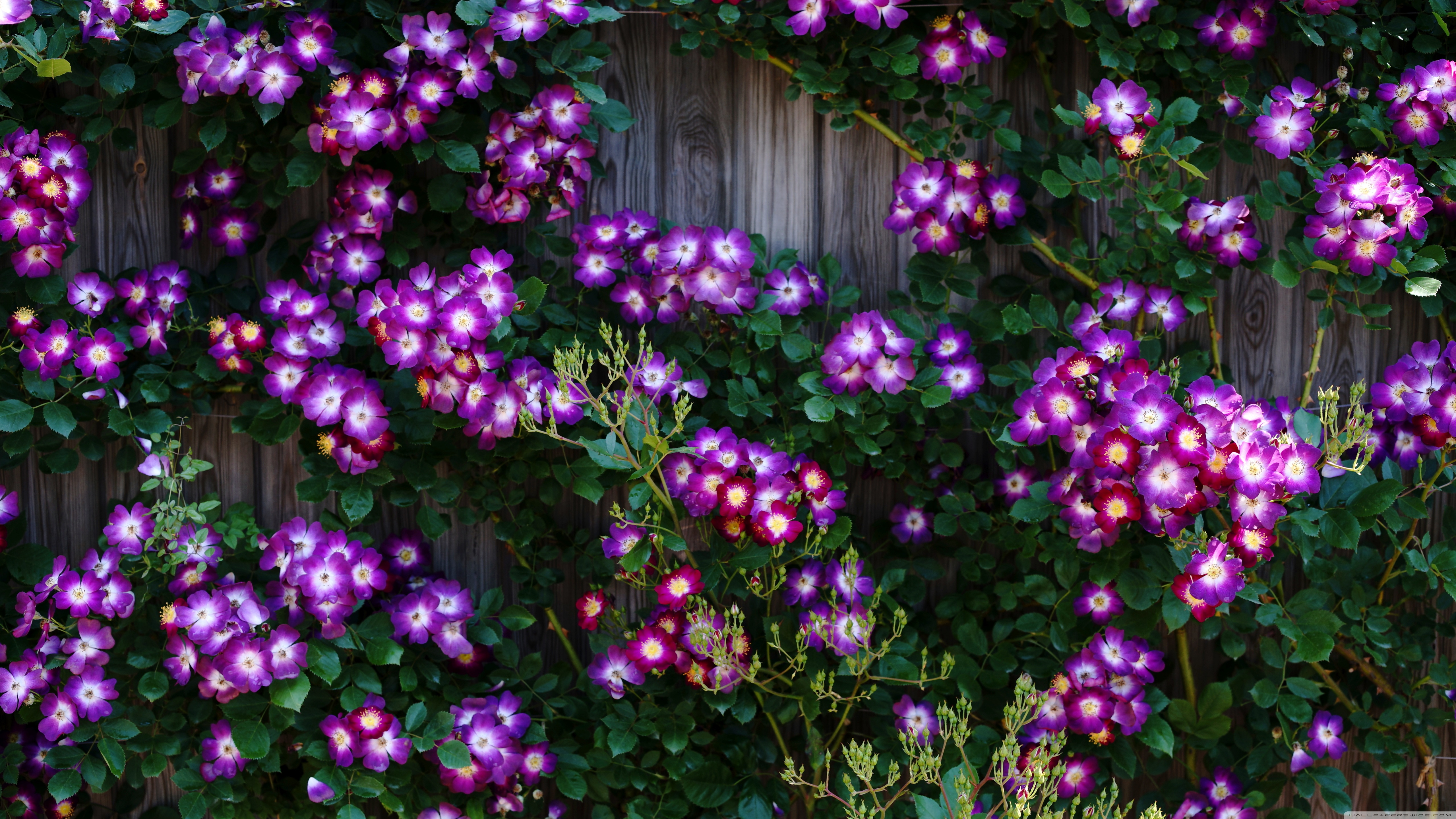 Download Purple Wild Rose Cluster Against Wooden Fence 4K UHD Wallpaper
