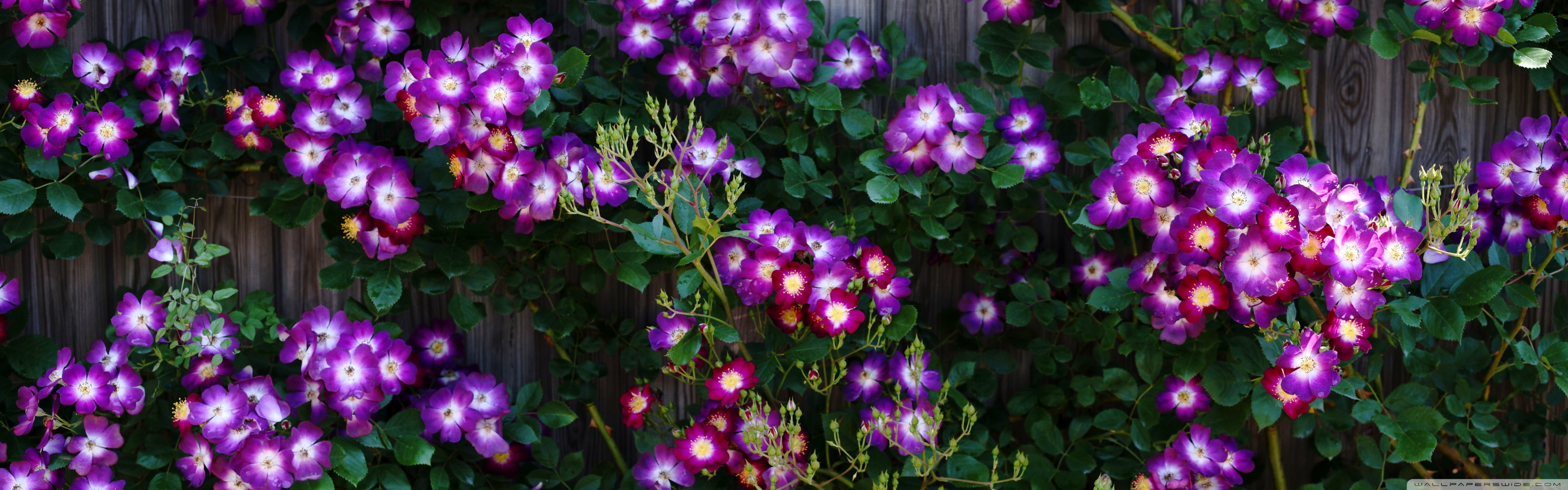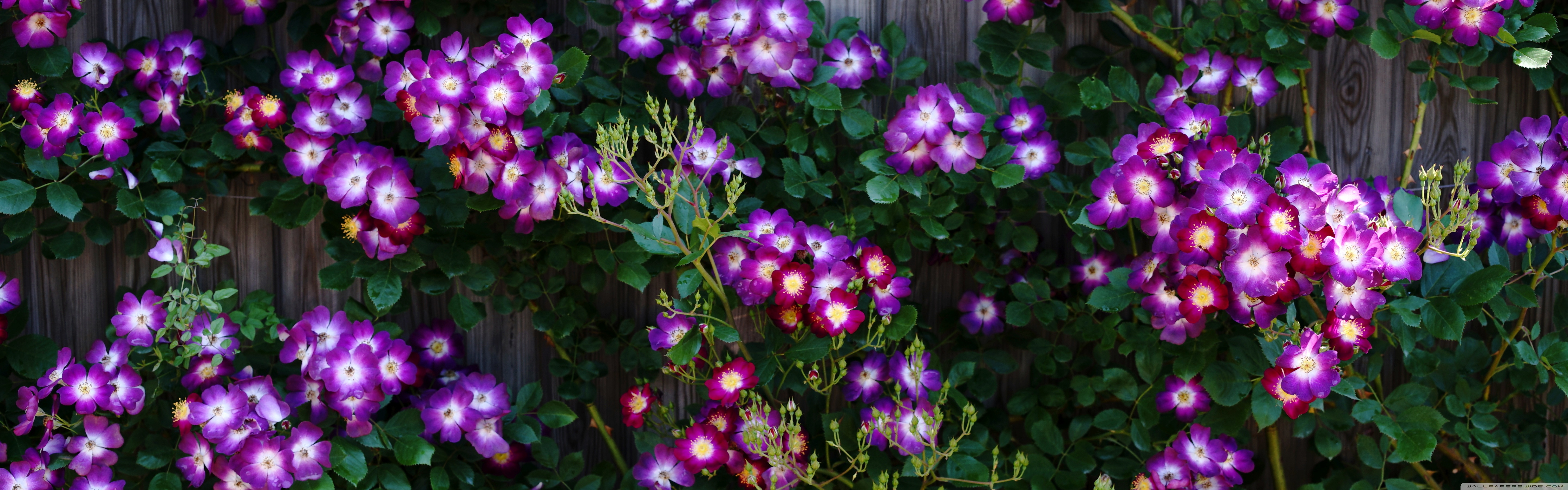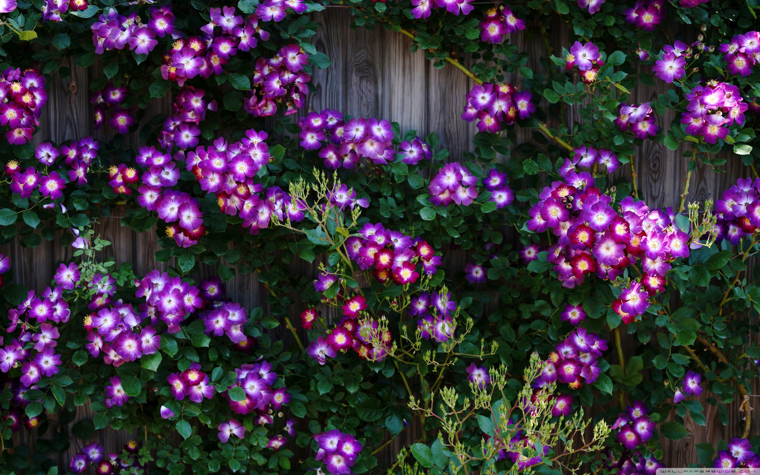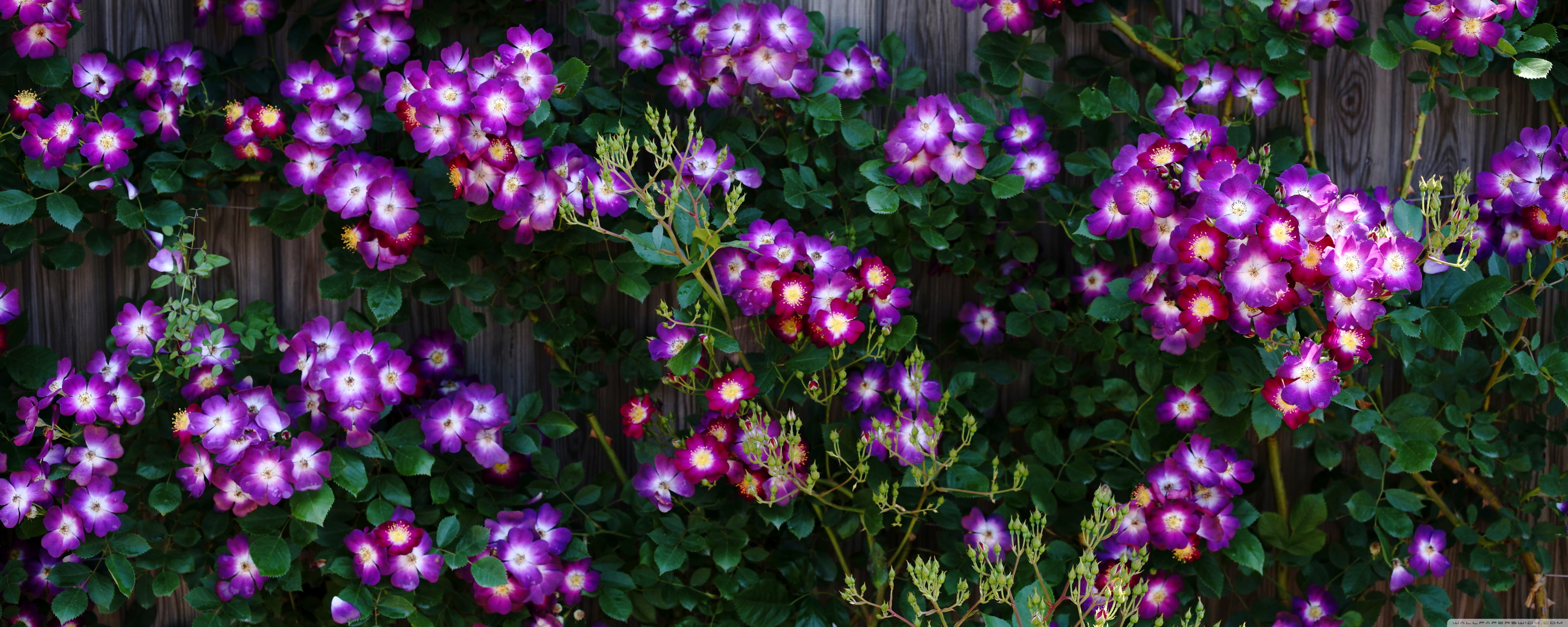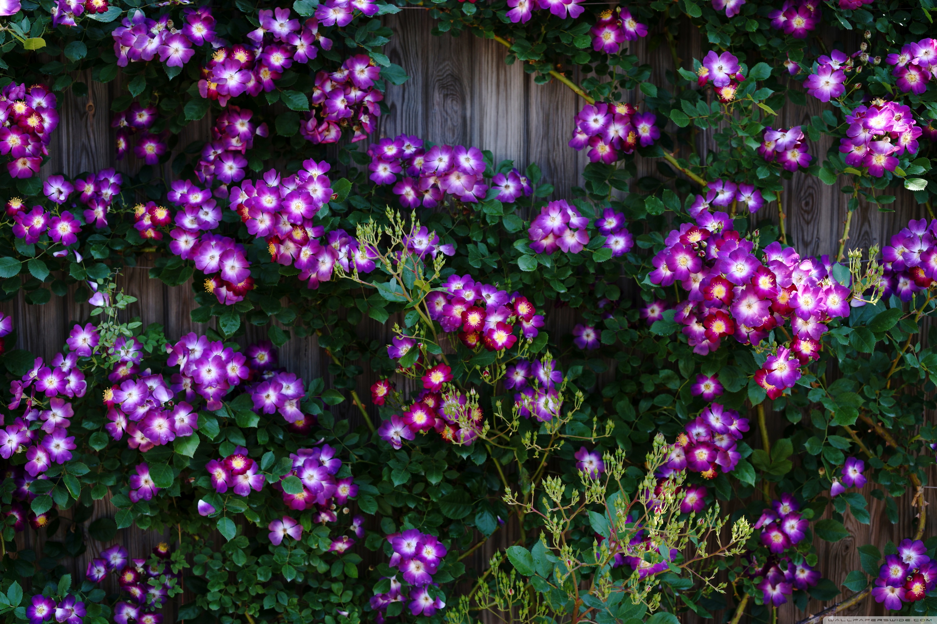 Download Purple Wild Rose Cluster Against Wooden Fence 4K UHD Wallpaper