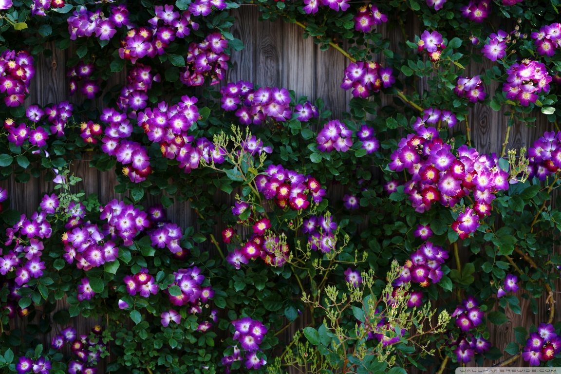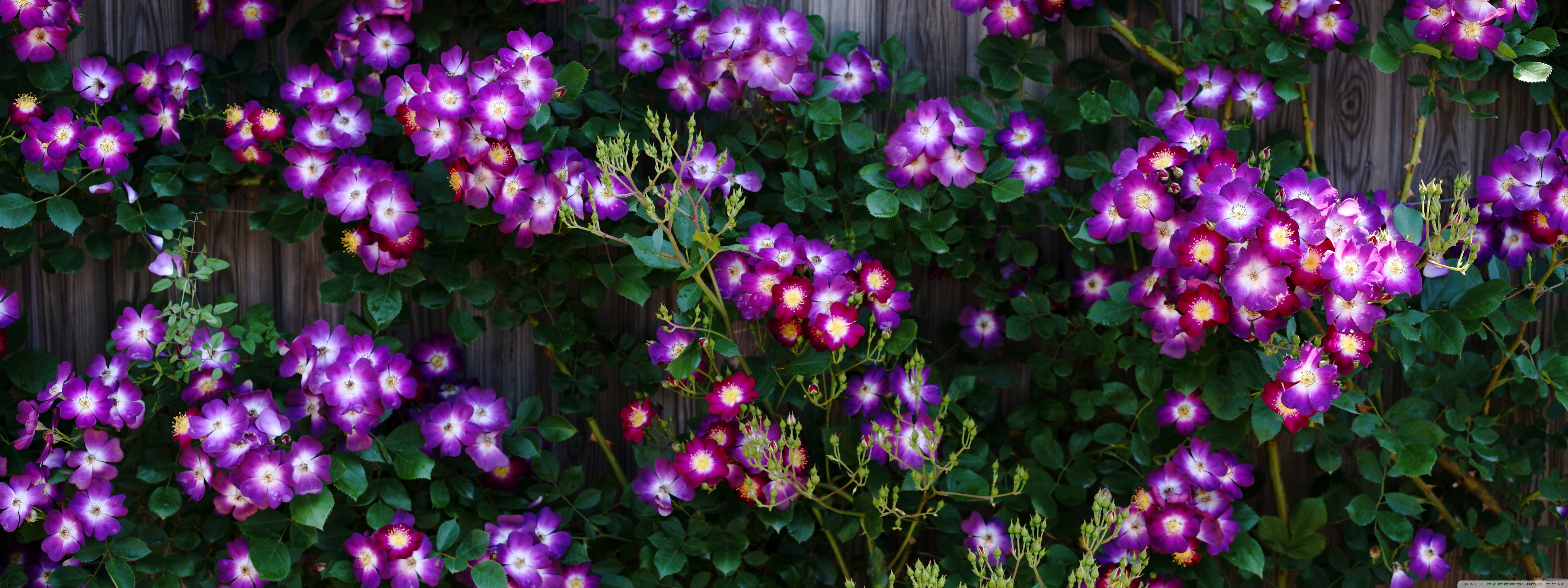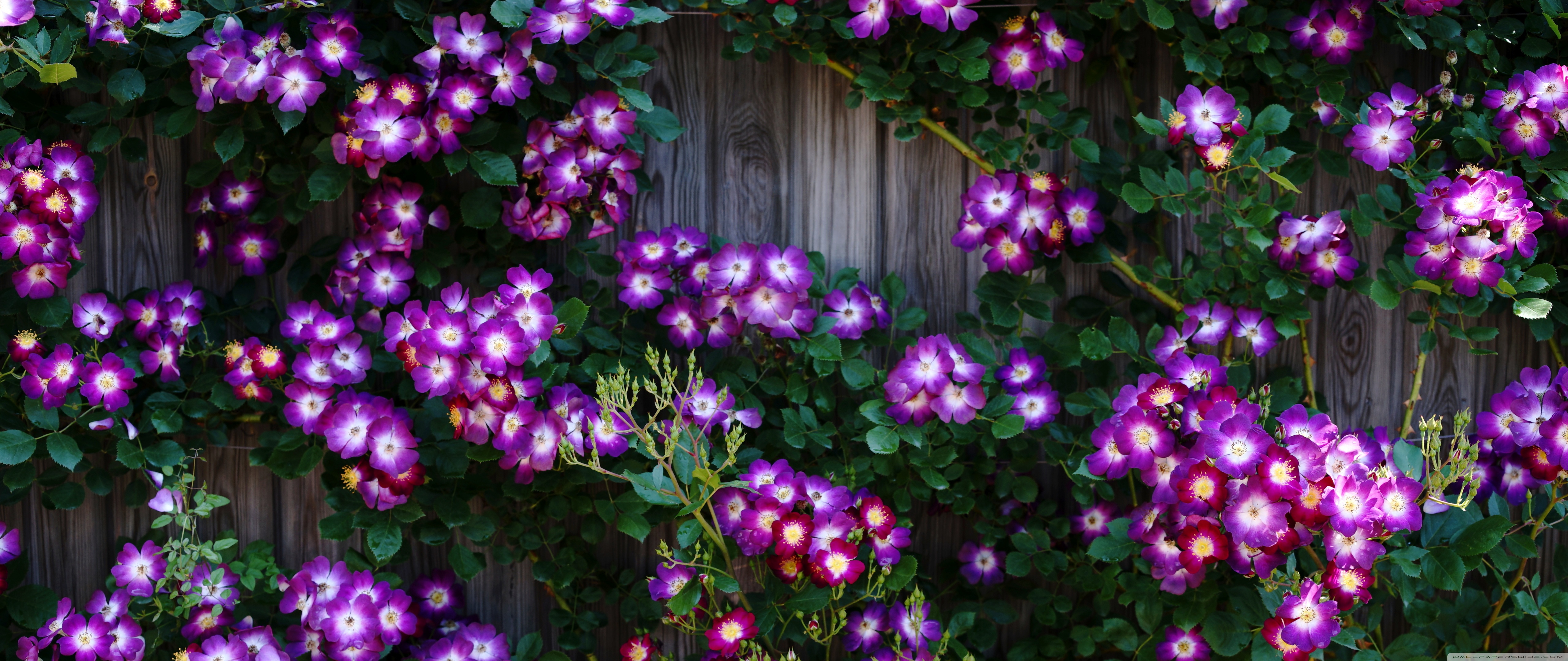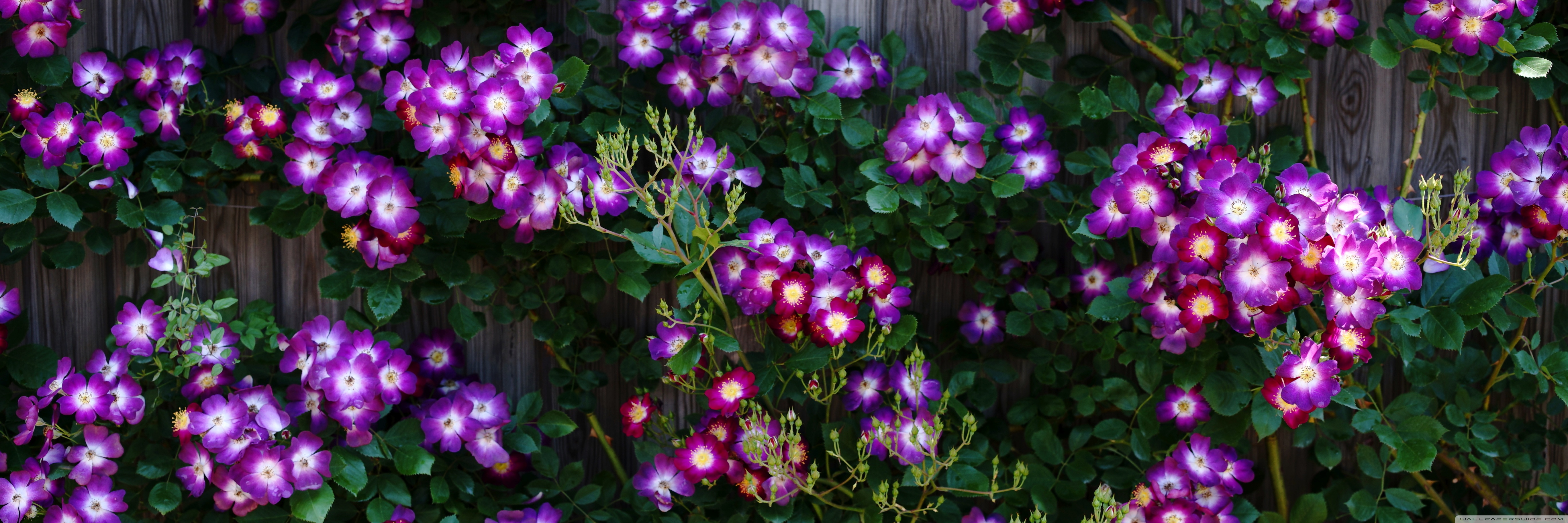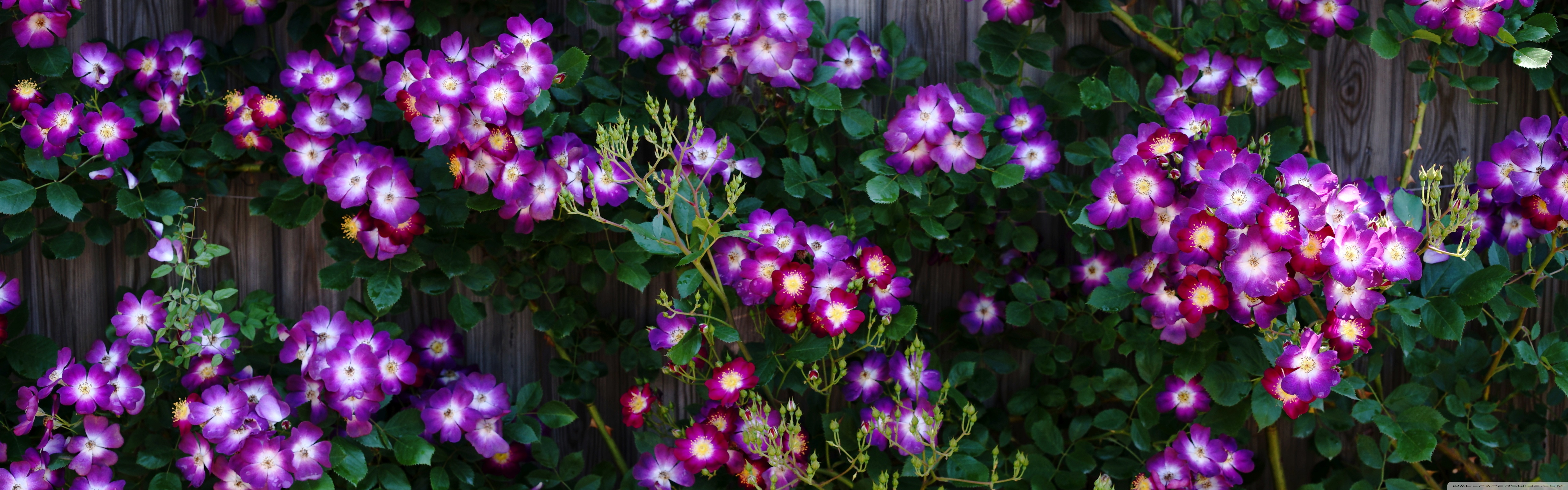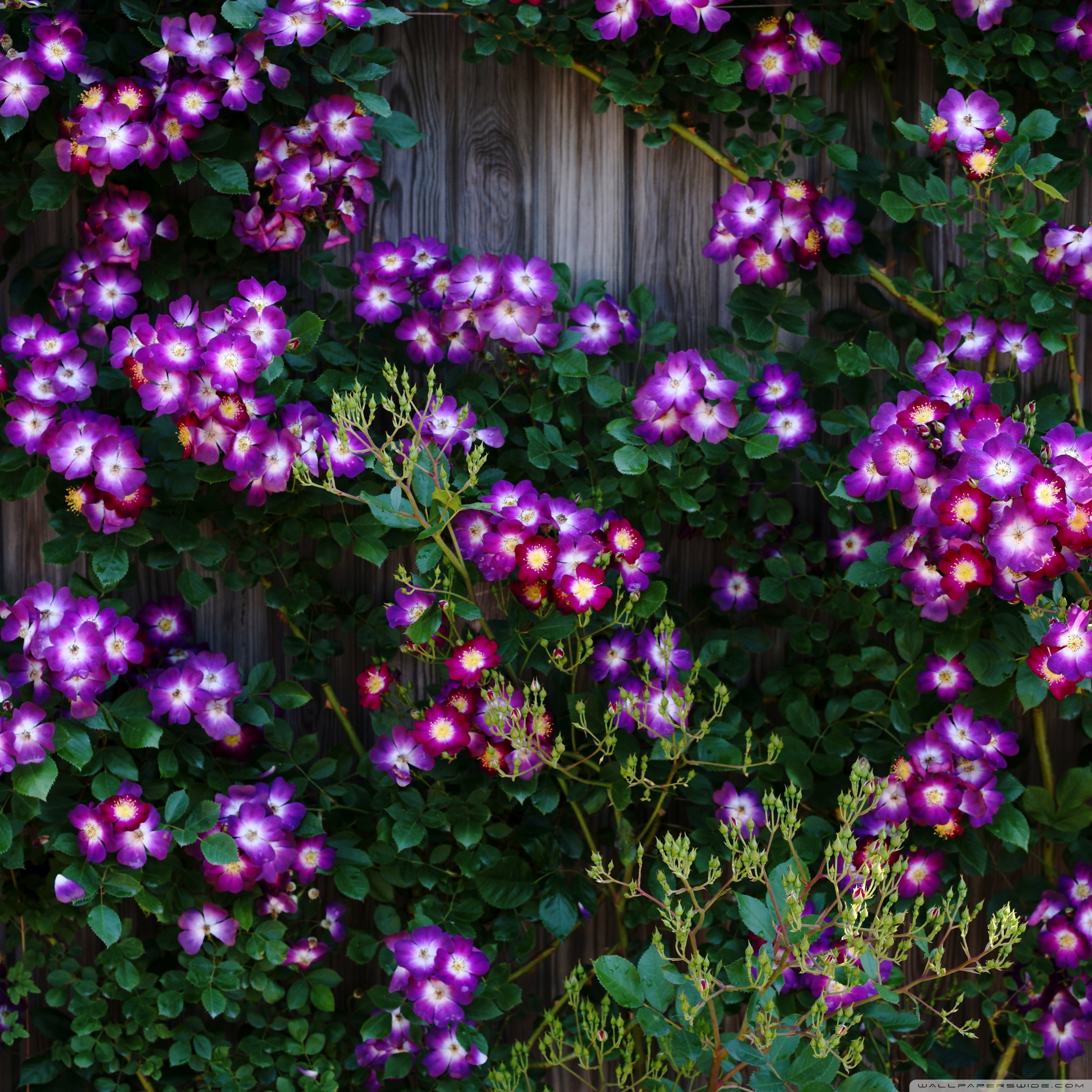 Download Purple Wild Rose Cluster Against Wooden Fence 4K UHD Wallpaper