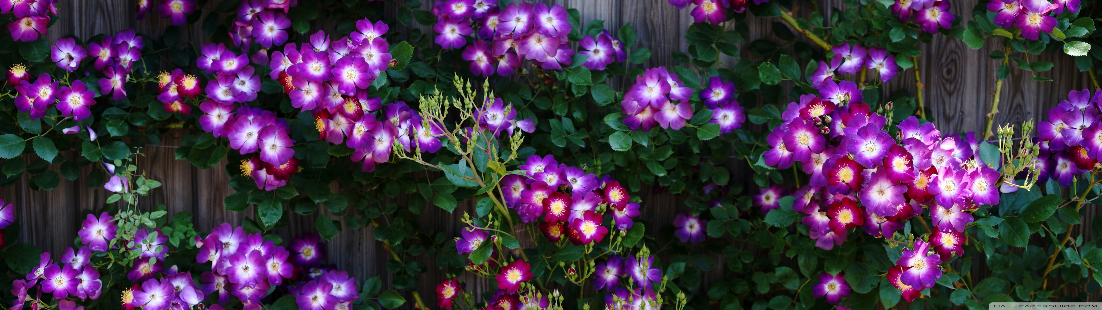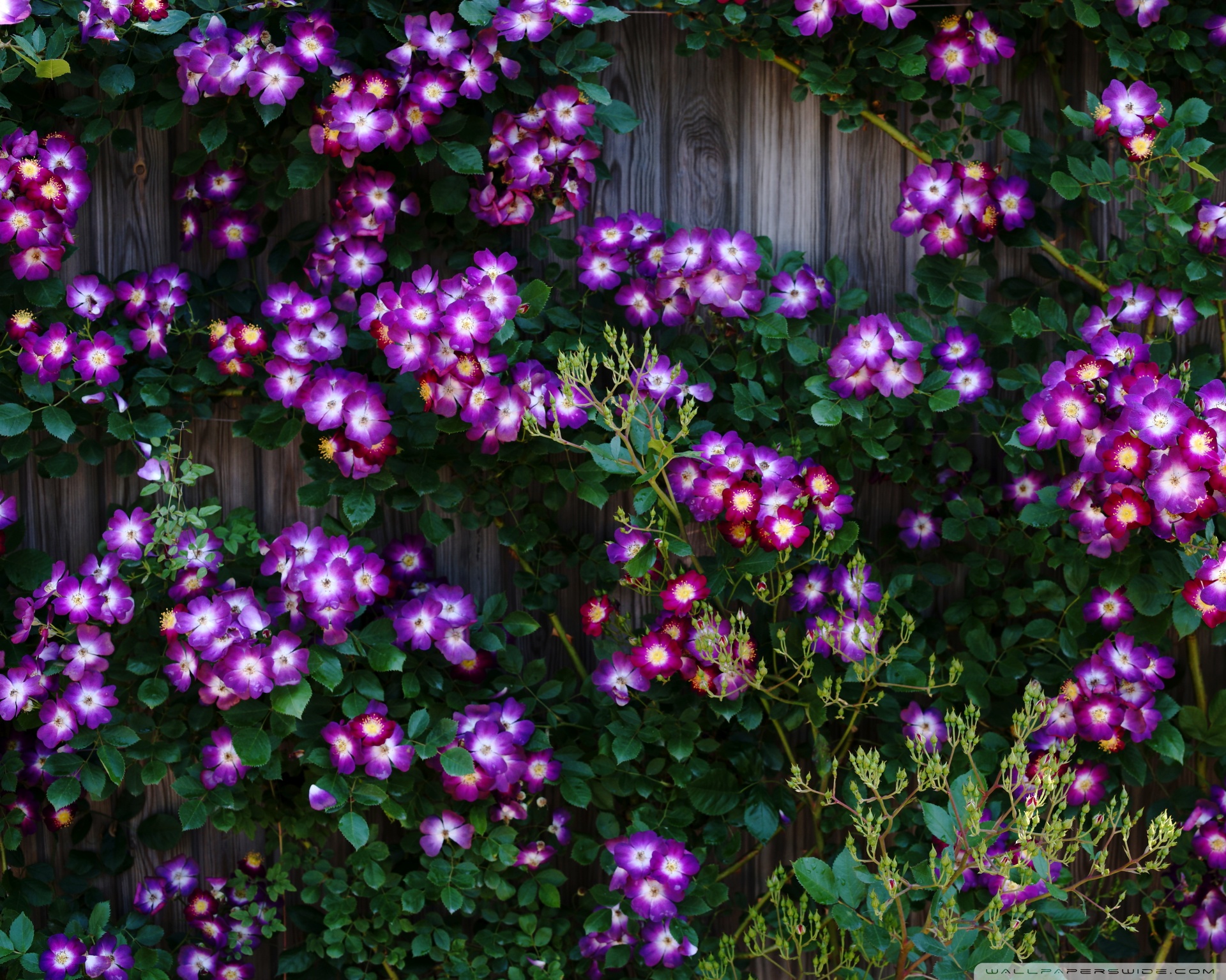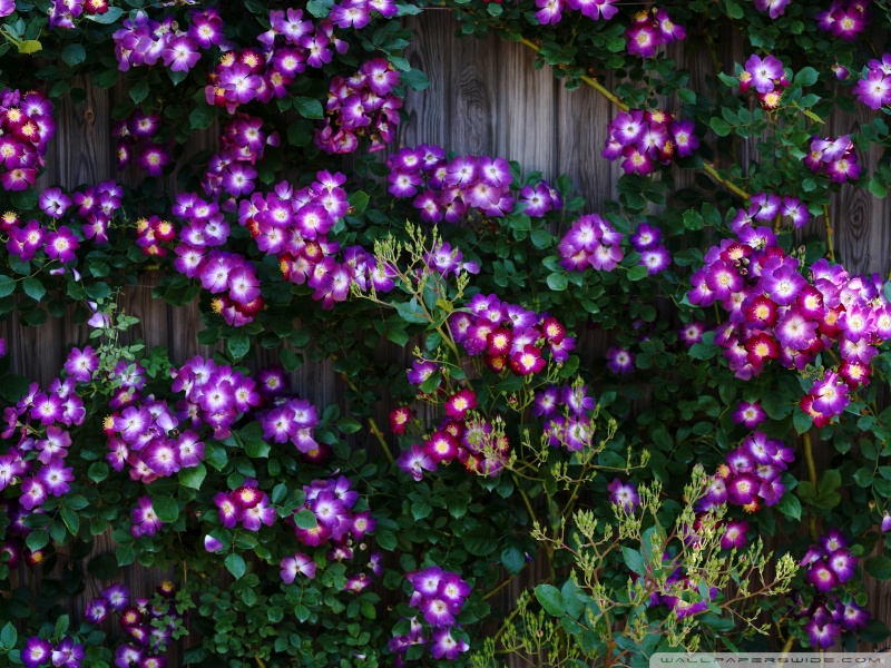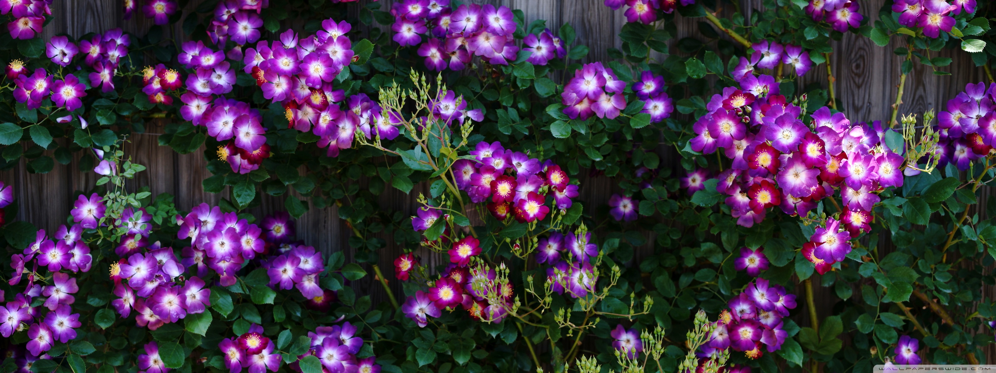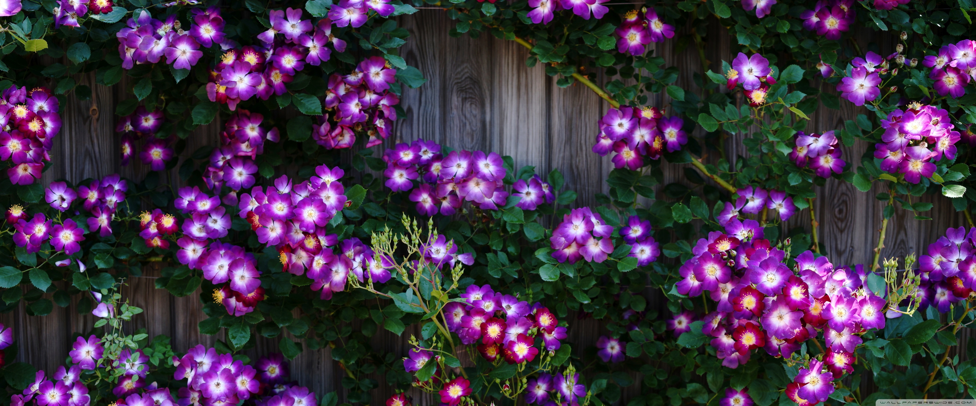 Download Purple Wild Rose Cluster Against Wooden Fence 4K UHD Wallpaper