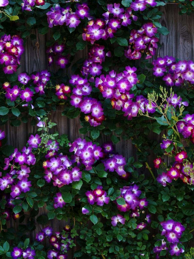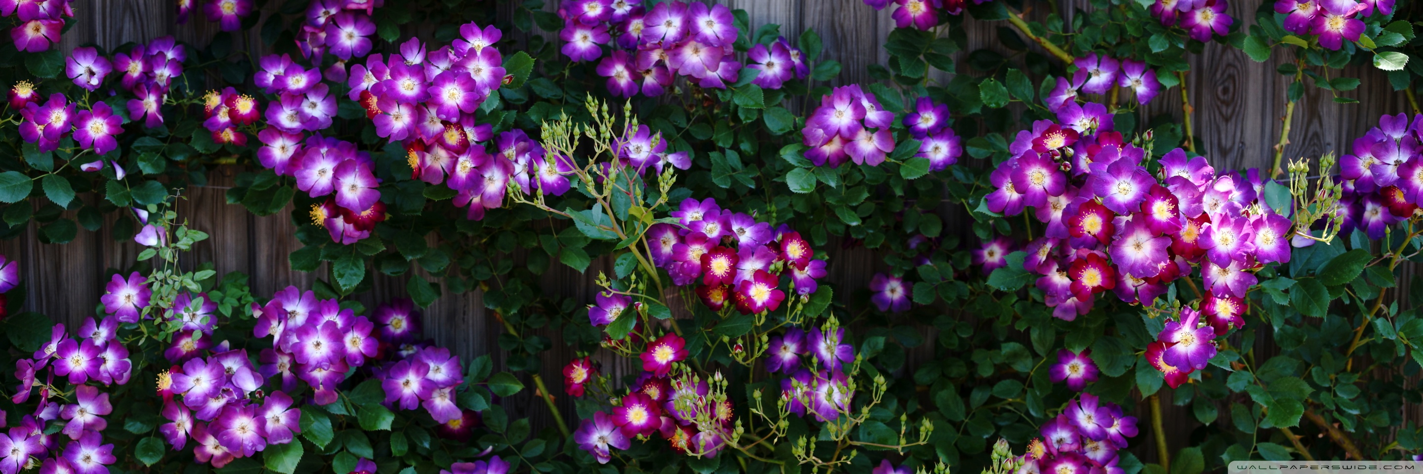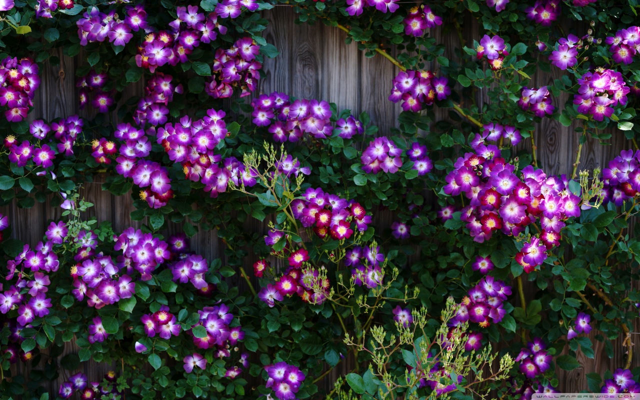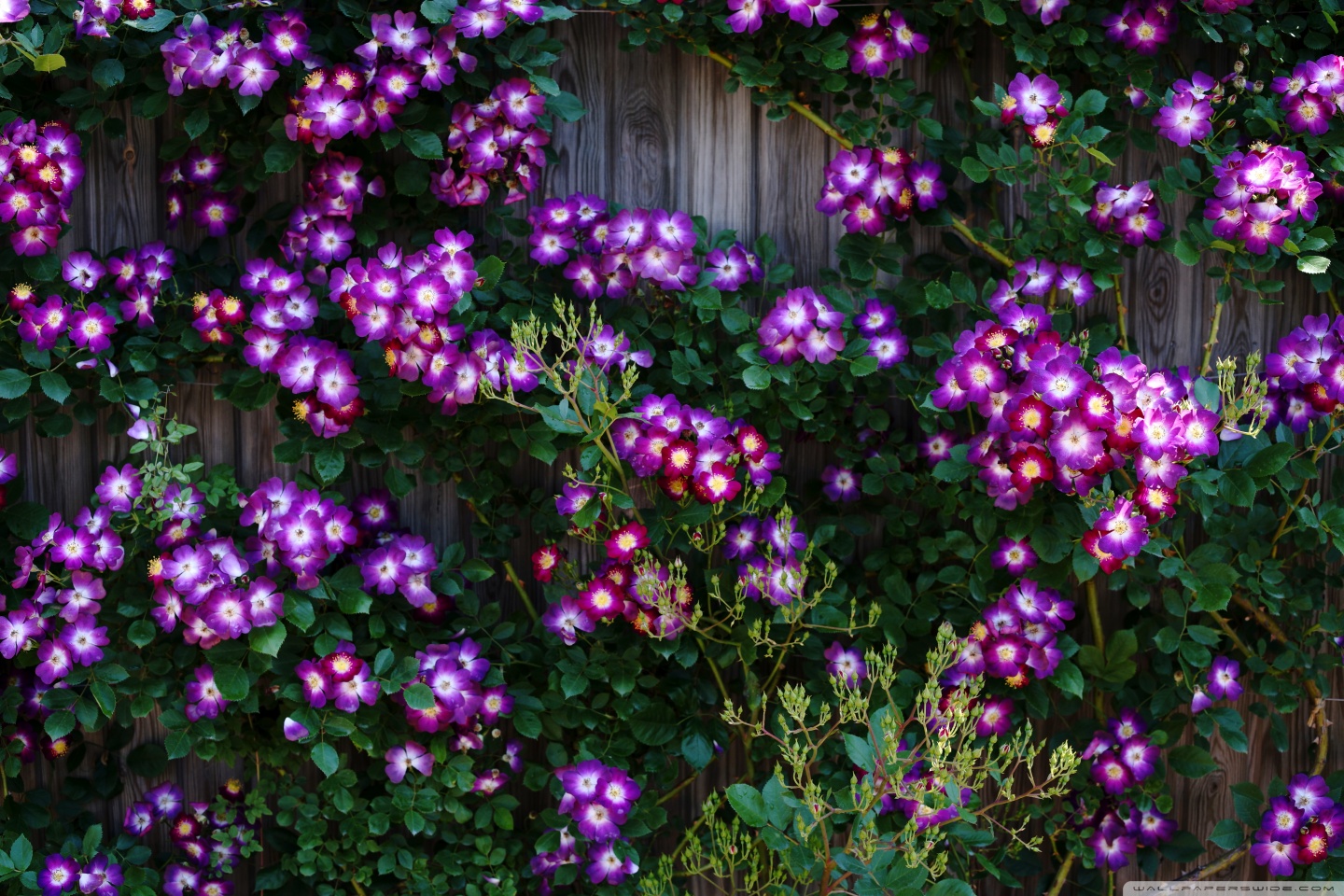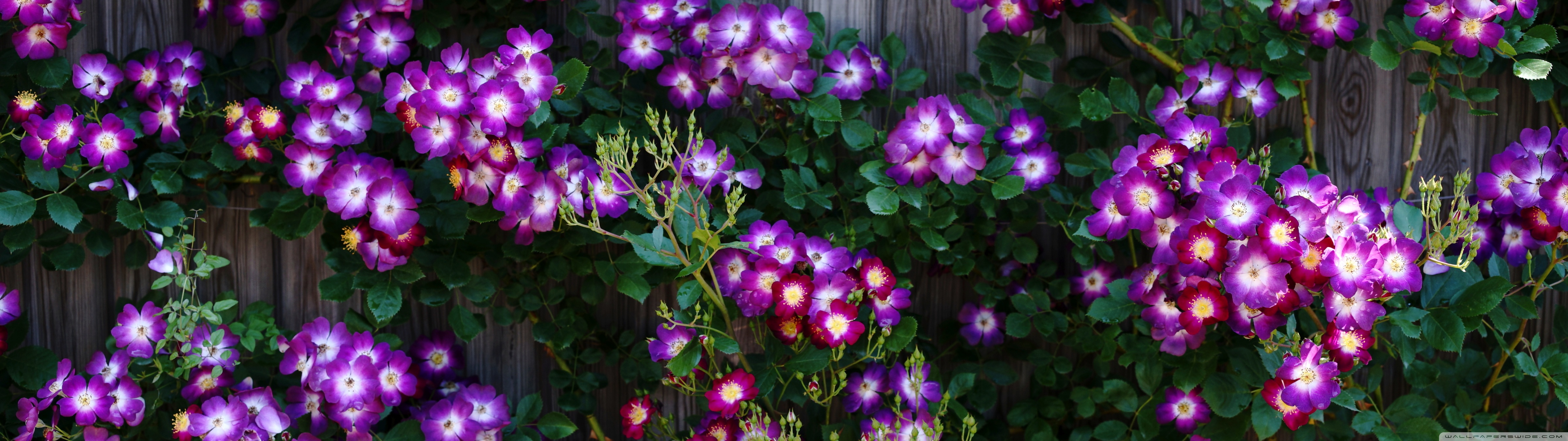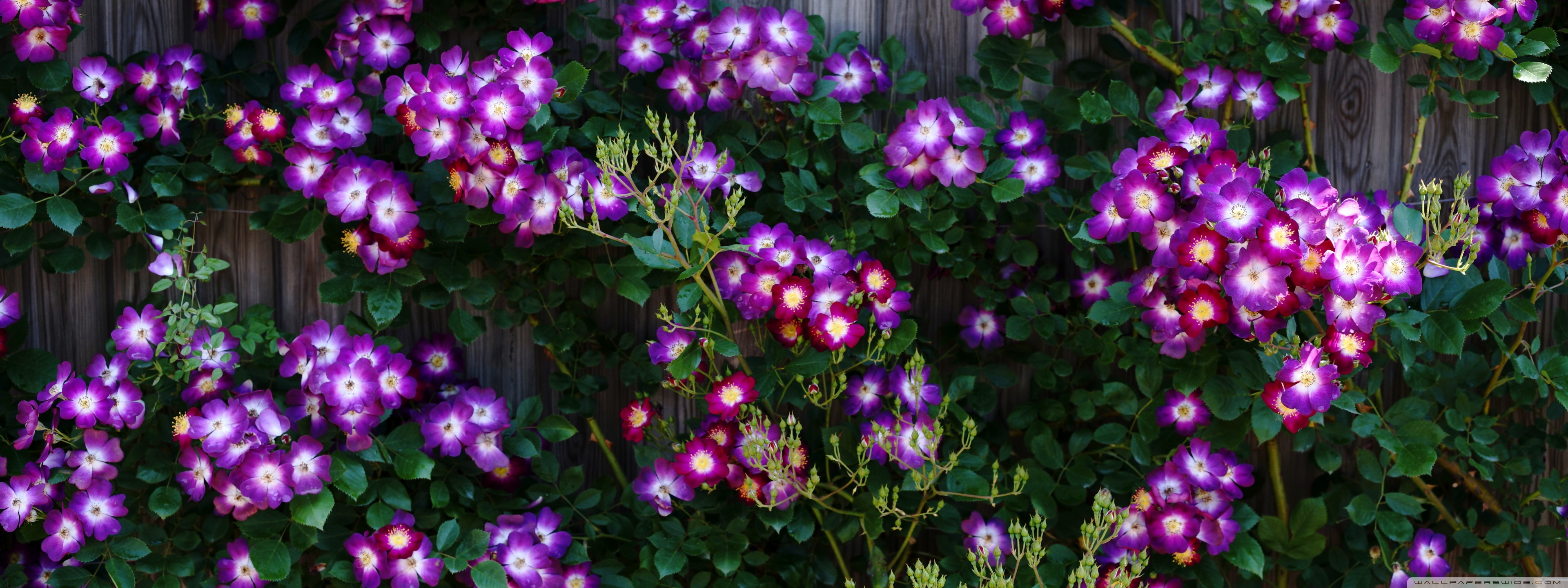 Download Purple Wild Rose Cluster Against Wooden Fence 4K UHD Wallpaper