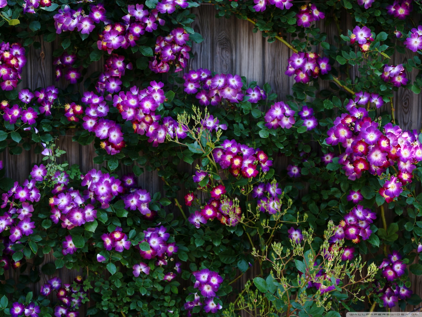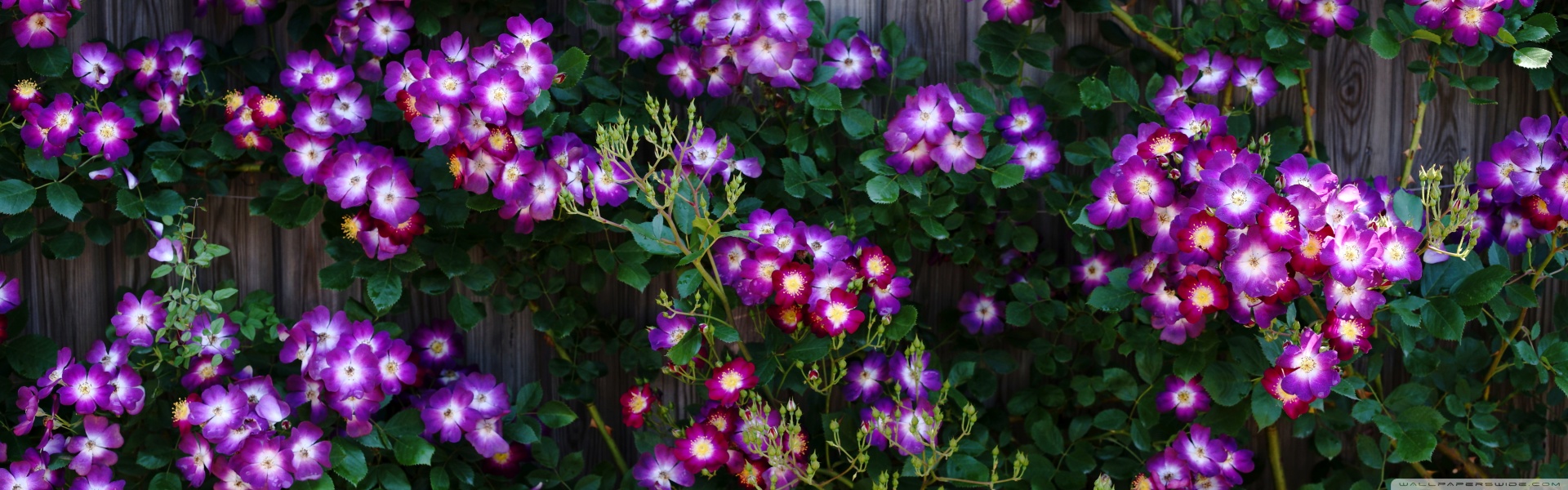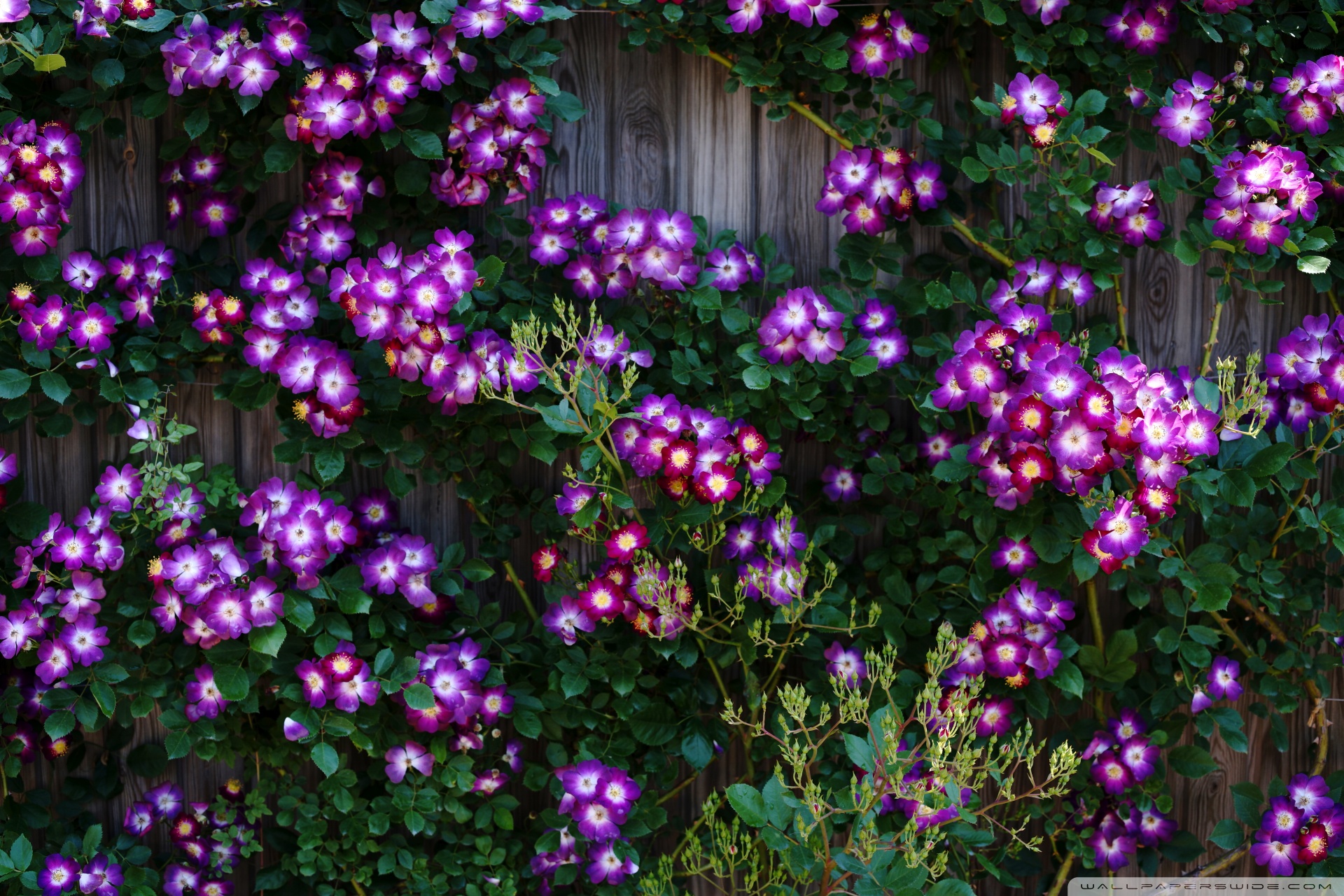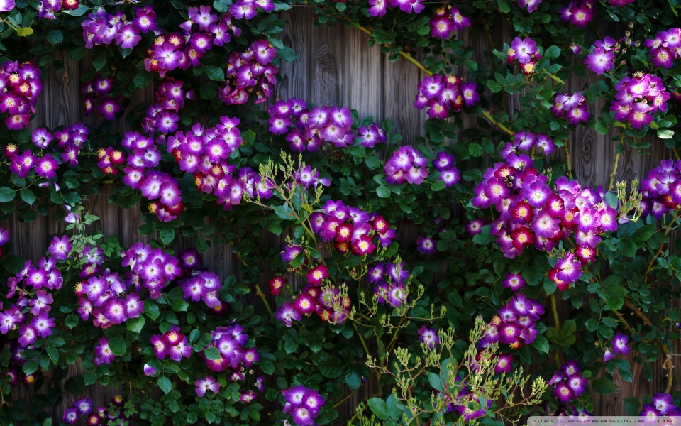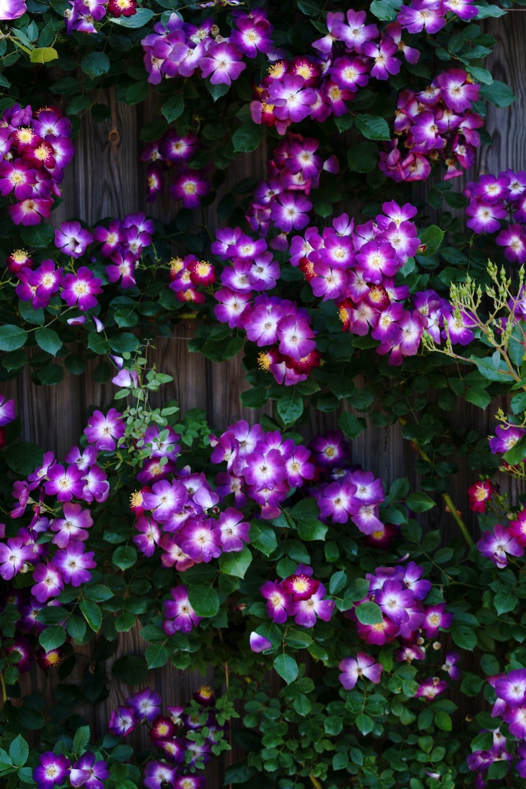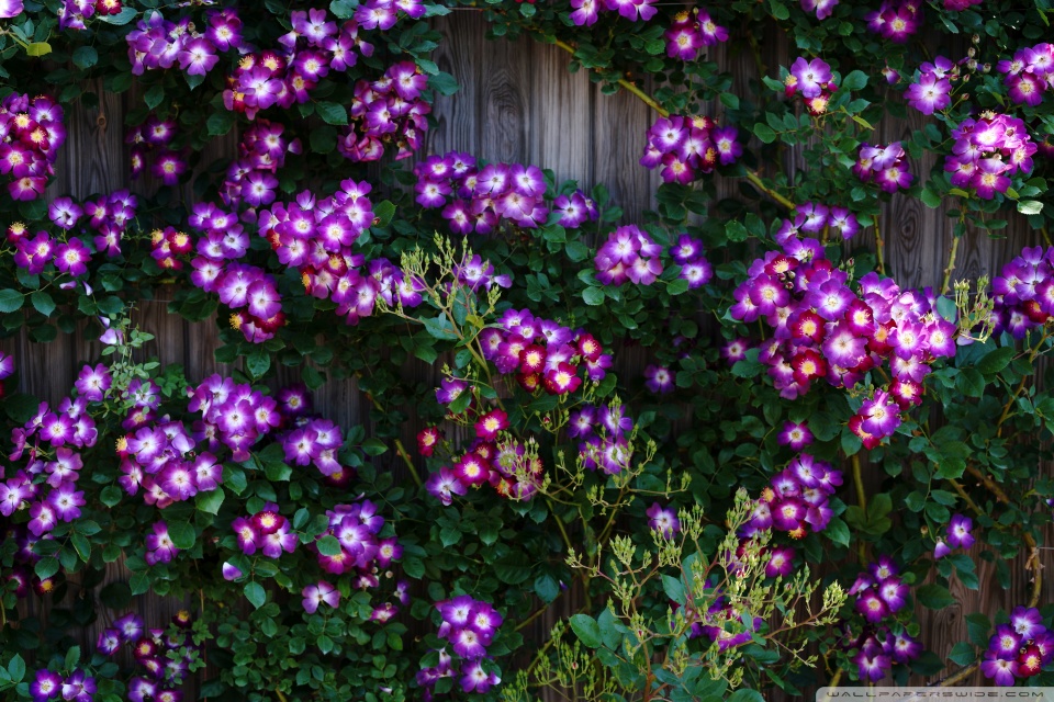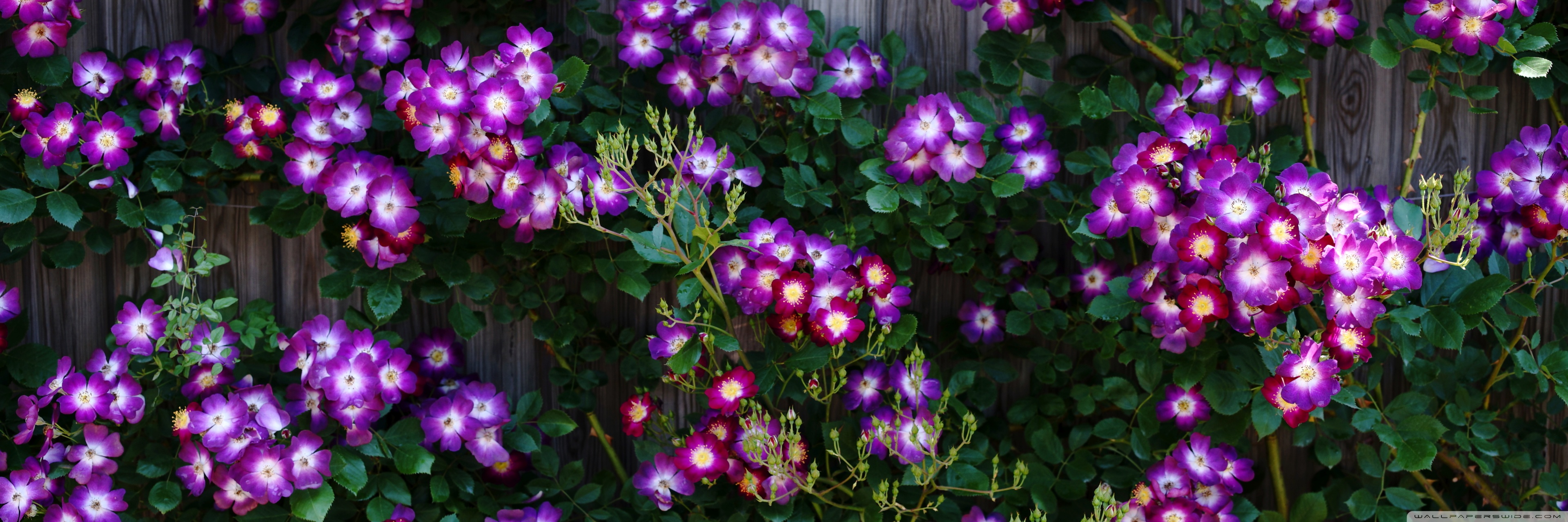 Download Purple Wild Rose Cluster Against Wooden Fence 4K UHD Wallpaper