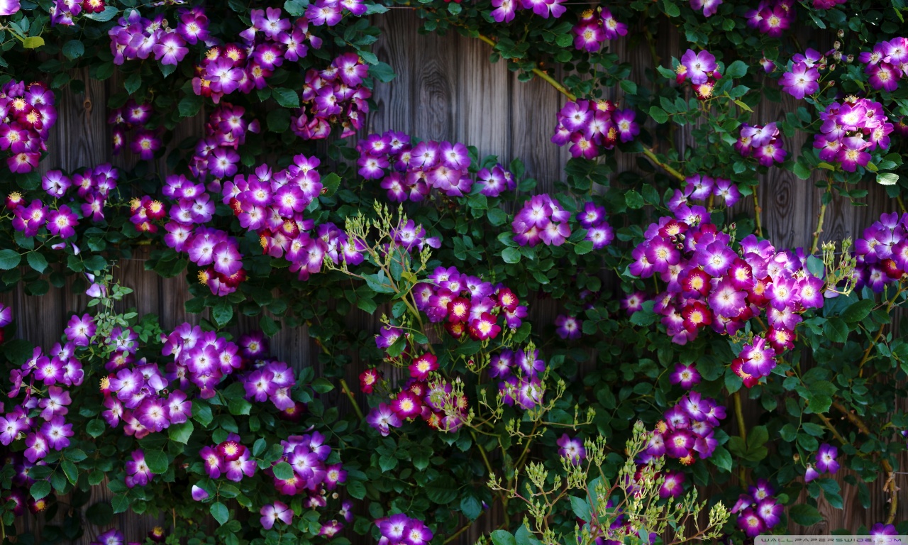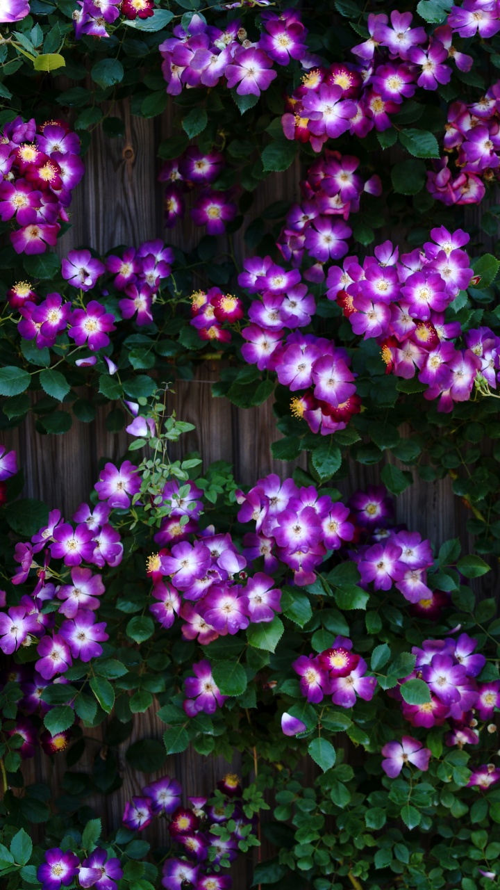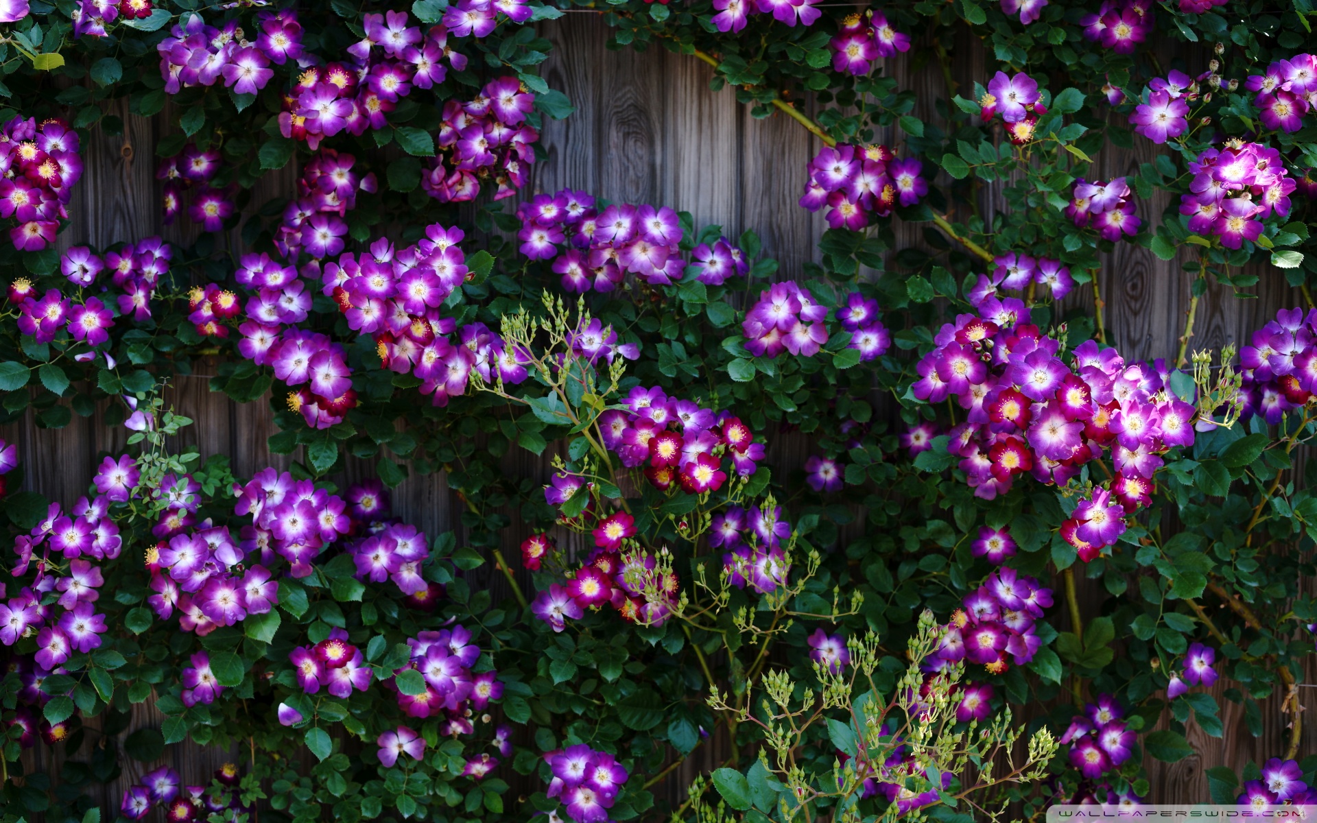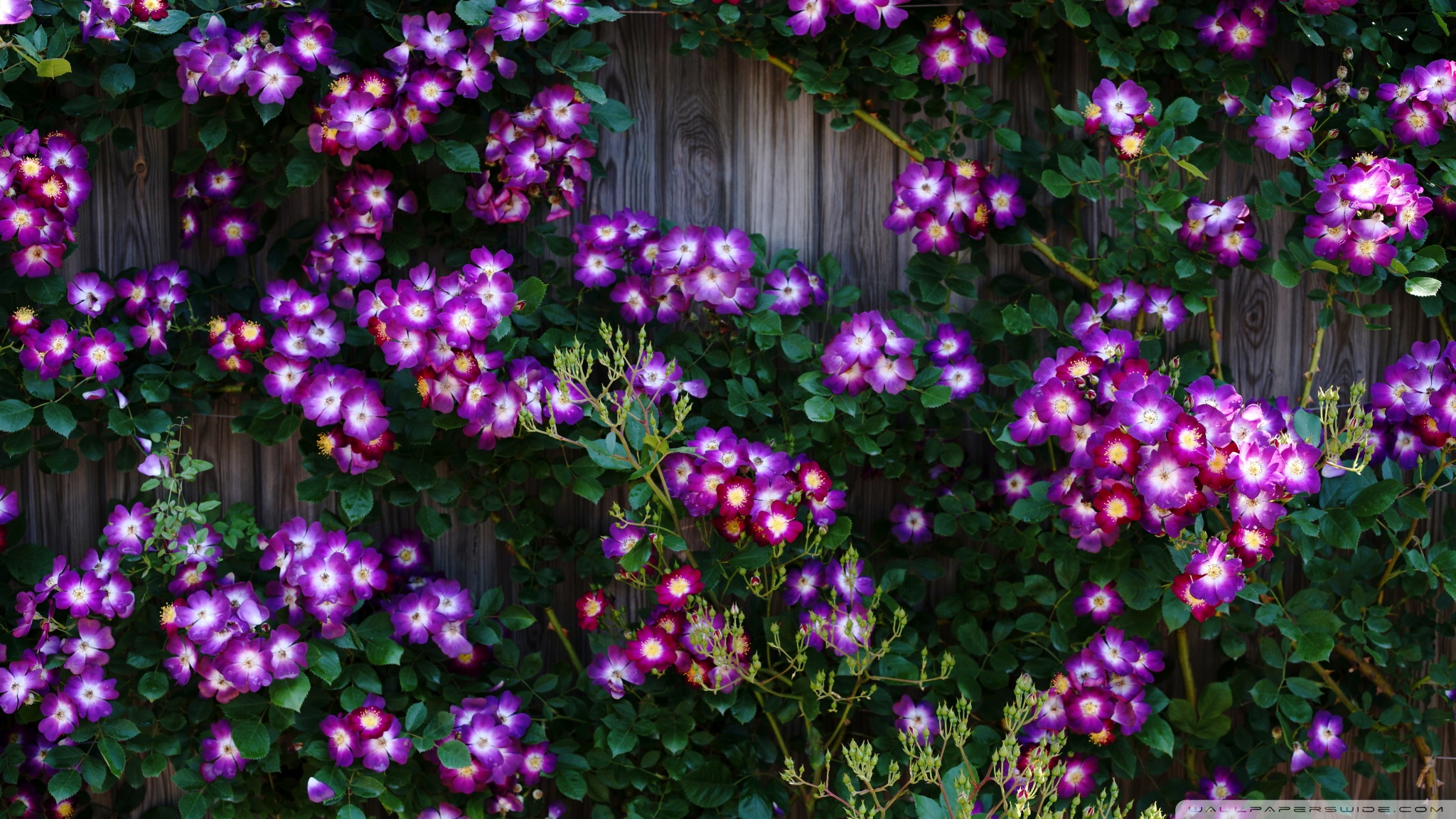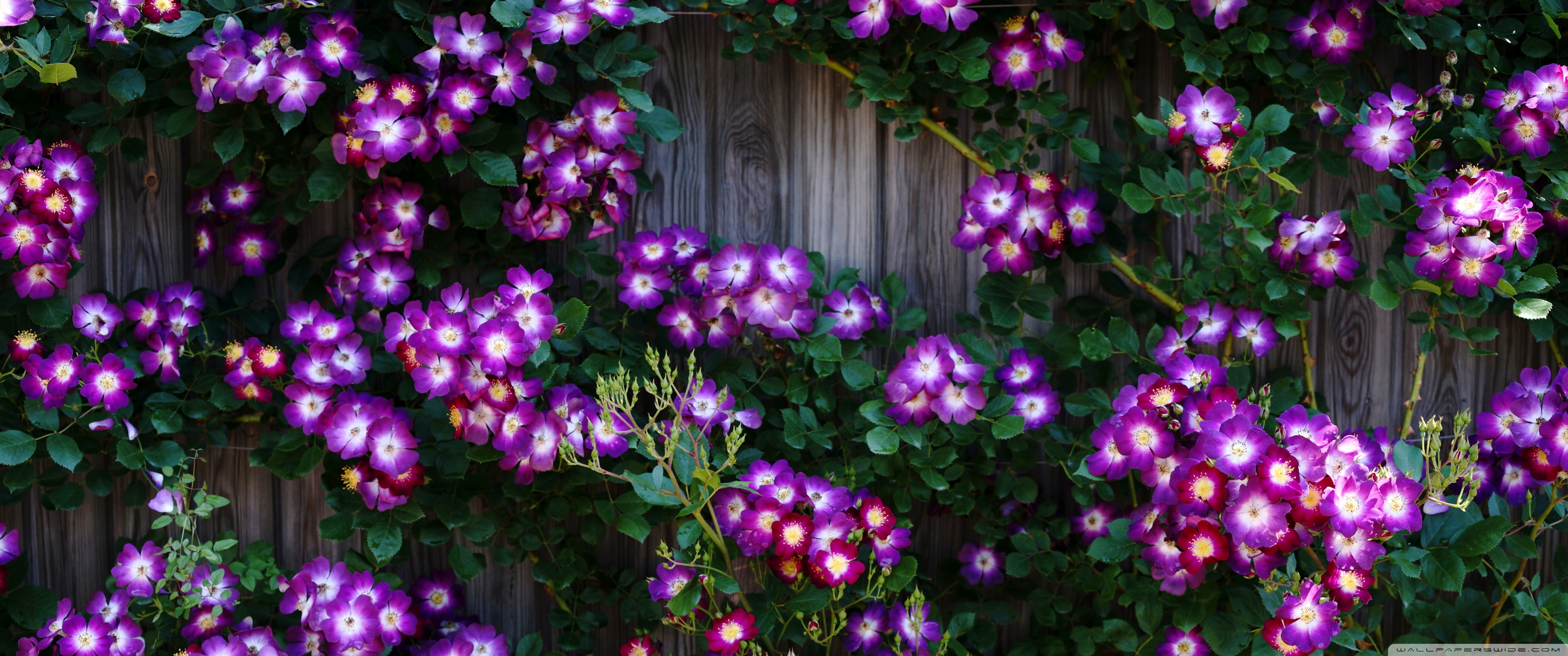 Download Purple Wild Rose Cluster Against Wooden Fence 4K UHD Wallpaper