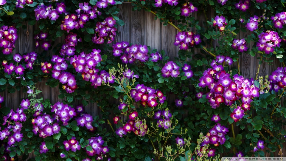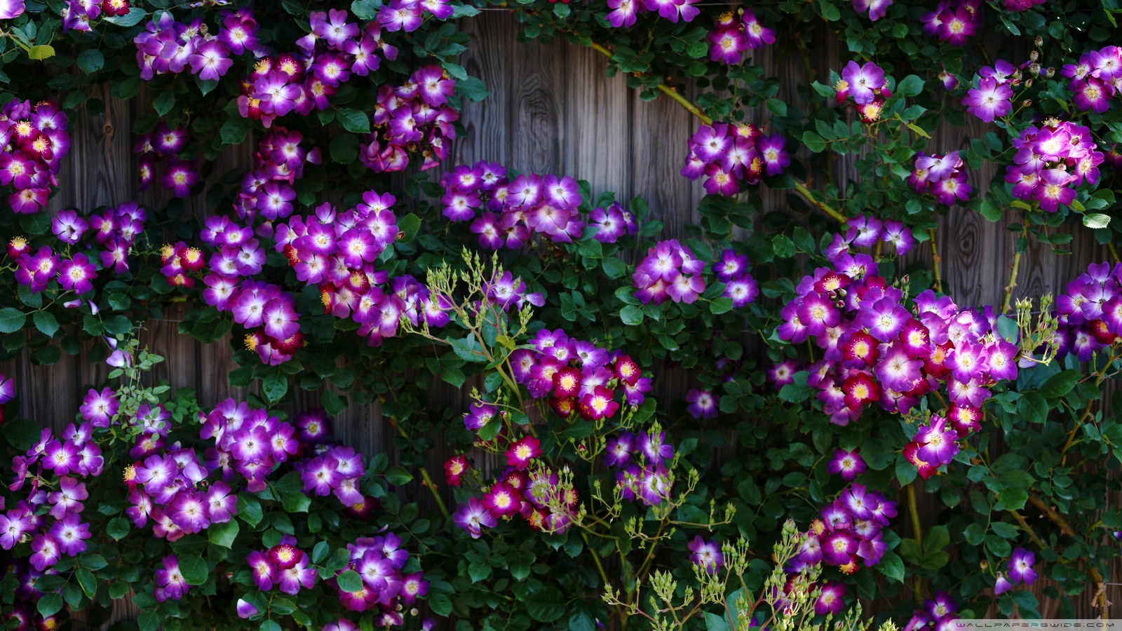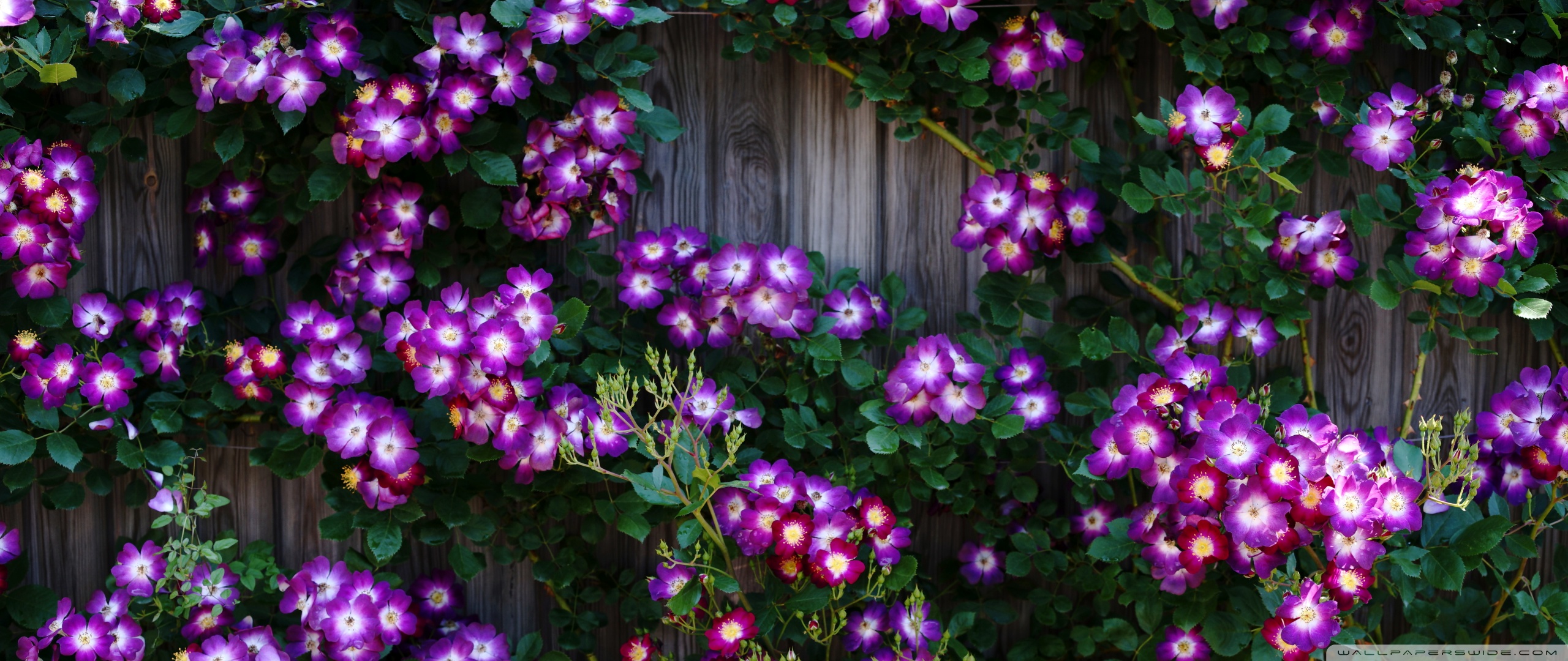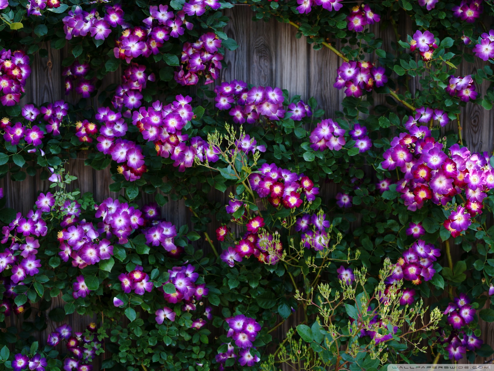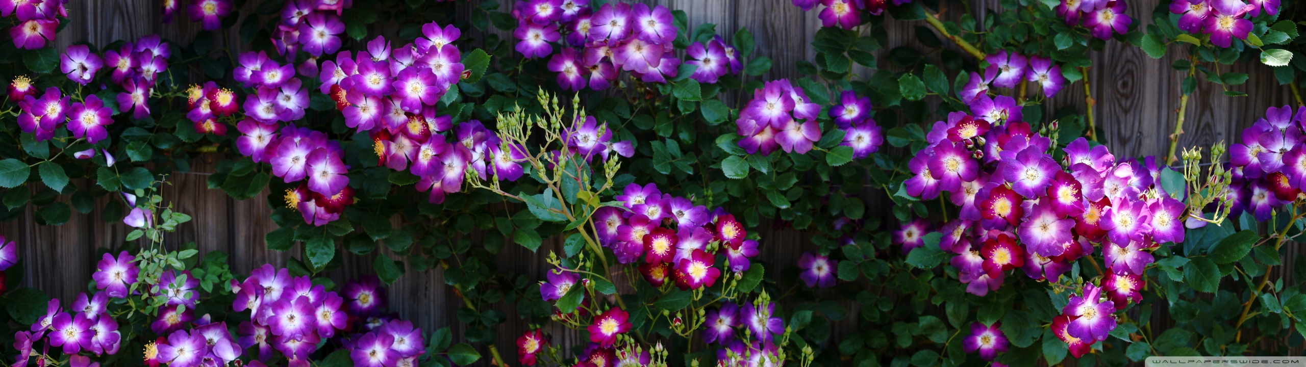 Download Purple Wild Rose Cluster Against Wooden Fence 4K UHD Wallpaper
