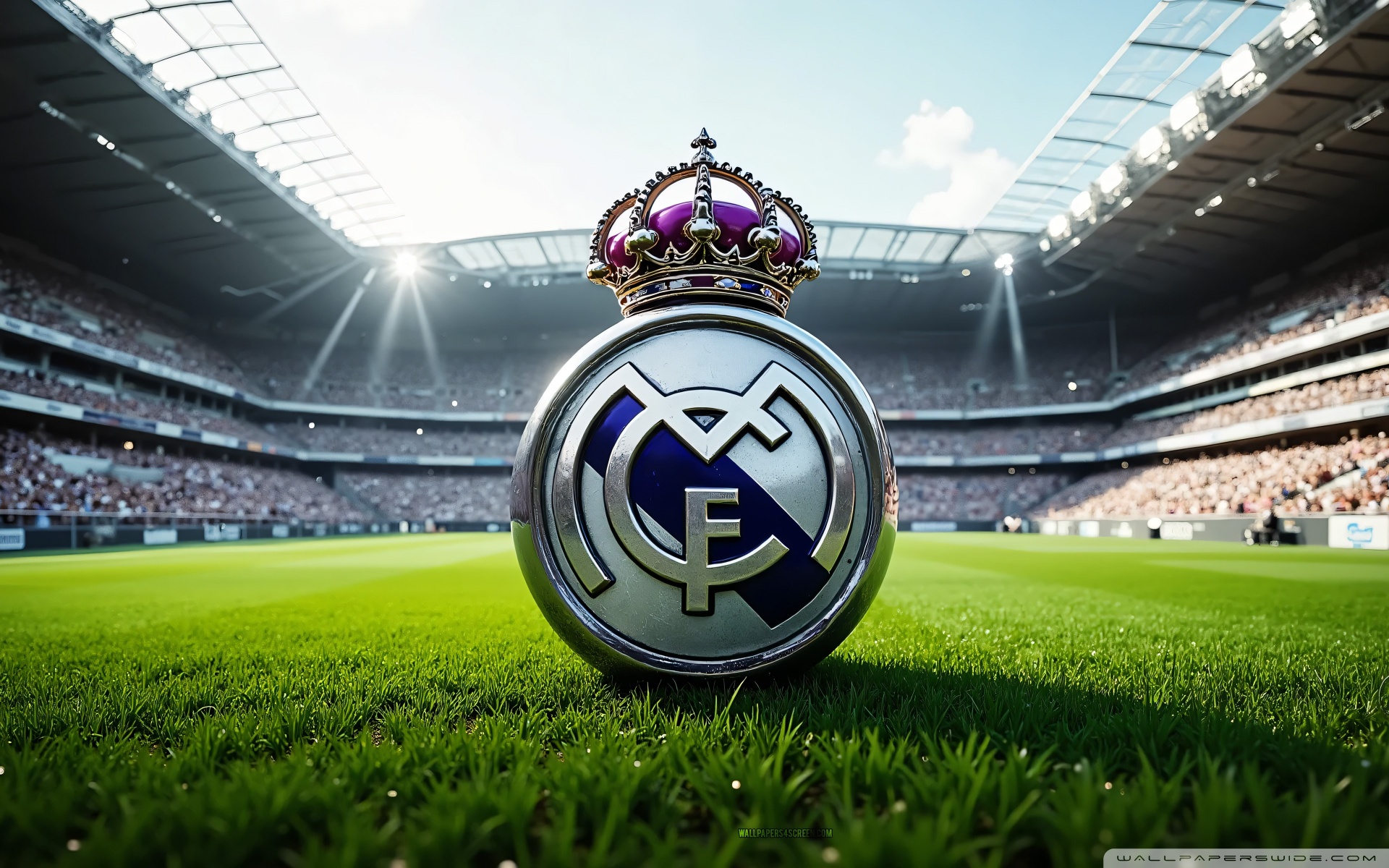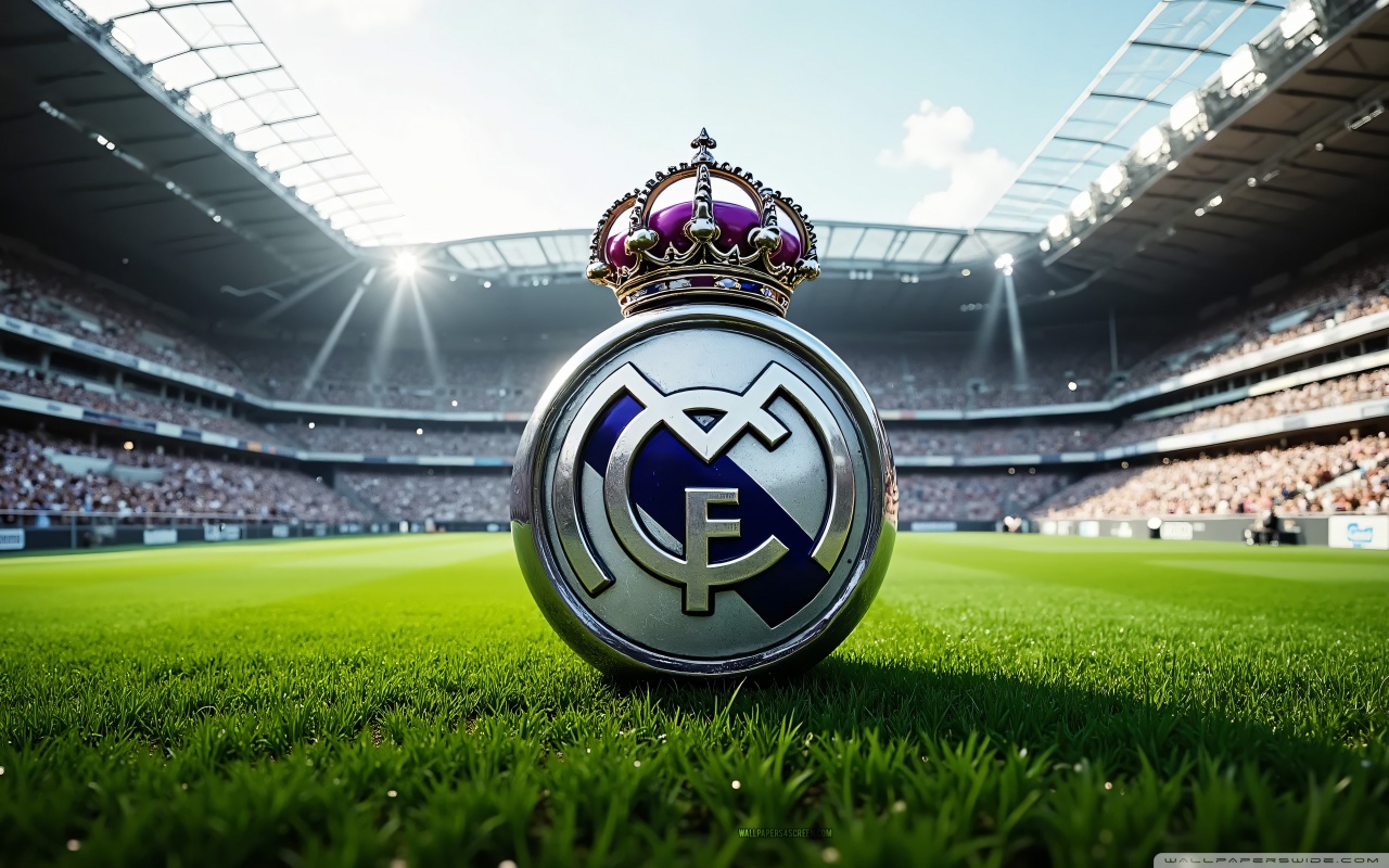 Download Real Madrid Emblem On Football Field 4K UHD Wallpaper